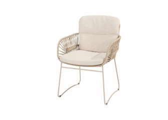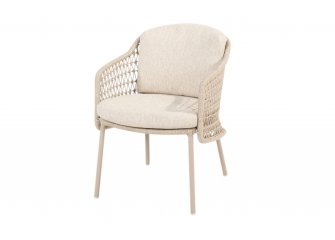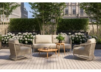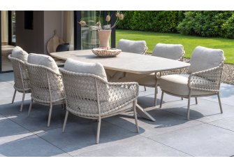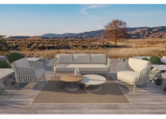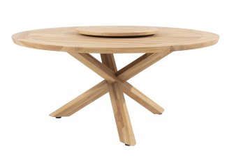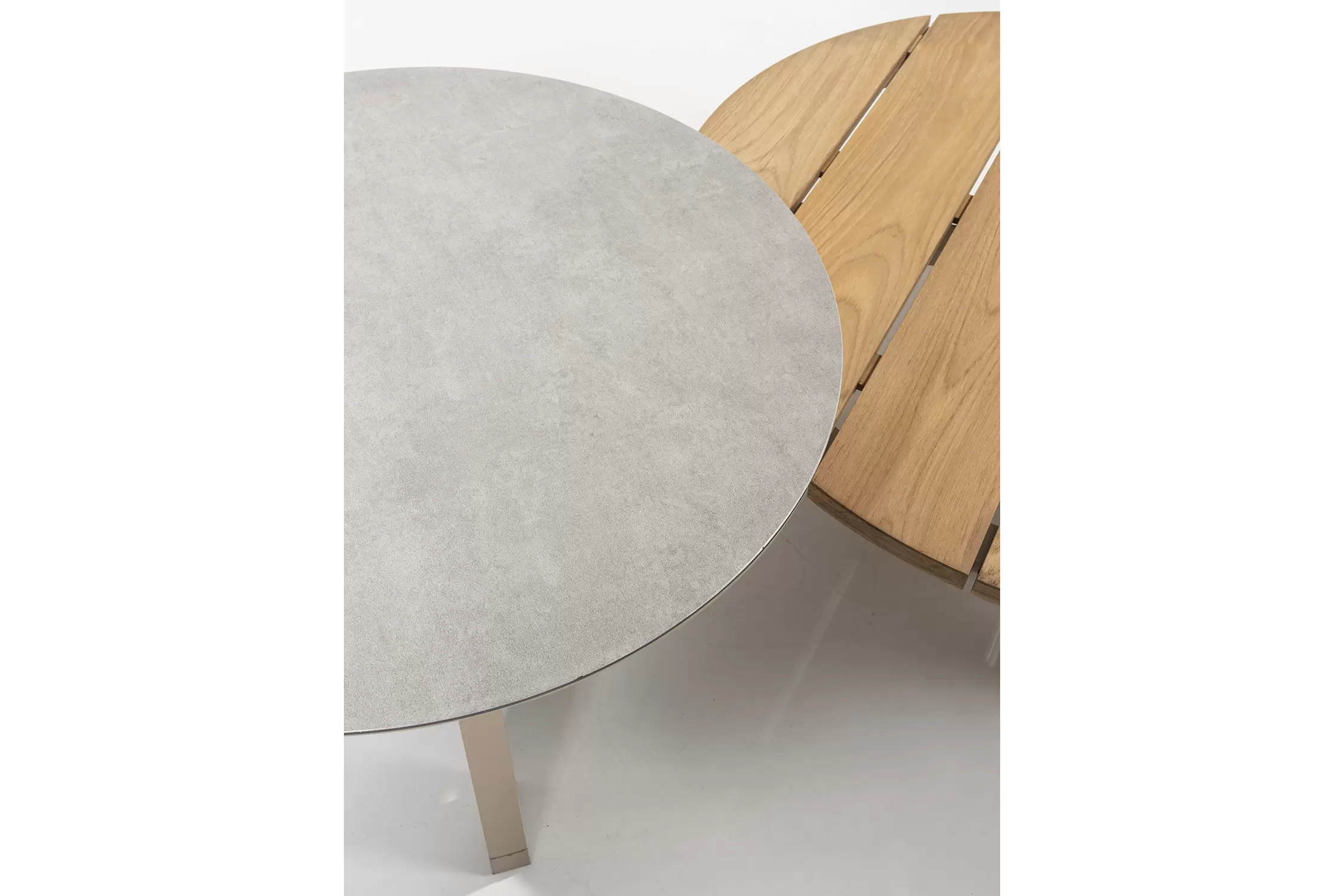 Stół o średnicy 80 cm ma teakowy blat, a mniejszy stół o średnicy 65 cm ma piękny, ceramiczny blat.