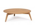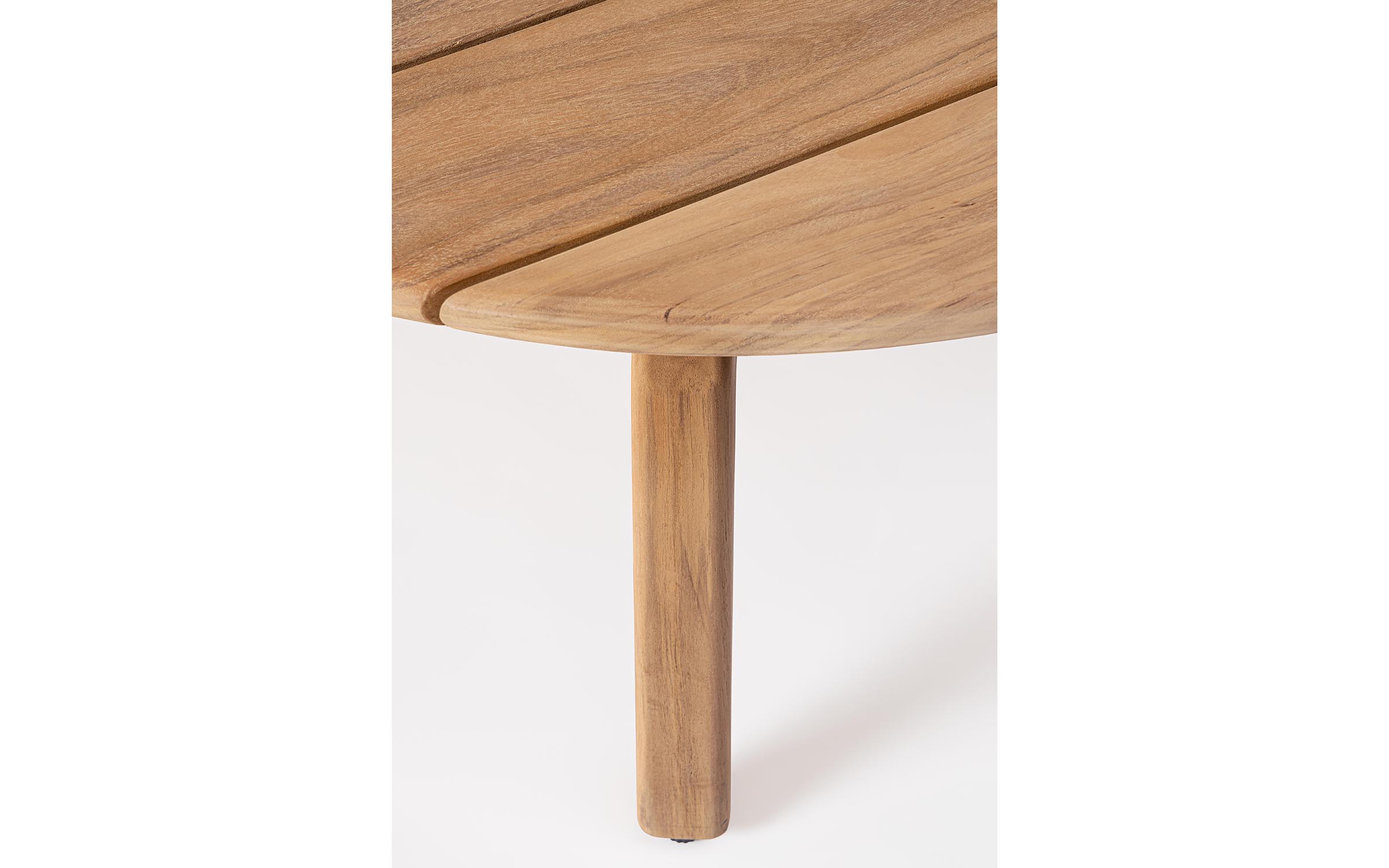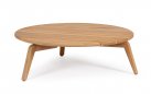 Stolik okrągły kawowy z drewna teakowego premium na podstawie trójnożnej.