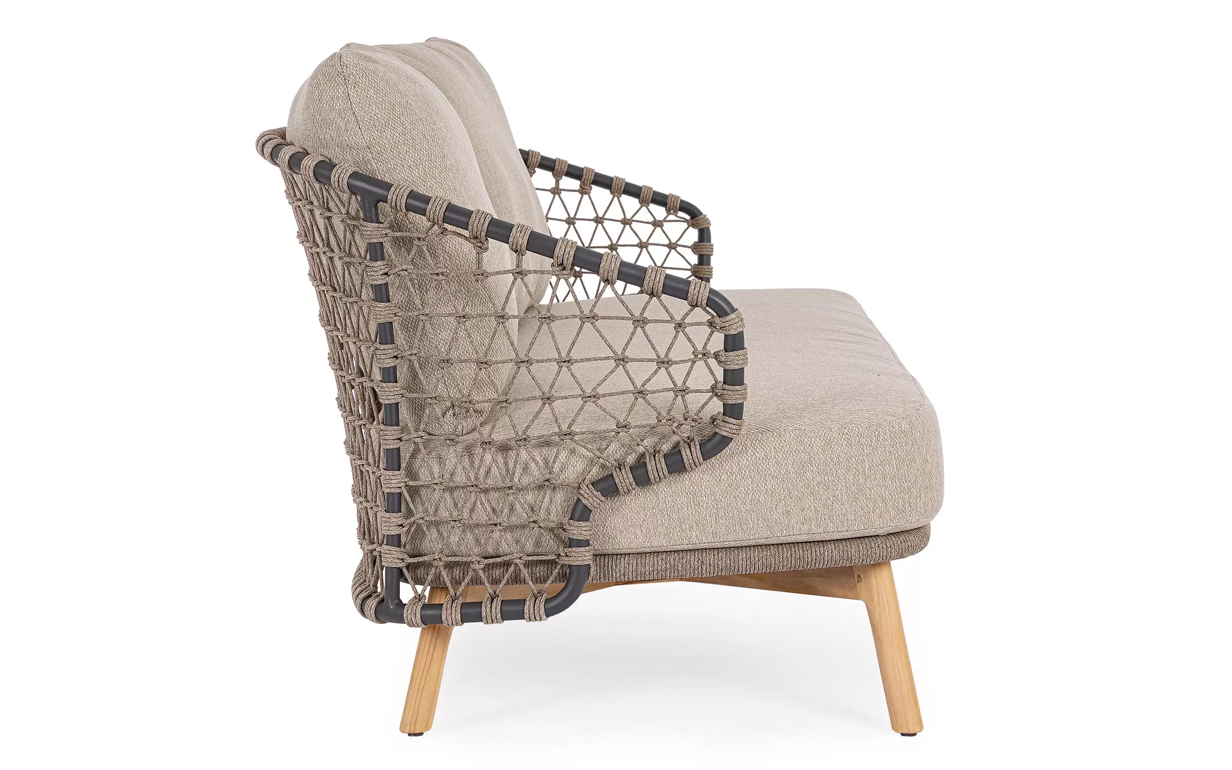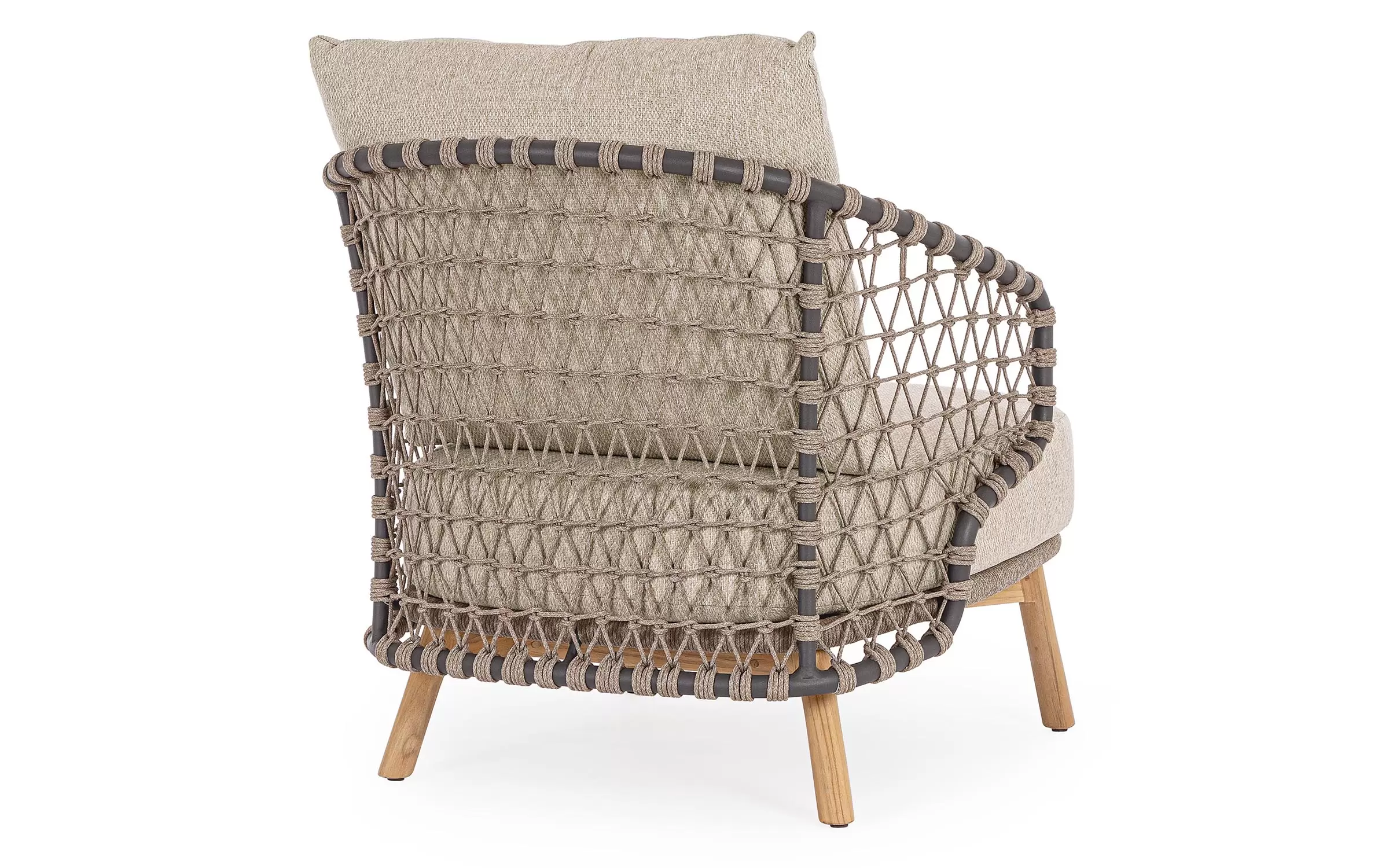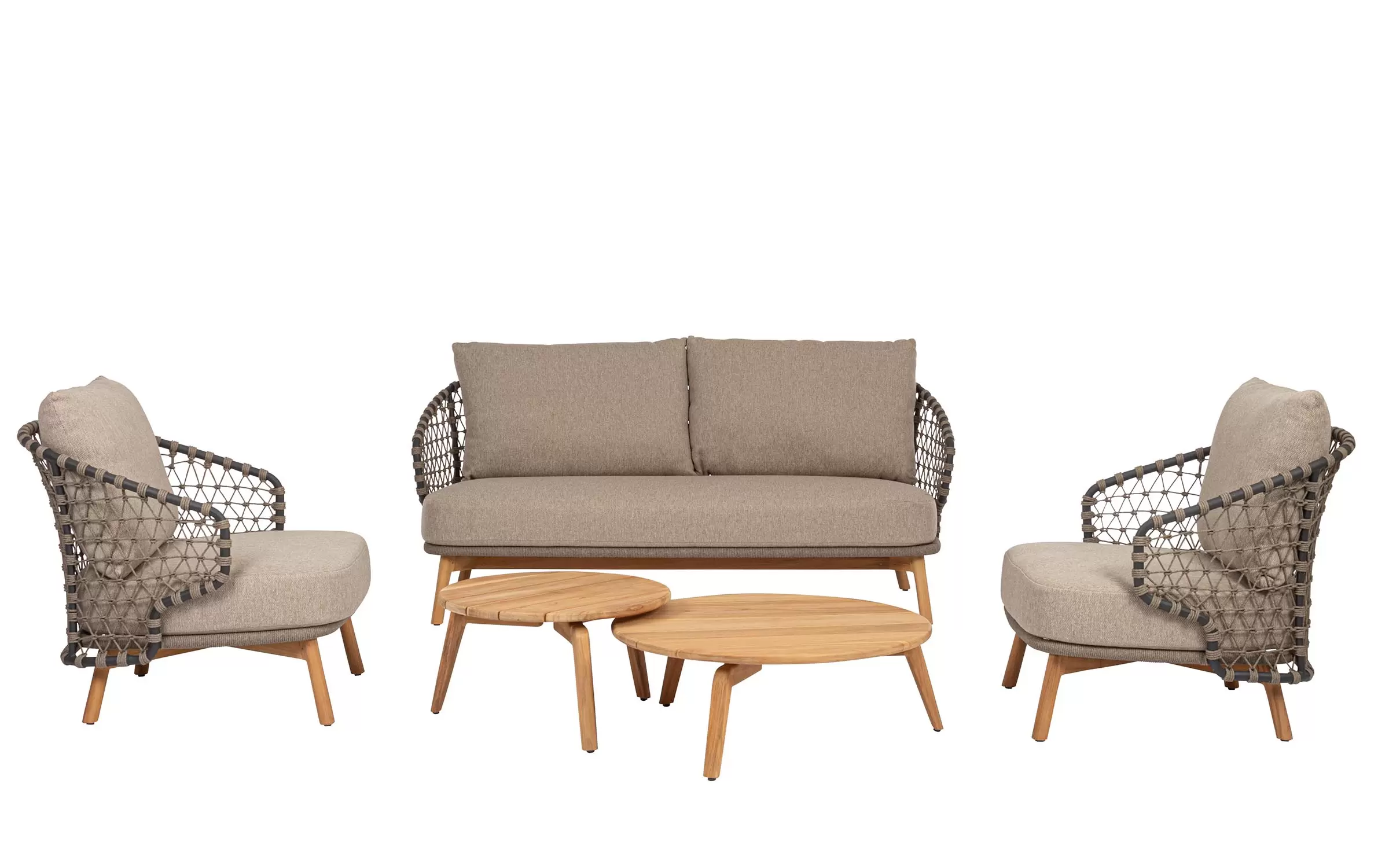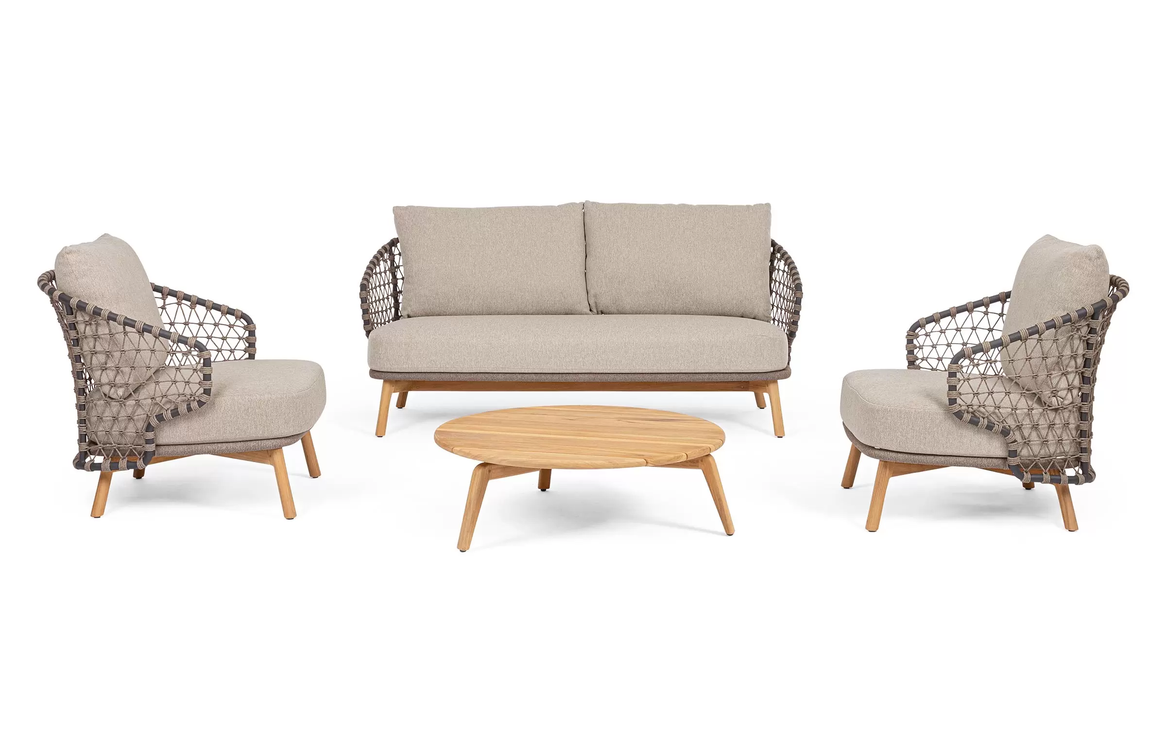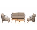 Zestaw wypoczynkowy tarasowy z wysokim oparciem na podstawie z drewna teak. Siedziska wykonane z aluminiowej ramy w grafitowym kolorze oplecionej sznurkiem polipropylenowym.