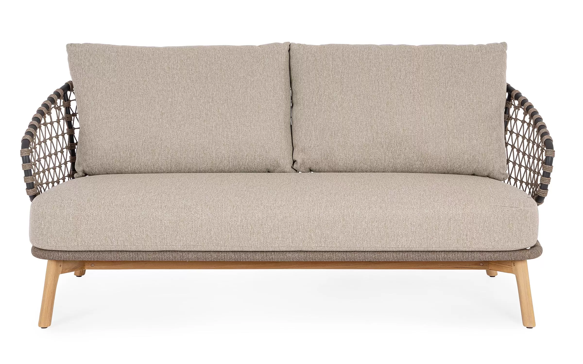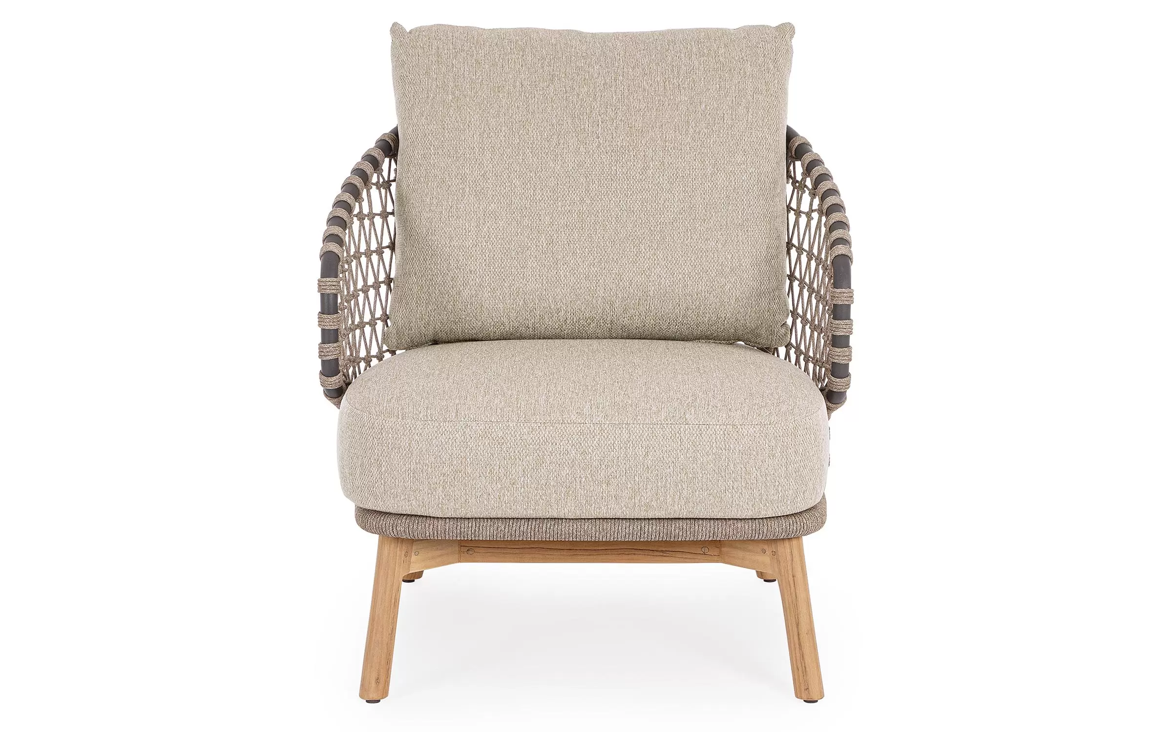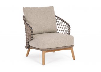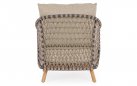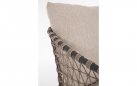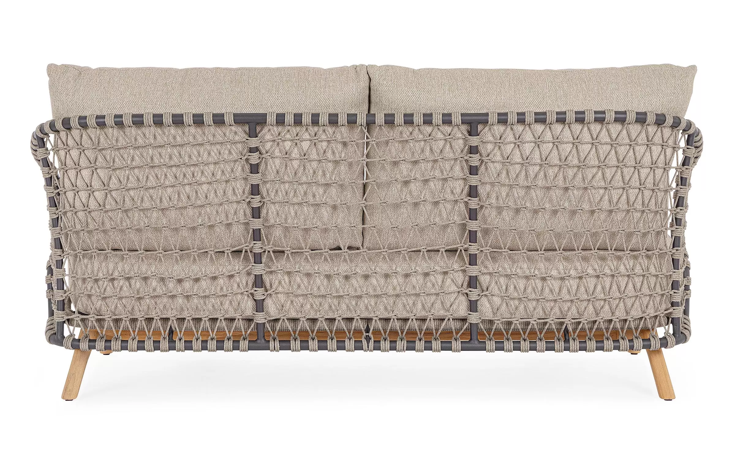 Zestaw wypoczynkowy tarasowy z wysokim oparciem na podstawie z drewna teak. Siedziska wykonane z aluminiowej ramy w grafitowym kolorze oplecionej sznurkiem polipropylenowym.