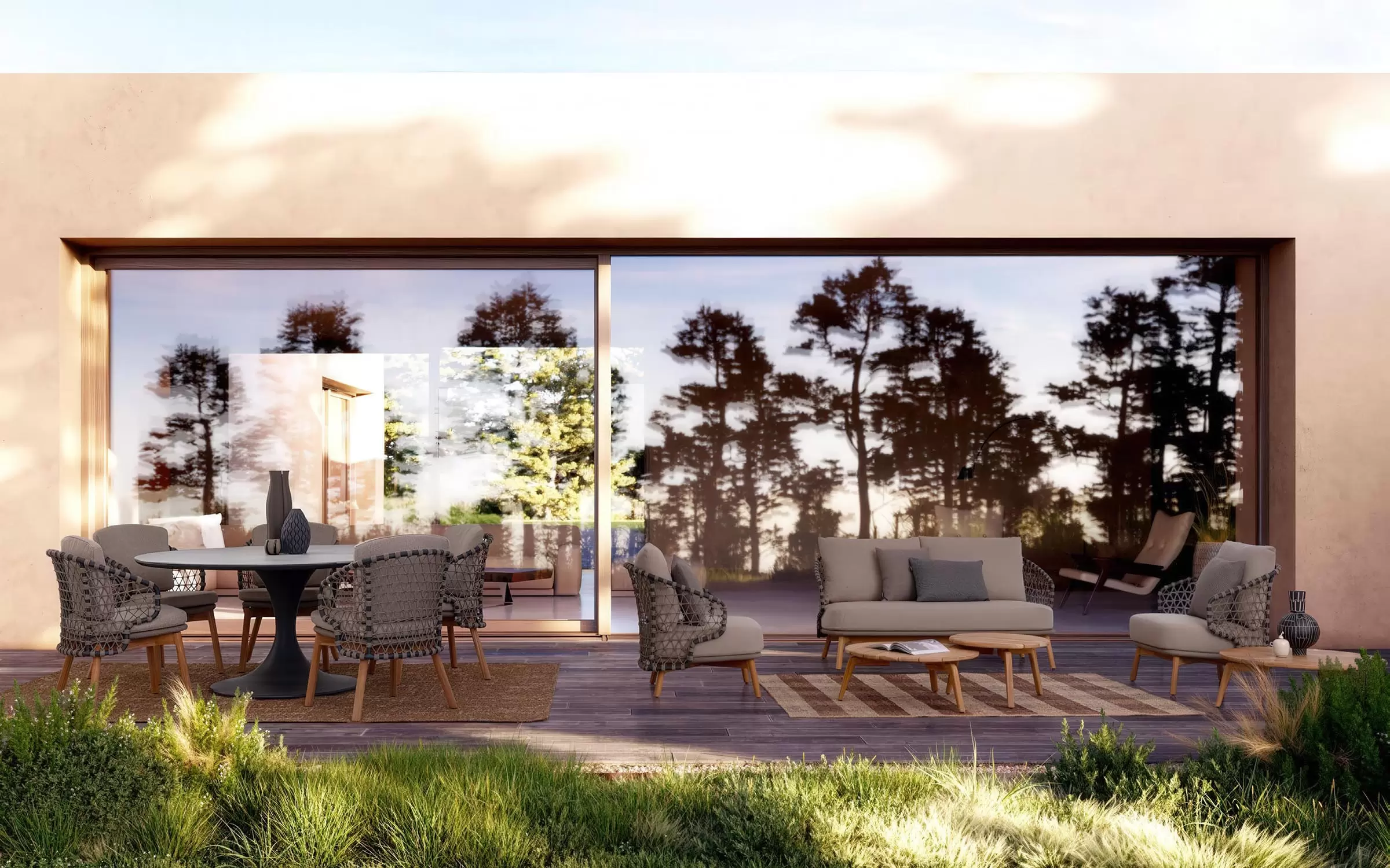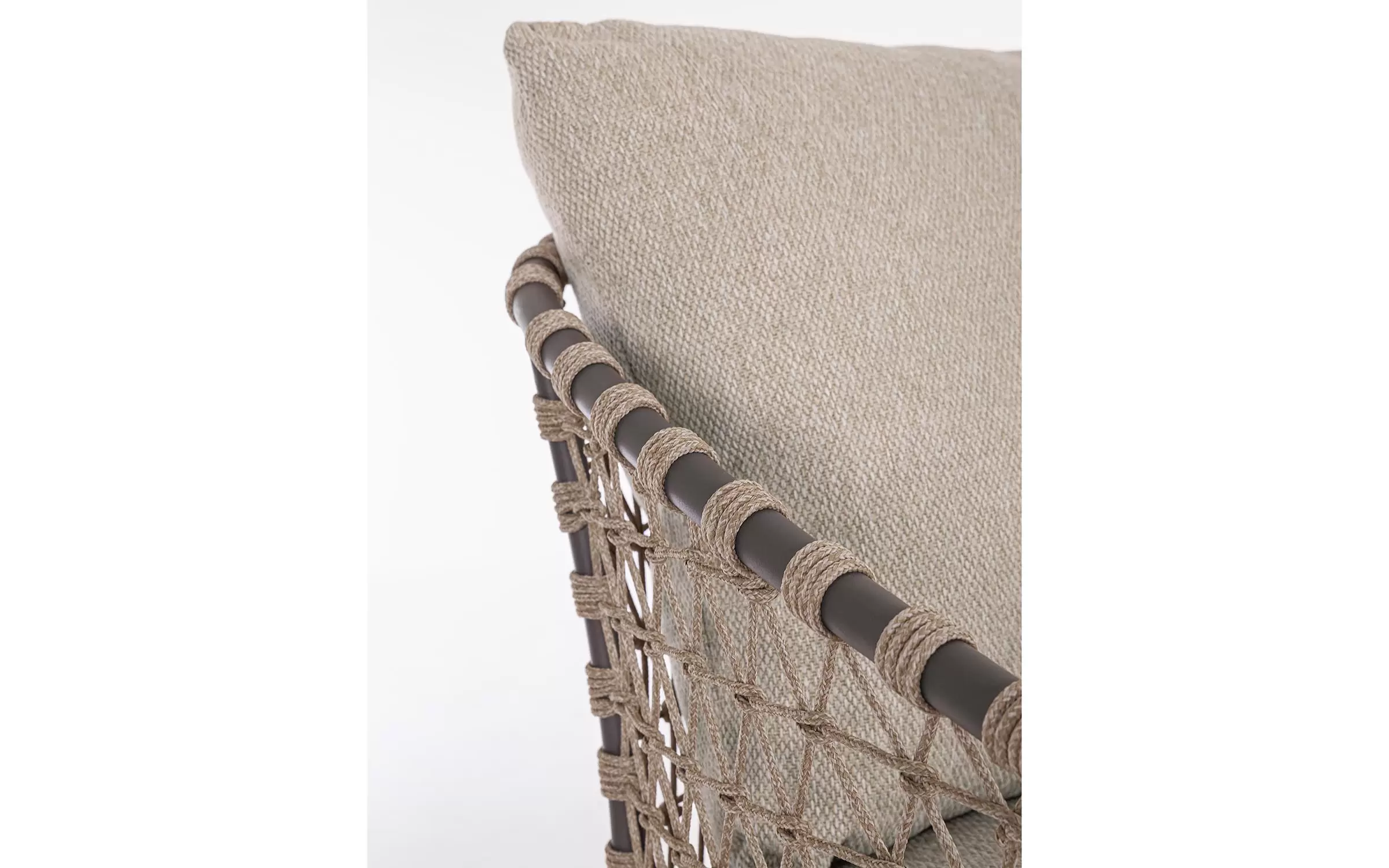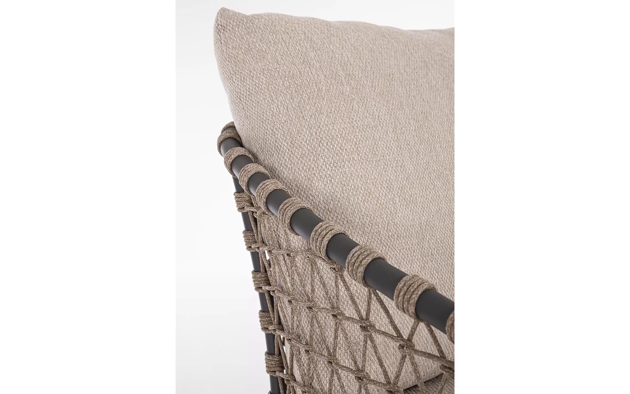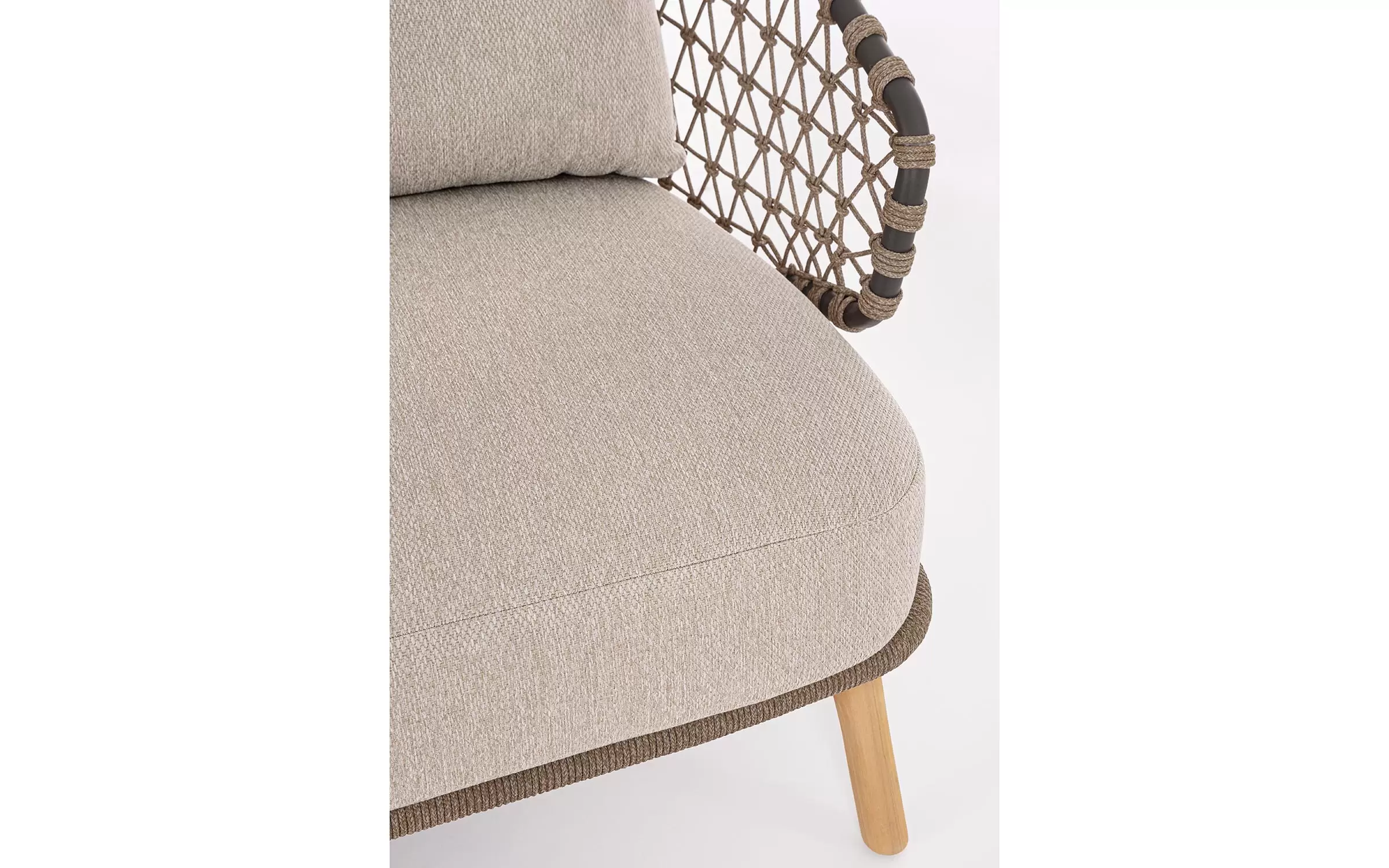 Zestaw wypoczynkowy tarasowy z wysokim oparciem na podstawie z drewna teak. Siedziska wykonane z aluminiowej ramy w grafitowym kolorze oplecionej sznurkiem polipropylenowym.