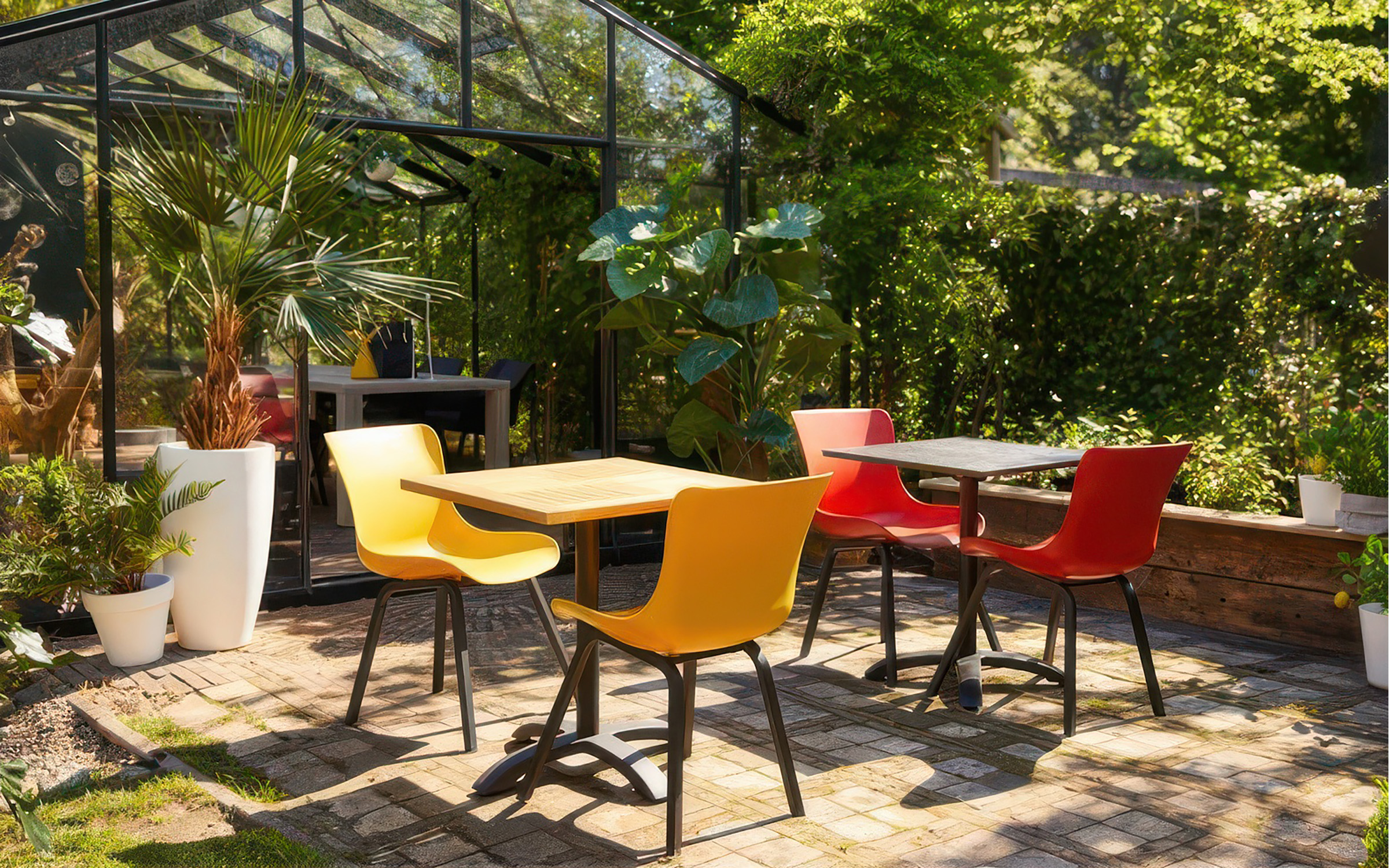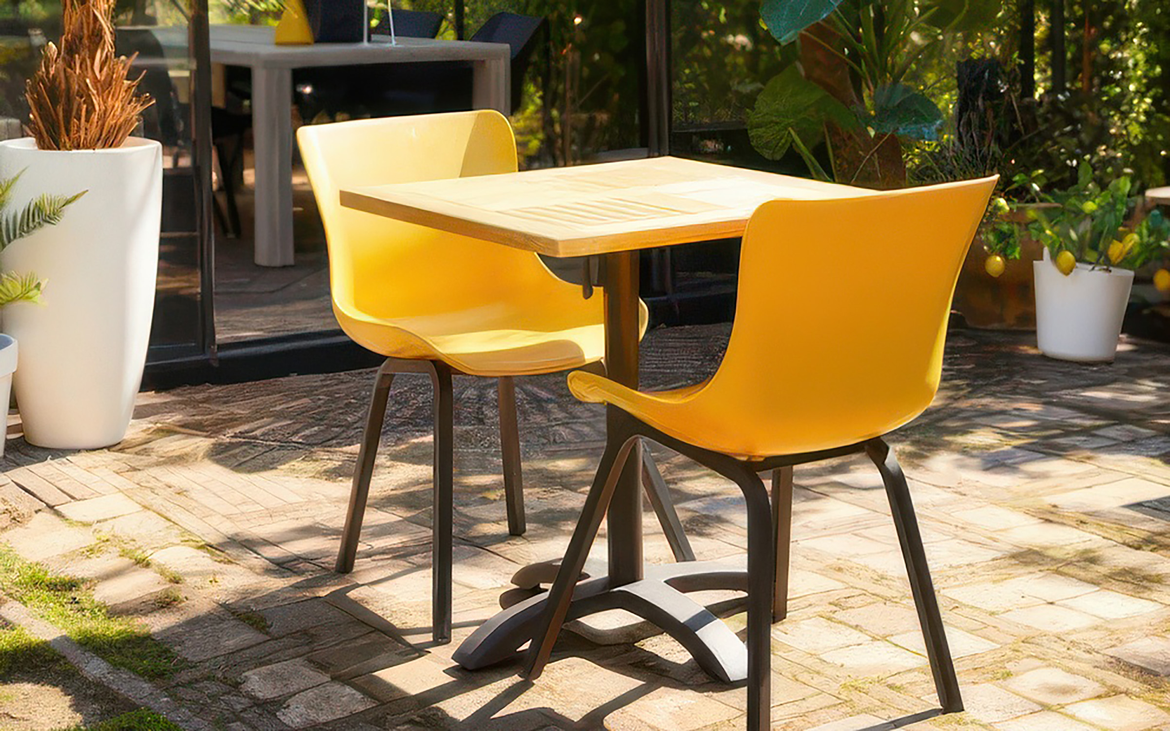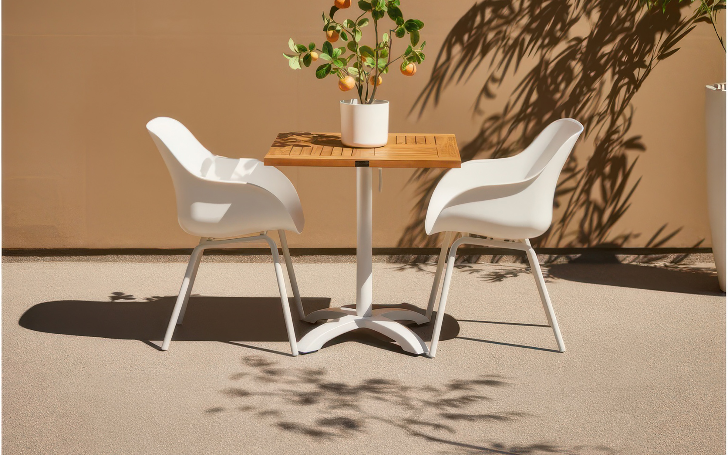 Konstrukcja z aluminium malowanego proszkowo – lekka, stabilna i odporna na korozję. Blat wykonany z drewna teakowego o naturalnej odporności na promieniowanie UV, wilgoć i zabrudzenia. Materiały te gwarantują trwałość oraz elegancki wygląd przez wiele sezonów użytkowania w ogrodzie i na tarasie.
