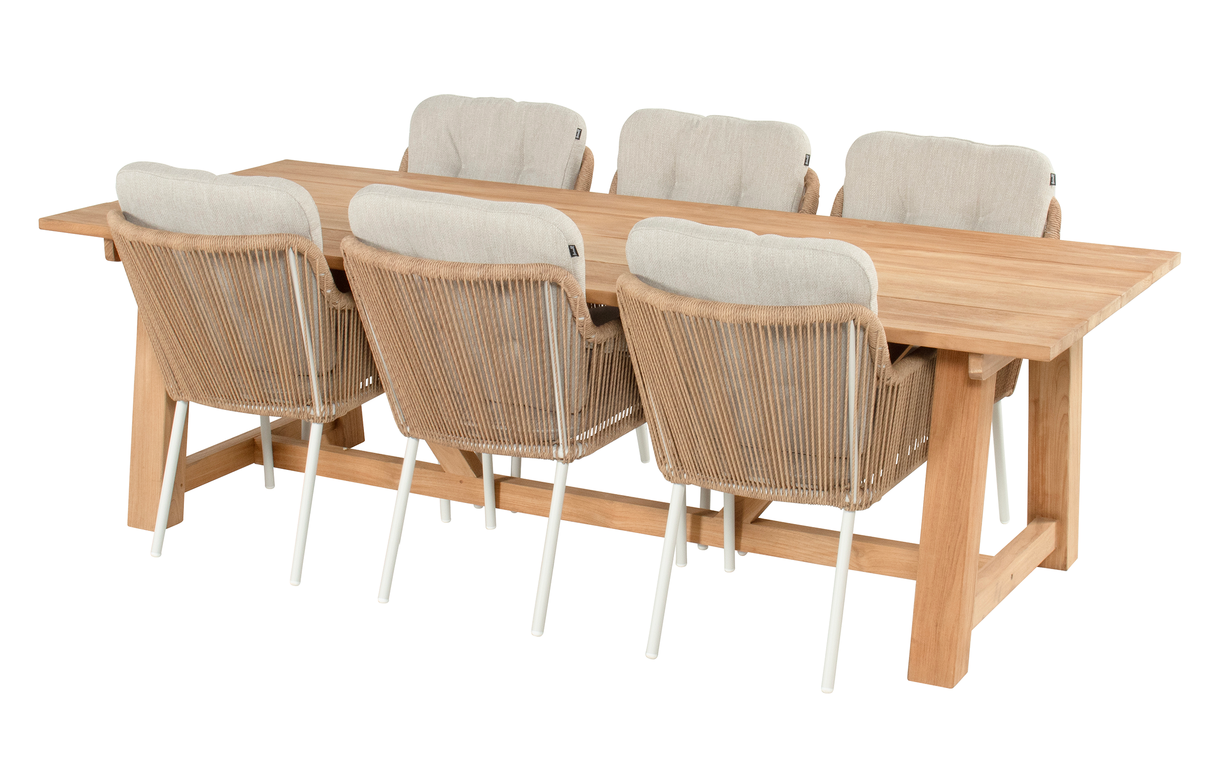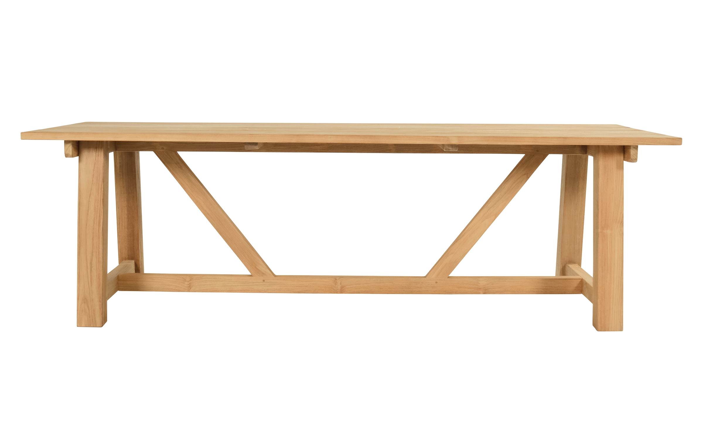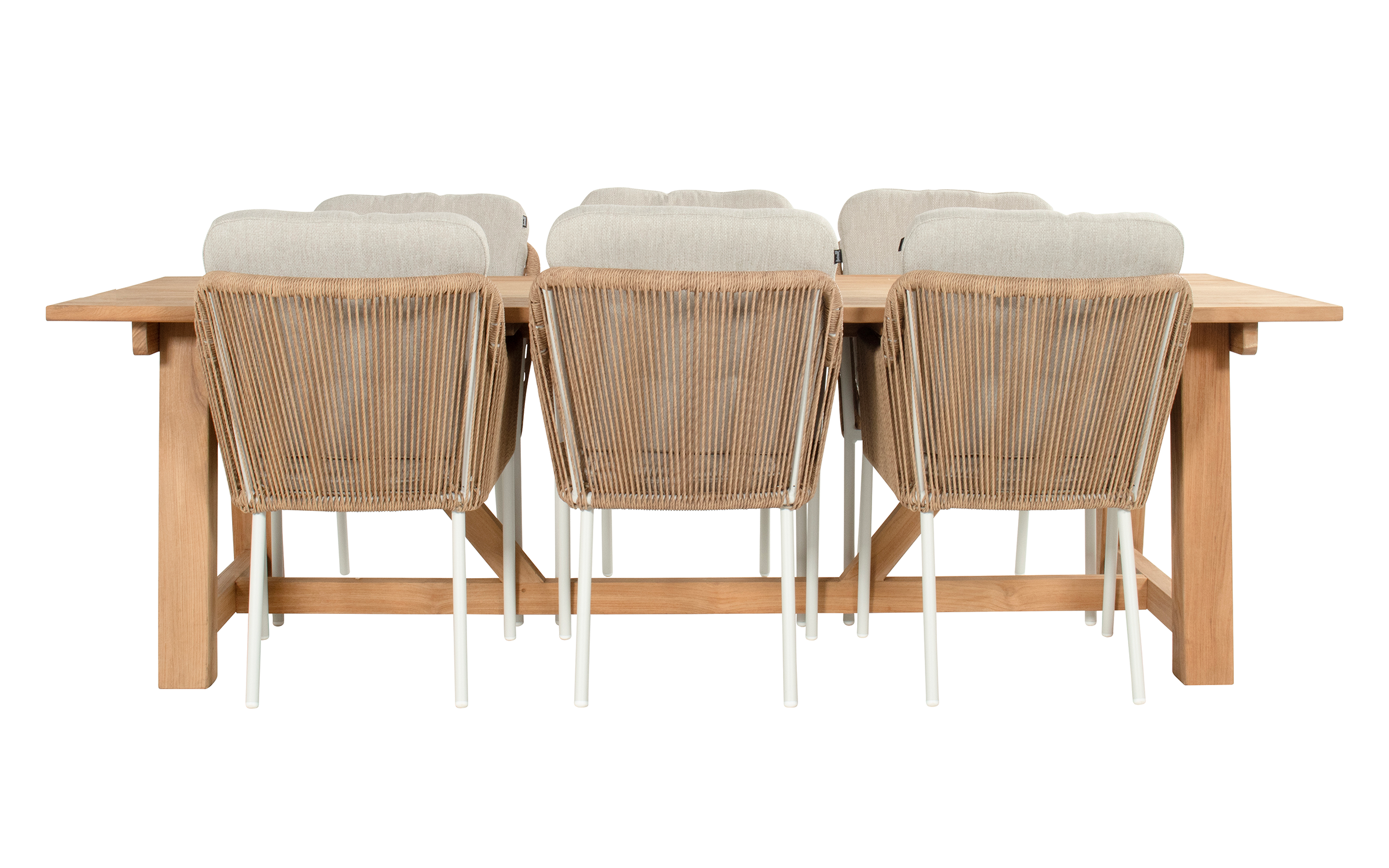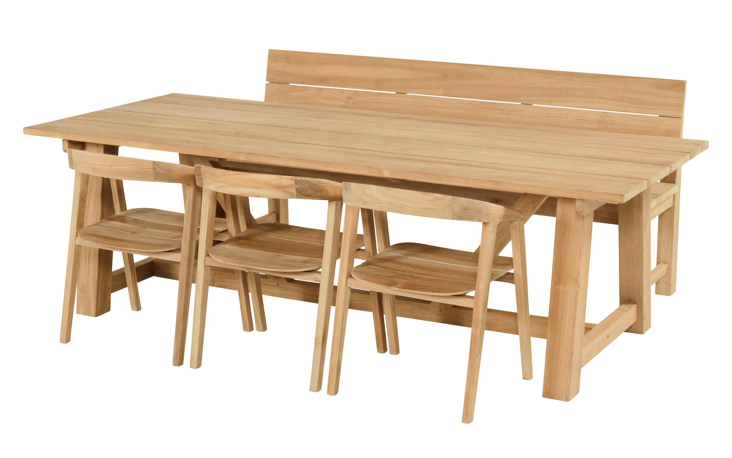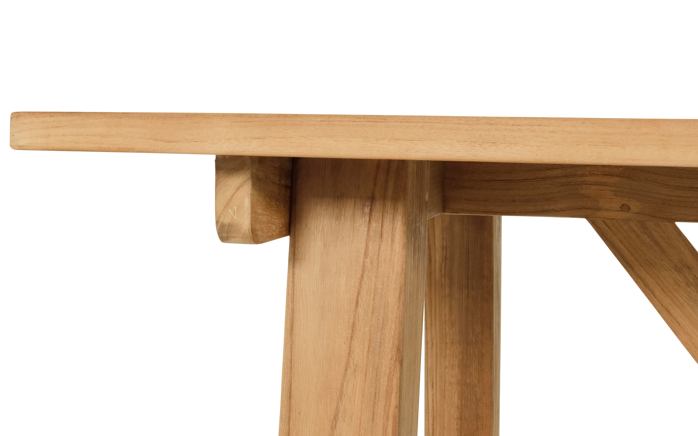 Konstrukcja oraz blat wykonane są w całości z certyfikowanego drewna teakowego (SVLK), które wyróżnia się odpornością na wilgoć, zmienne temperatury i promieniowanie UV. Stół jest przeznaczony do całorocznego użytku zewnętrznego, a jego naturalne wykończenie nadaje mu ponadczasowy wygląd i ciepły charakter.