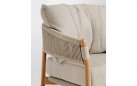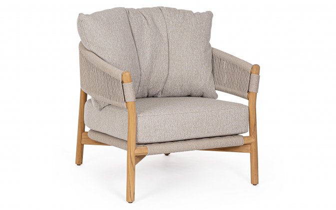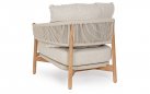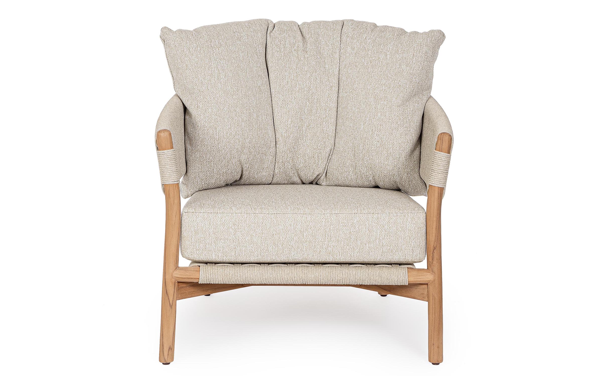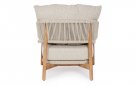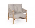 Fotel ogrodowy z drewna teakowego premium z plecionką na bokach i plecach fotela z beżowej liny polipropylenowej.
