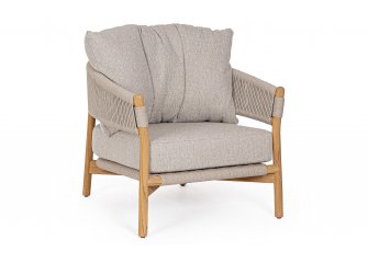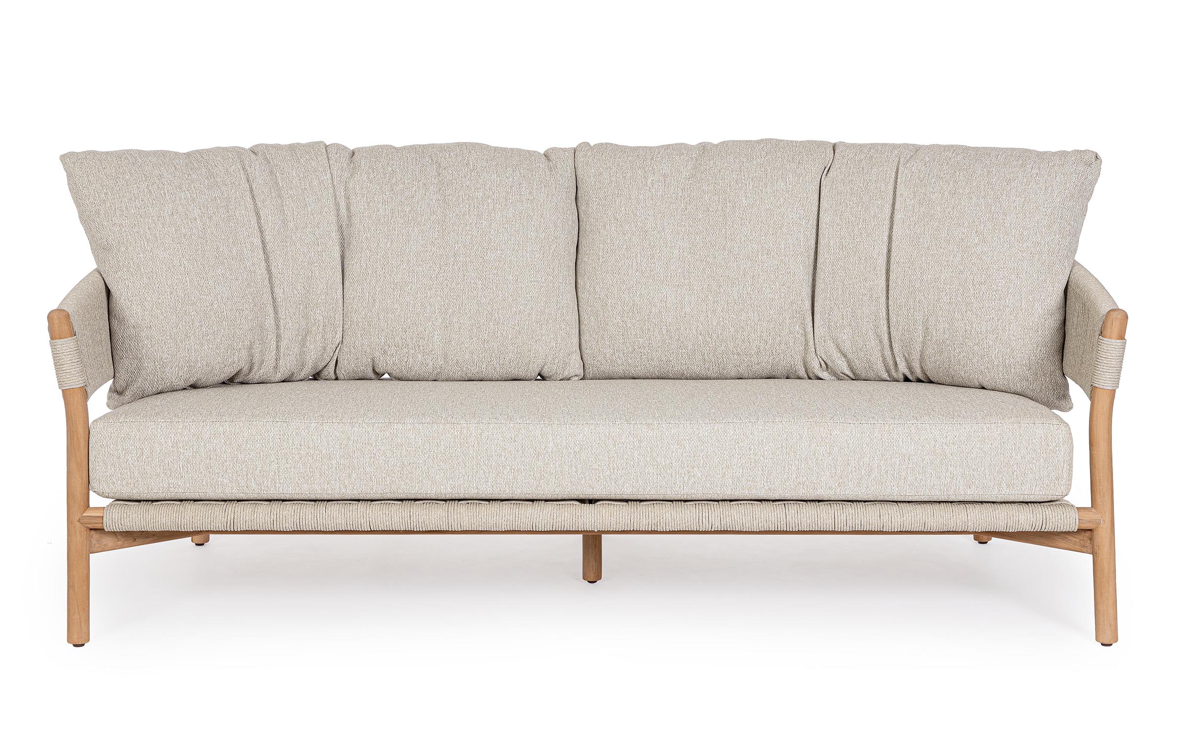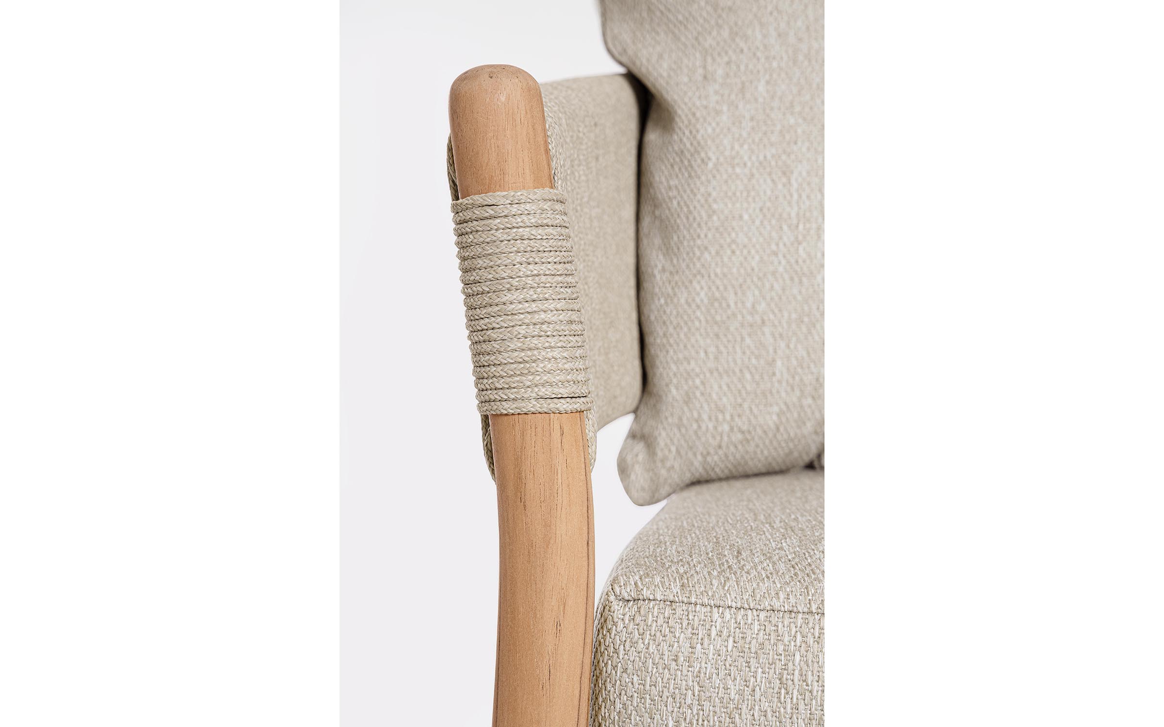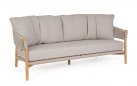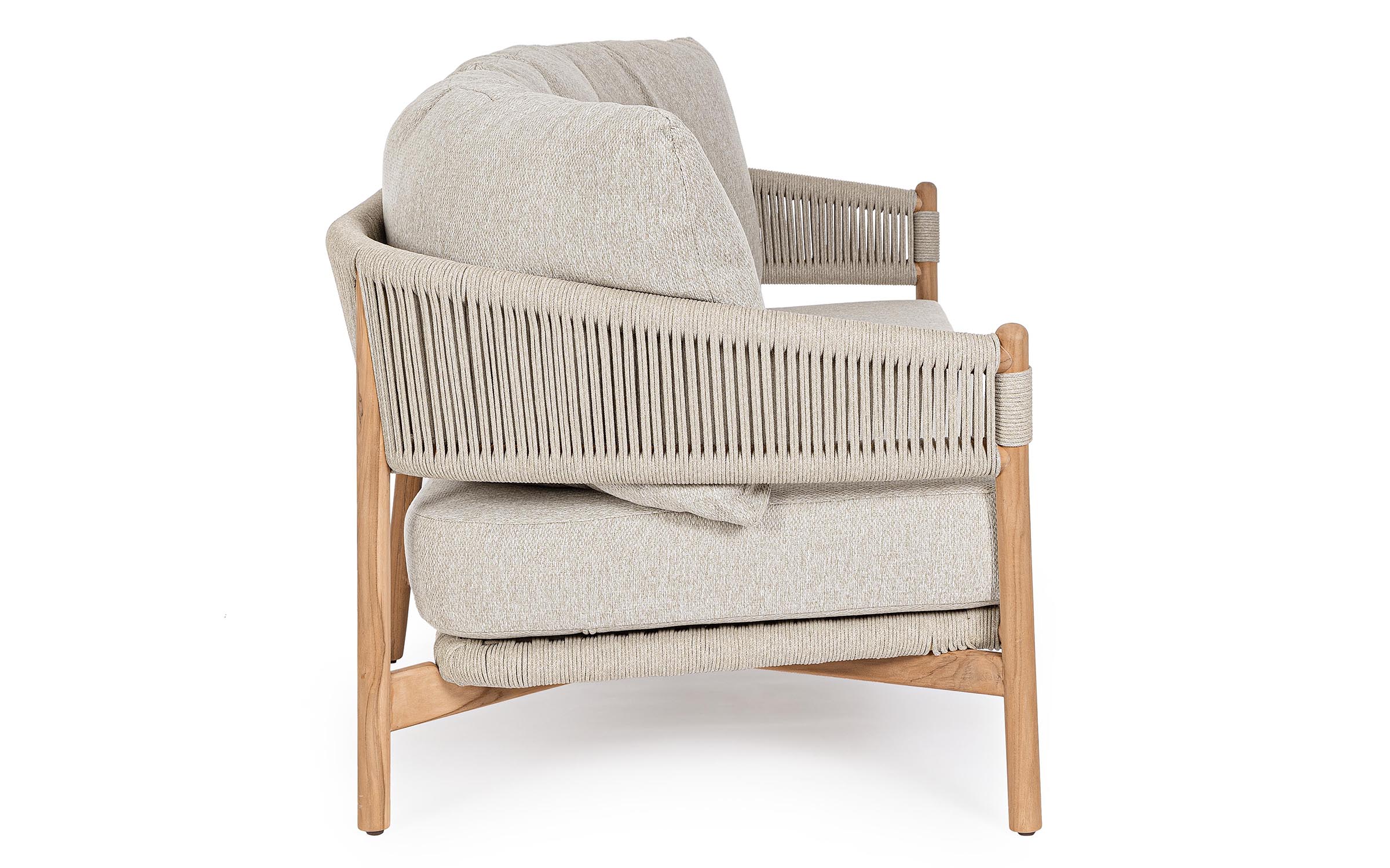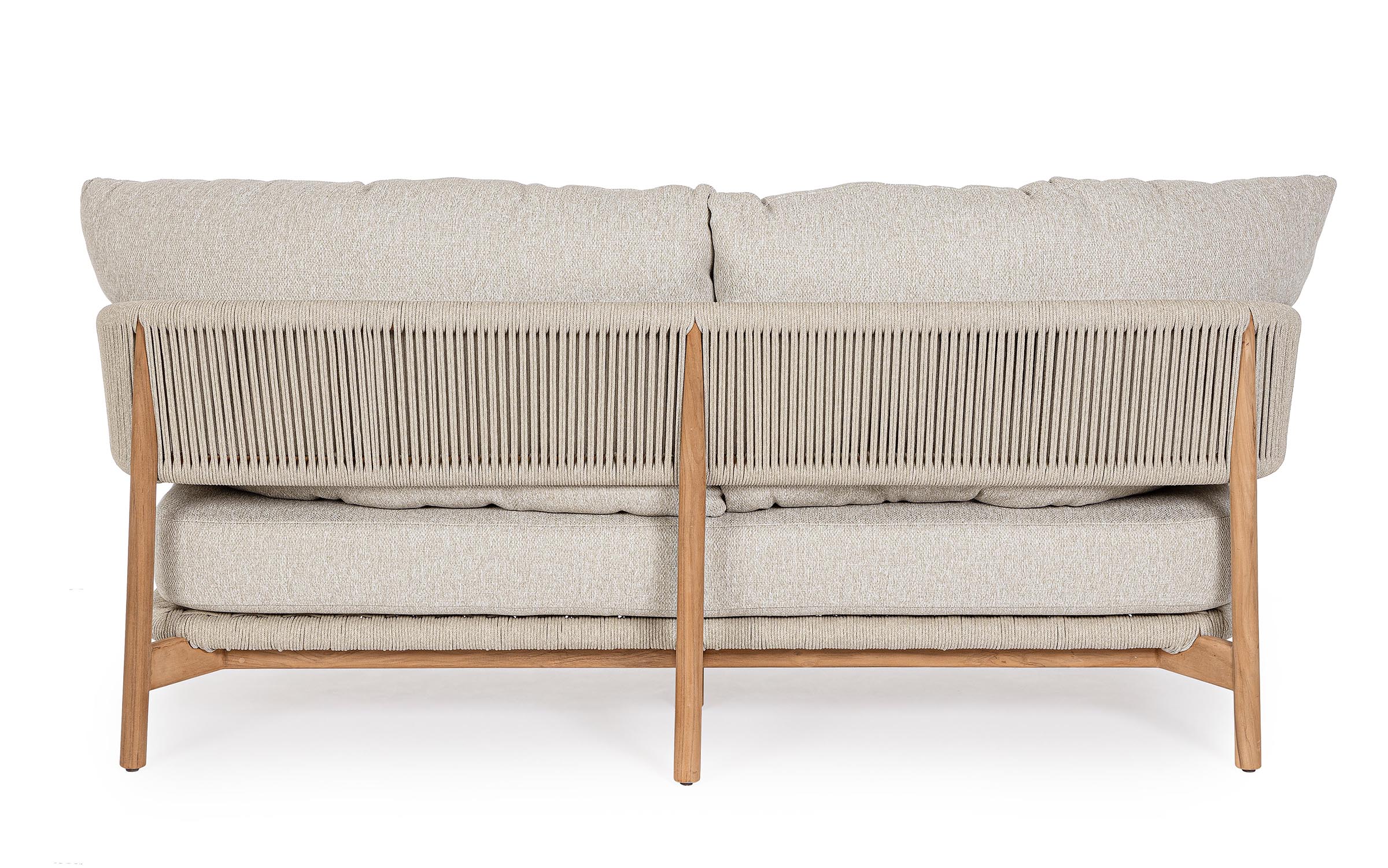 Sofa ogrodowa z drewna teakowego premium z plecionką na bokach i plecach sofy z beżowej liny polipropylenowej.