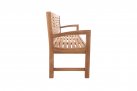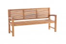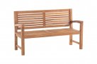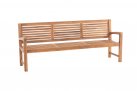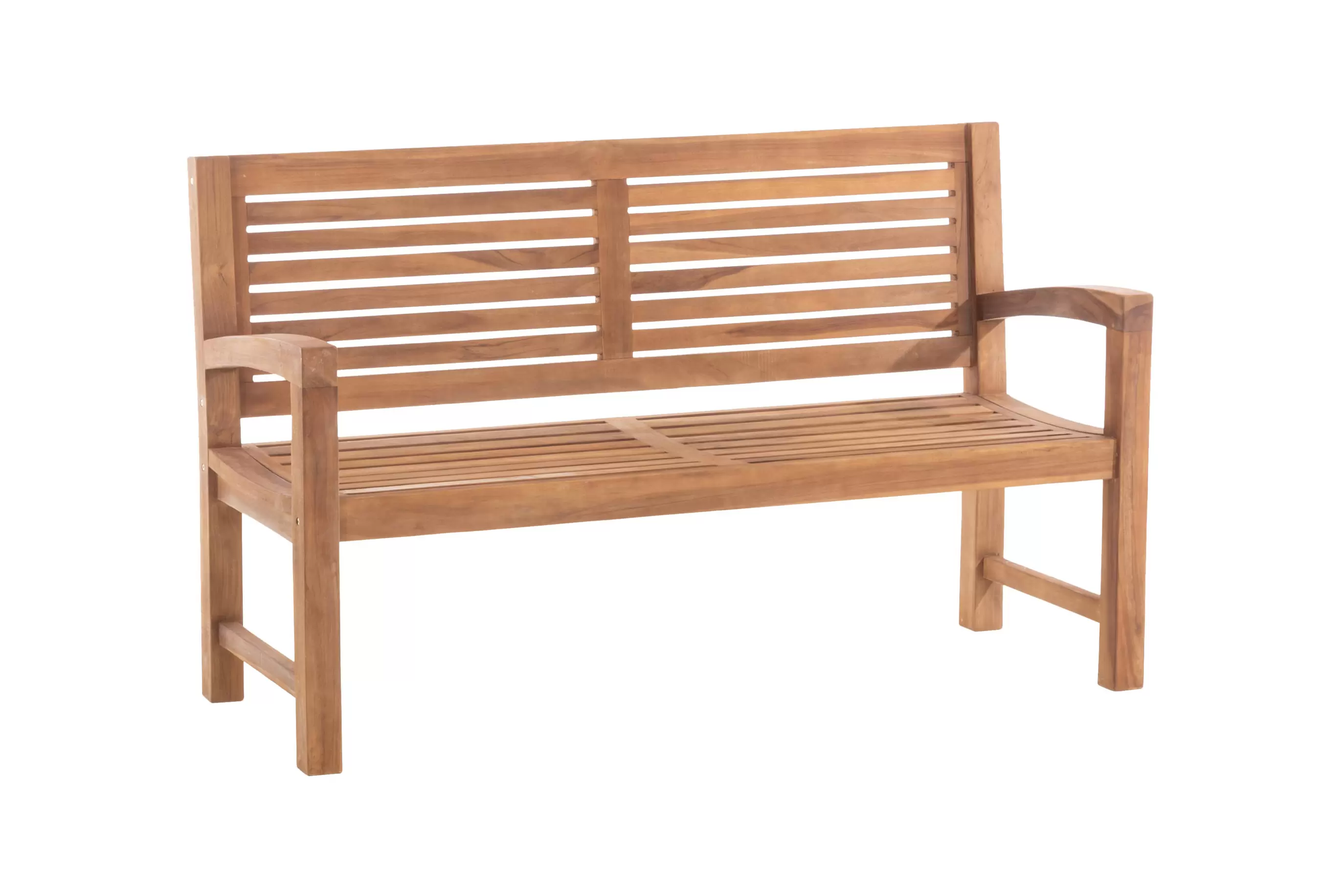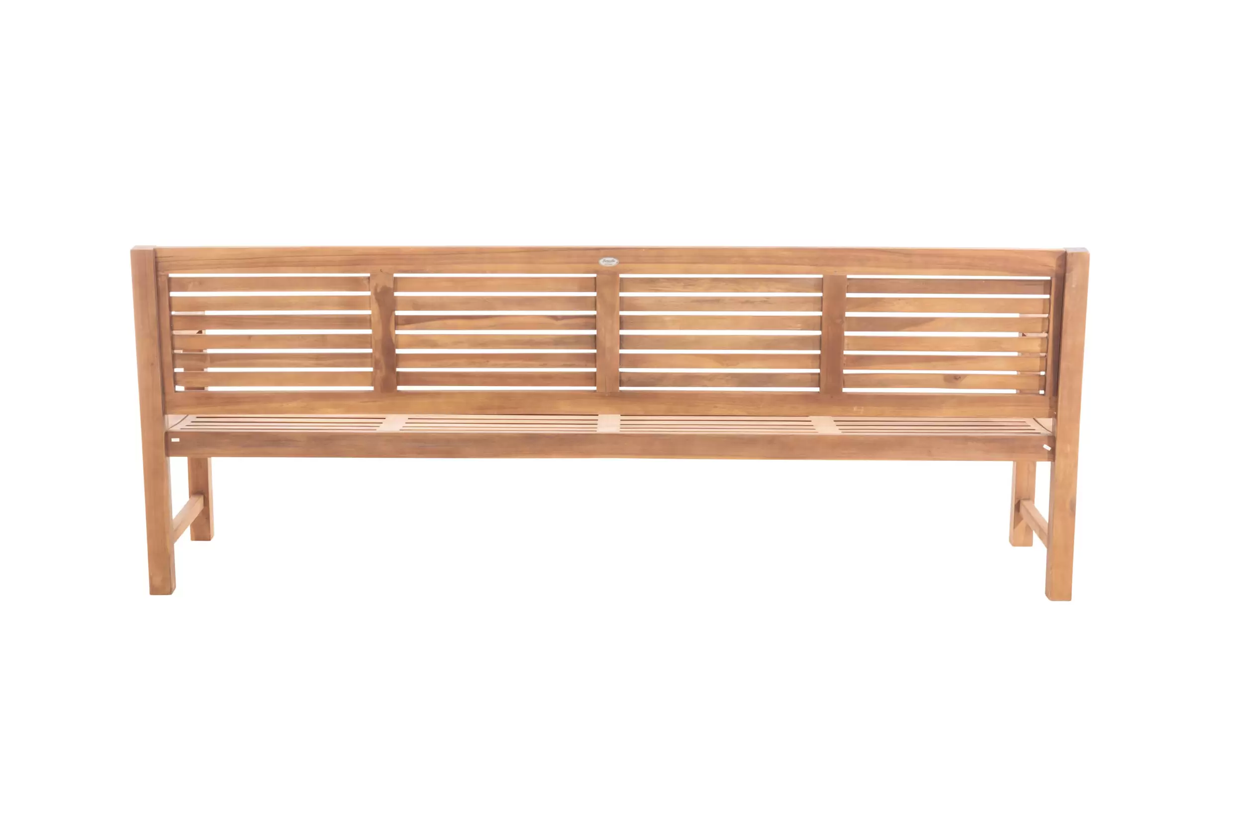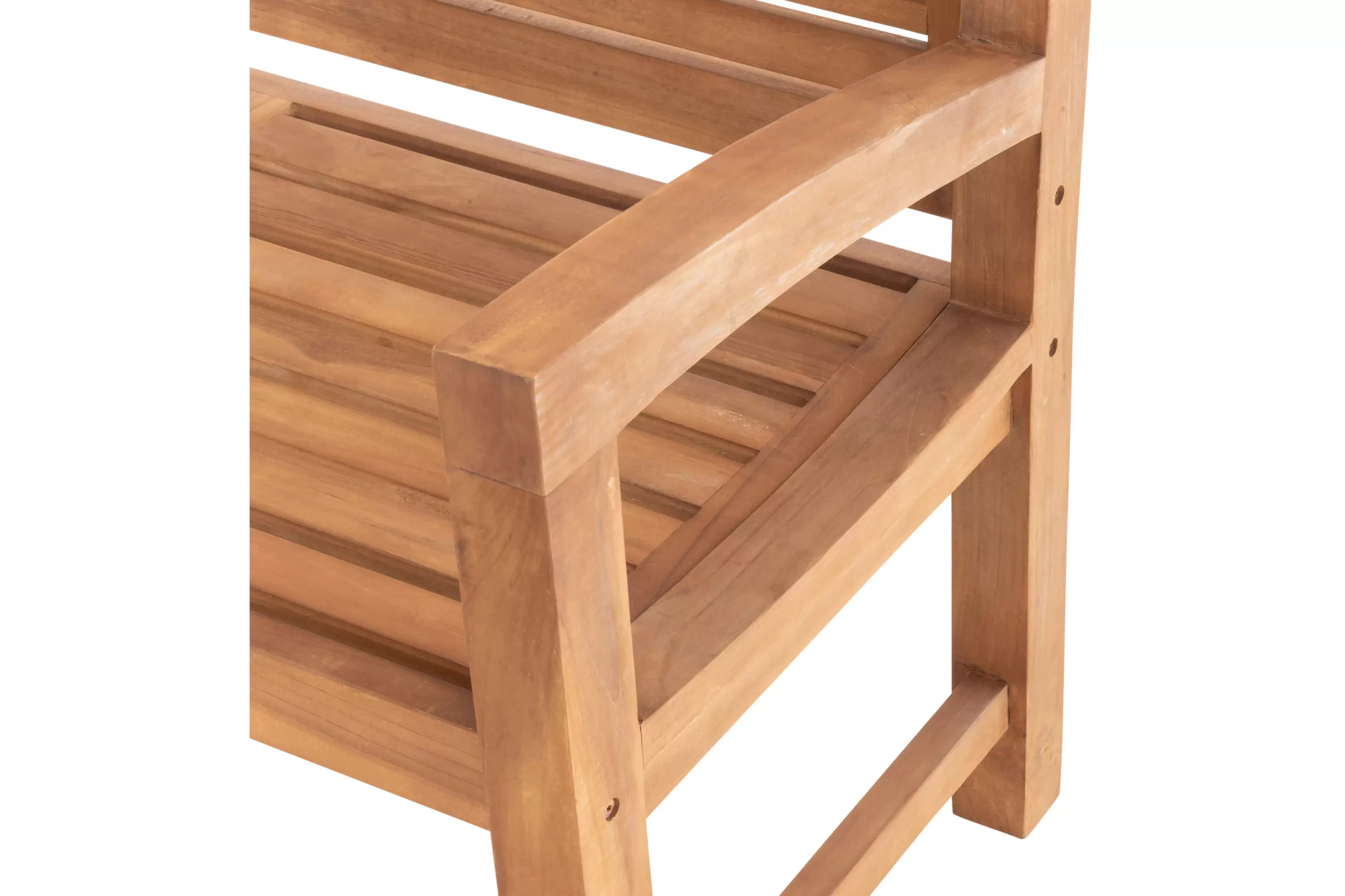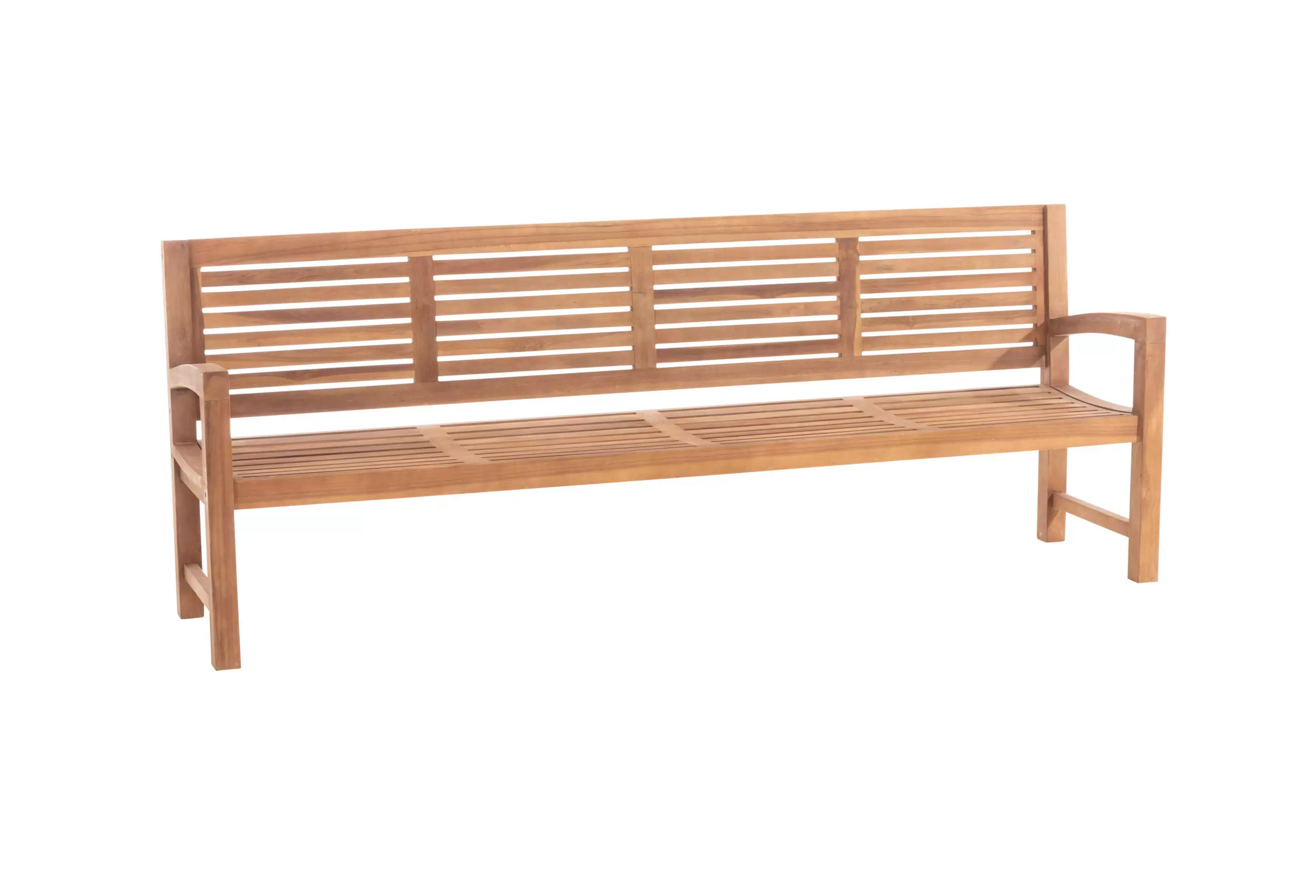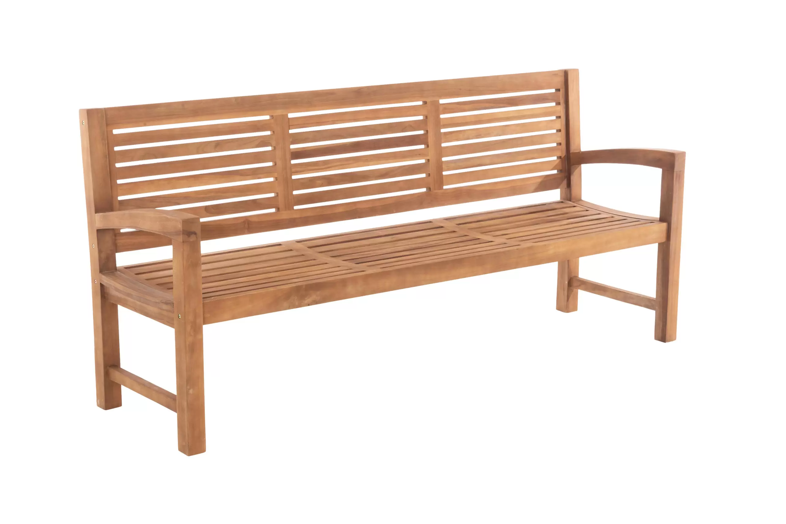 Solidna ławka wykonana z litego drewna tekowego. Ławka o surowym wykończeniu została zaprojektowana z myślą o wygodnym siedzeniu. Ponadczasowy design listew, lekko zakrzywione siedzisko i przyjemnie pochylone oparcie to atrakcyjne detale. Całości dopełniają wygodne podłokietniki. Stabilne nogi składają się z desek z litego drewna o profilu 6x6 cm. Dzięki temu meble ogrodowe z drewna tekowego można pozostawić na zewnątrz przez cały rok. Zalecane są odpowiednie oleje pielęgnacyjne do teaku, aby zachować trwały kolor. Ławka jest dostępna w sześciu różnych rozmiarach: 120, 150, 180, 200, 220 i 240 cm.