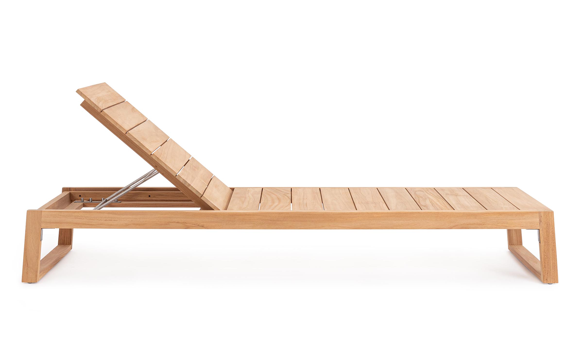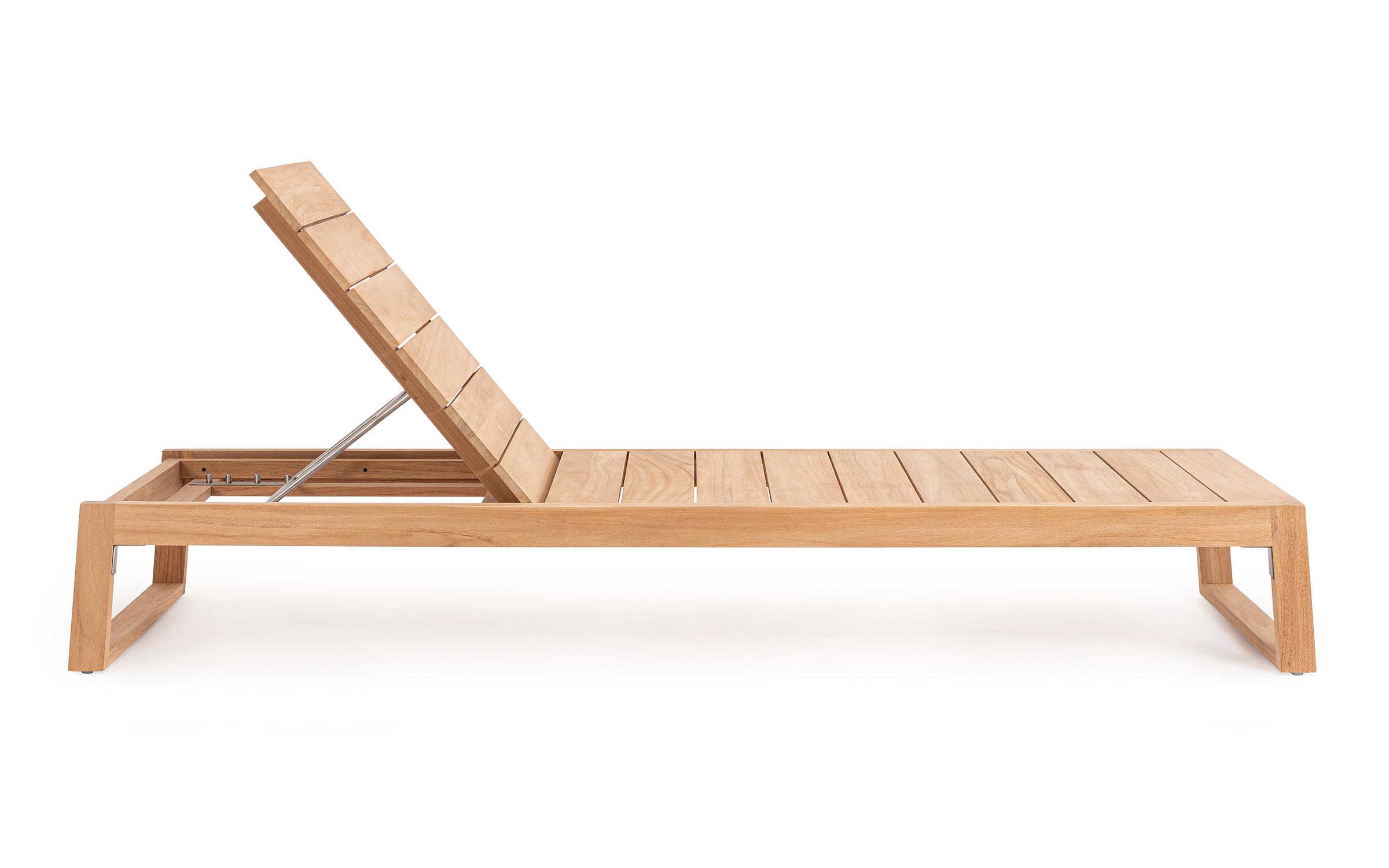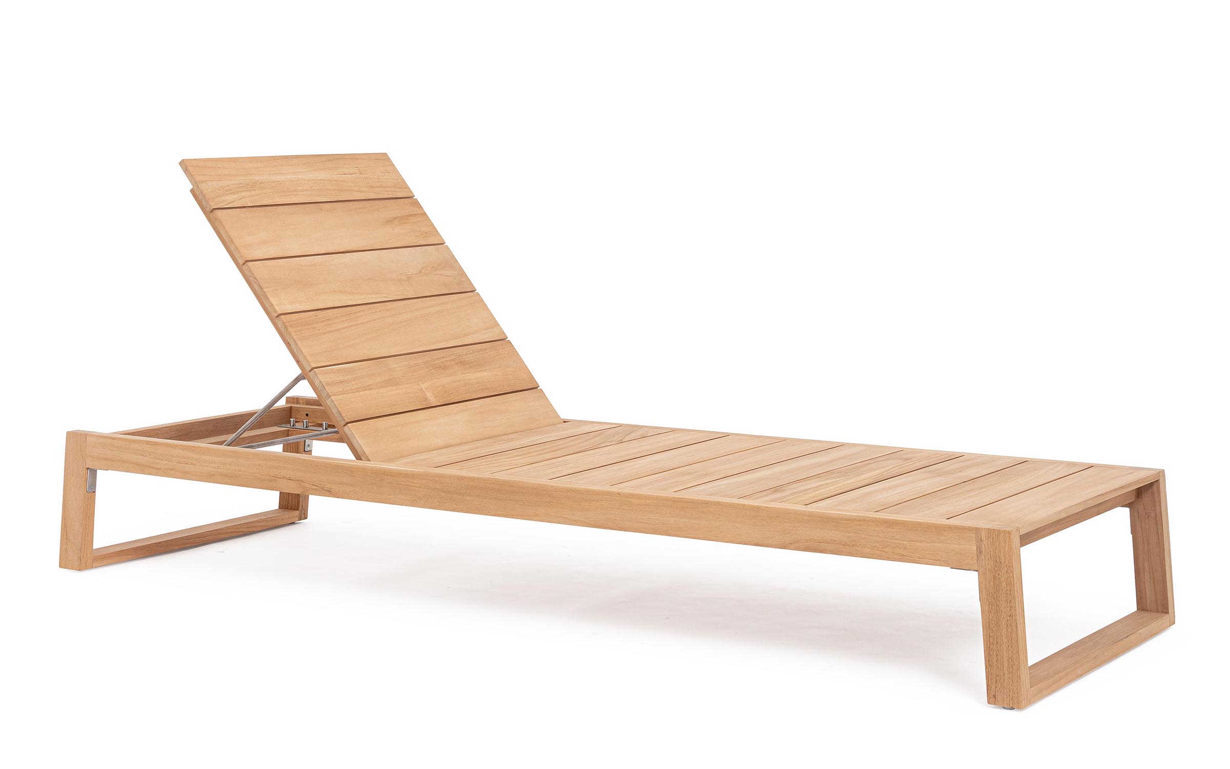 Model wyposażono w oparcie regulowane w 4 pozycjach, co pozwala dopasować kąt nachylenia do wypoczynku, czytania lub opalania. Elementy konstrukcyjne wykonane są ze stali nierdzewnej 304, odpornej na korozję i warunki atmosferyczne.