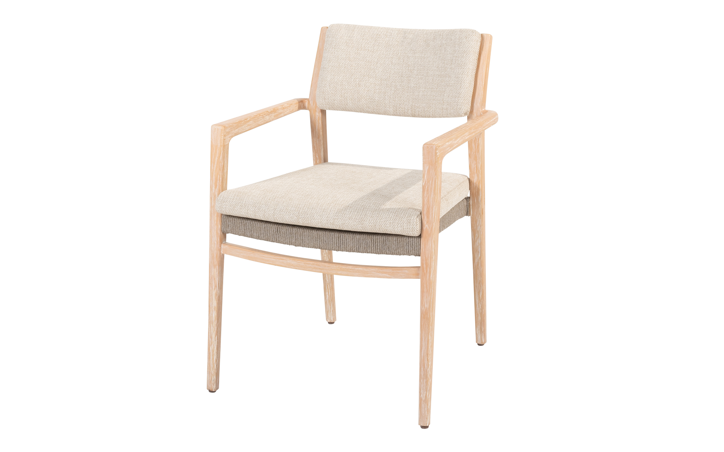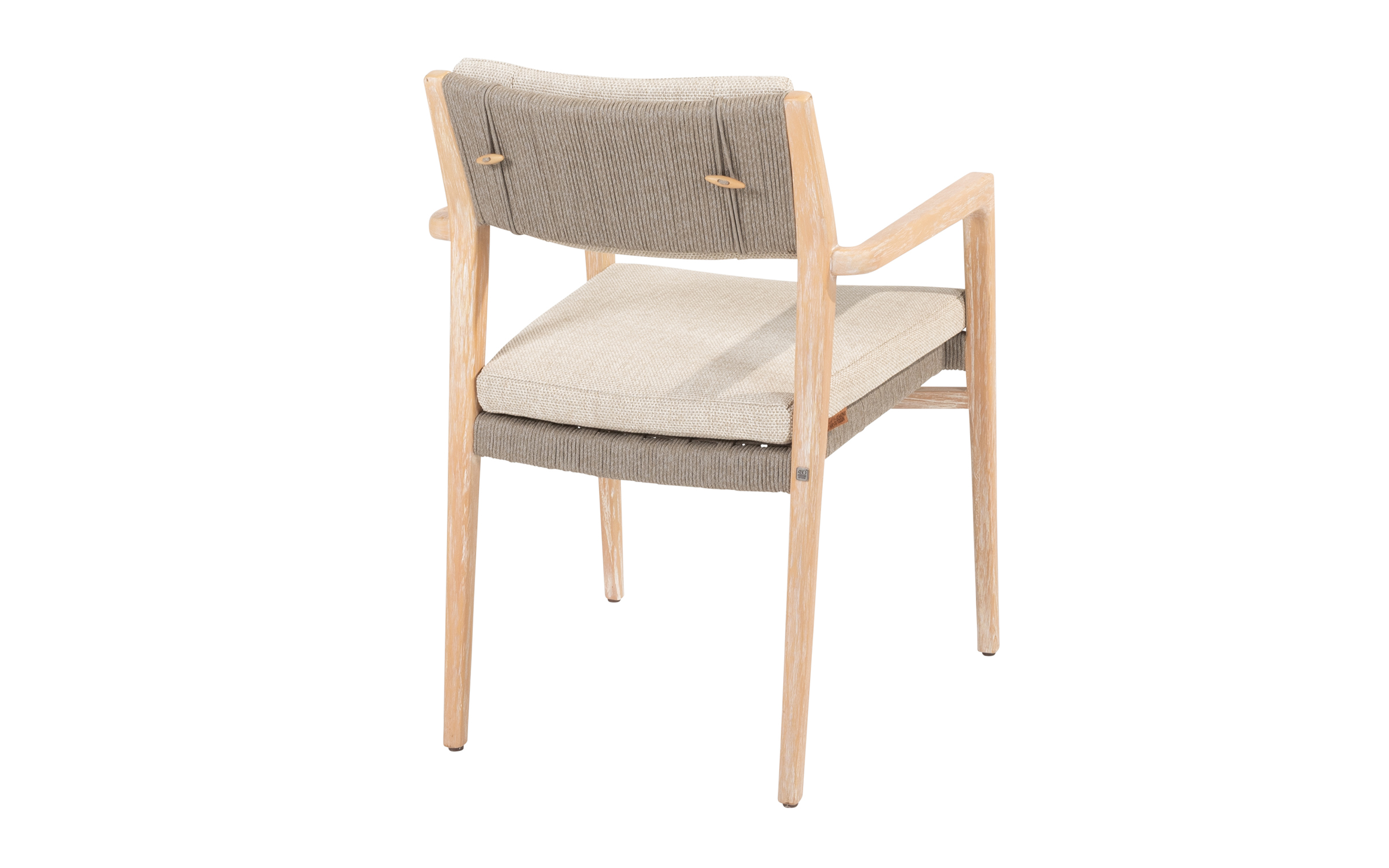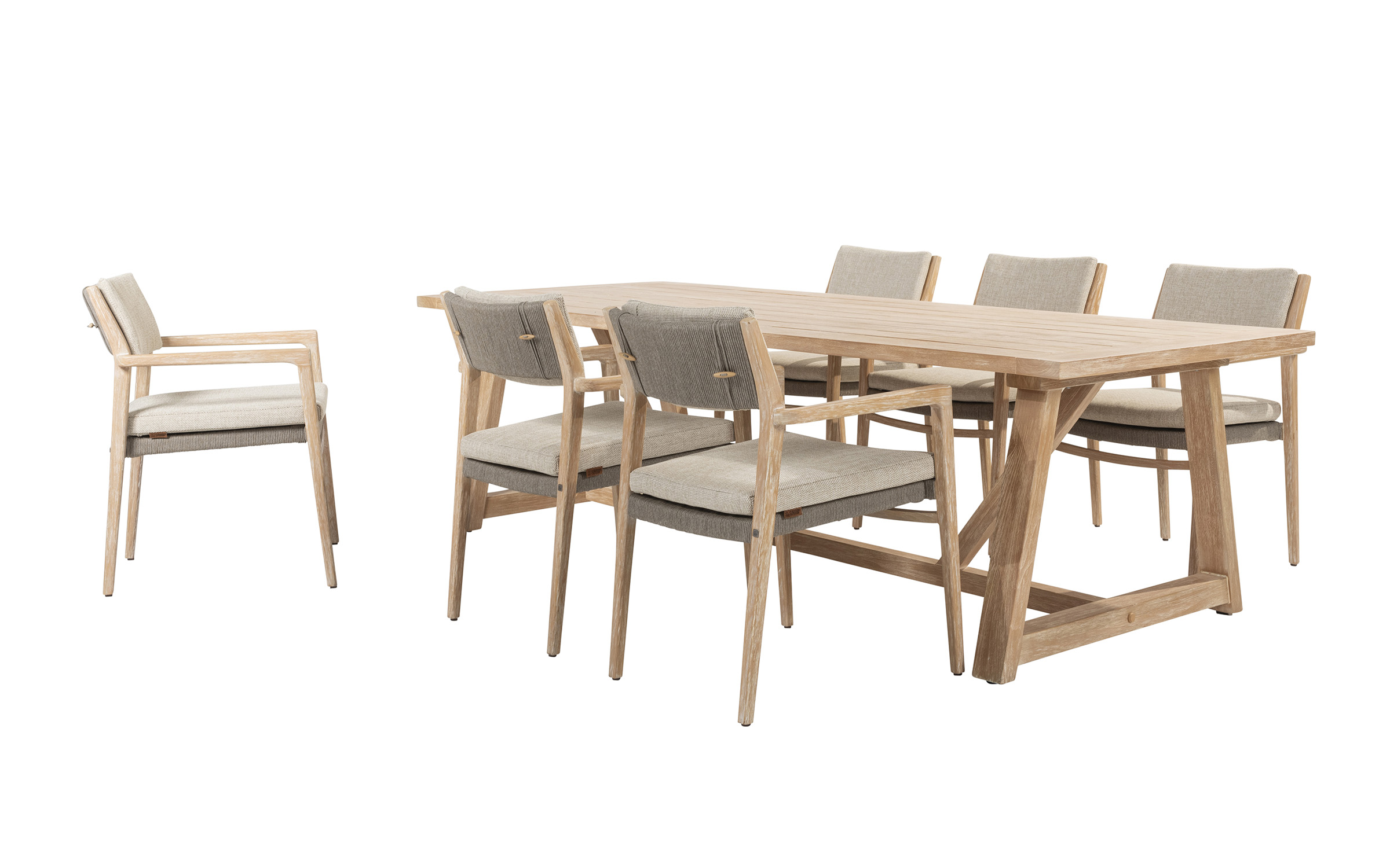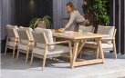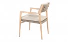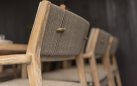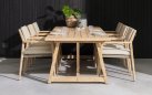 Zestaw jadalniany 4 Seasons Outdoor Julia wykonany ze szczotkowanego drewna tekowego. Krzesło jest wyposażone w lekkie poduszki w kolorze taupe i ma piękną, wysokiej jakości ramę z drewna tekowego wykończoną liną polipropylenową w kolorze taupe.