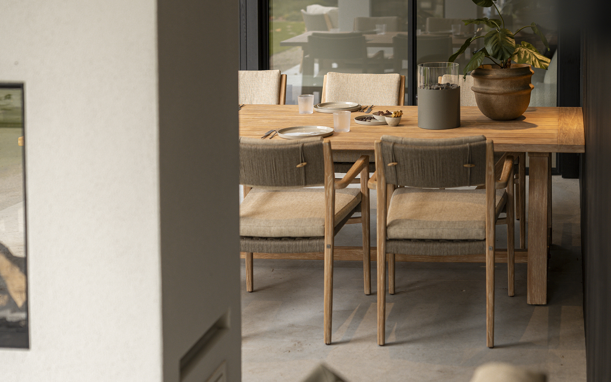 Do kompletu dobrano stół NOAH. Stół do jadalni wyróżnia się piękną obróbką drewna tekowego (szczotkowanego drewna tekowego), w której usunięto miękkie części drewna tekowego i stworzono piękną strukturę powierzchni.