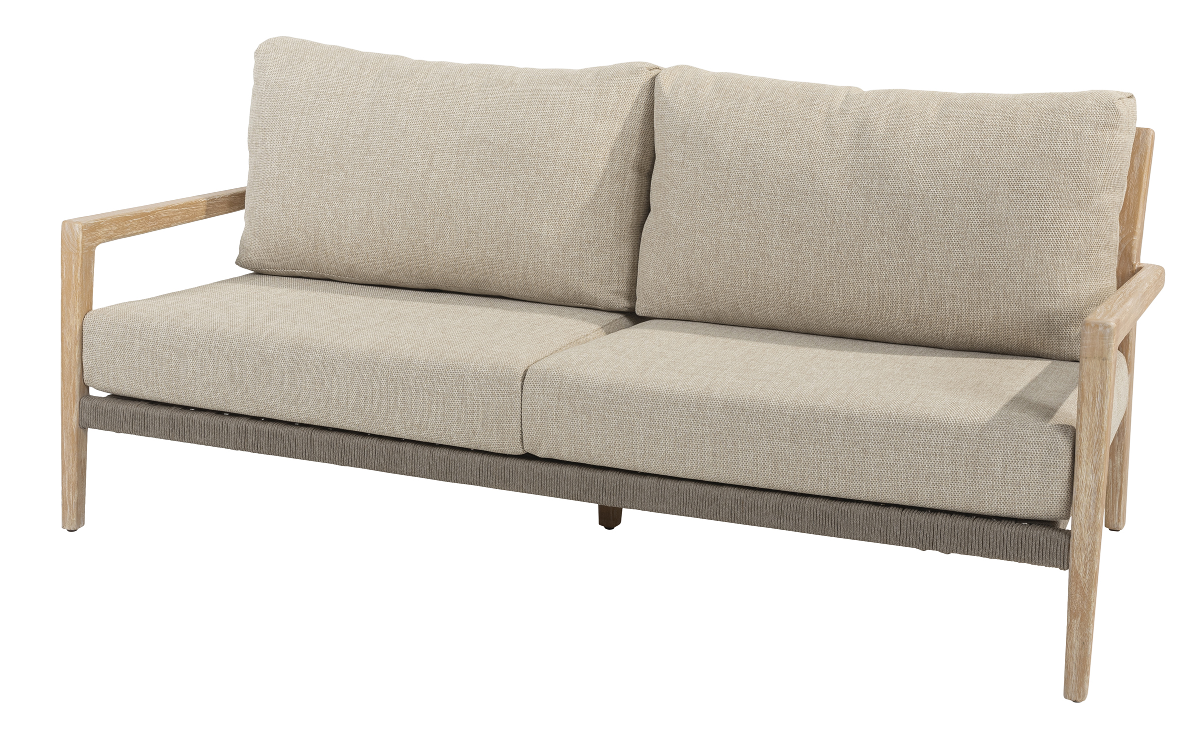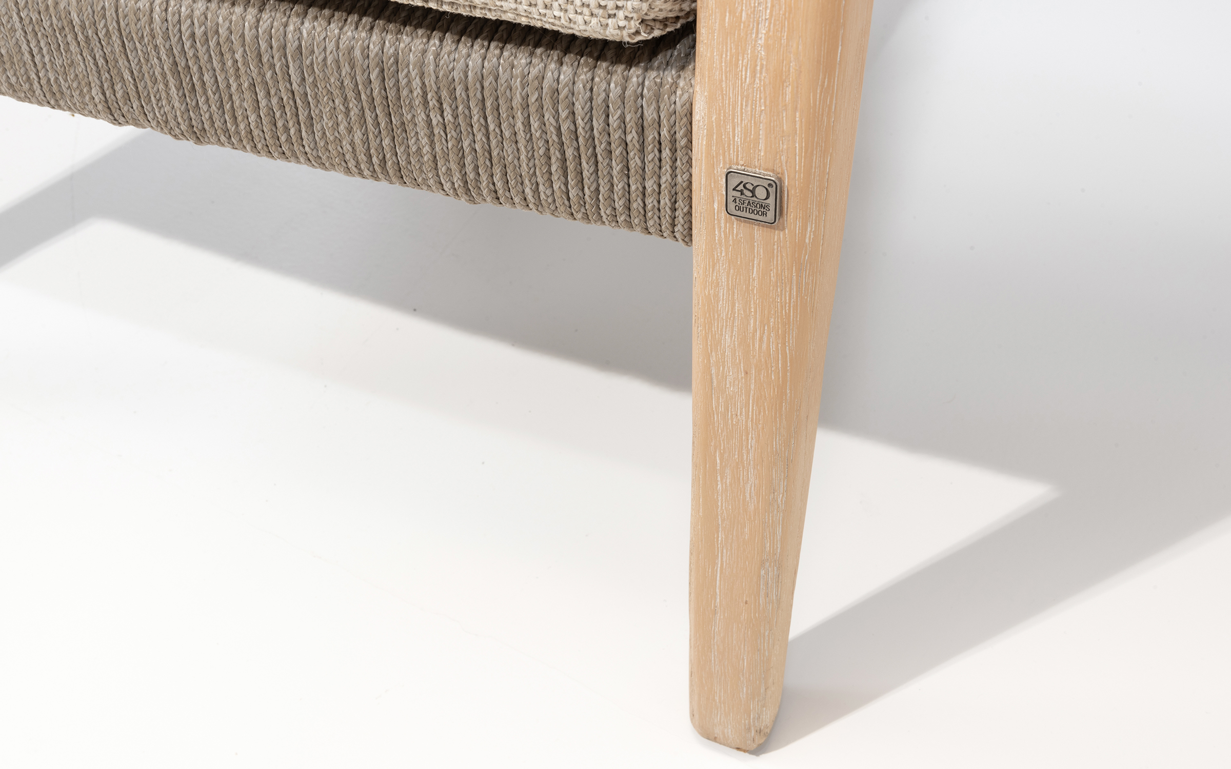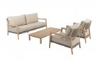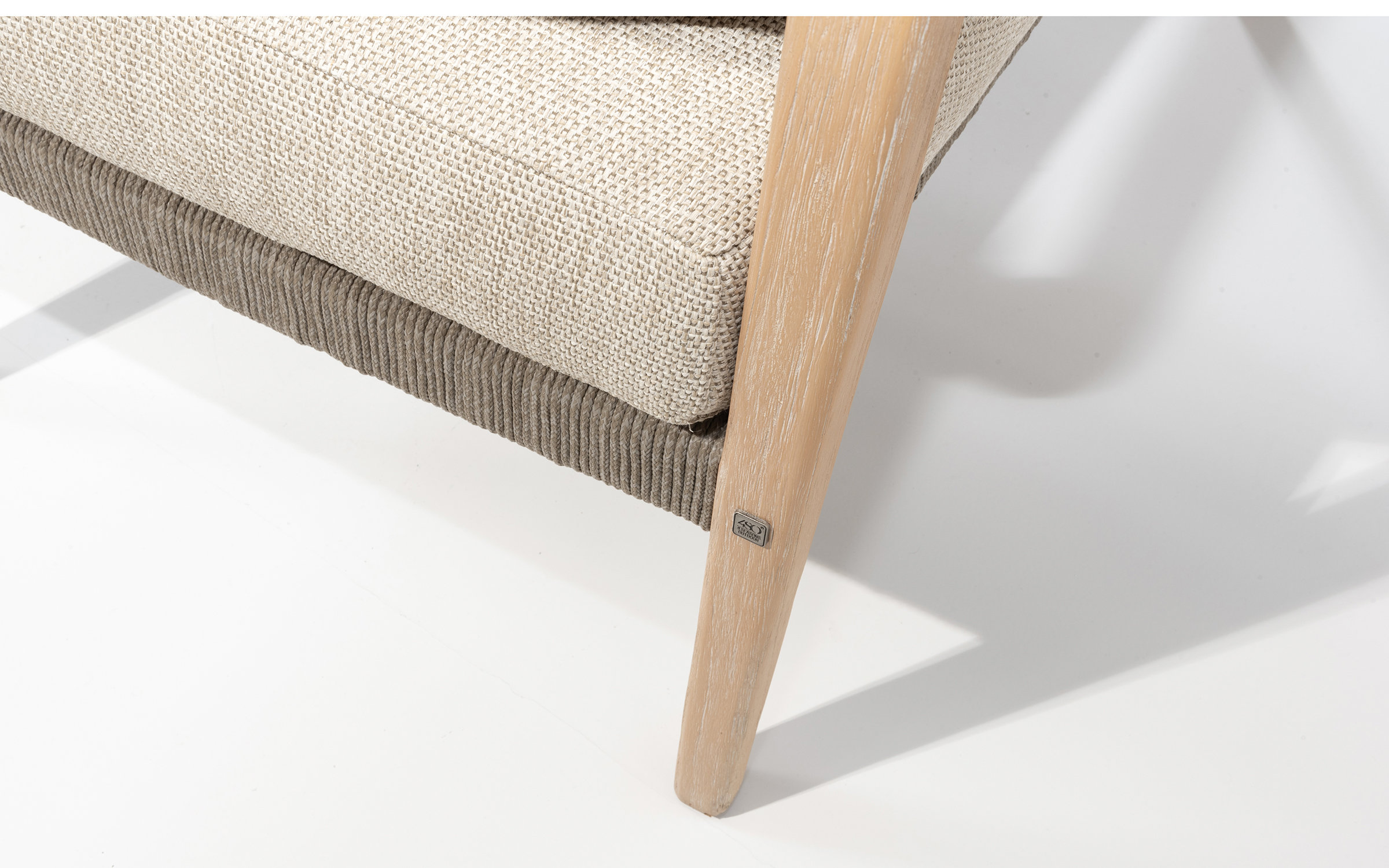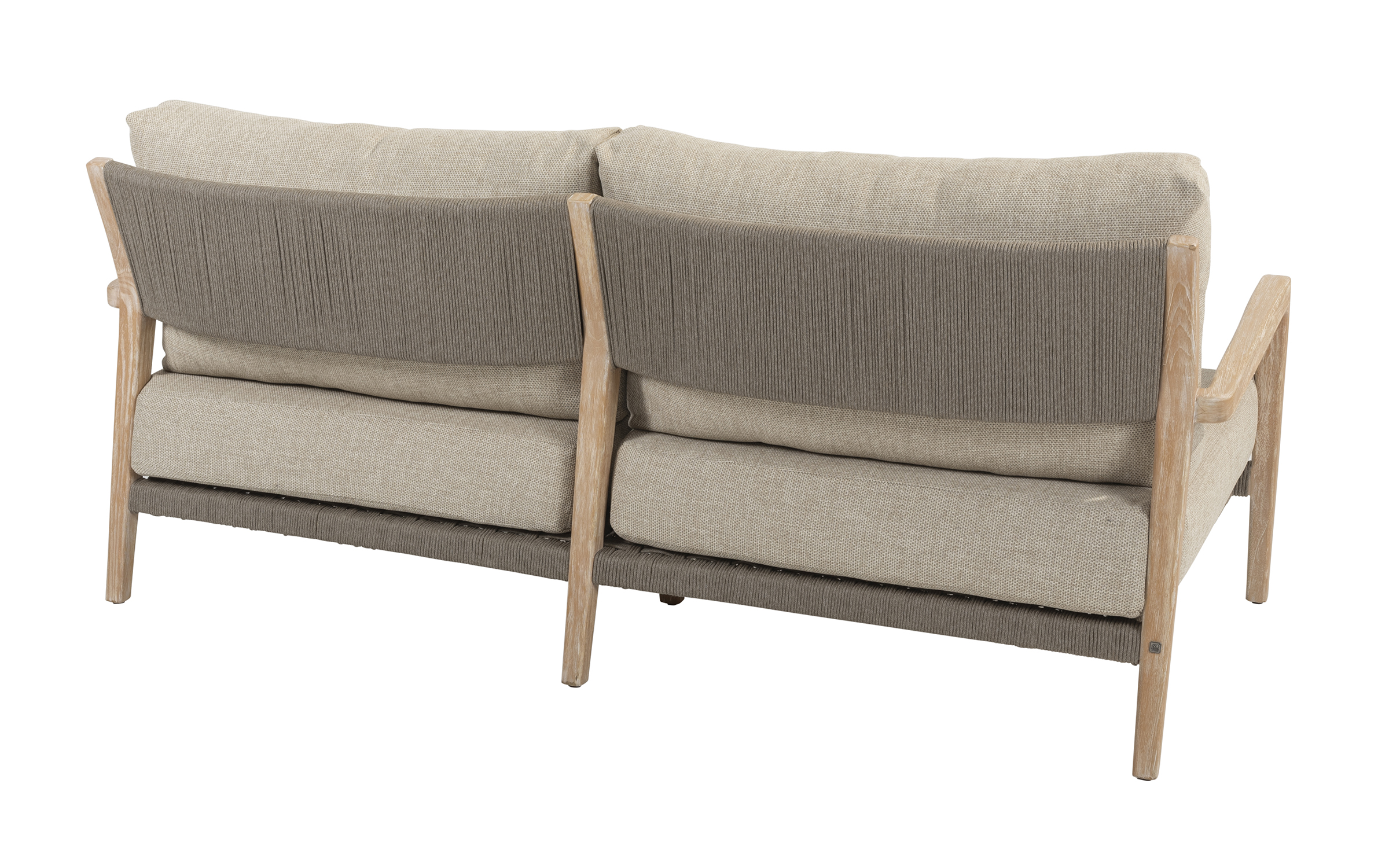 Sofa 3-osobowa wypoczynkowa Julia od 4 Seasons Outdoor jest pięknie zaprojektowana, z elegancko zaprojektowanymi podłokietnikami z drewna tekowego, cudownie miękkimi poduszkami z wyjątkowymi pokrowcami i aluminiową podstawą z efektownym wykończeniem z liny.