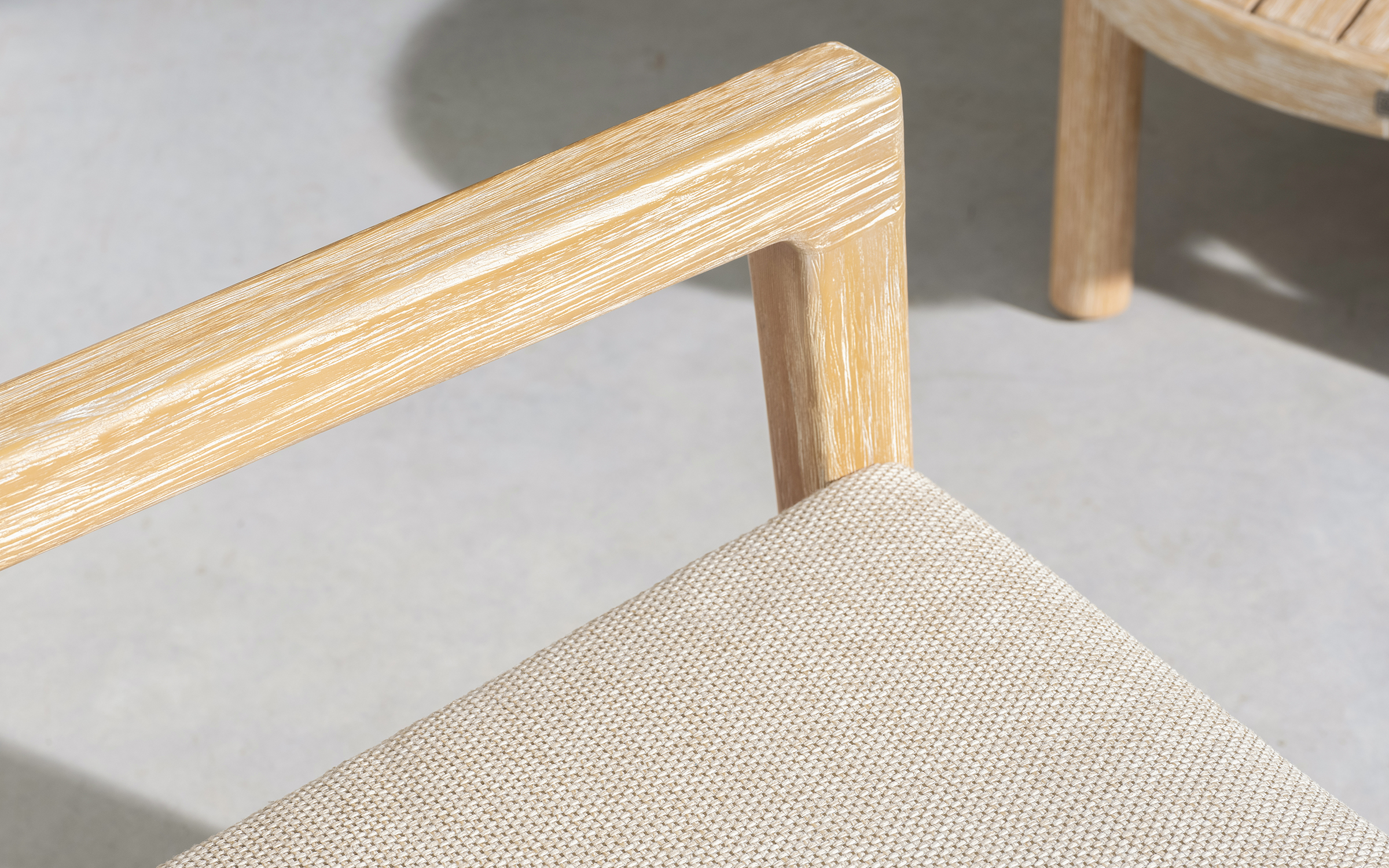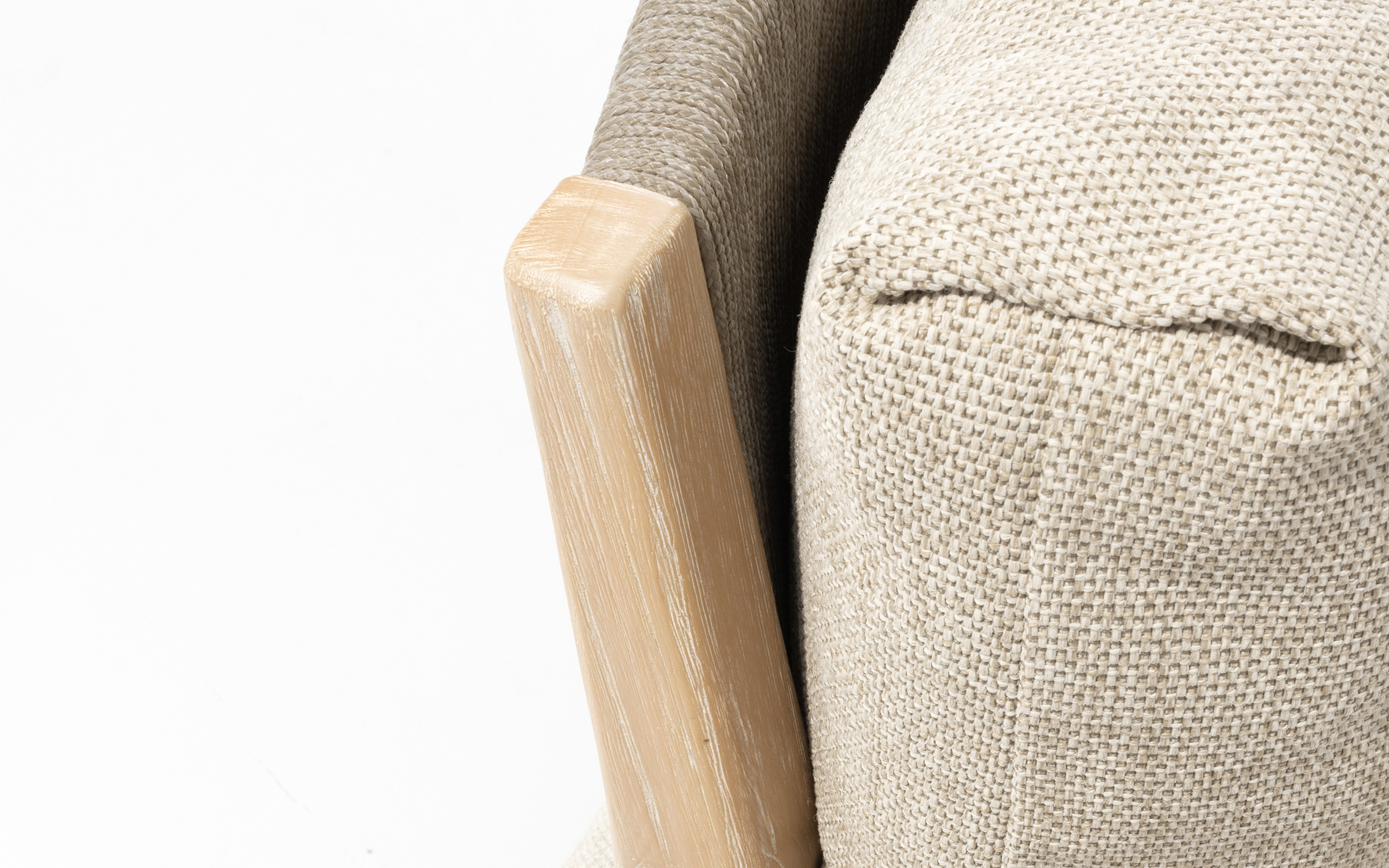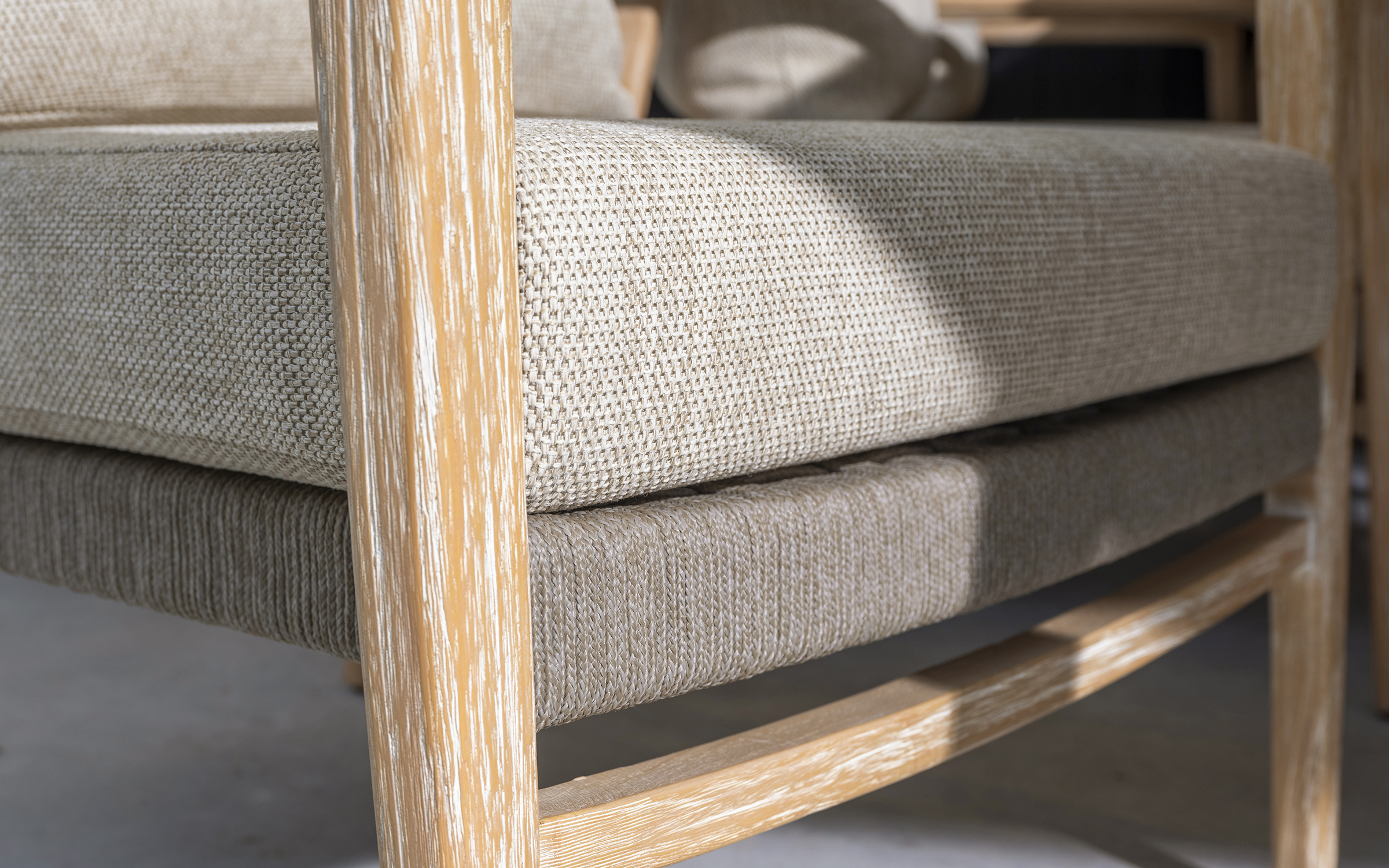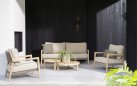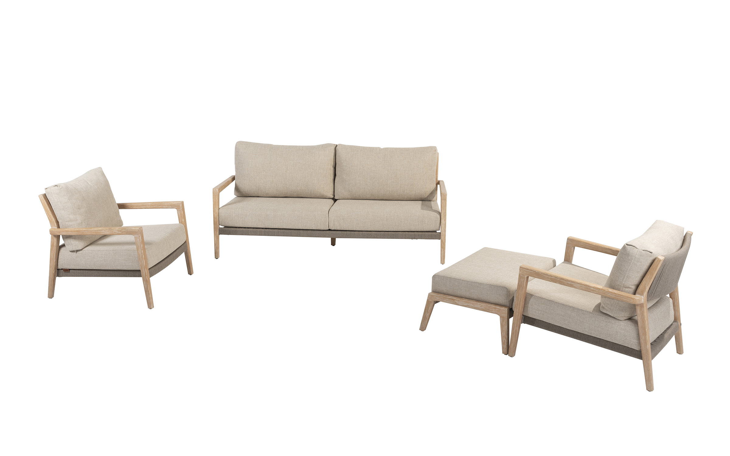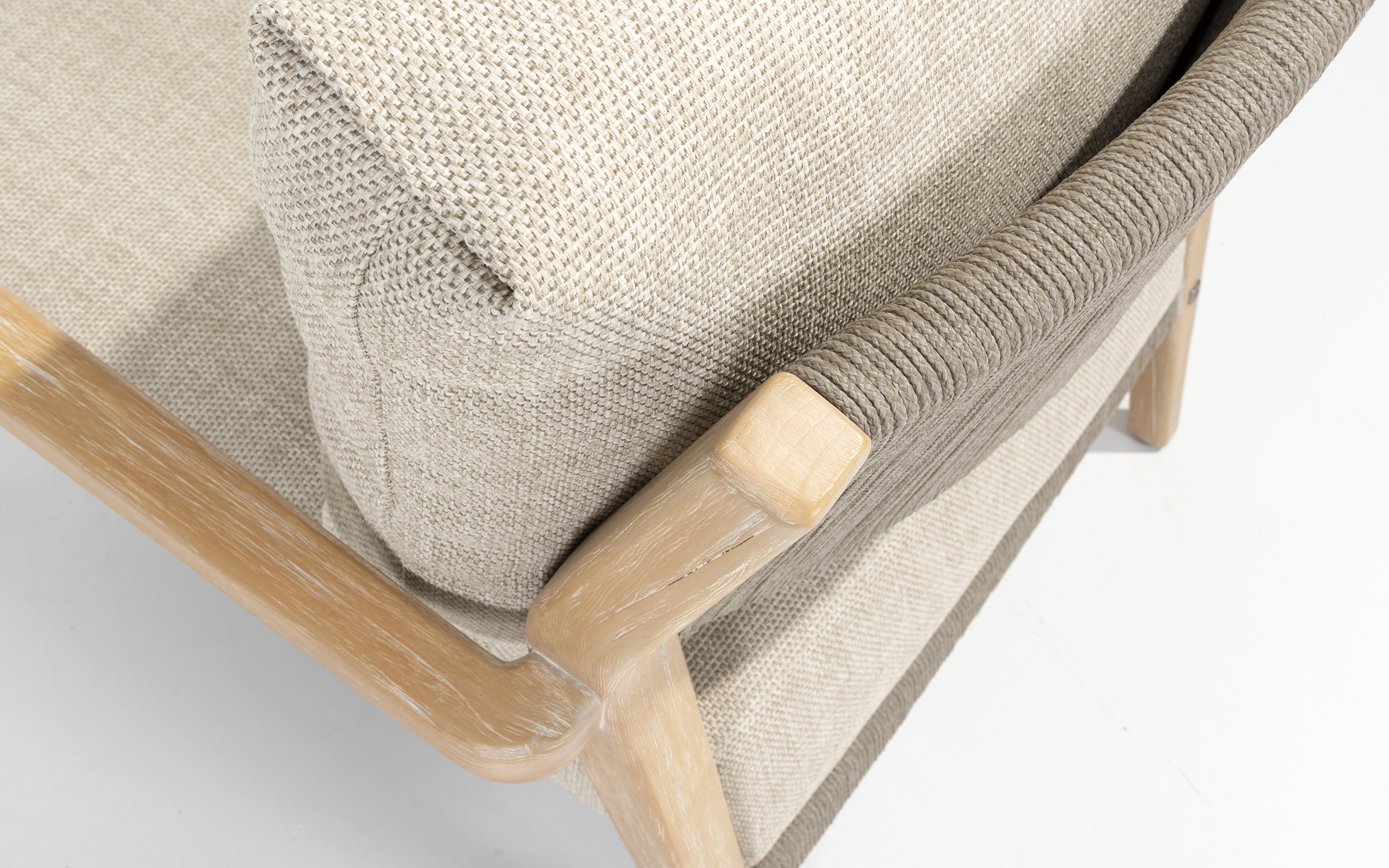 Sofa 3-osobowa wypoczynkowa Julia od 4 Seasons Outdoor jest pięknie zaprojektowana, z elegancko zaprojektowanymi podłokietnikami z drewna tekowego, cudownie miękkimi poduszkami z wyjątkowymi pokrowcami i aluminiową podstawą z efektownym wykończeniem z liny.