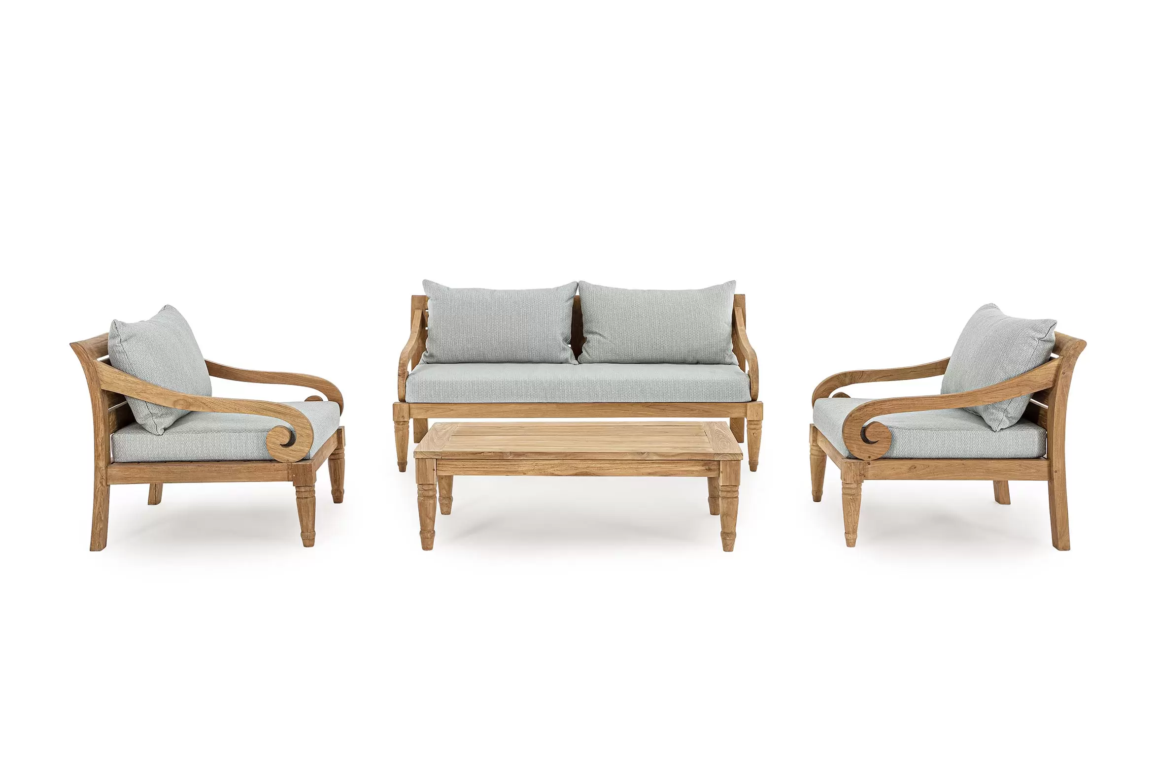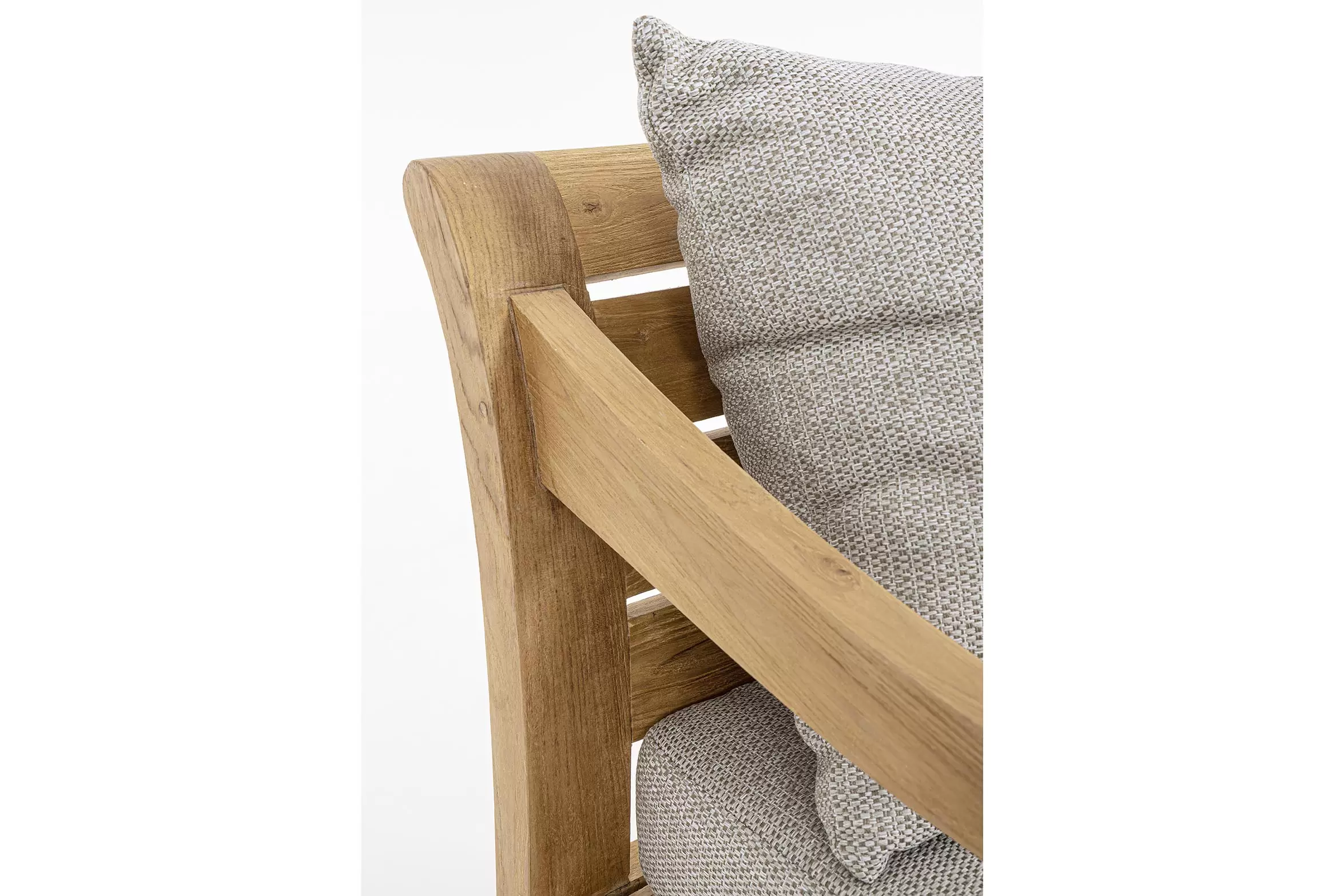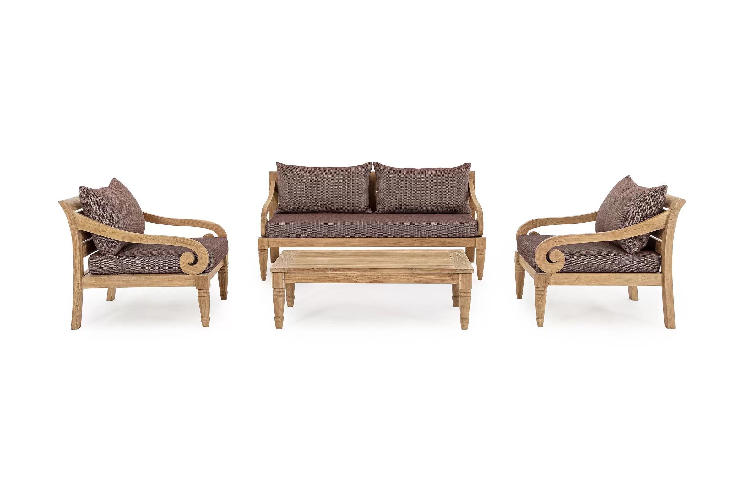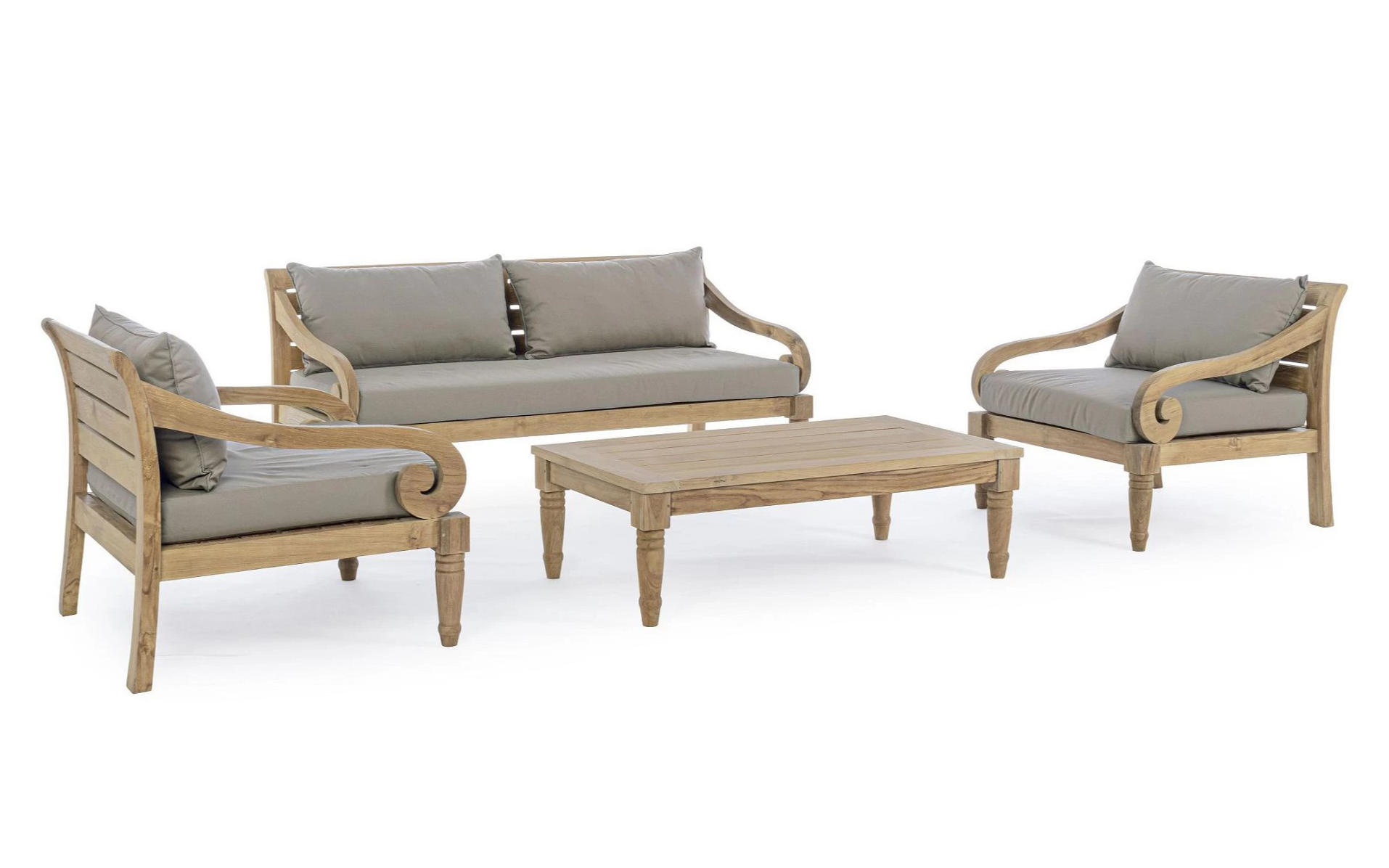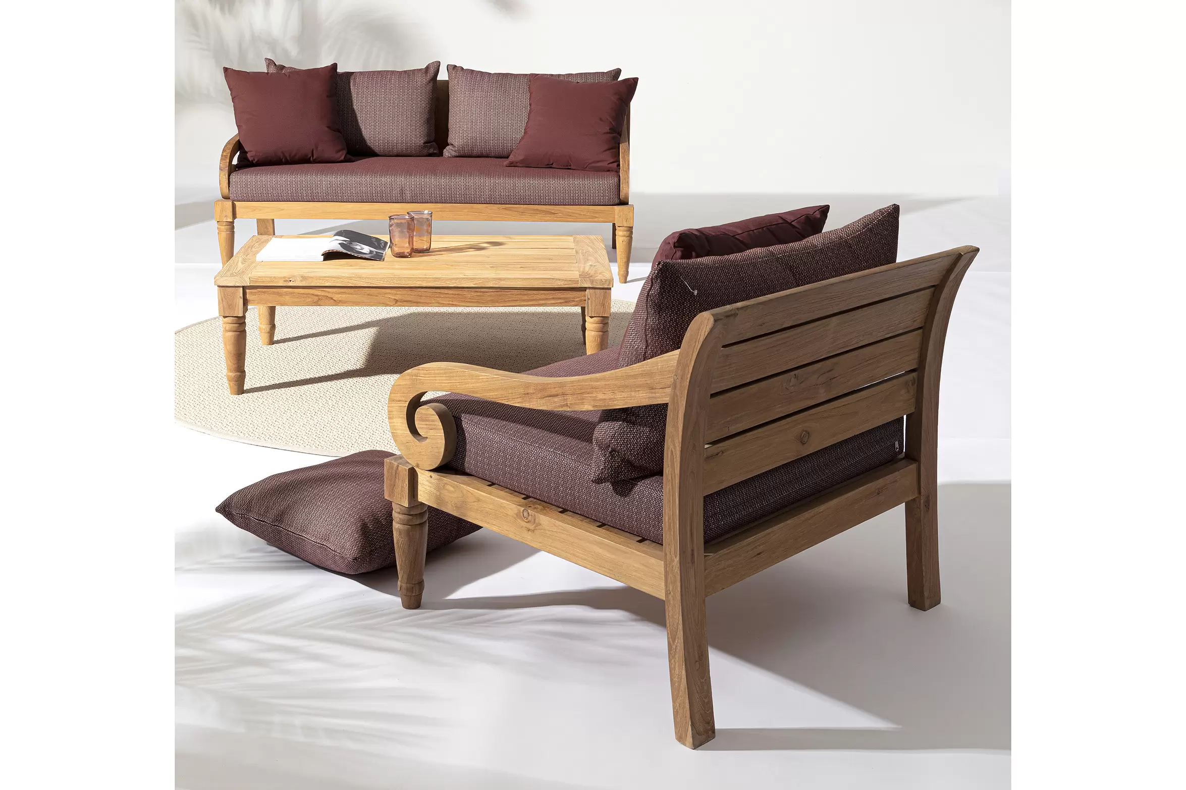 Zestaw wypoczynkowy teakowy na taras w stylu indyjskim. Beżowe poduszki wodoodporne.