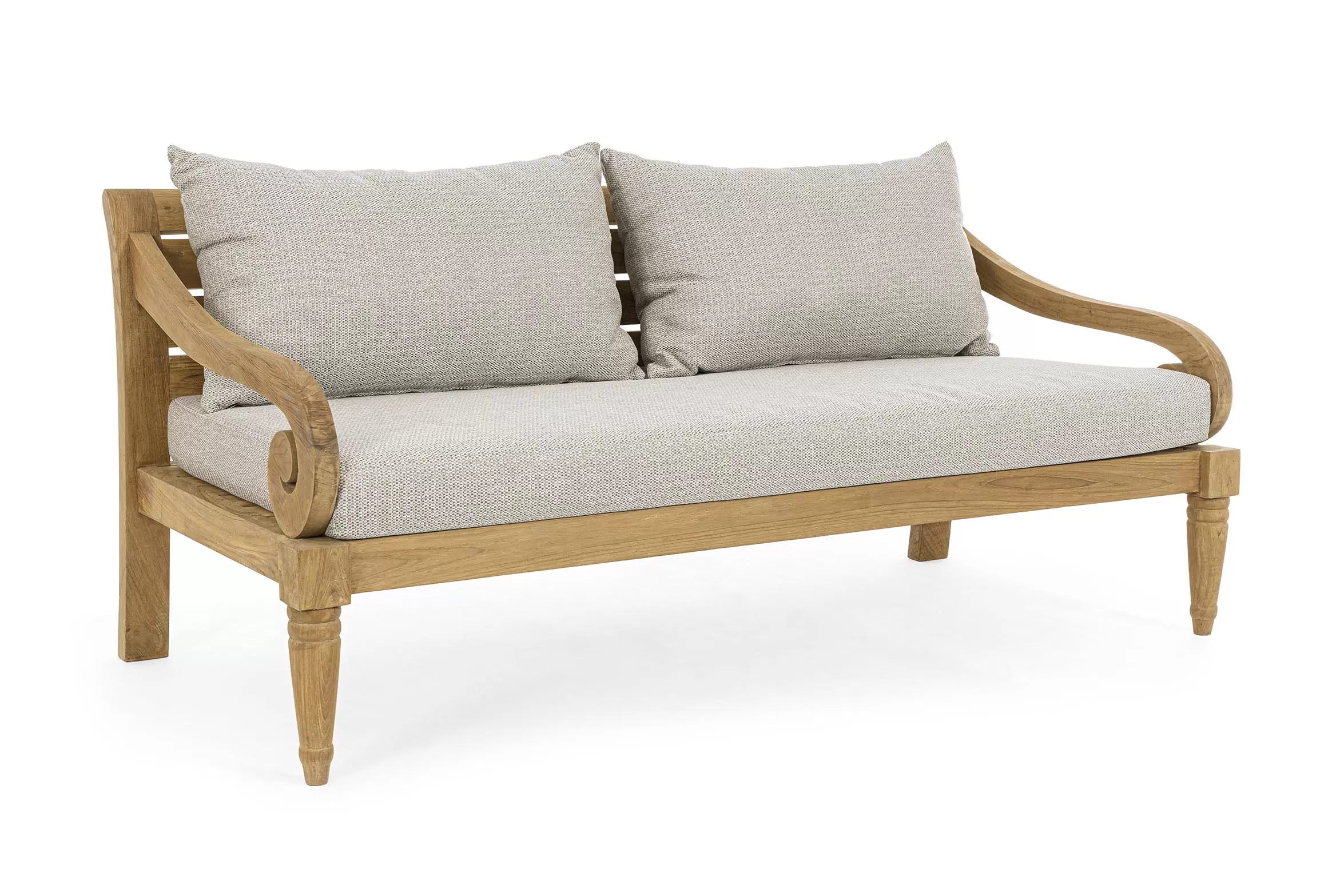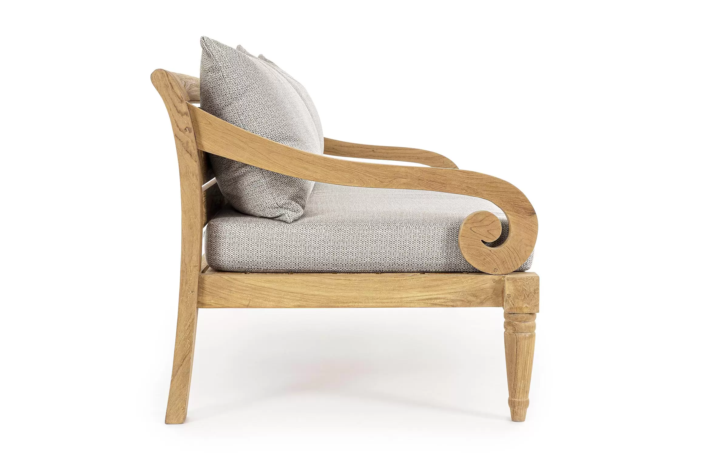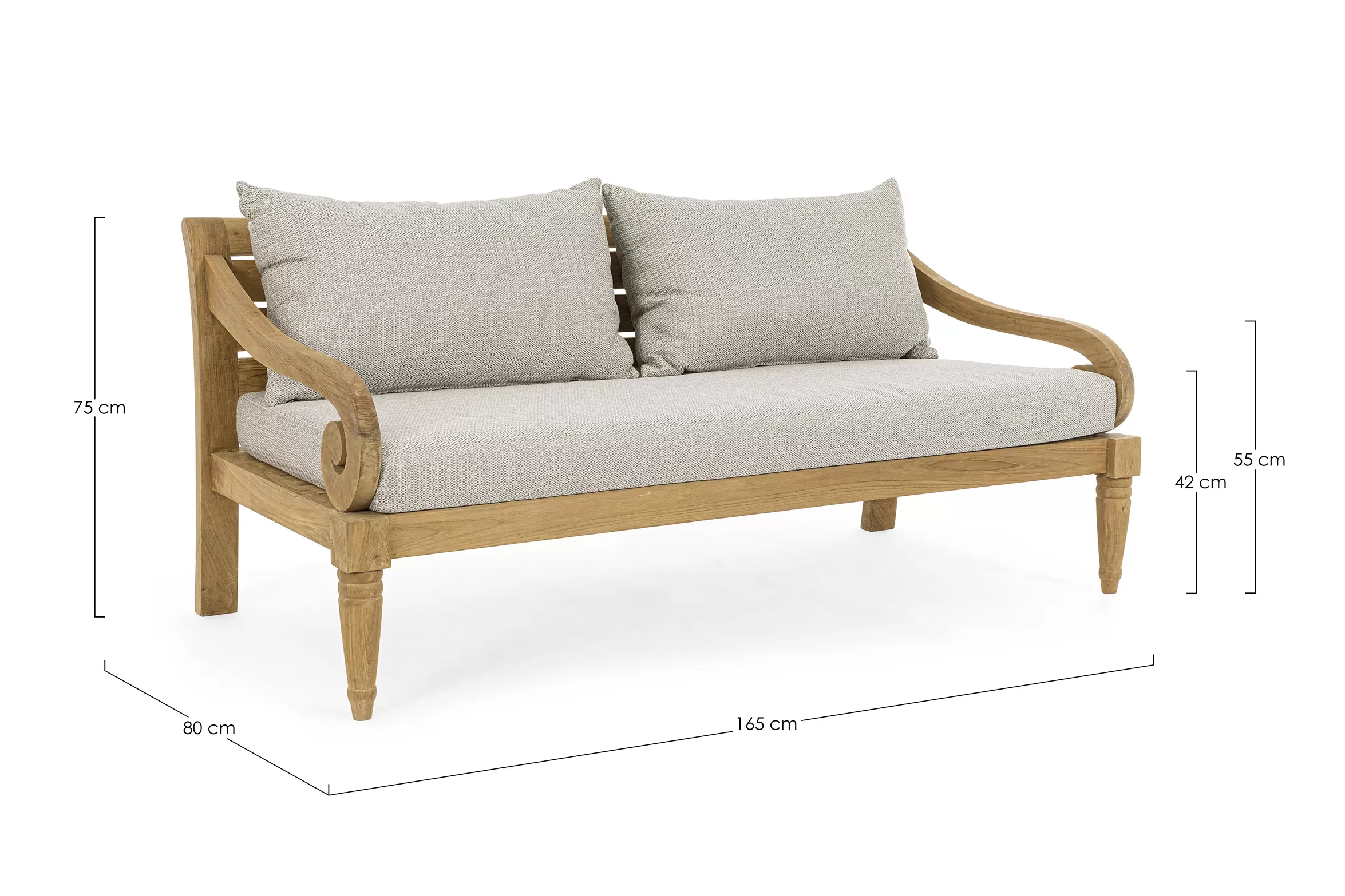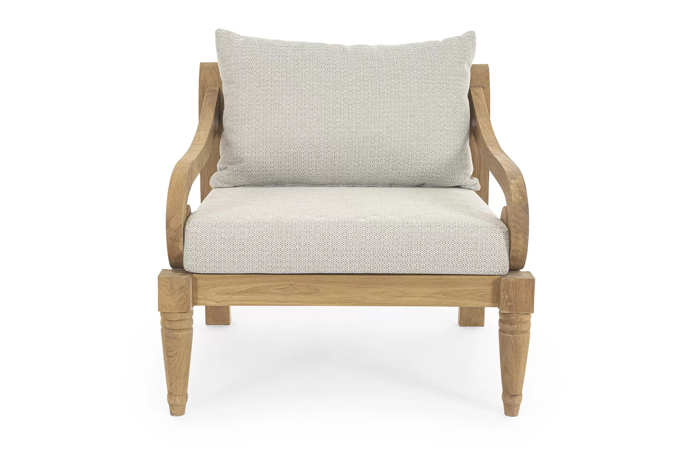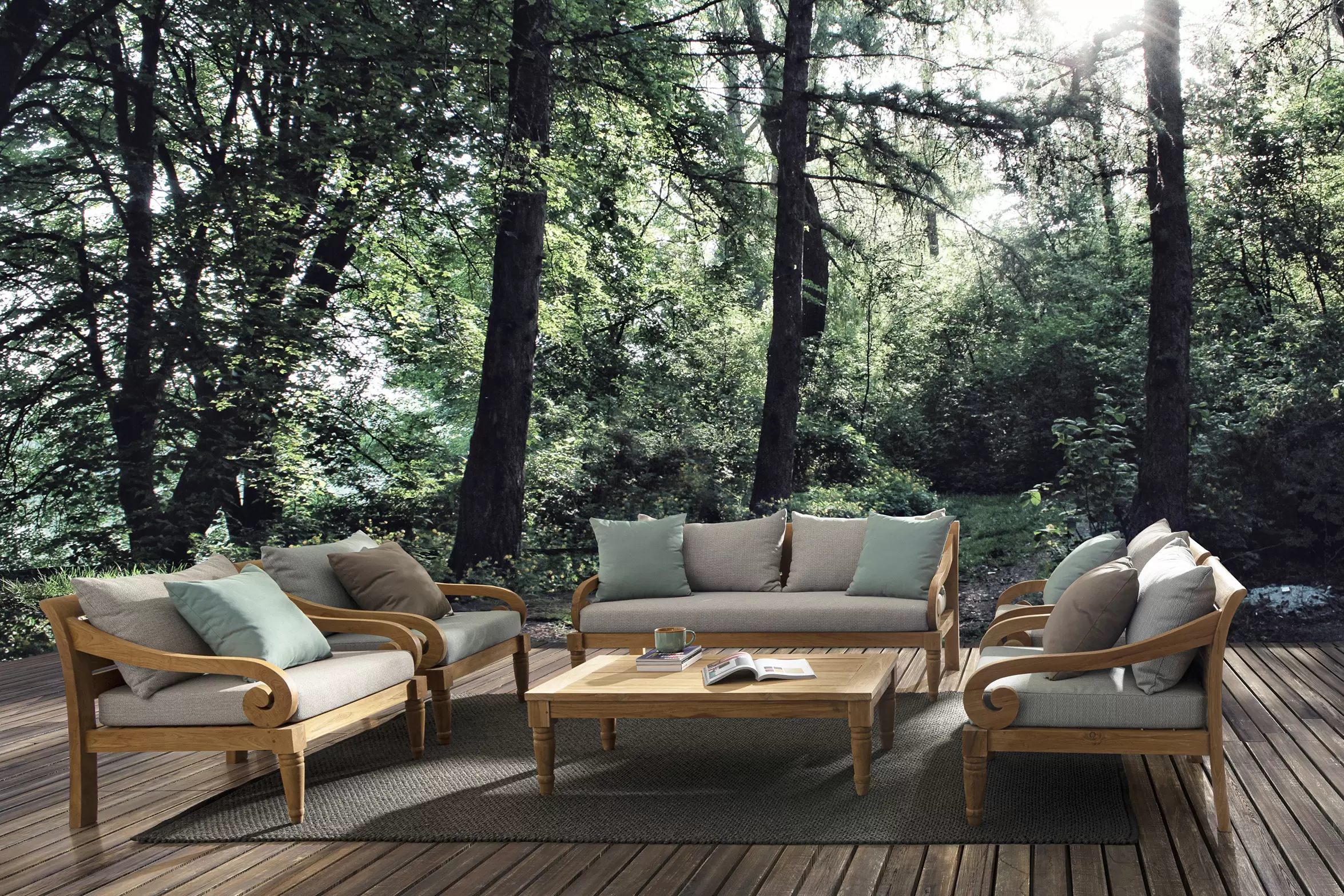 Zestaw wypoczynkowy teakowy na taras w stylu indyjskim. Beżowe poduszki wodoodporne.