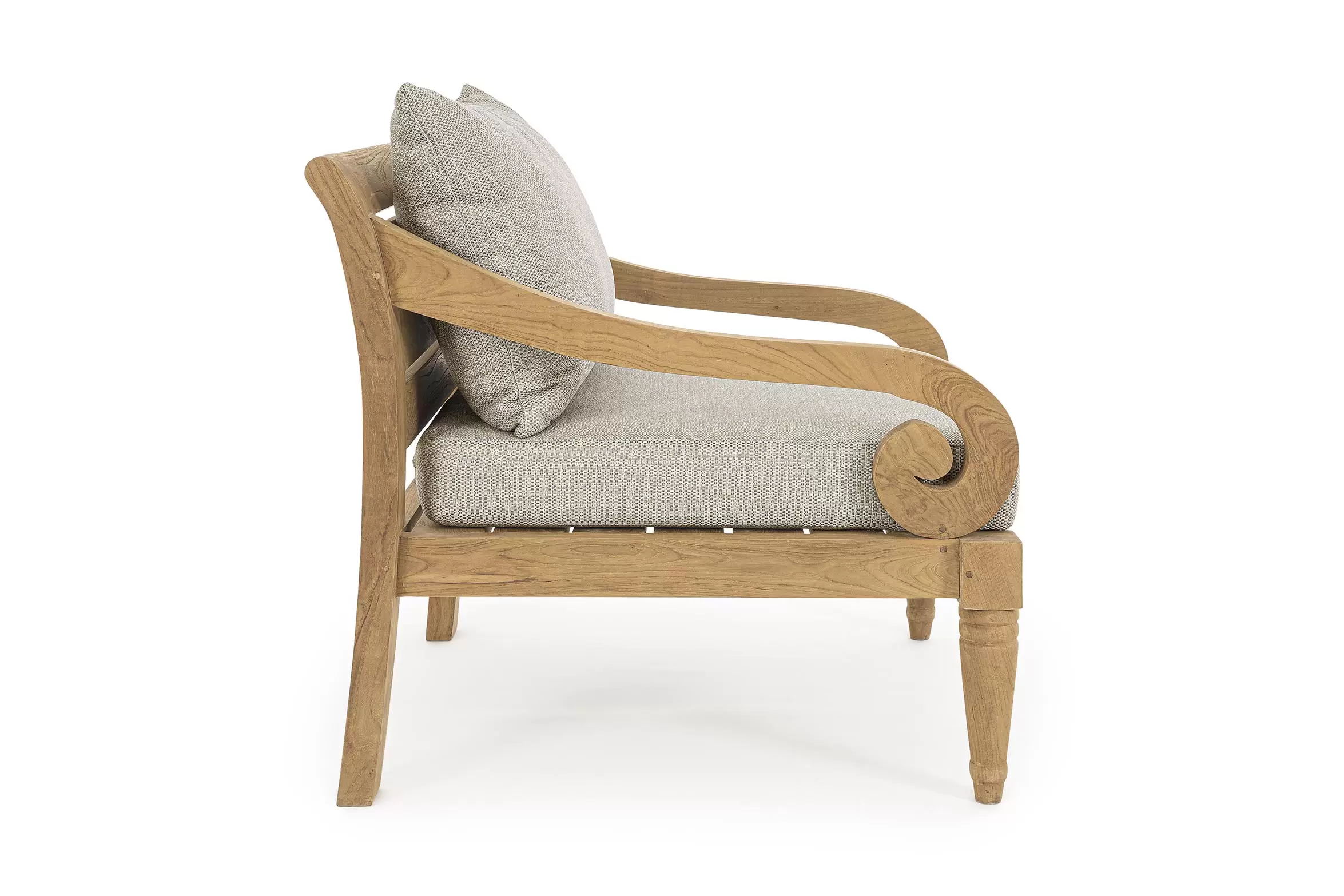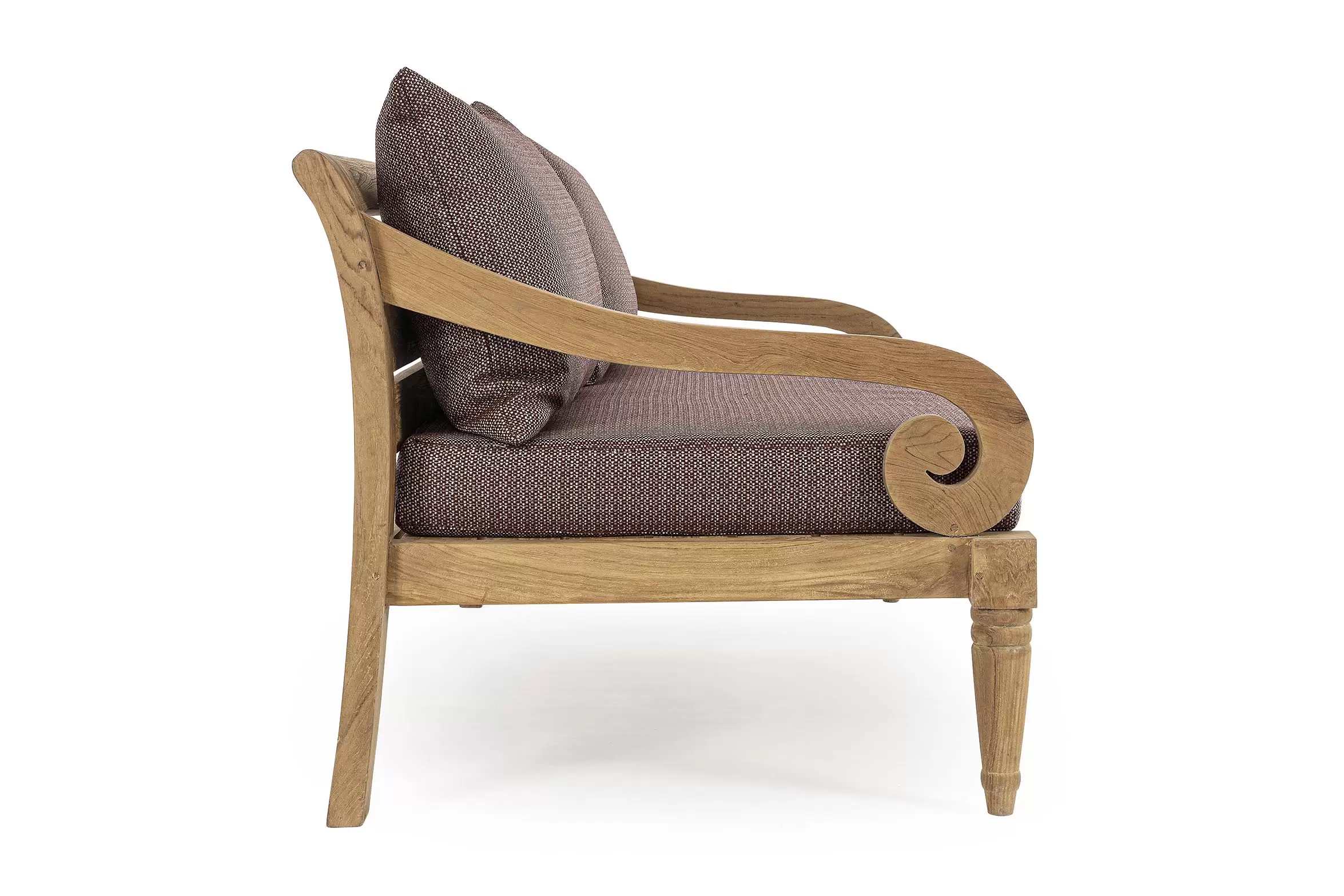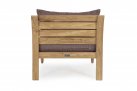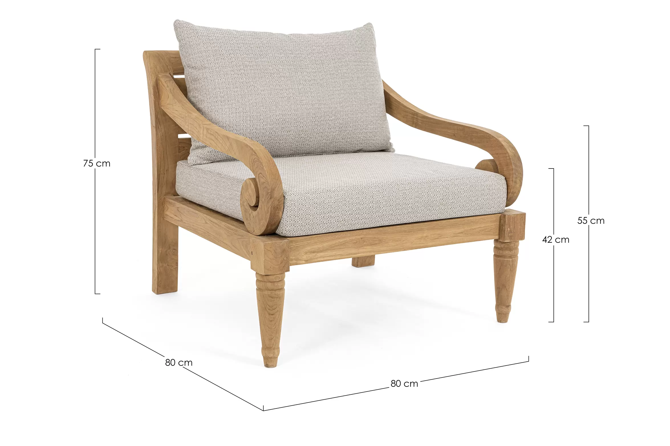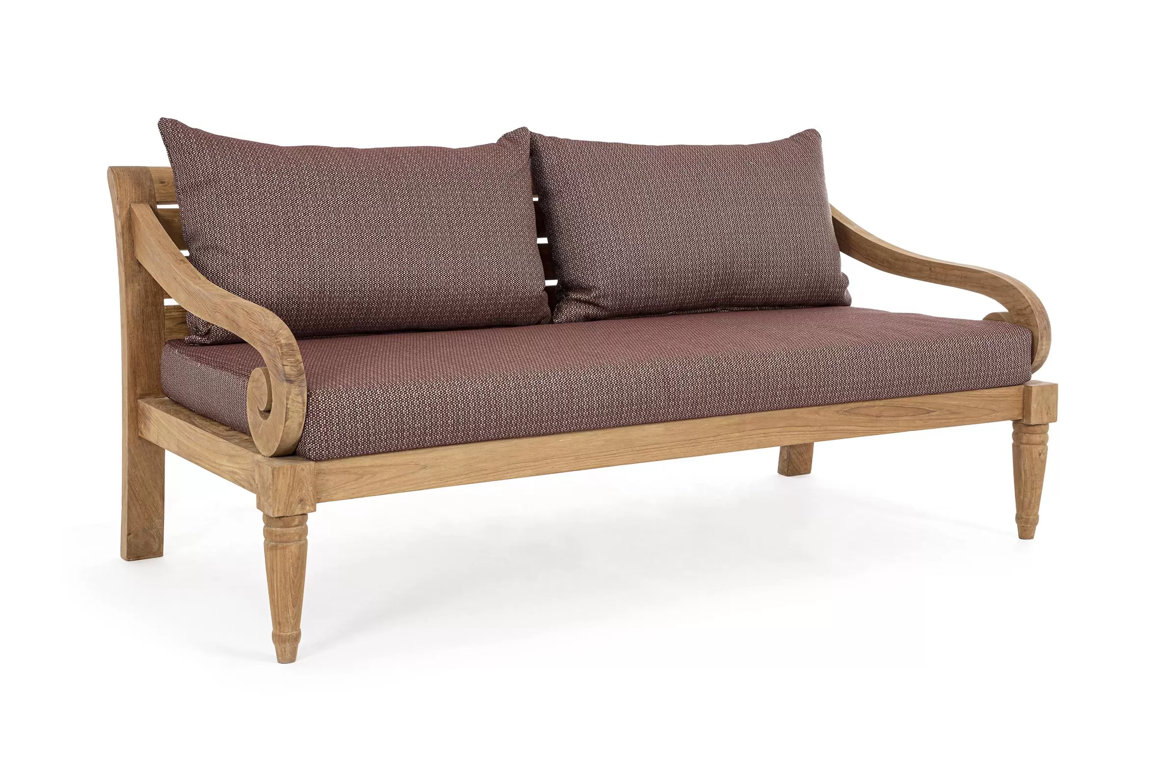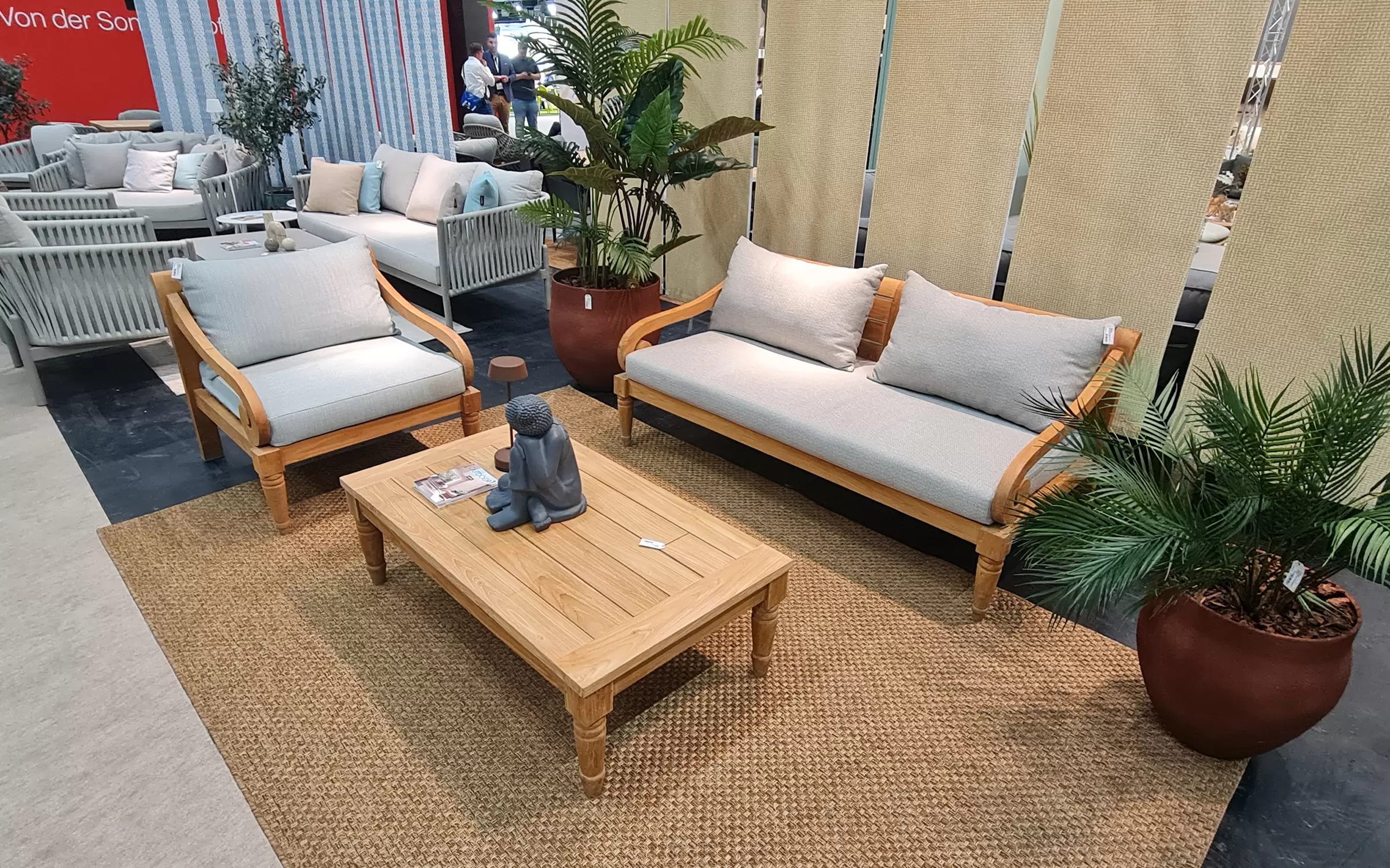 Zestaw wypoczynkowy teakowy na taras w stylu indyjskim. Beżowe poduszki wodoodporne.