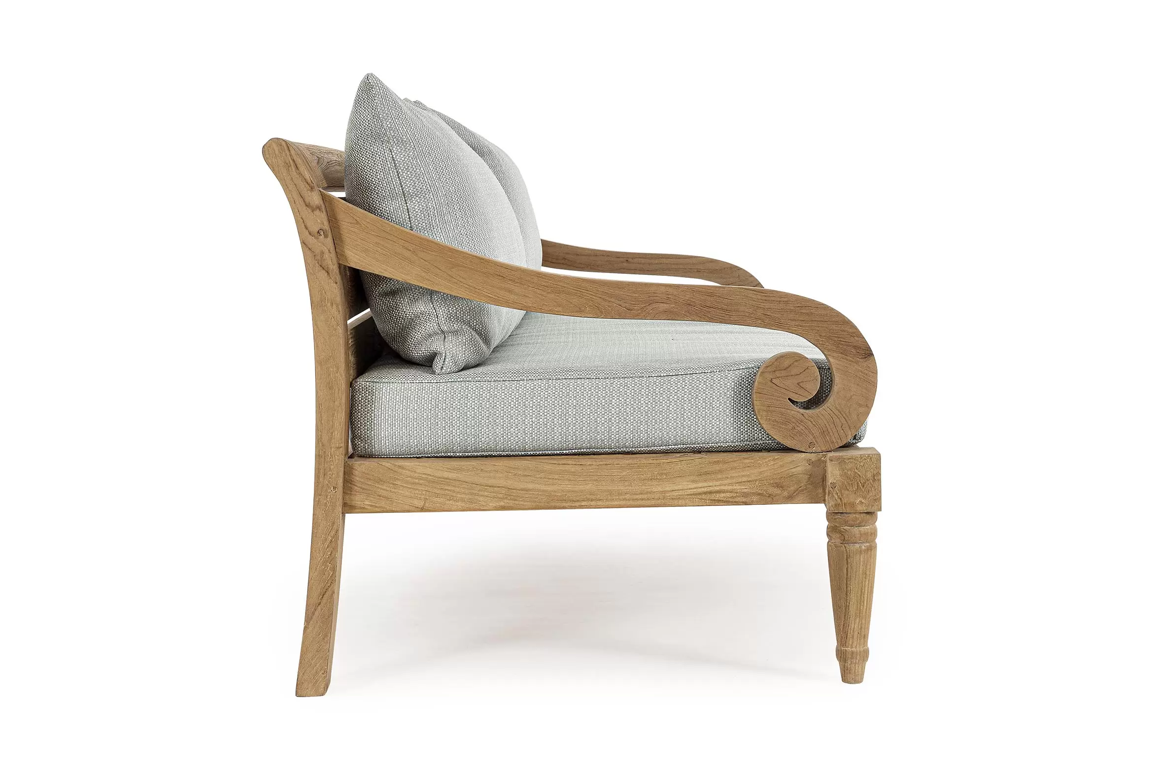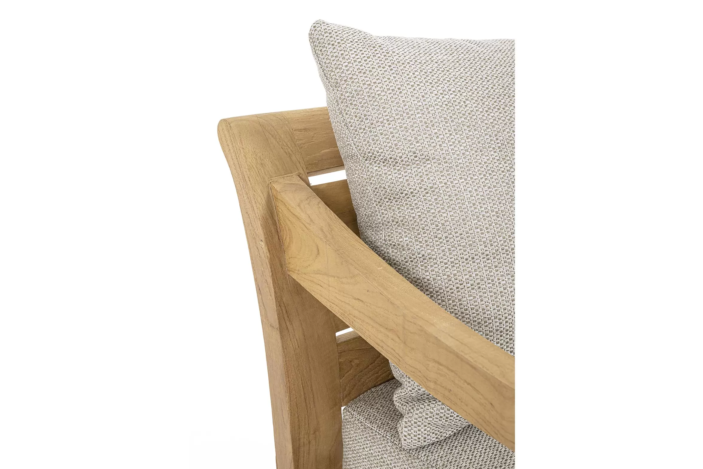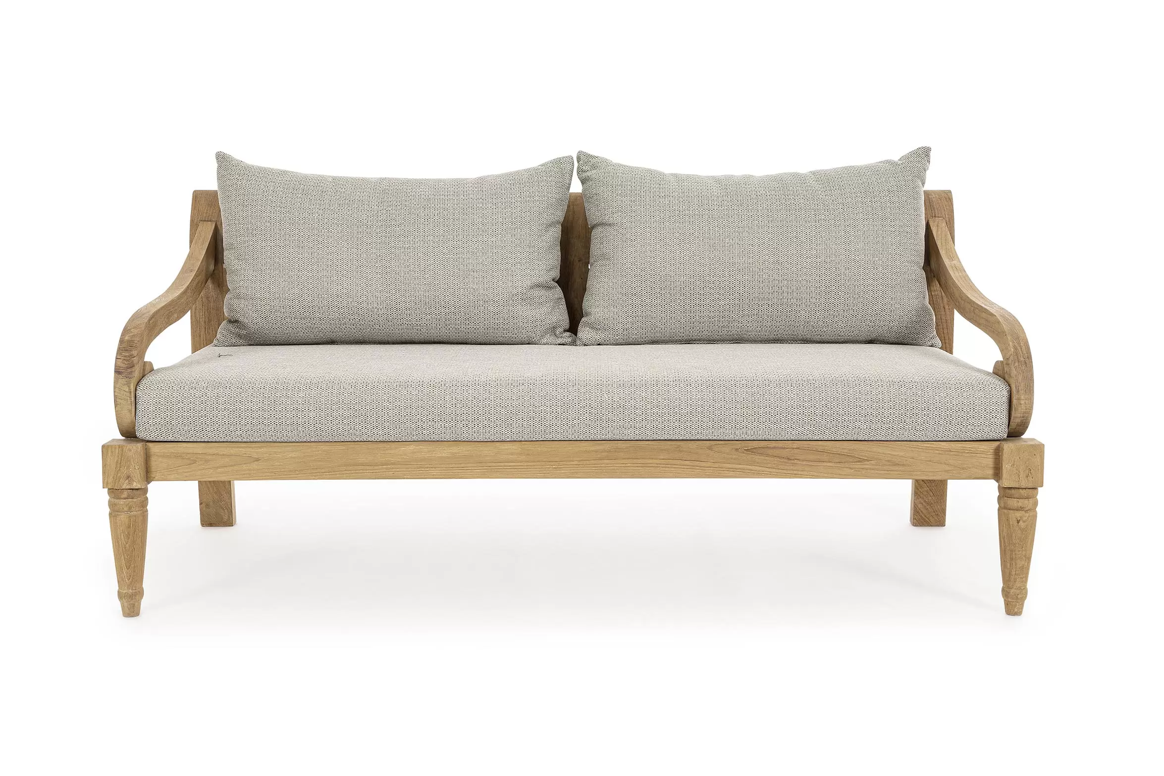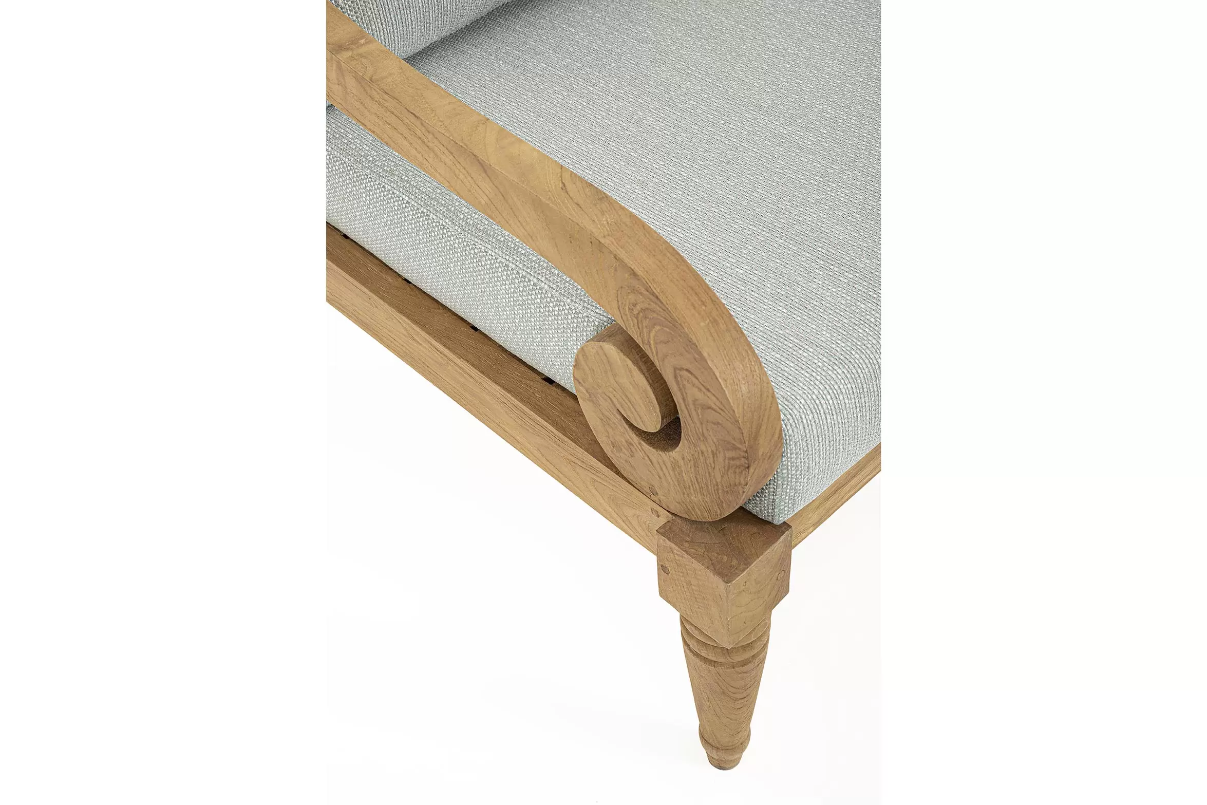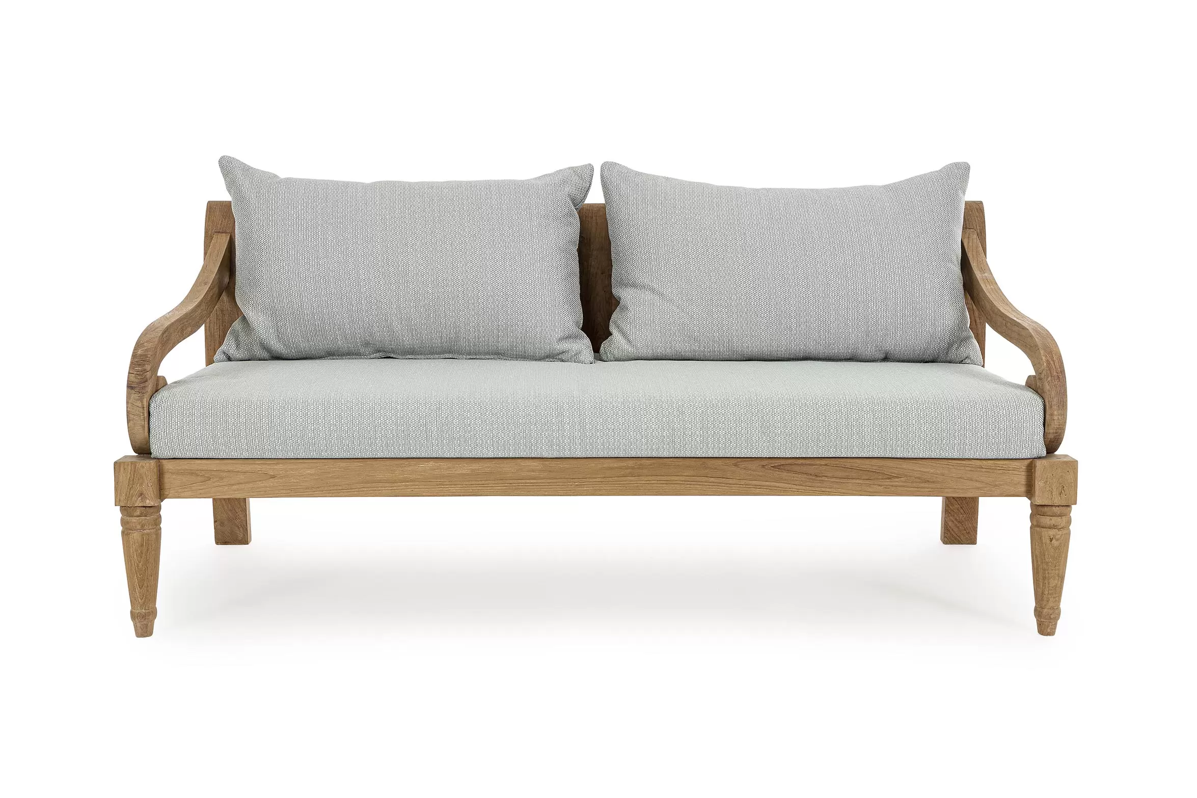 Zestaw wypoczynkowy teakowy na taras w stylu indyjskim. Beżowe poduszki wodoodporne.
