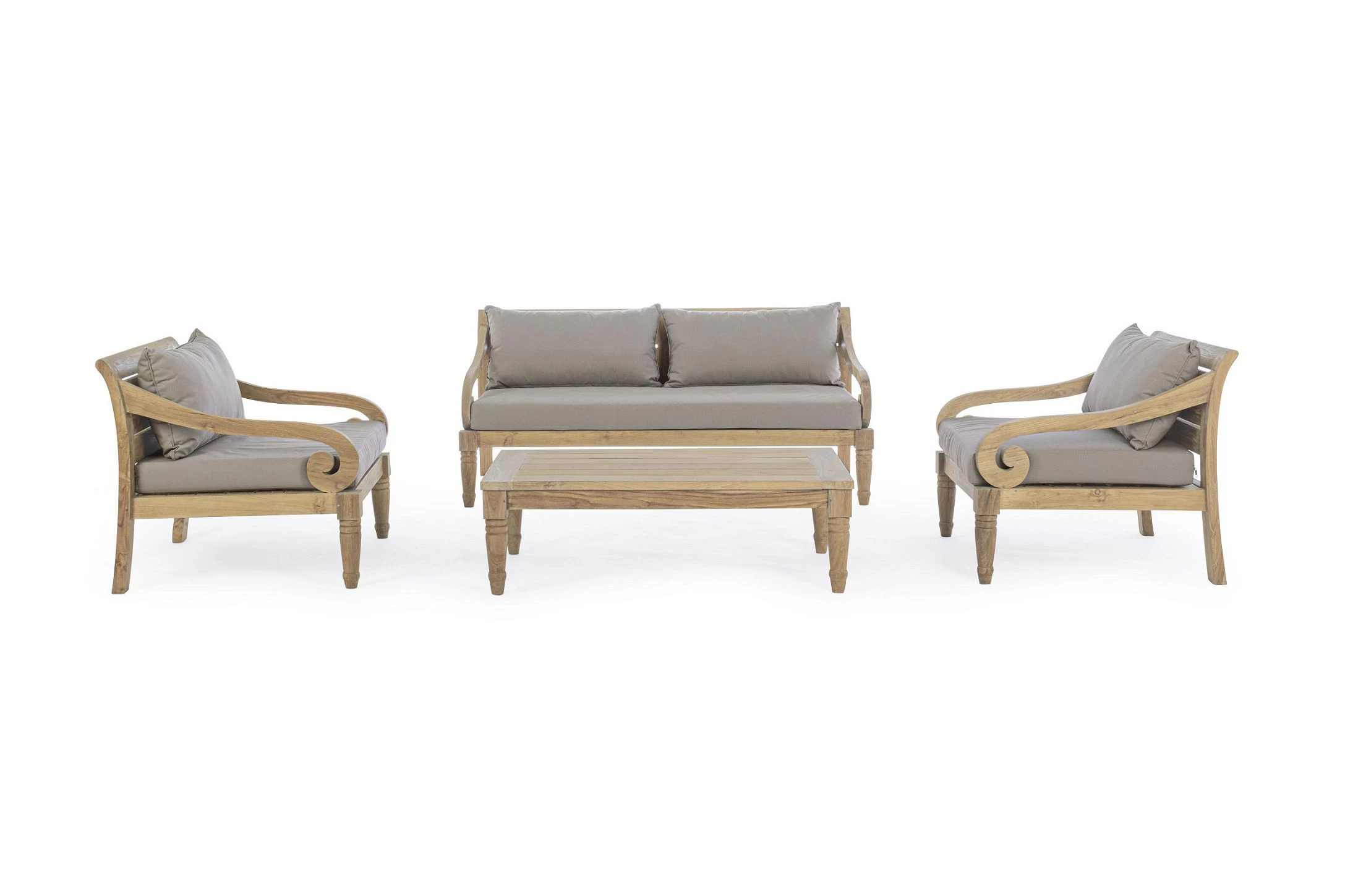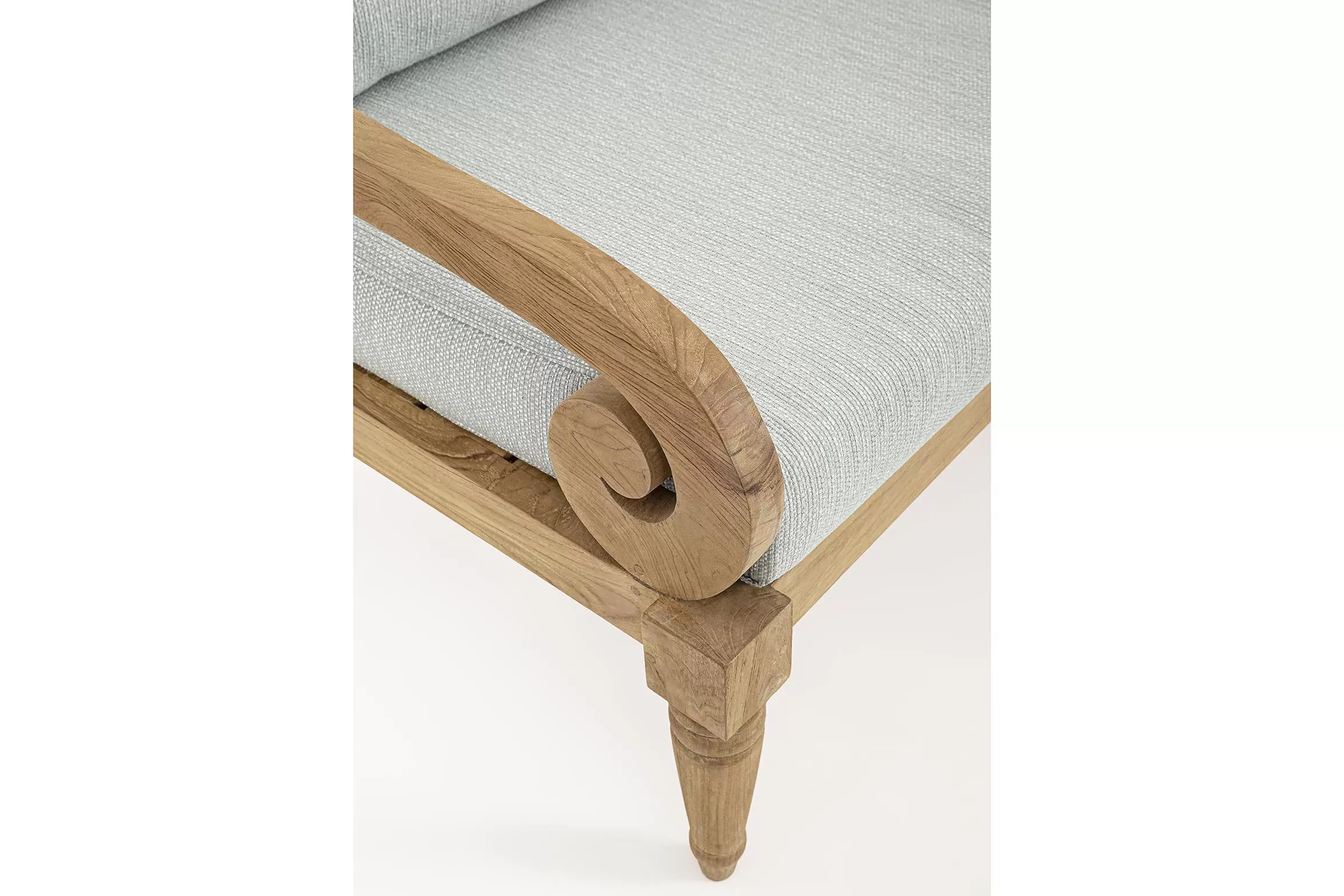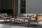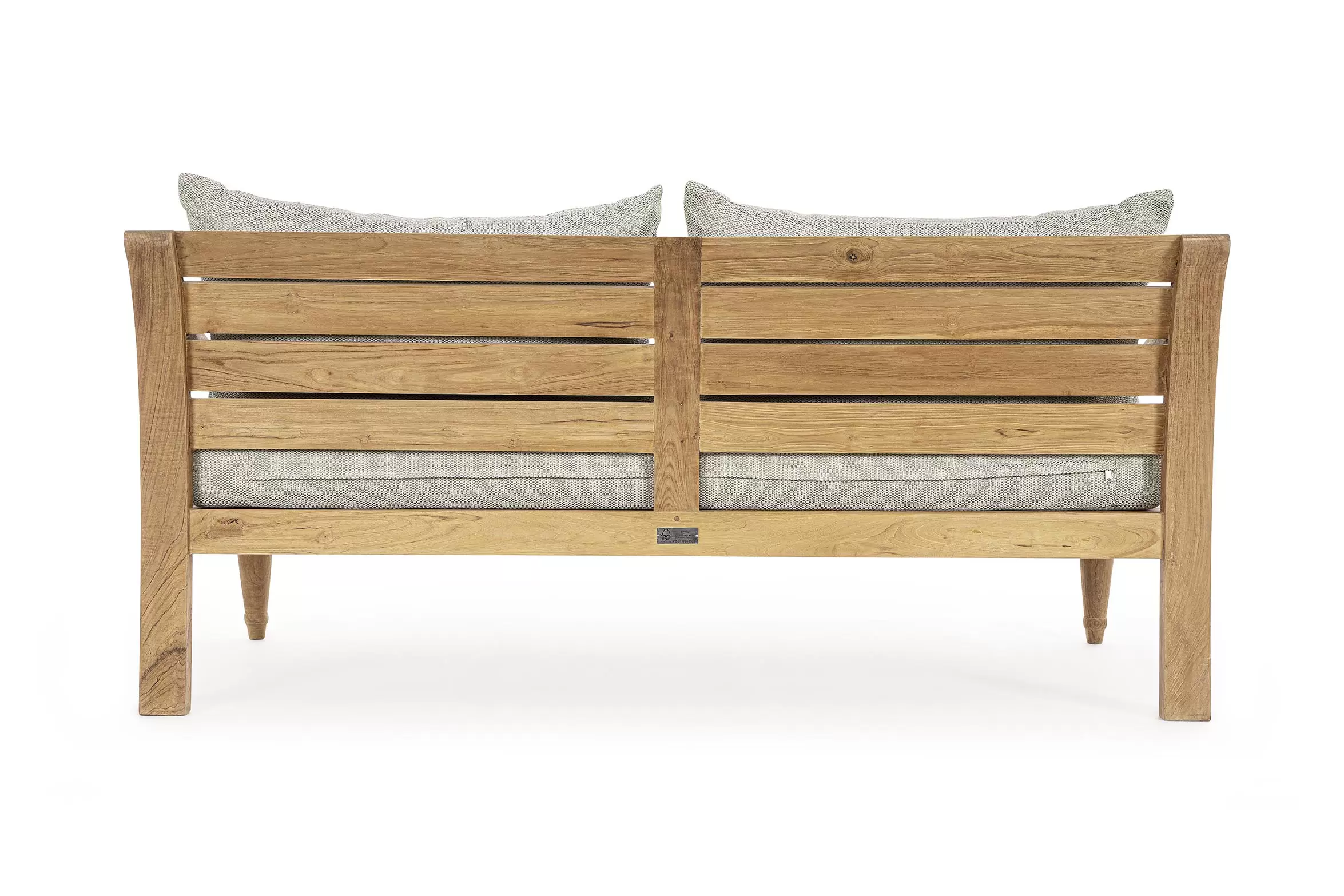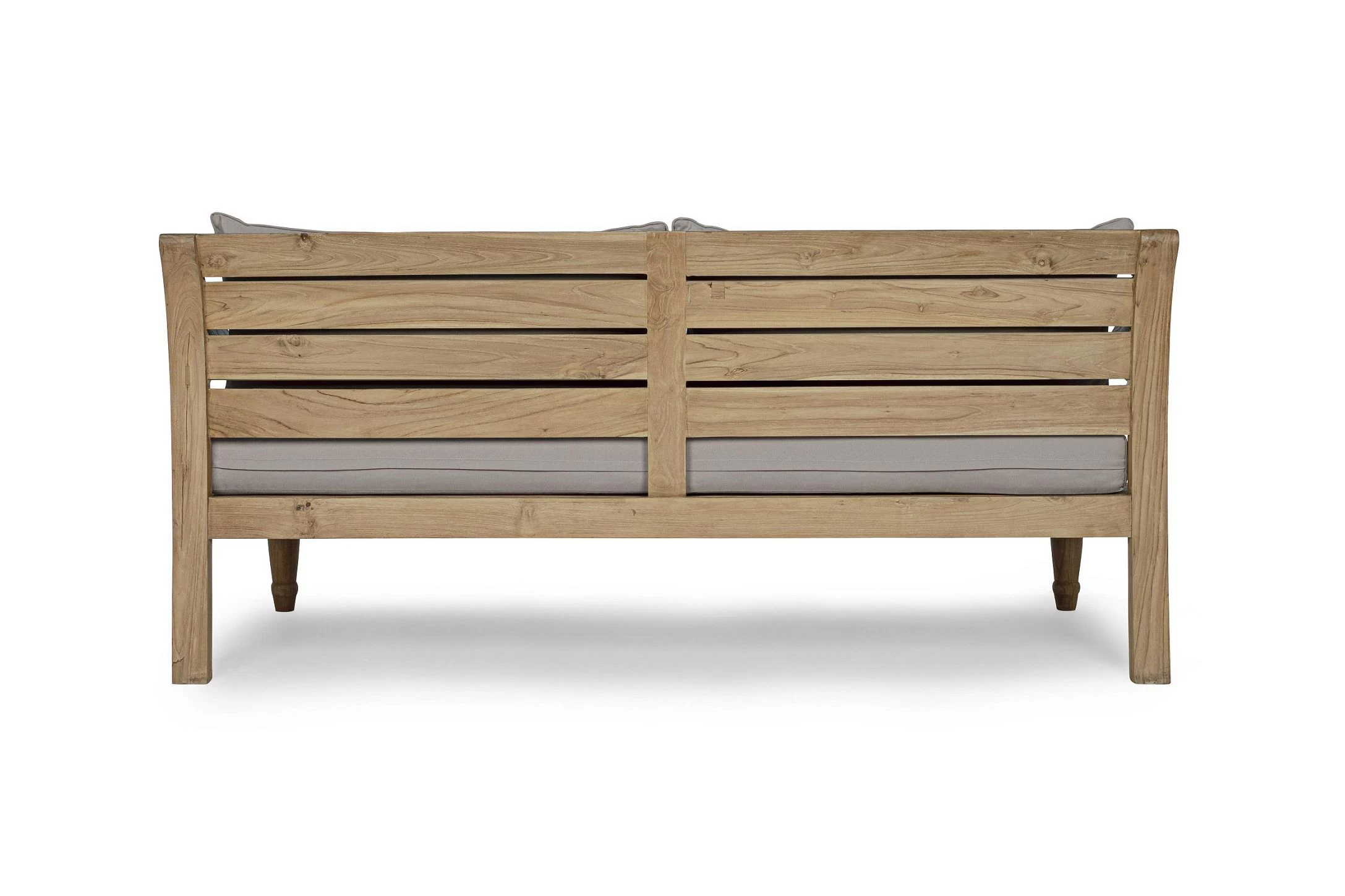 Zestaw wypoczynkowy teakowy na taras w stylu indyjskim. Beżowe poduszki wodoodporne.