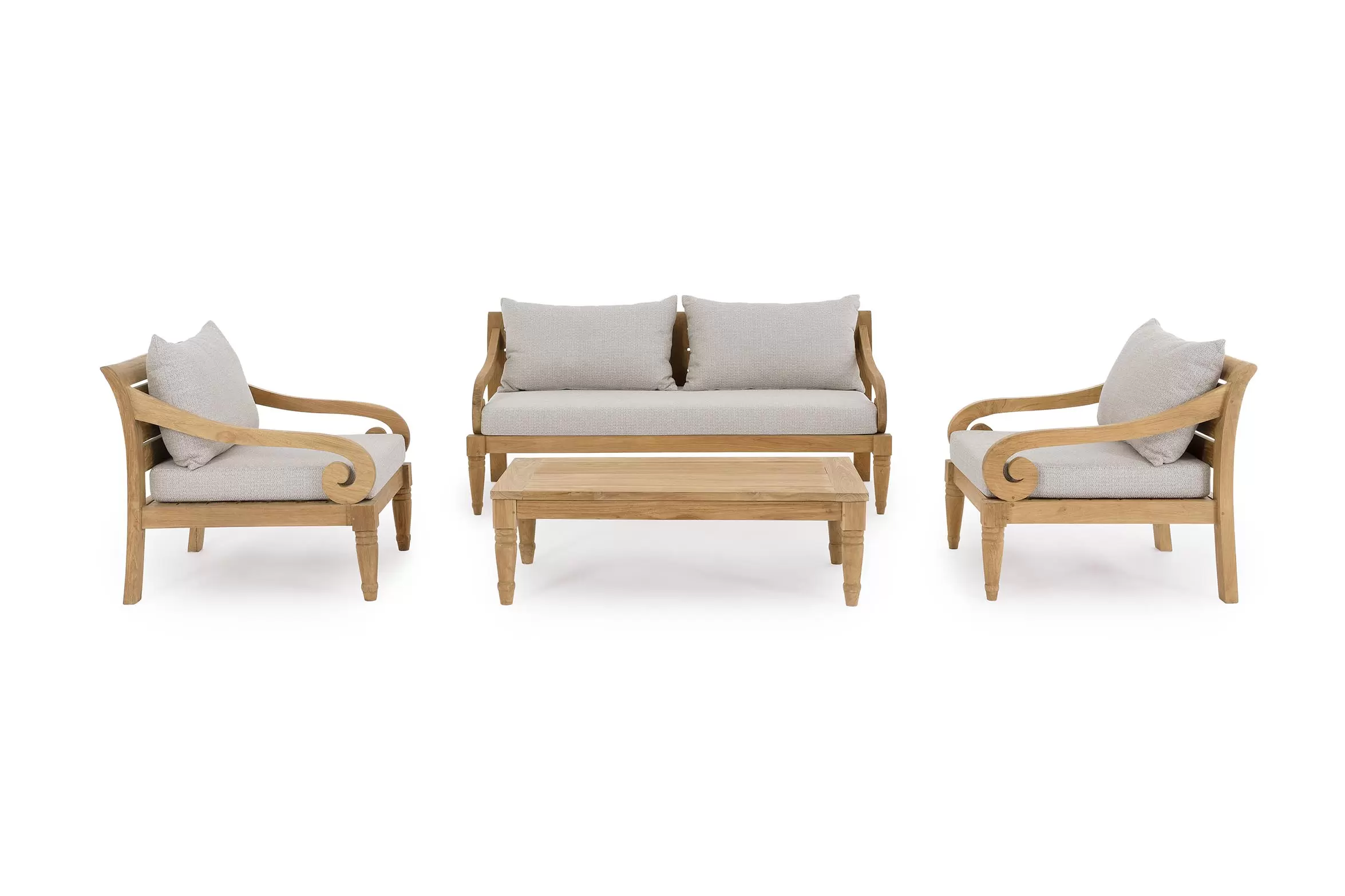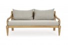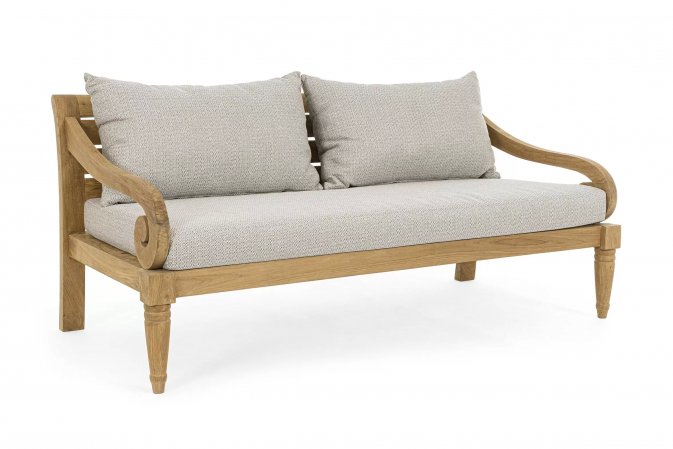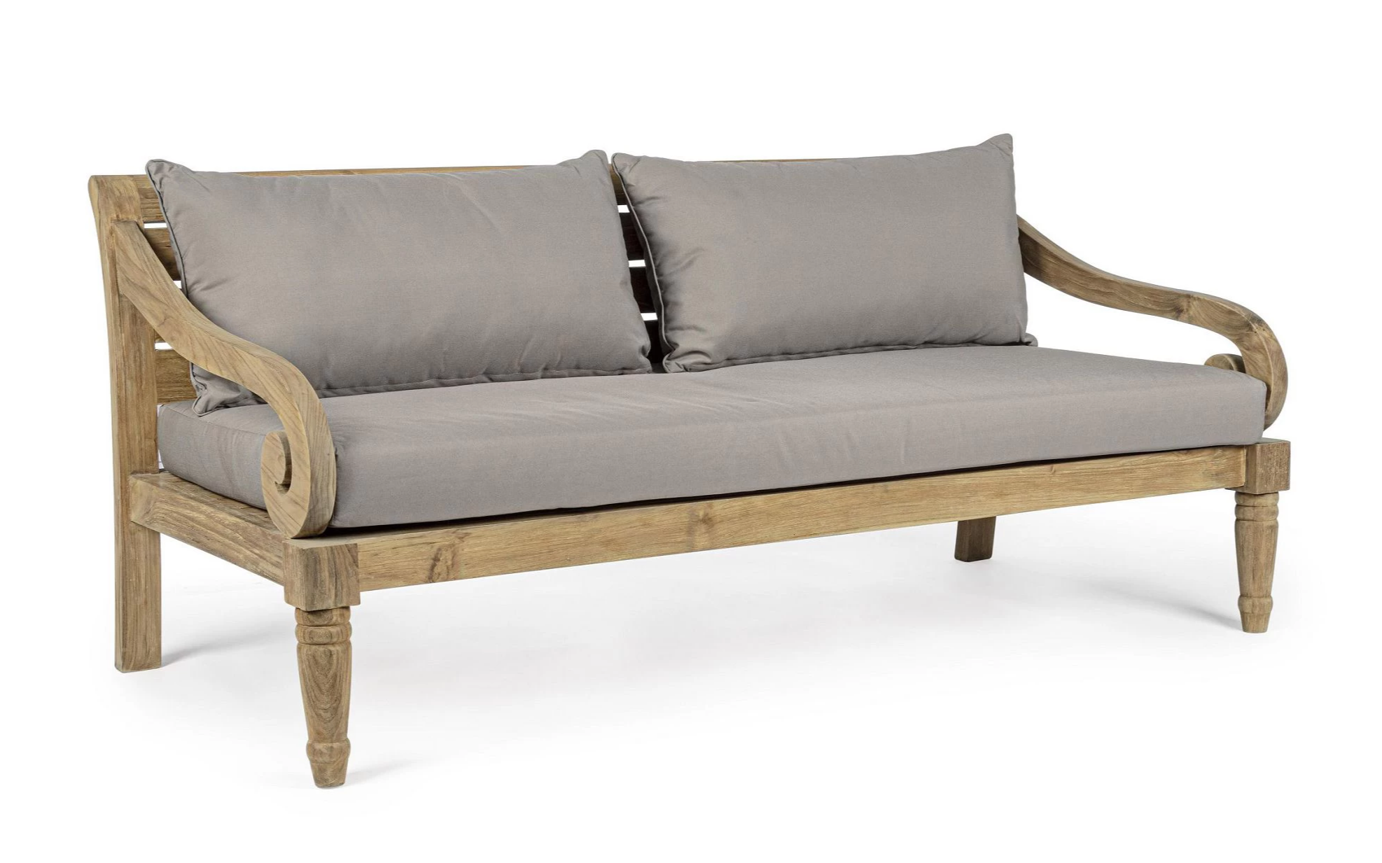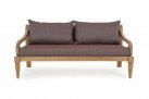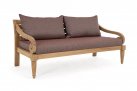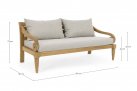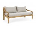 Sofa wypoczynkowa teakowa na taras w stylu indyjskim. Beżowe poduszki wodoodporne.