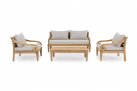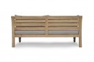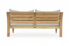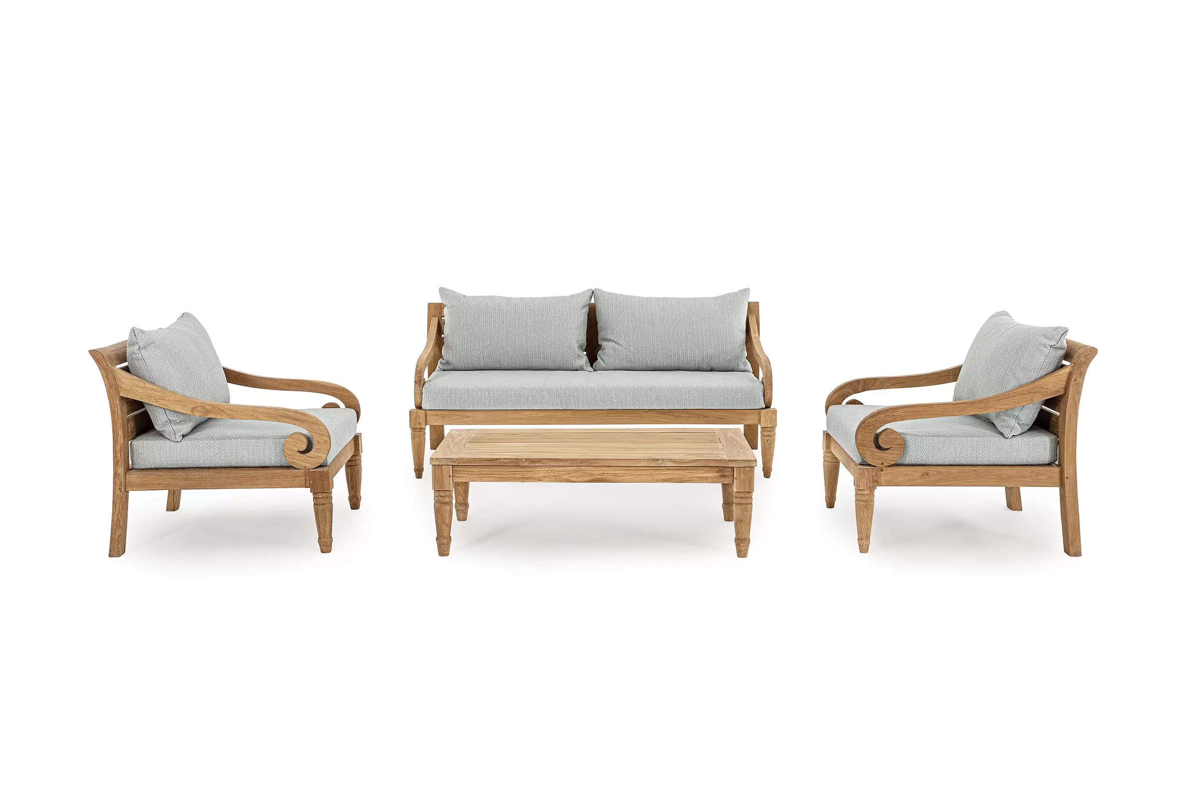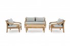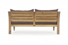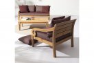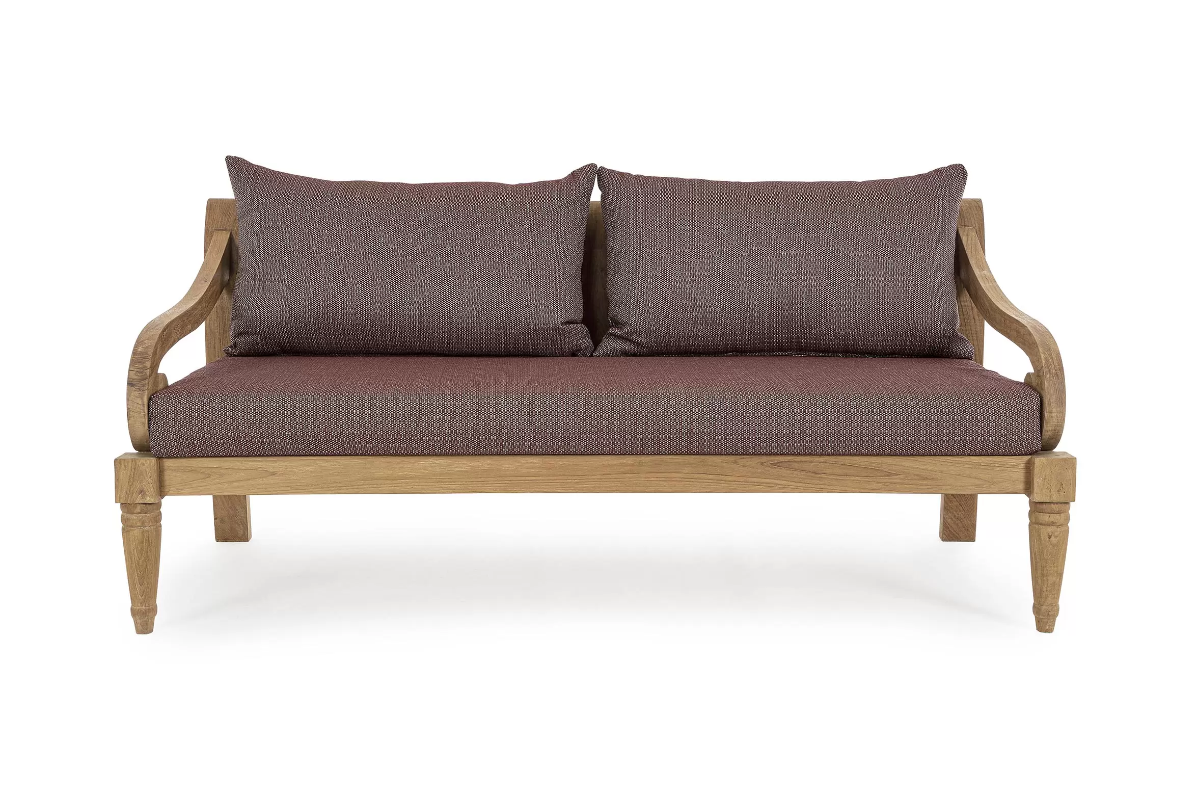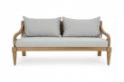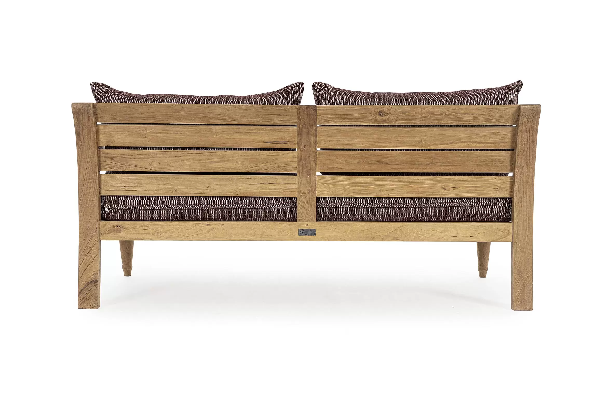 Sofa wypoczynkowa teakowa na taras w stylu indyjskim. Beżowe poduszki wodoodporne.
