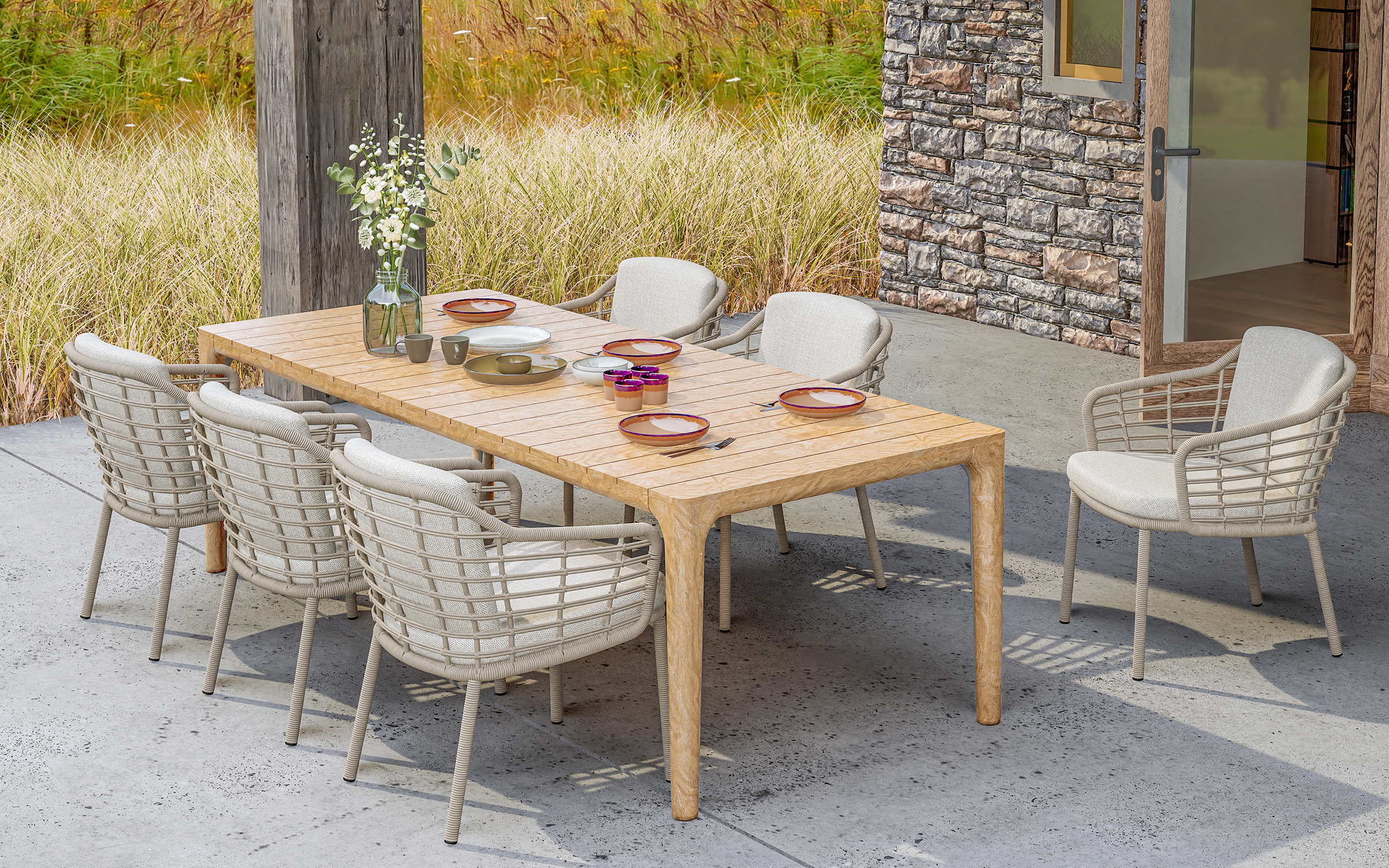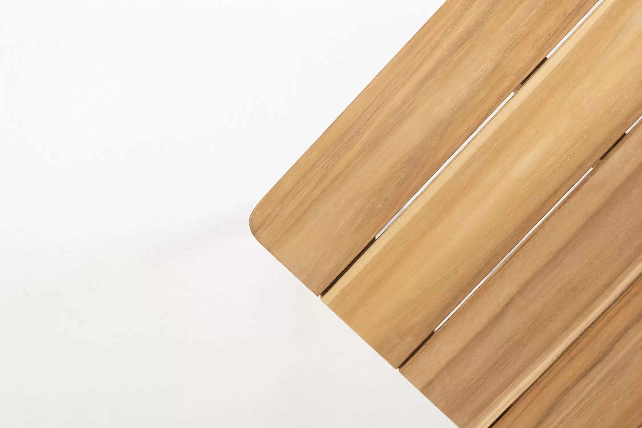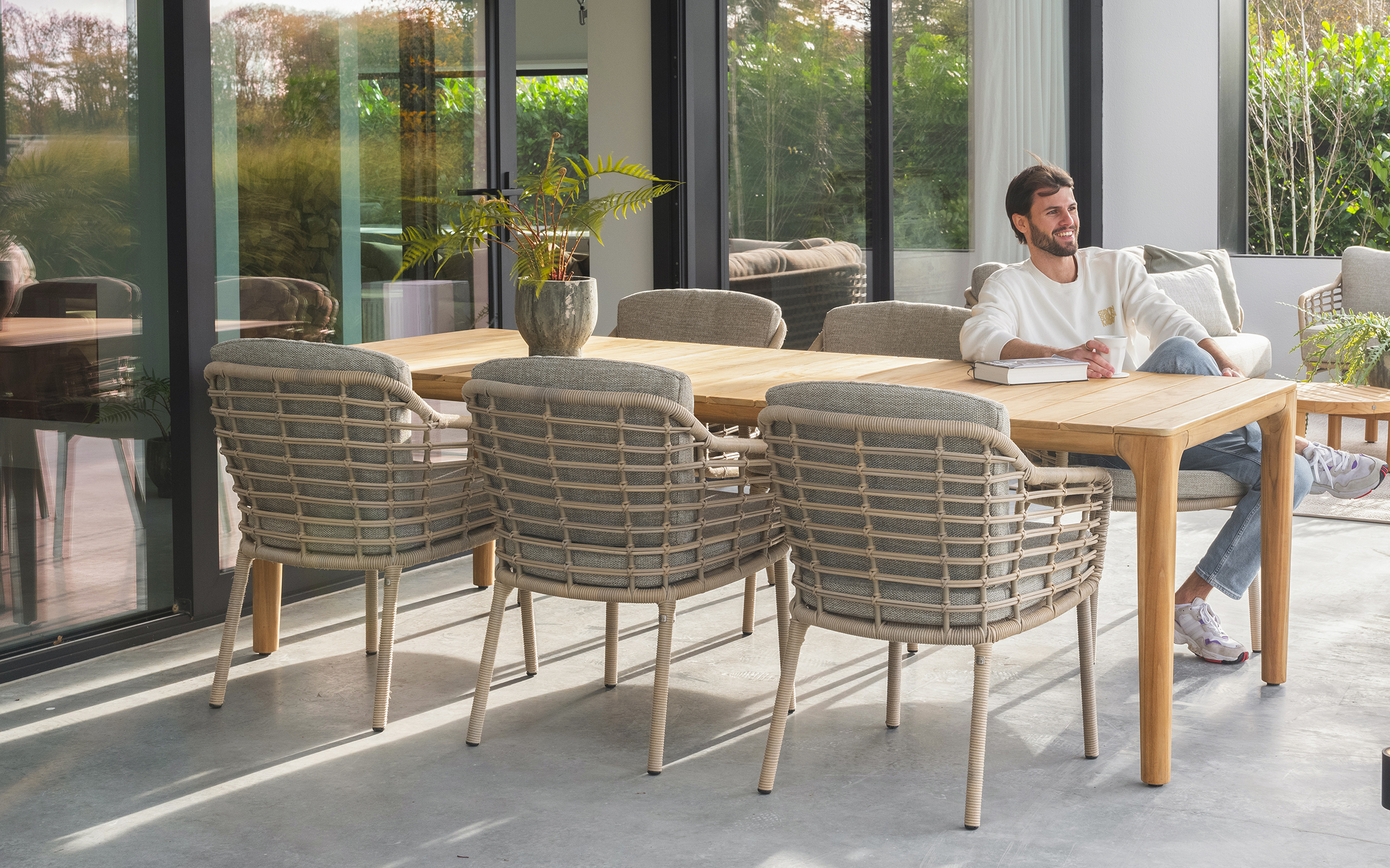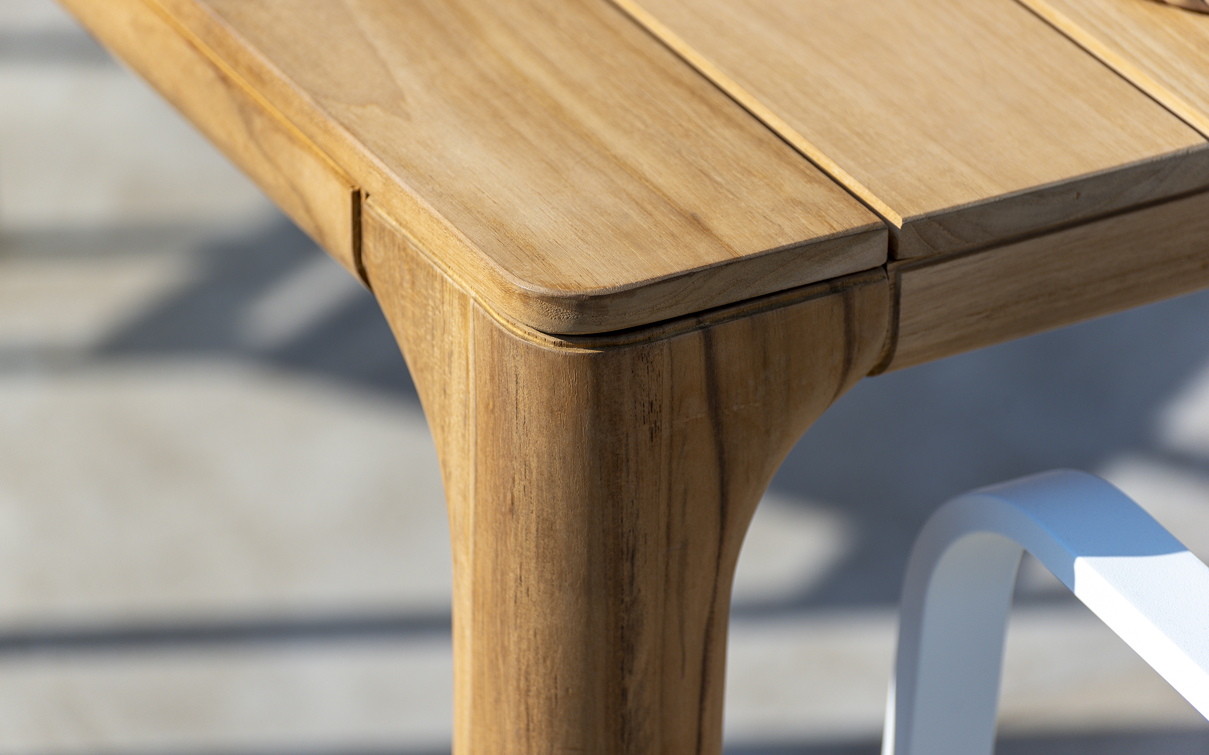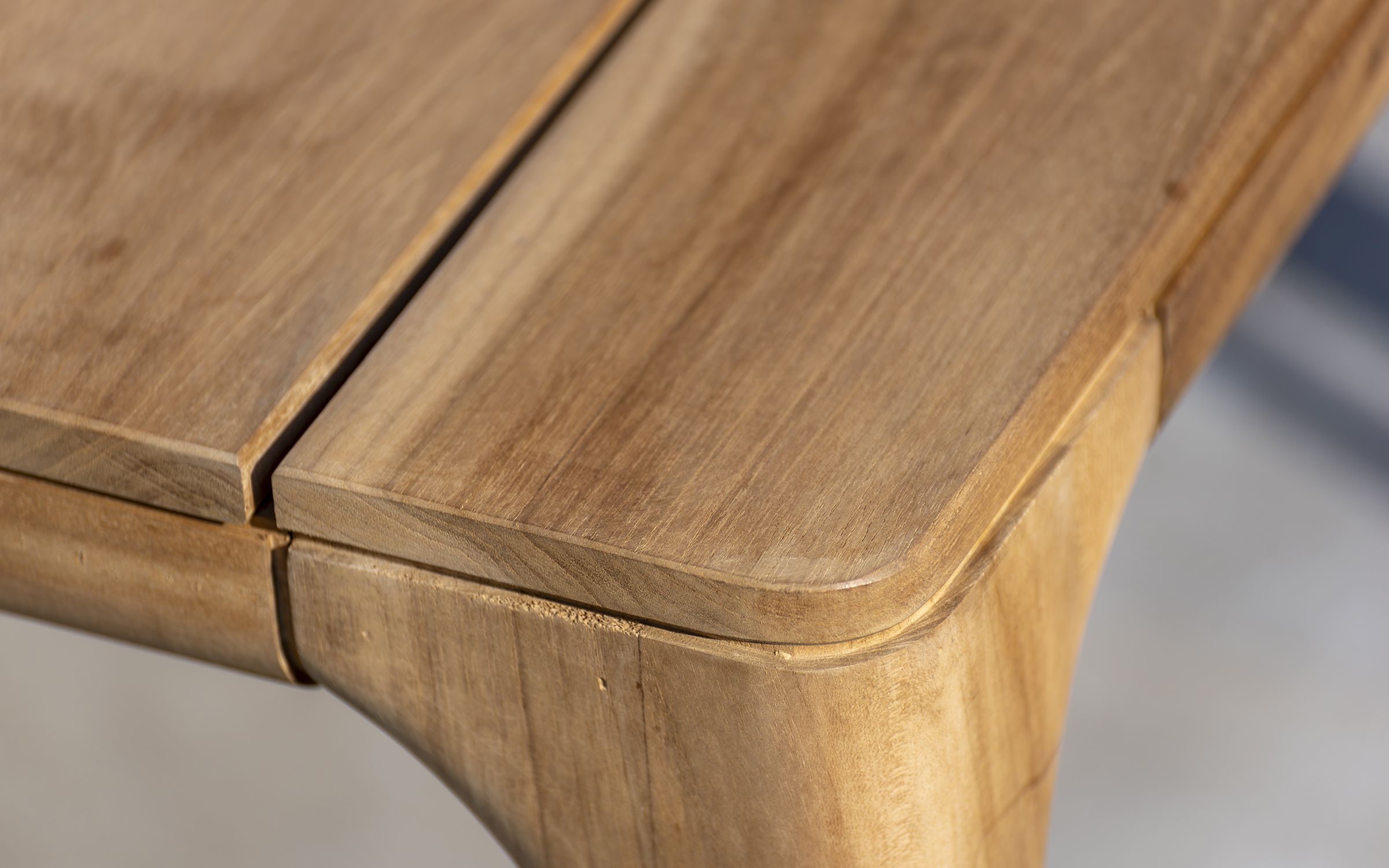 Teak jest materiałem wyjątkowo odpornym na wilgoć, promieniowanie UV oraz zmienne warunki atmosferyczne. Z czasem nabiera szlachetnej, srebrzystej patyny, co podkreśla jego naturalny charakter. Stół LIAM może być użytkowany przez cały rok na zewnątrz.