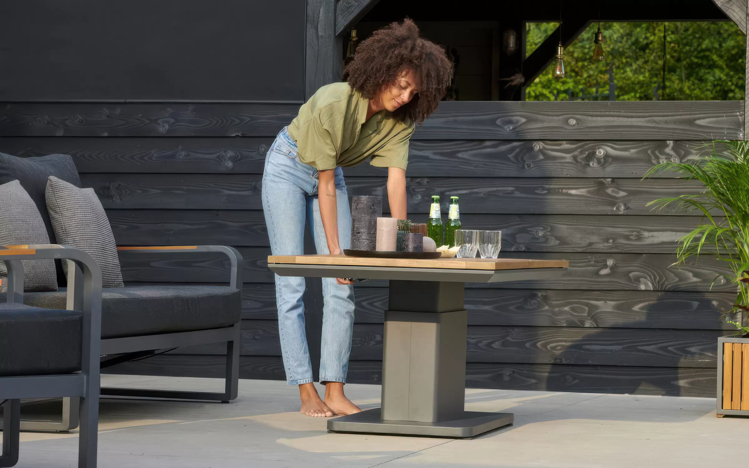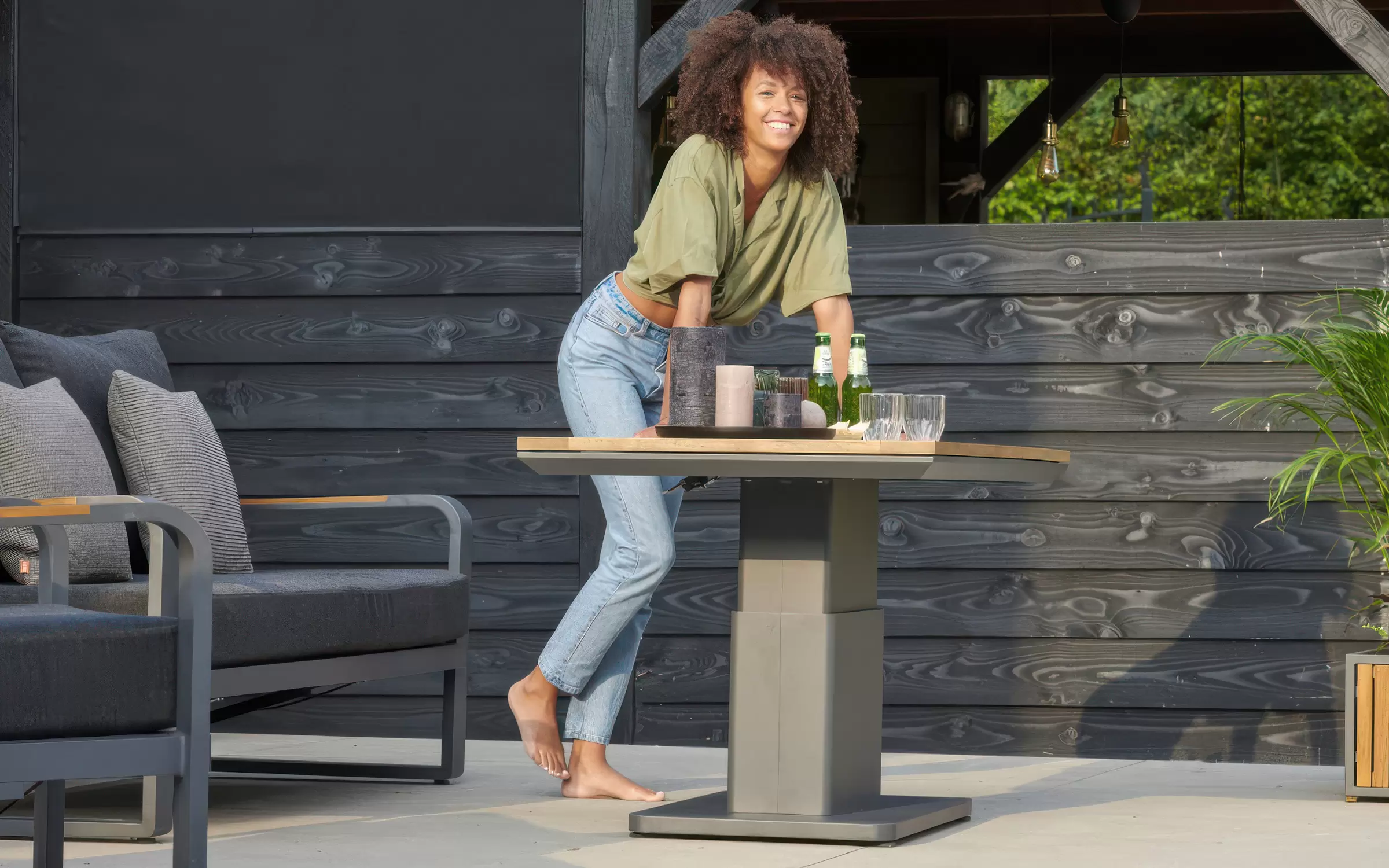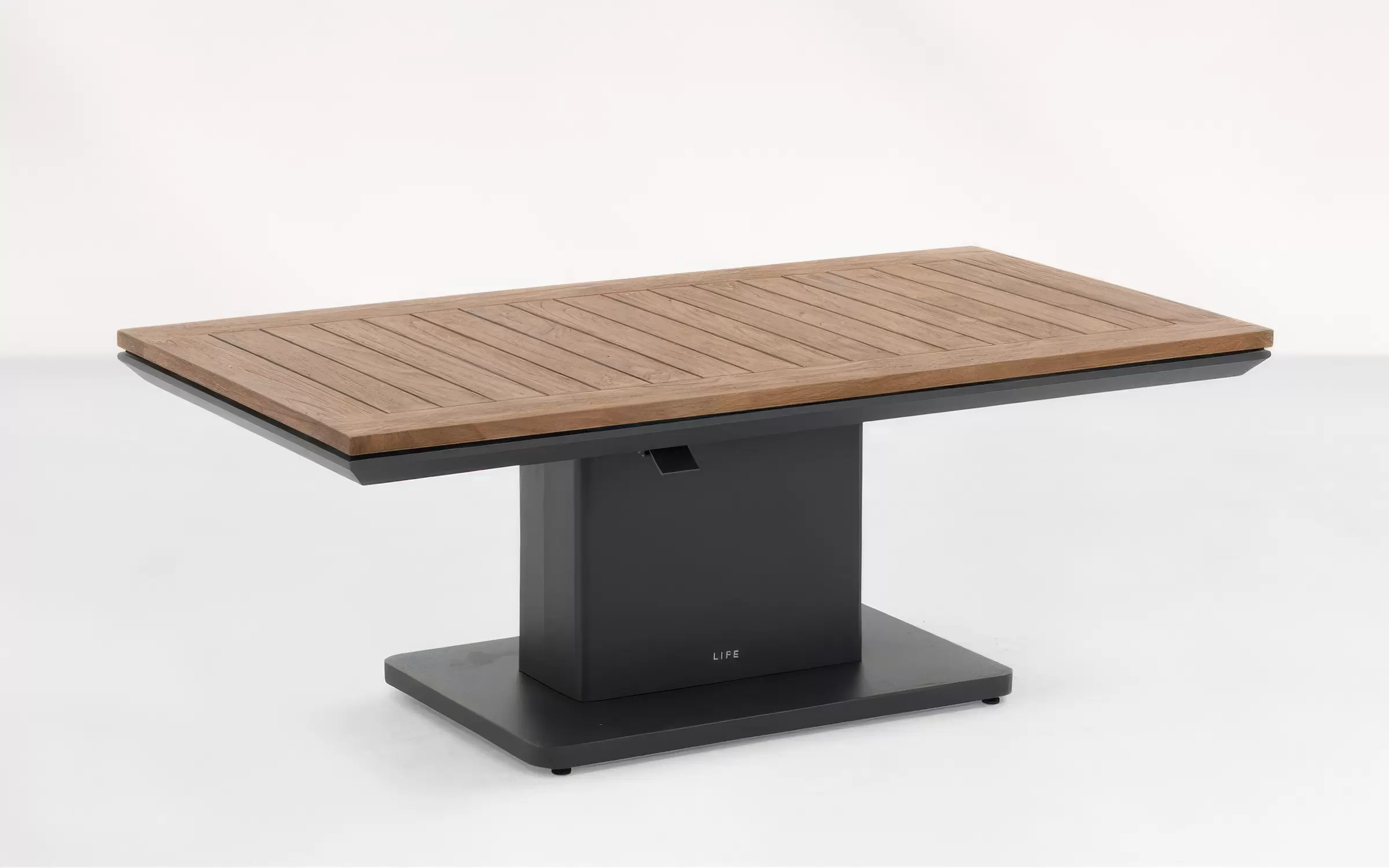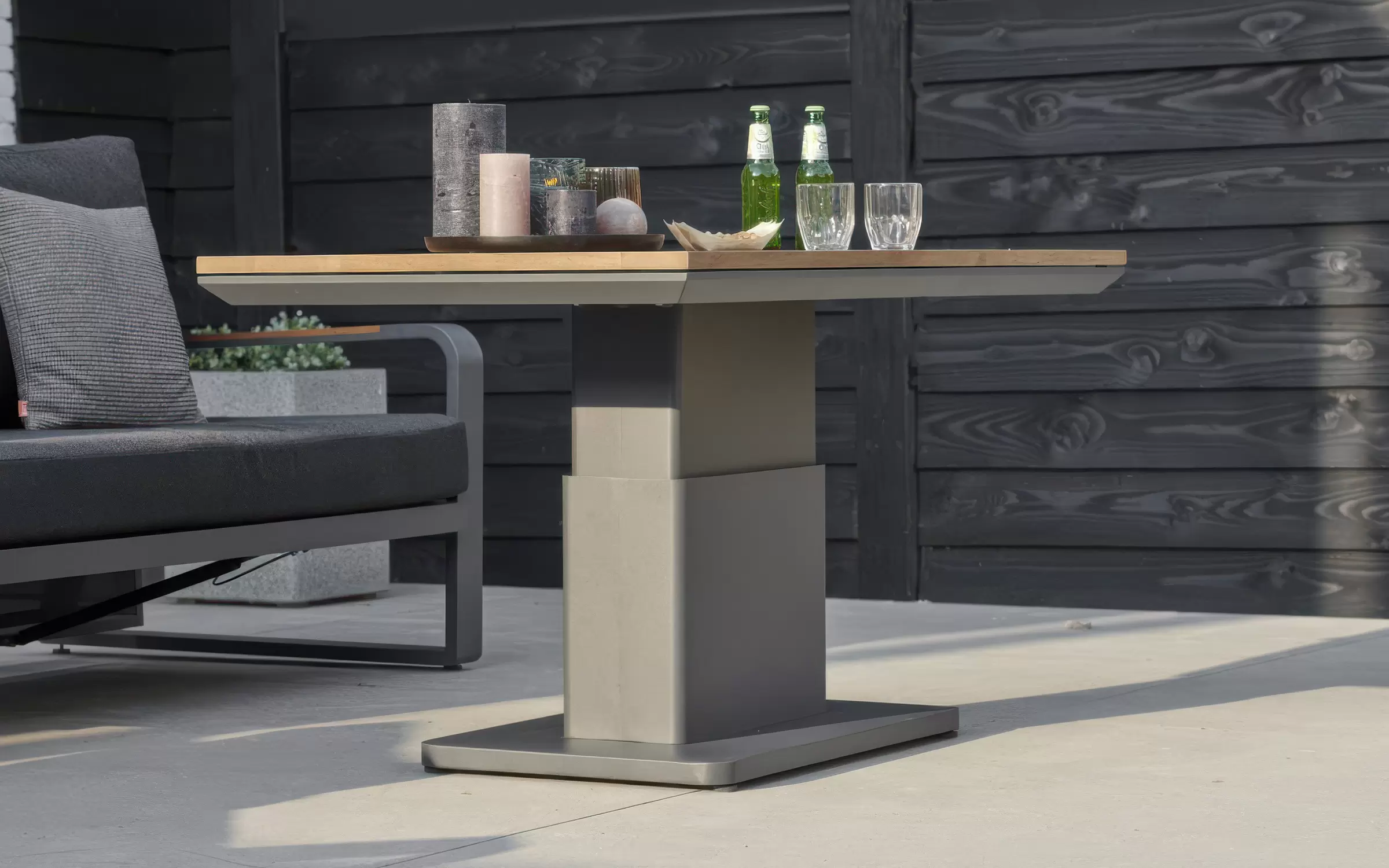 LUCA Teak to funkcjonalny stolik ogrodowy z płynną regulacją wysokości, który dzięki zastosowaniu siłownika gazowego może pełnić rolę zarówno stolika kawowego, jak i wygodnego stołu obiadowego. Regulacja odbywa się lekko i bezstopniowo, umożliwiając idealne dopasowanie do aktualnych potrzeb użytkowników.