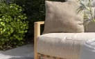 Grube poduszki oparcia i siedziska wraz z dodatkowymi poduszkami lędĹşwiowymi tworzą piękne połączenie z ramami z drewna tekowego i zapewniają optymalny komfort siedzenia.