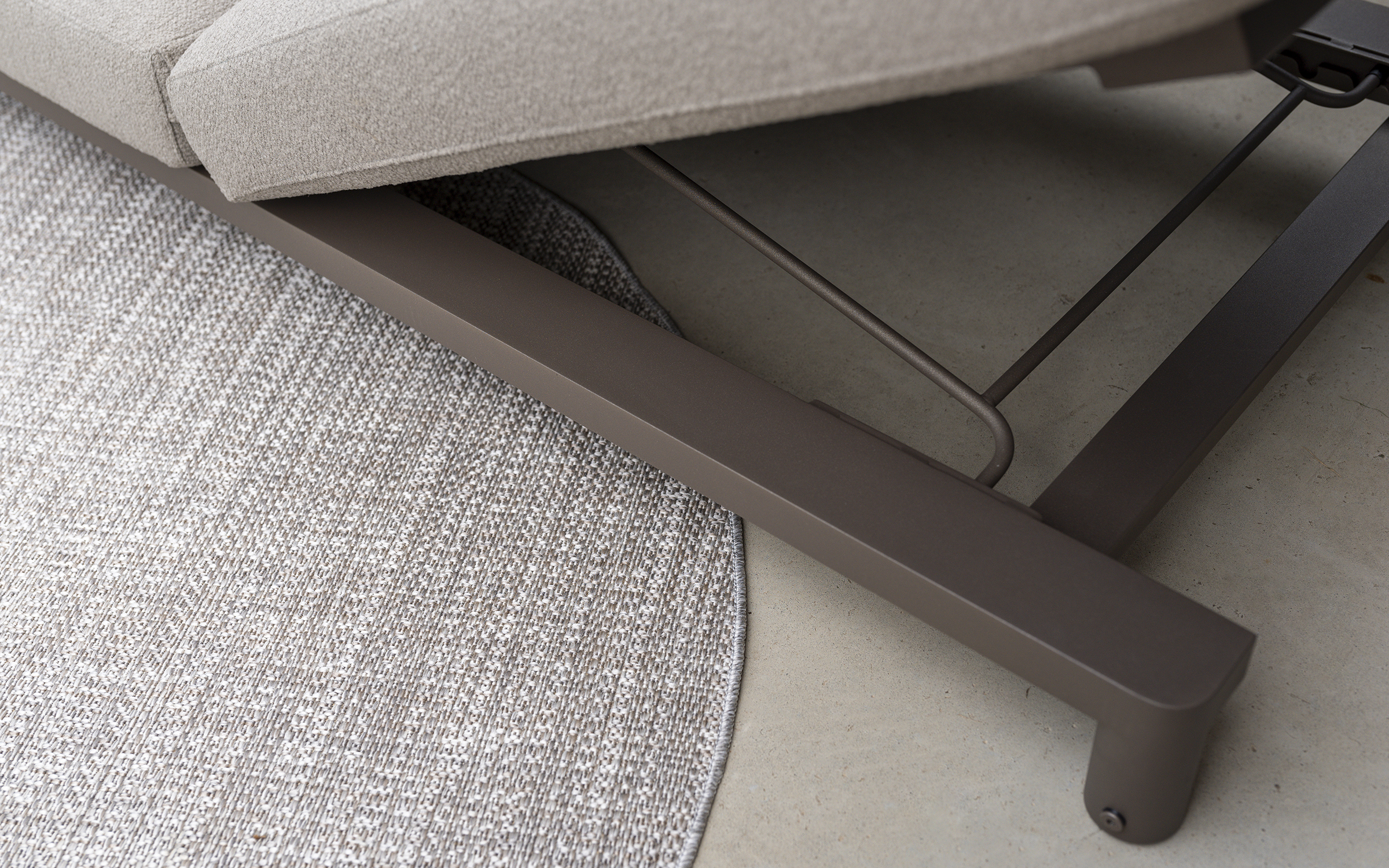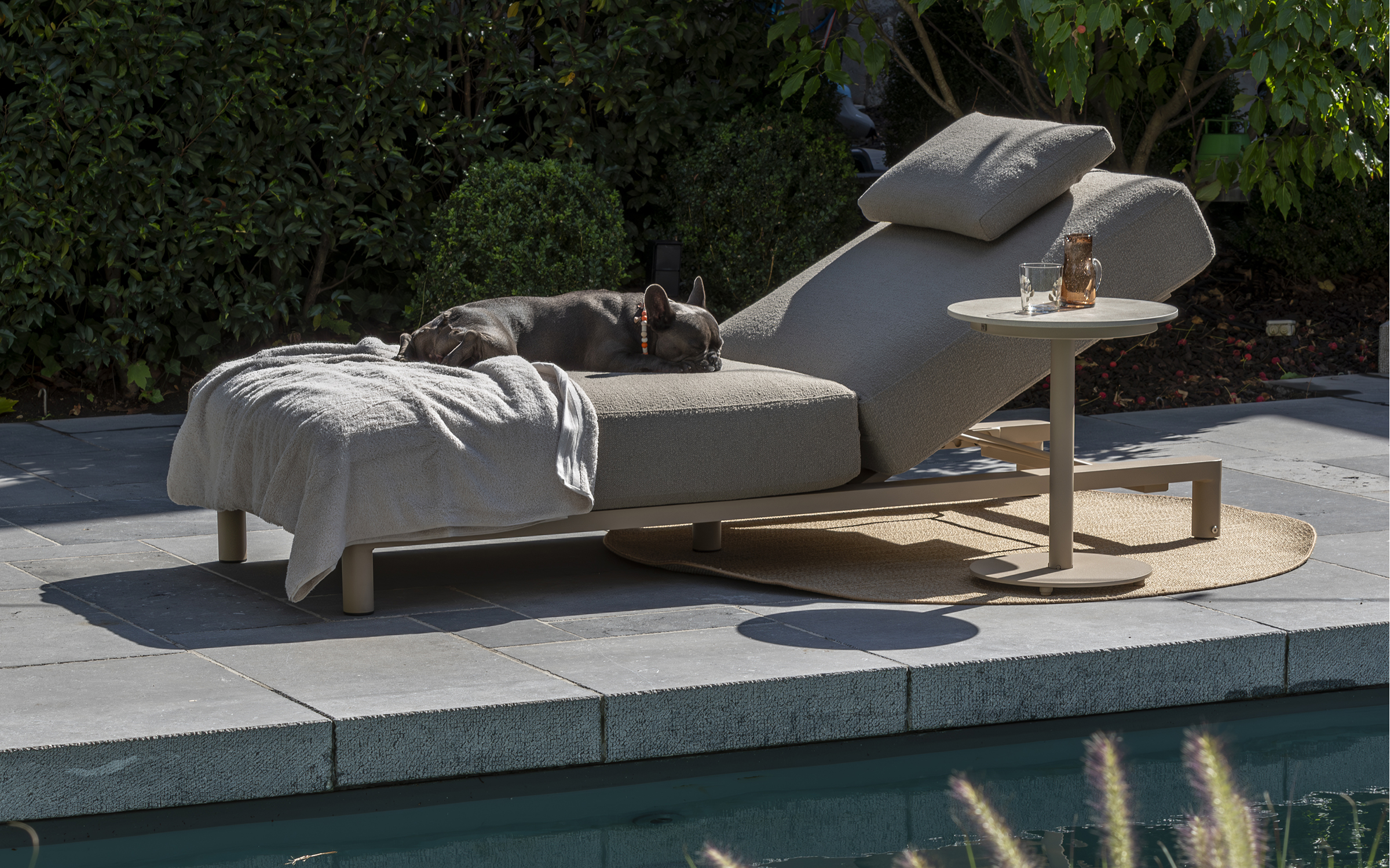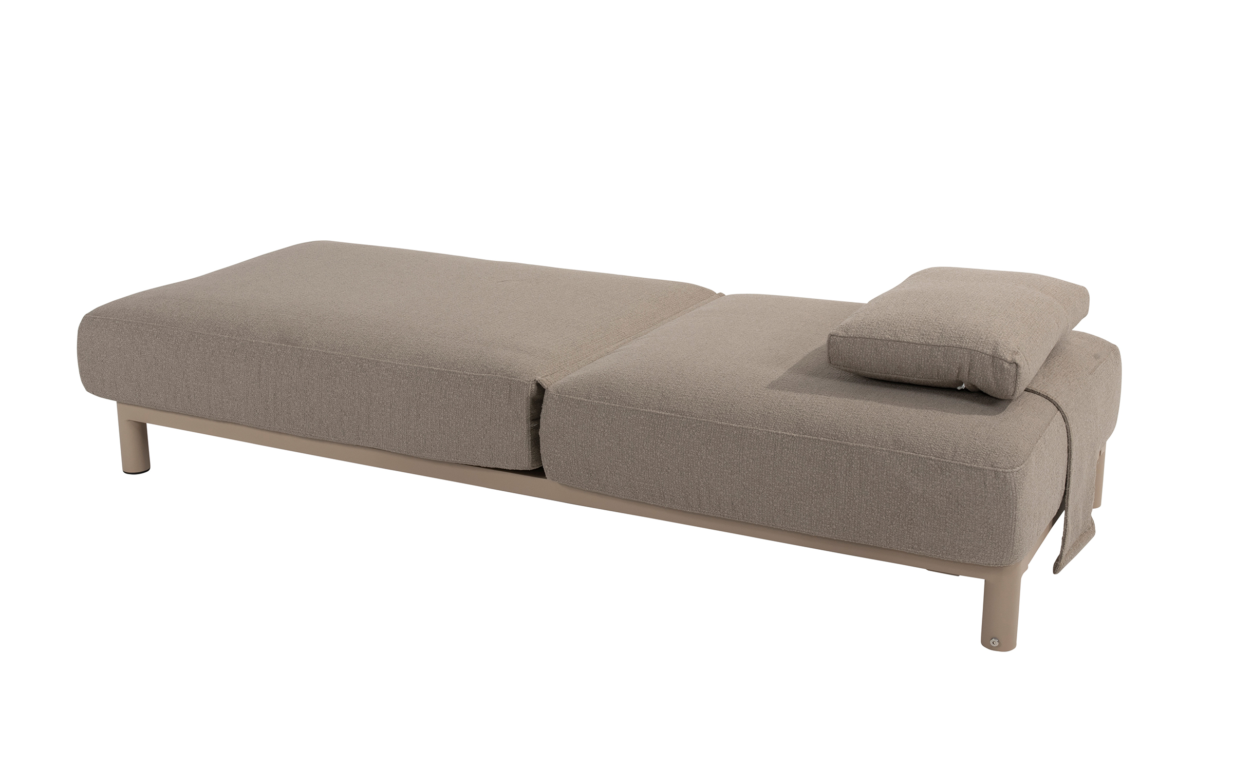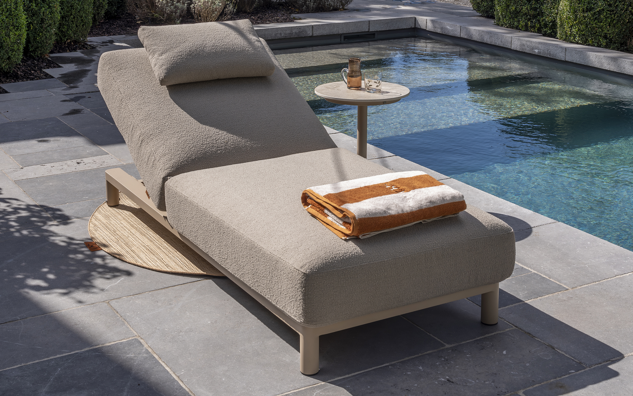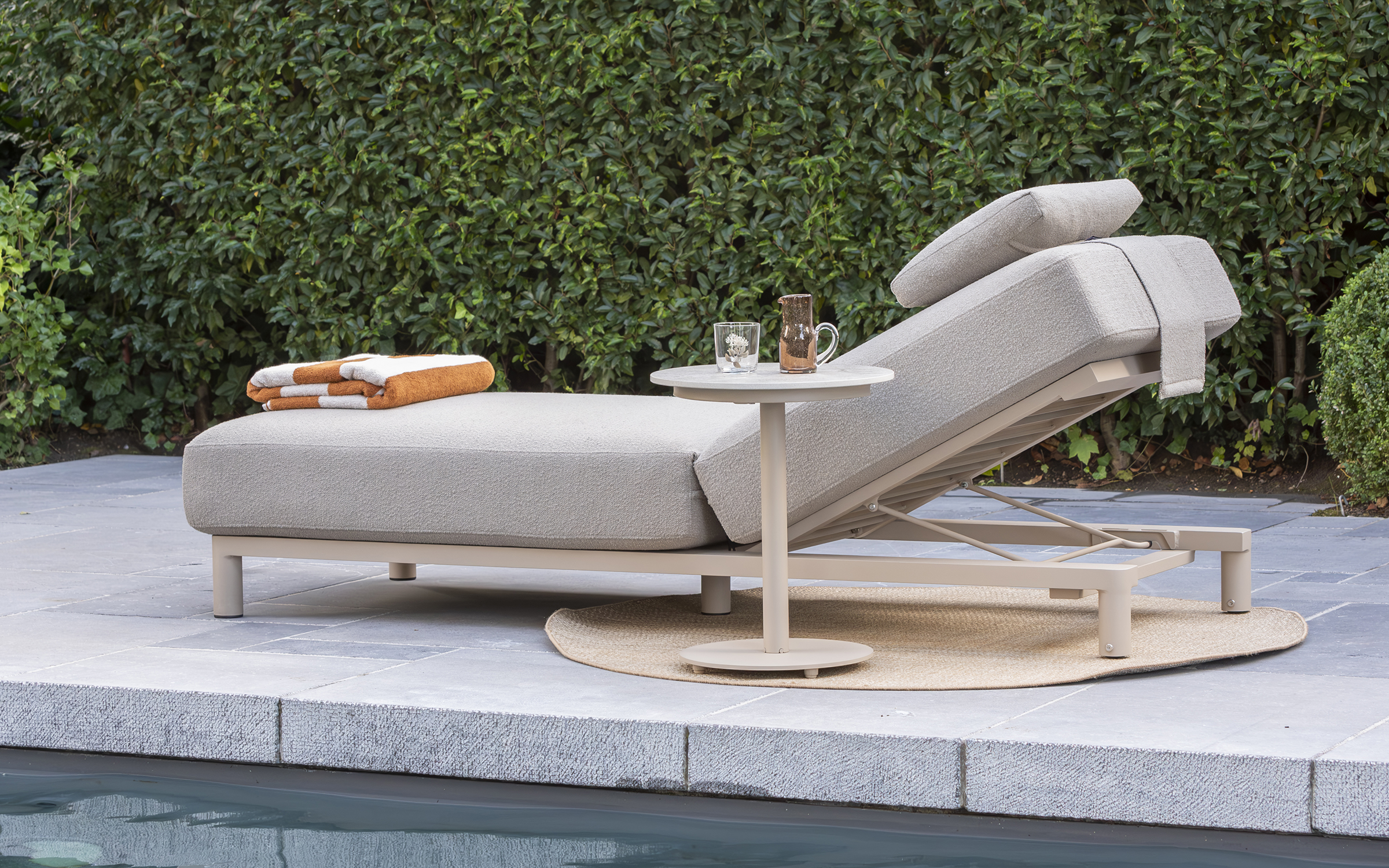 Leżak Madeira to luksusowa leżanka, która łączy w sobie styl i wygodę z solidną aluminiową ramą w eleganckim kolorze terre (ciemny brąz) lub beżowym oraz wyjątkowo okazałymi poduszkami.