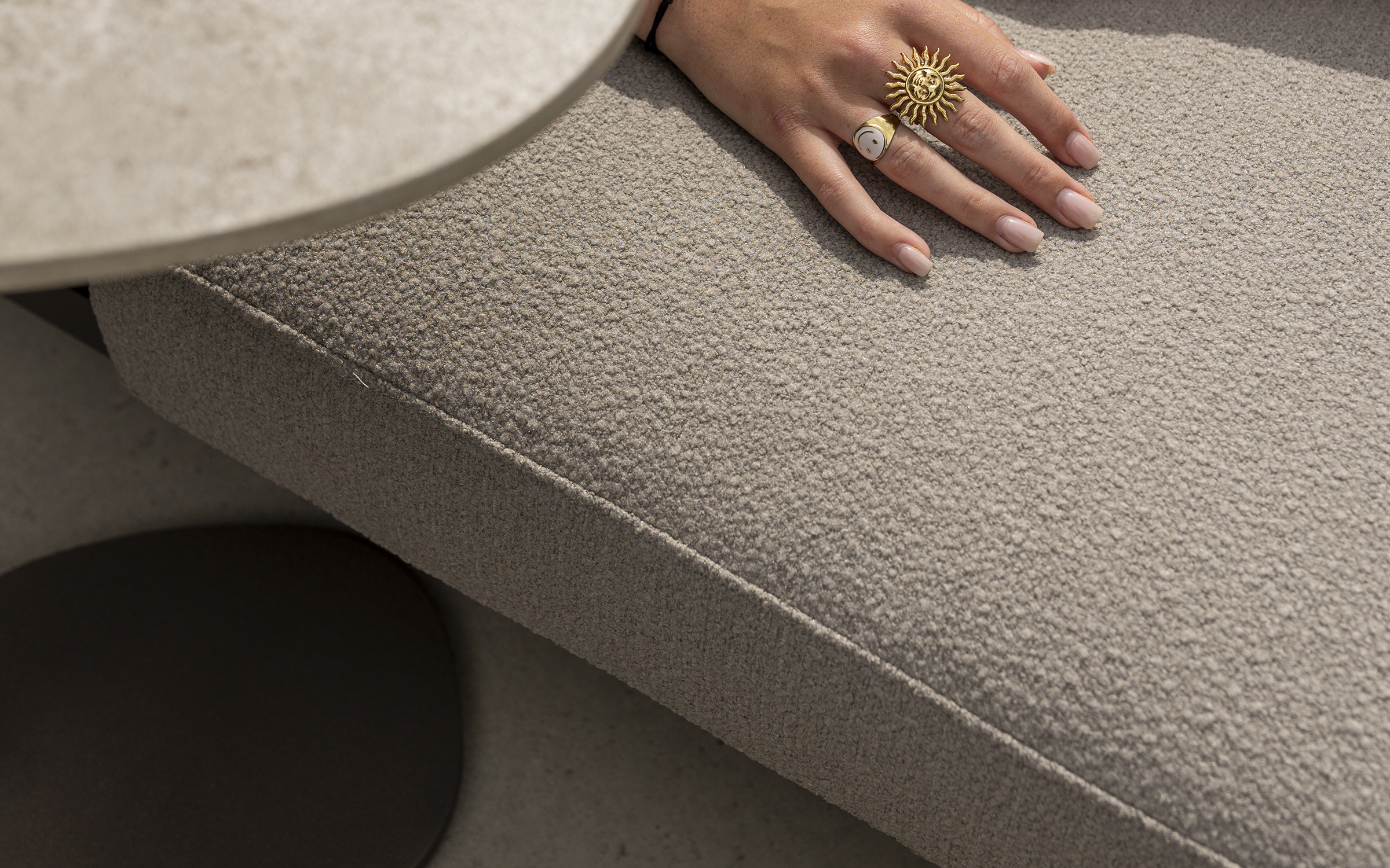 Tkanina boucle to specjalny rodzaj tkaniny, charakterystyczny dzięki swojej pętelkowej strukturze. Wykonana w wersji do użytku na zewnątrz z włókien akrylowych (100% polipropylen) - jej unikalna faktura nadaje jej miękkość i objętość.