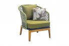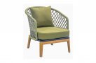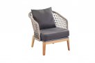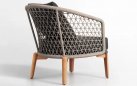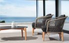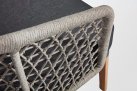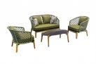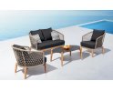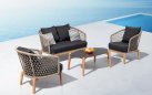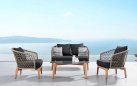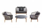 Nowoczesny komplet kawowy łączący podstawę z drewna teakowego oraz siedzisk z oparciami wyplatanymi liną polipropylenową.