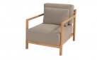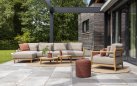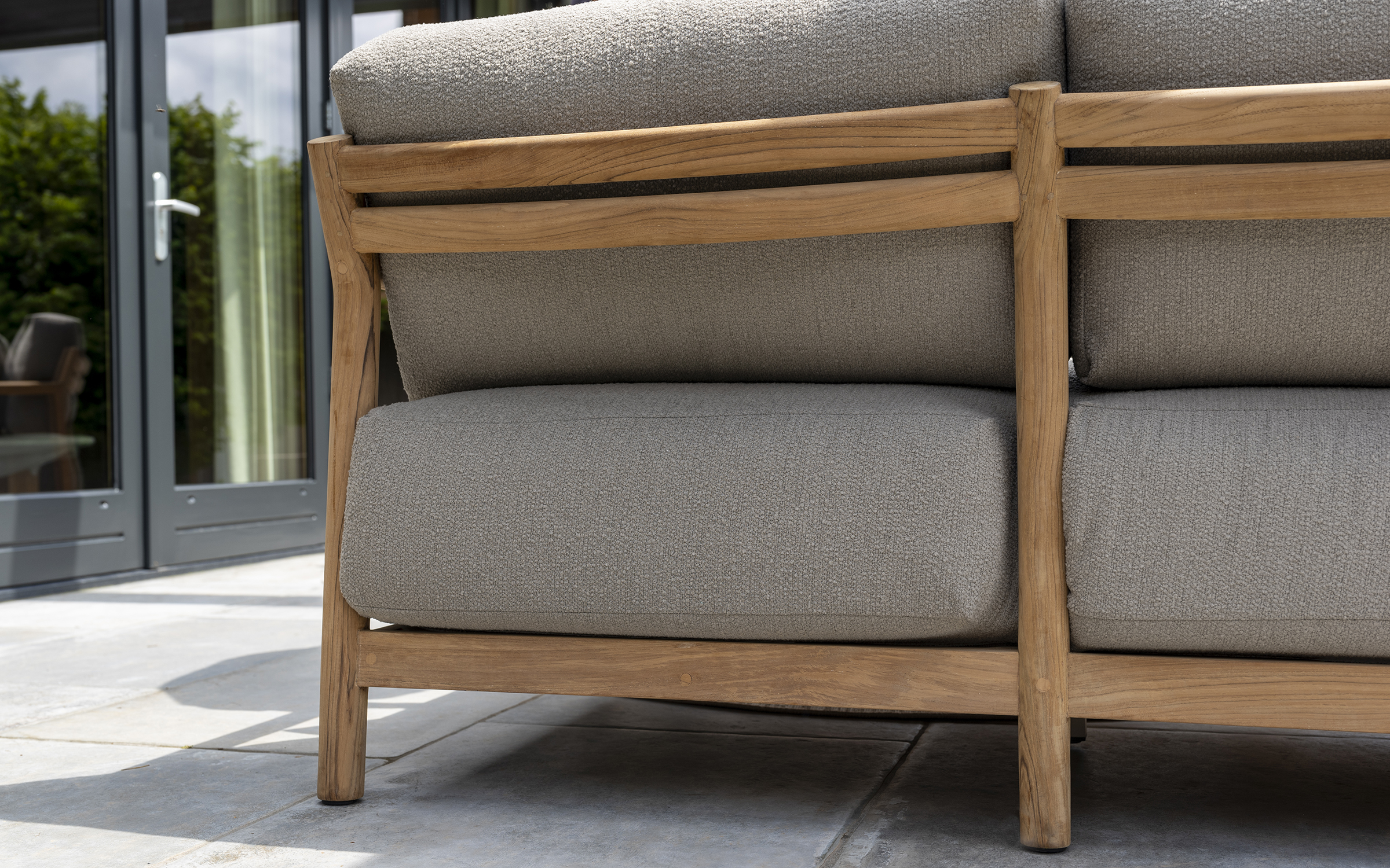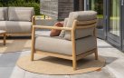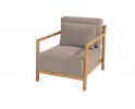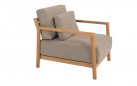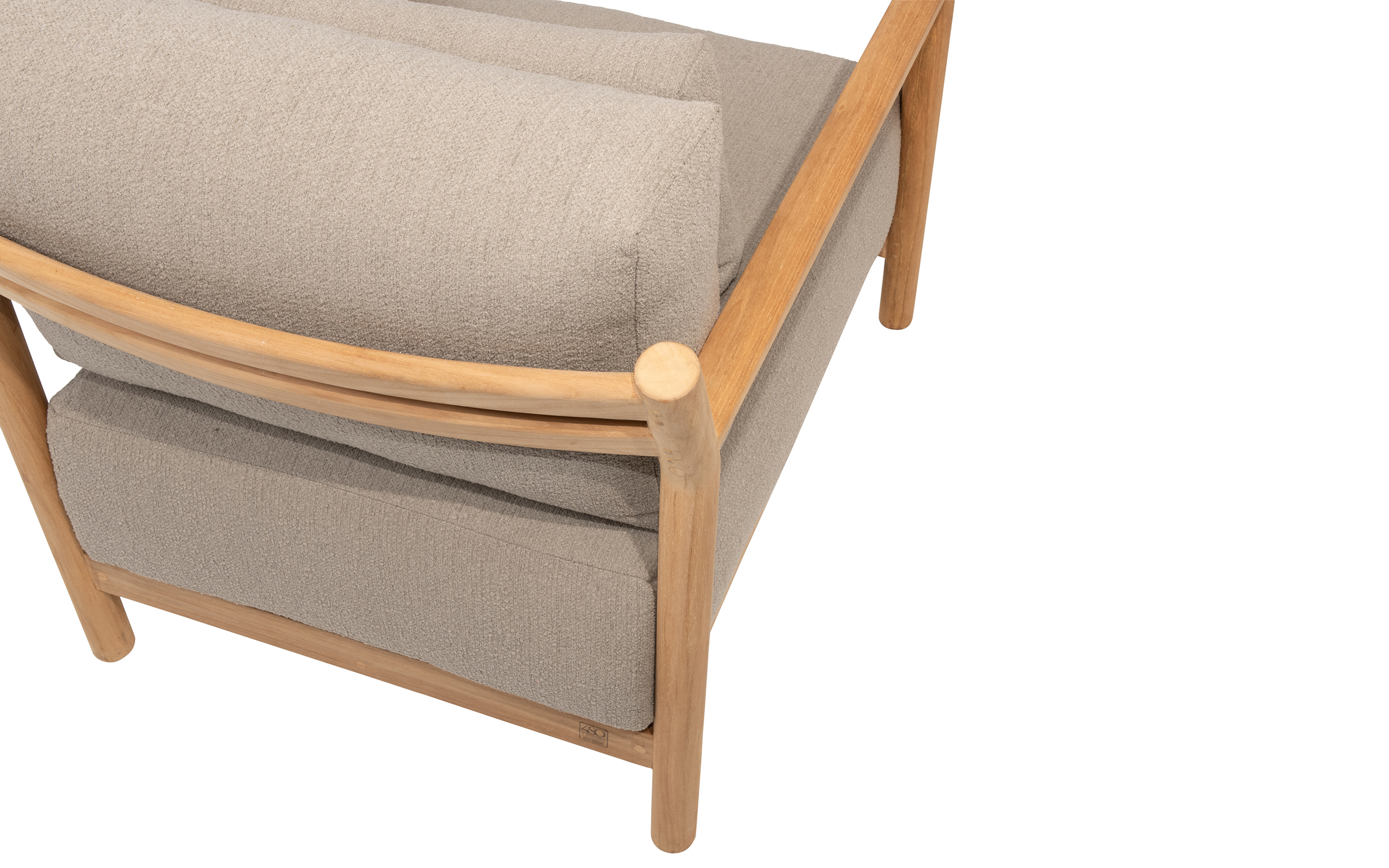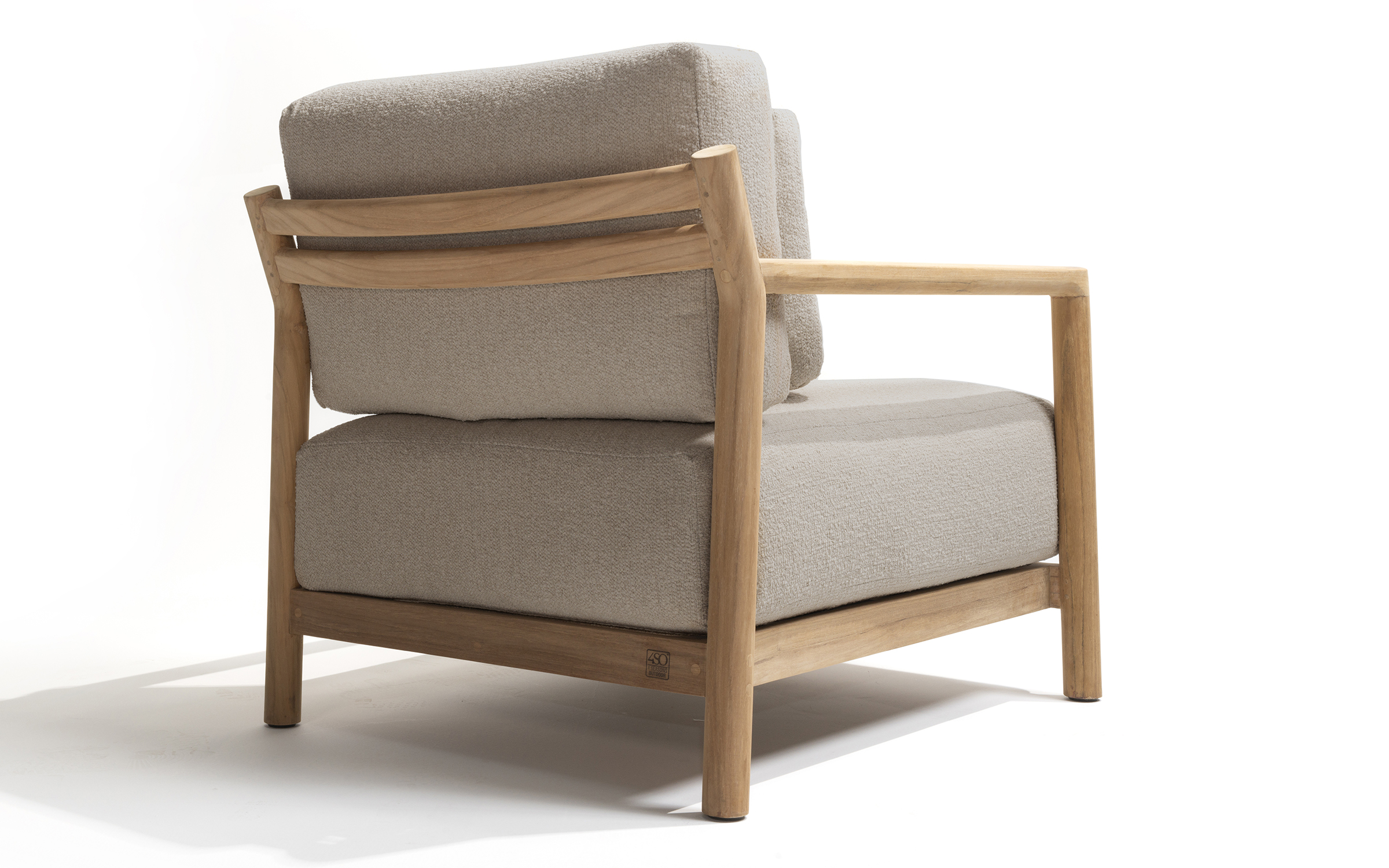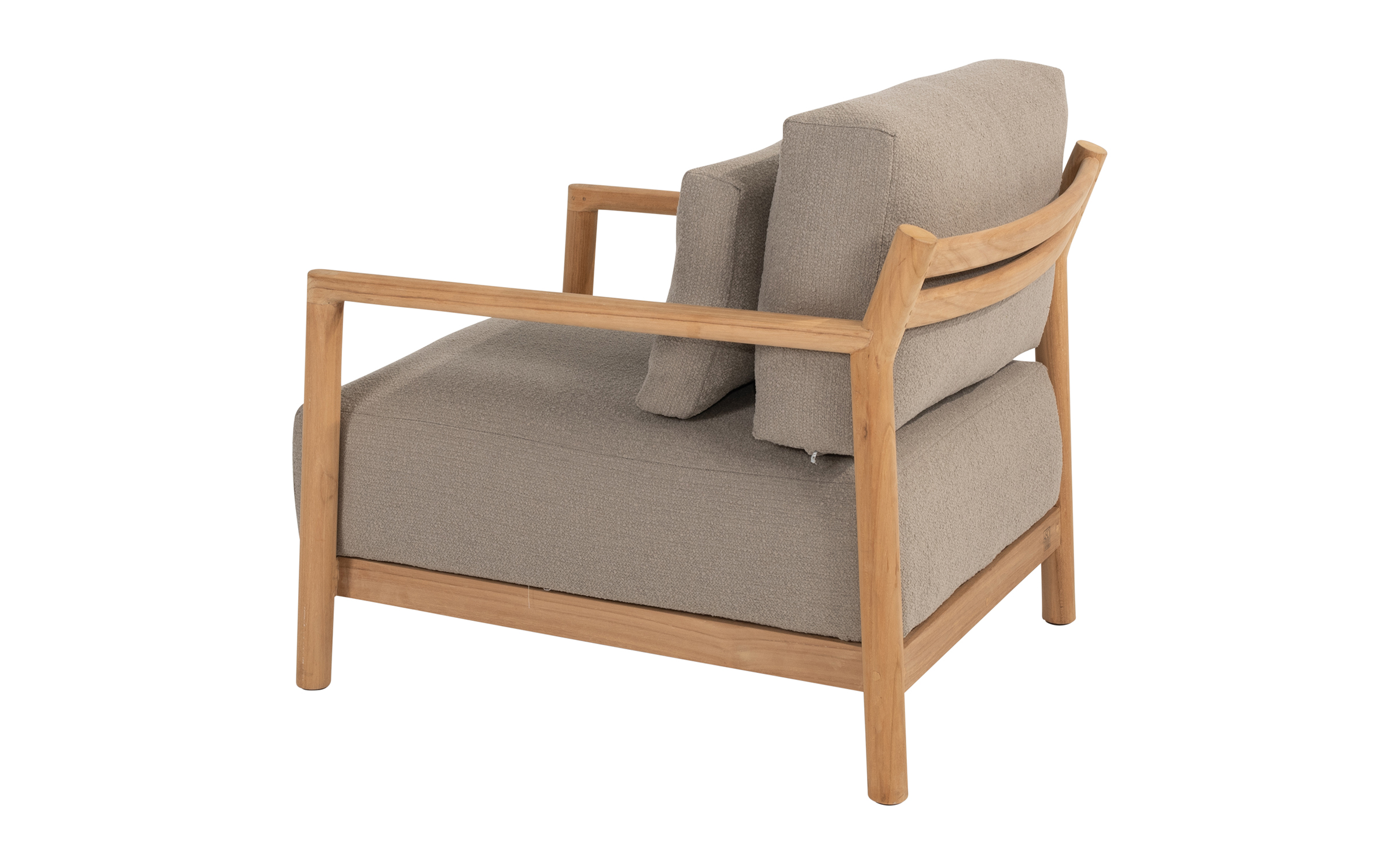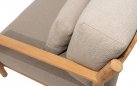 Fotel Marie z naturalnego drewna tekowego od 4 Seasons Outdoor. Stylowy fotel wypoczynkowy wyróżnia się pięknie wykończoną ramą z drewna tekowego oraz obszernymi, wyjątkowo grubymi poduszkami z tapicerką Bouclé. Dzięki temu fotel zapewnia najwyższy komfort na tarasie.