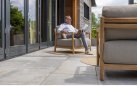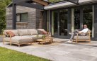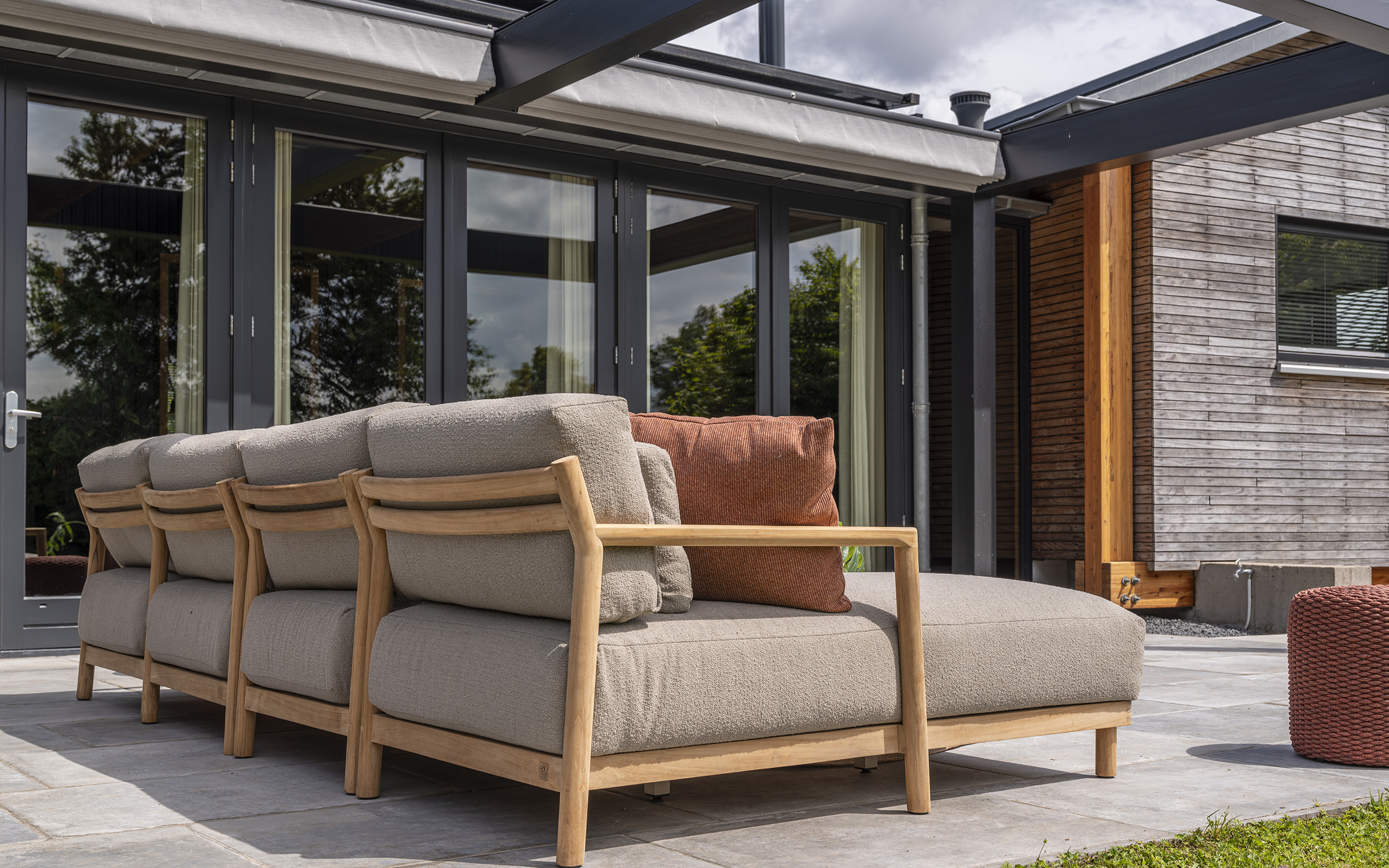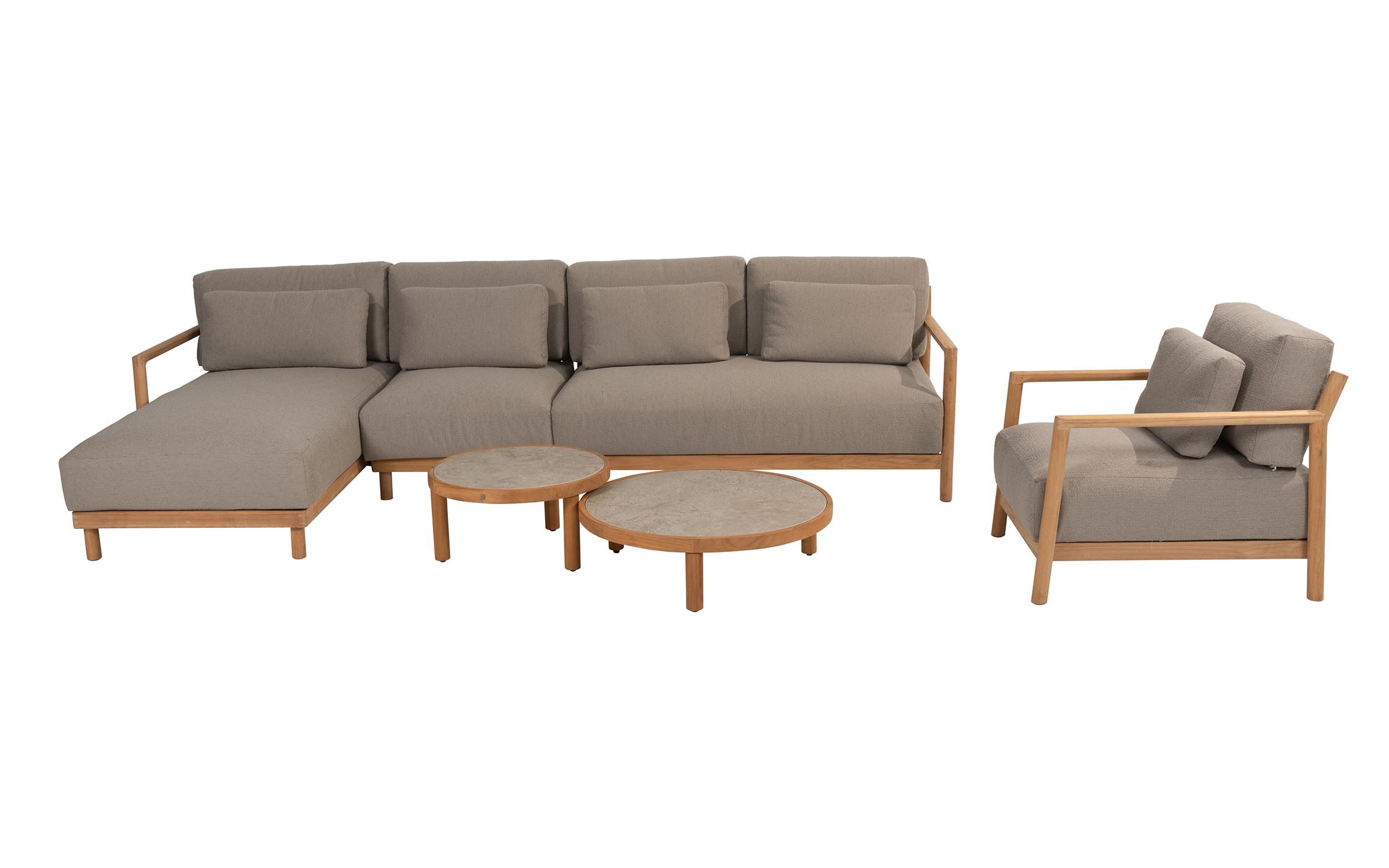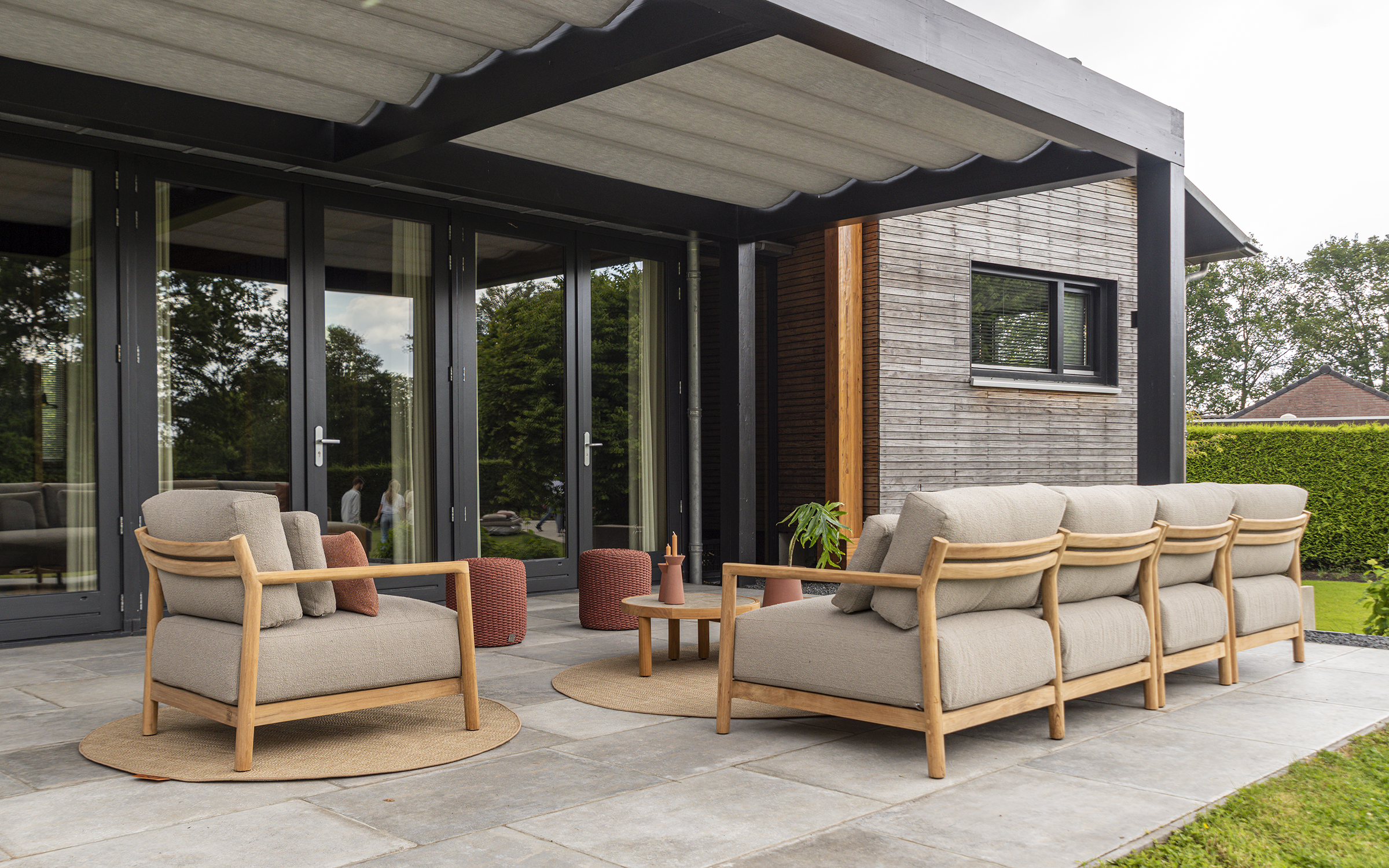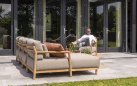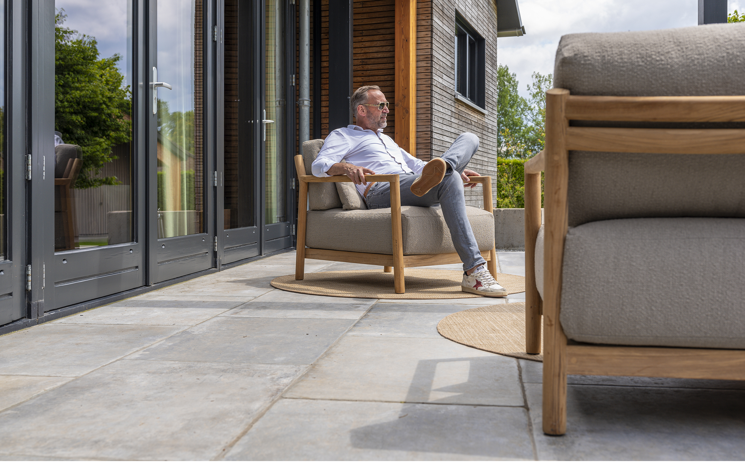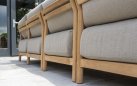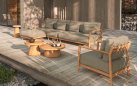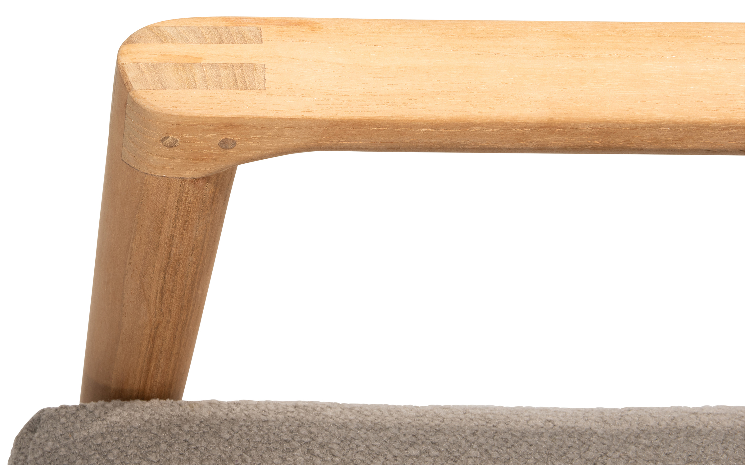 Fotel Marie z naturalnego drewna tekowego od 4 Seasons Outdoor. Stylowy fotel wypoczynkowy wyróżnia się pięknie wykończoną ramą z drewna tekowego oraz obszernymi, wyjątkowo grubymi poduszkami z tapicerką Bouclé. Dzięki temu fotel zapewnia najwyższy komfort na tarasie.