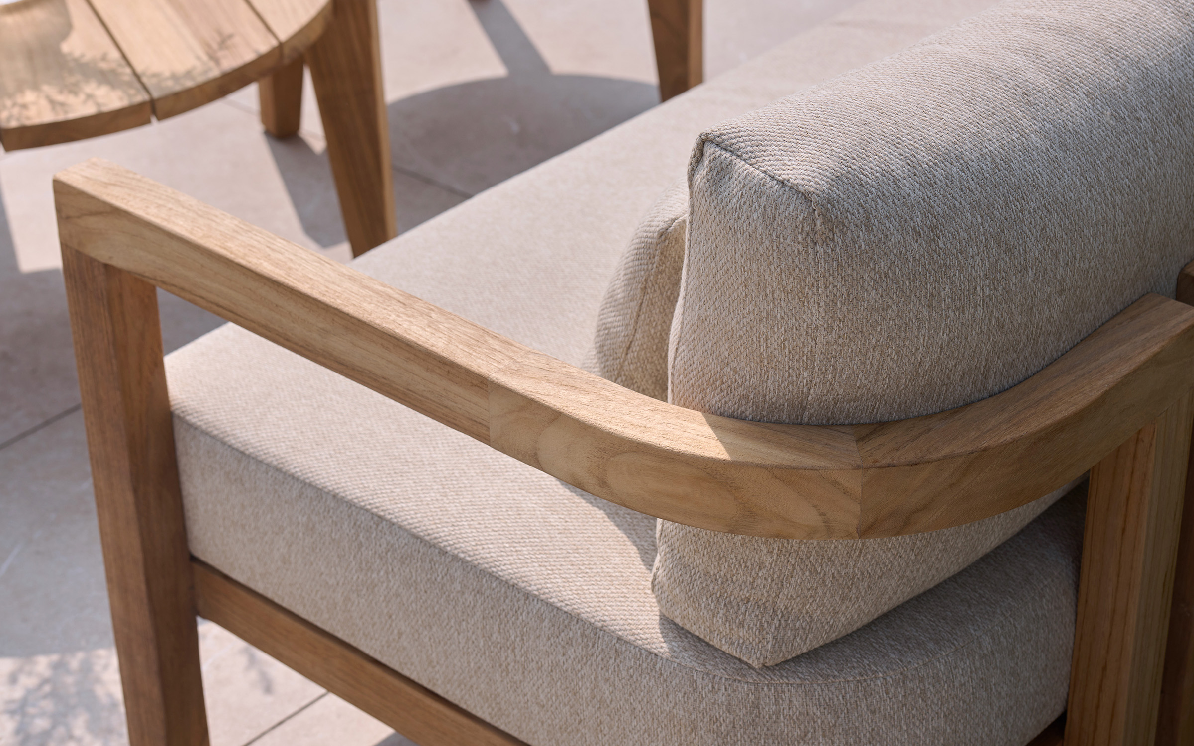 Sofa wykonana jest z wysokiej jakości drewna teakowego, które cechuje się odpornością na wilgoć i zmienne temperatury. Poduszki w technologii weatherready posiadają szybkoschnące wypełnienie i tkaninę odporną na wodę i promieniowanie UV. Mebel doskonale sprawdzi się jako sofa ogrodowa lub sofa na taras.
