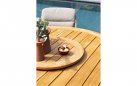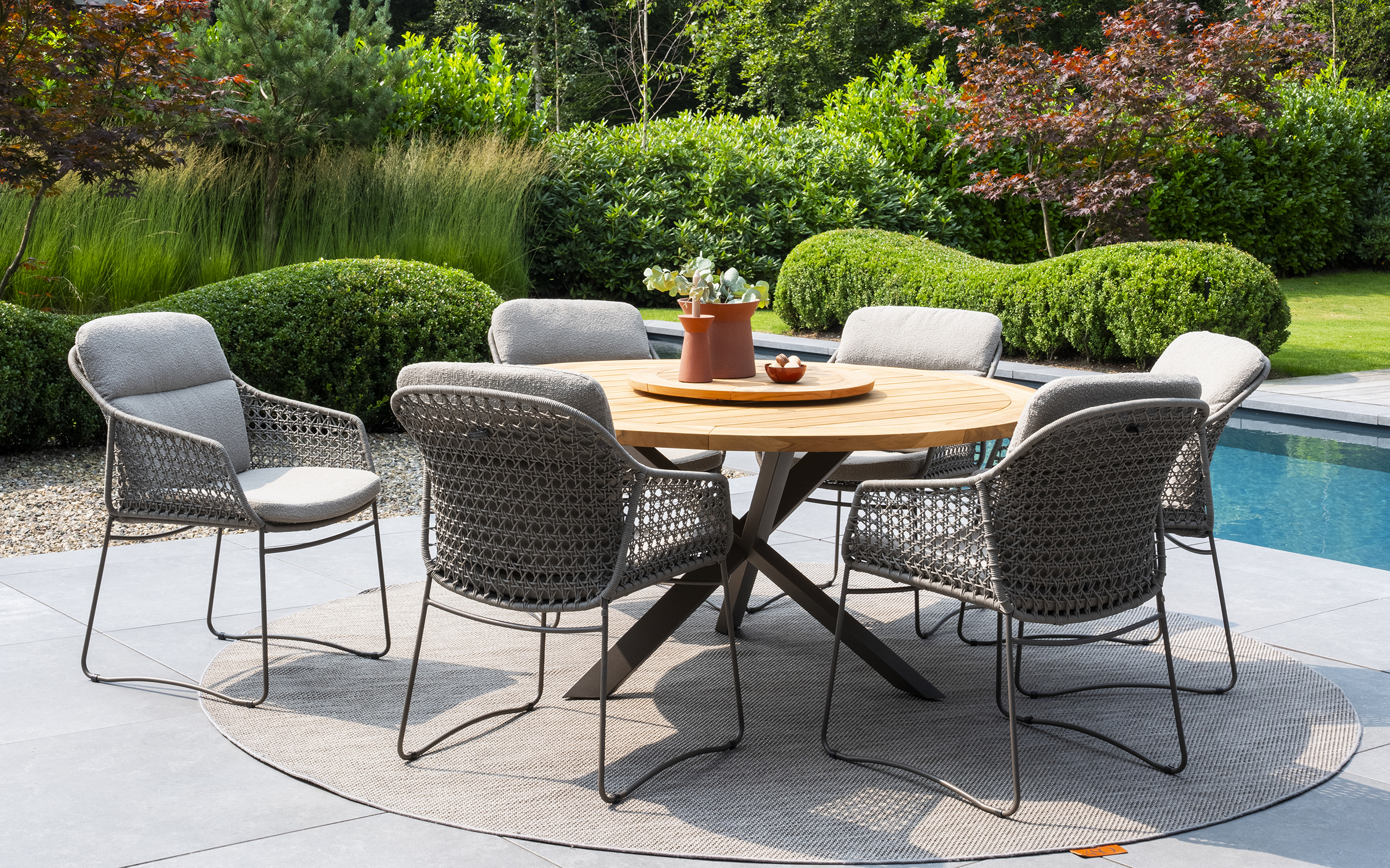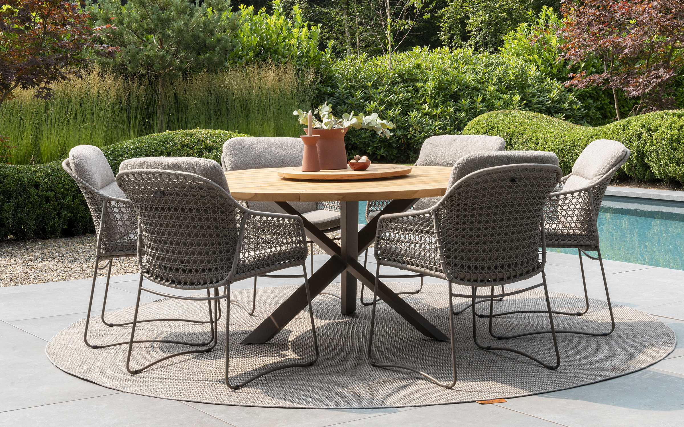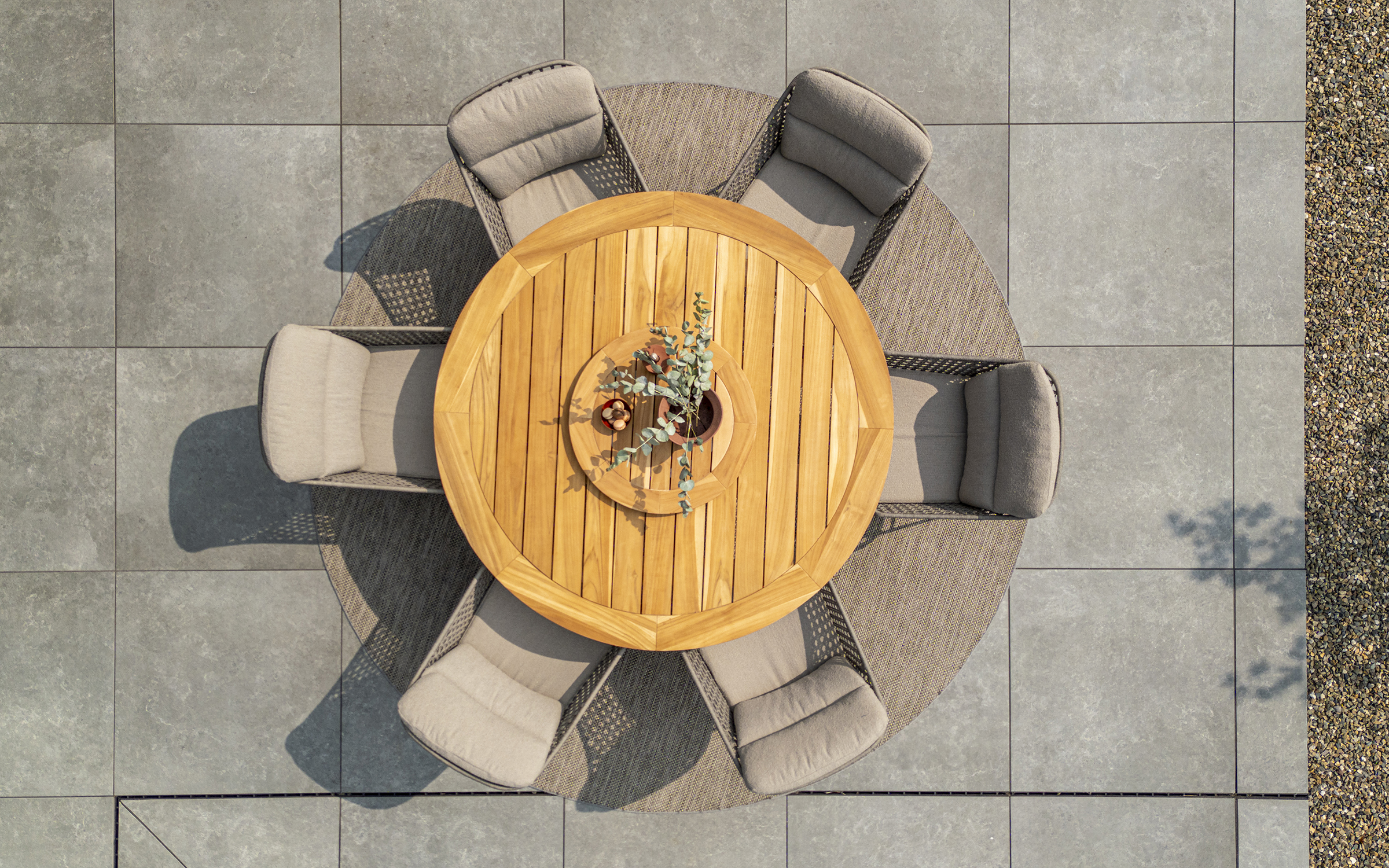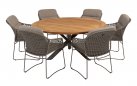 Dzięki praktycznej podstawie ze skrzyżowanymi nogami krzesła stoją swobodnie przy stole bez żadnych przeszkód ze strony nogi stołu. Stół Prado o średnicy 160 cm jest odpowiedni dla sześciu osób.