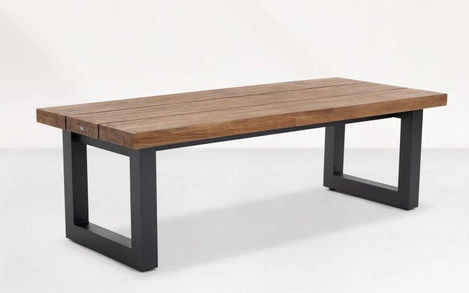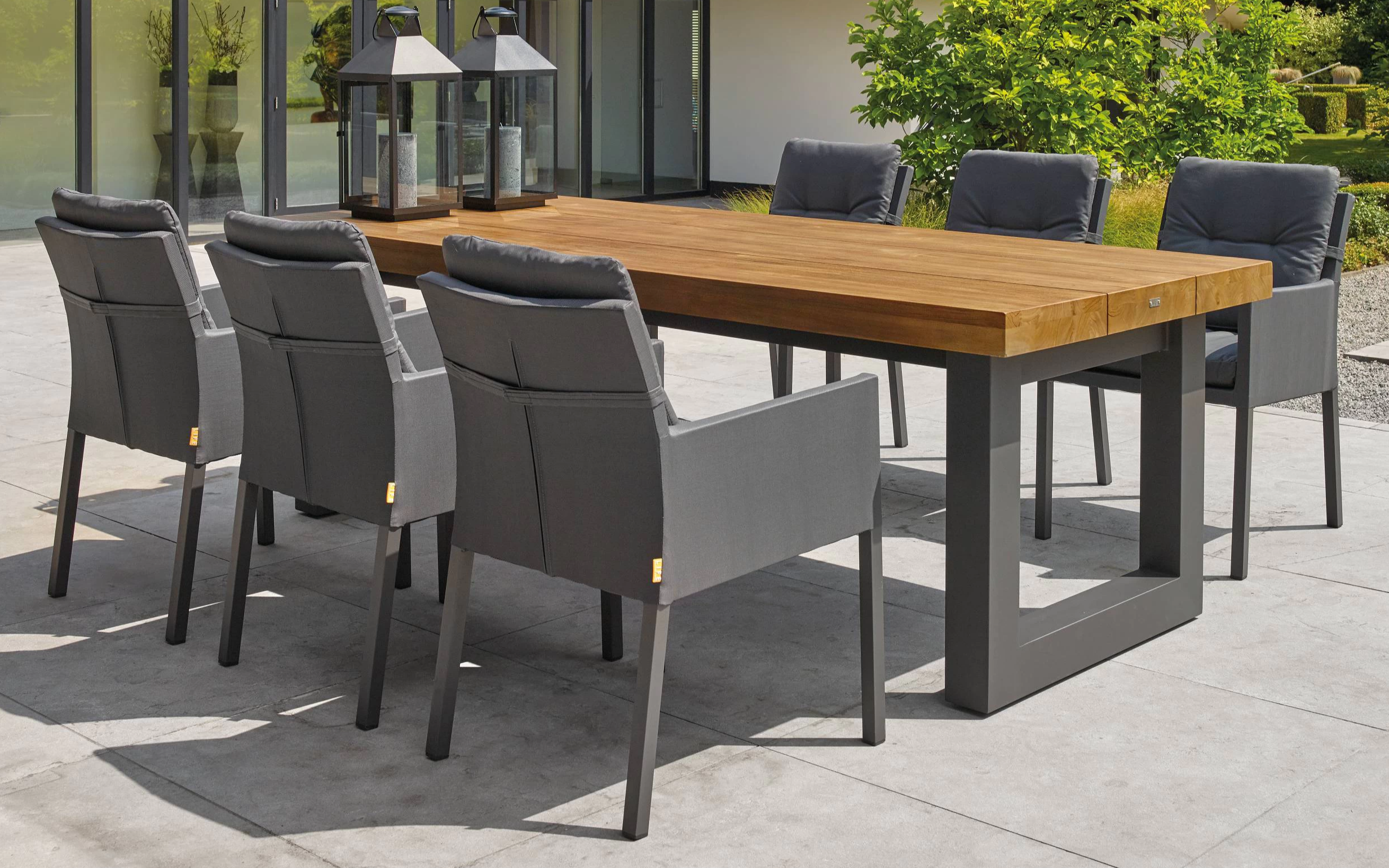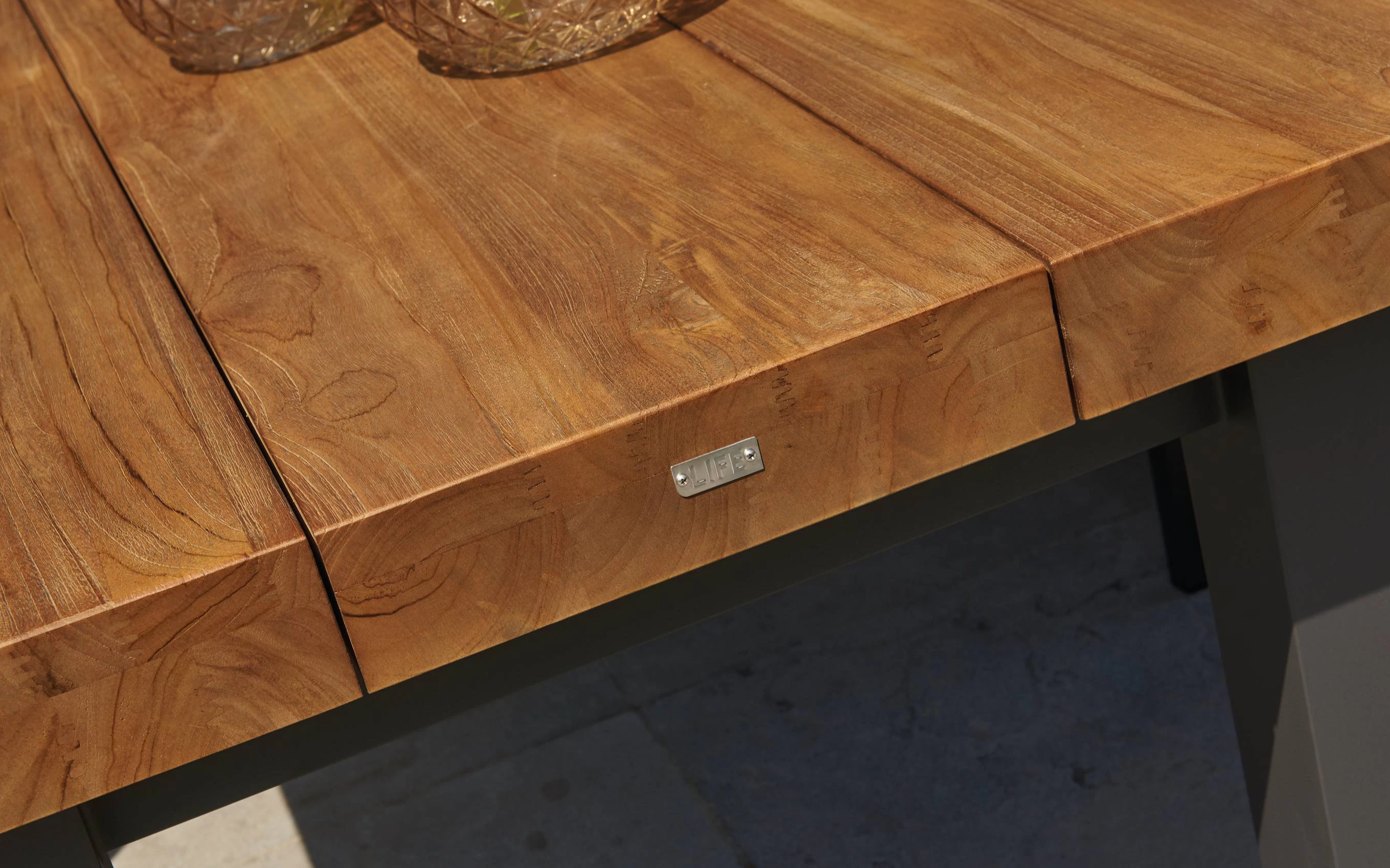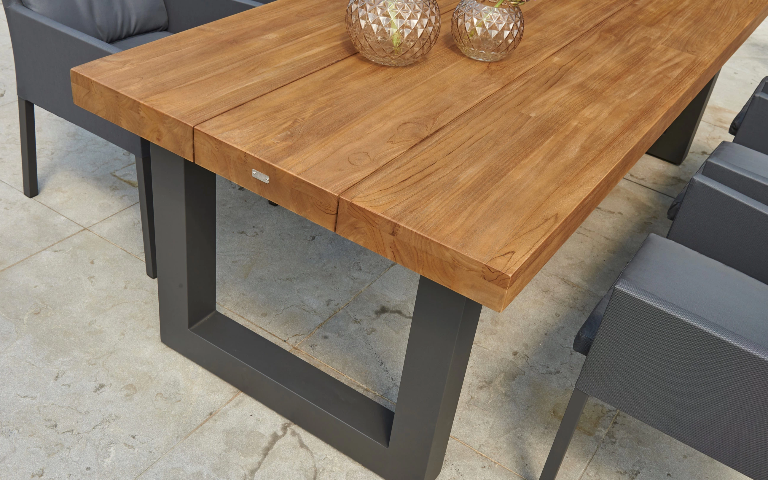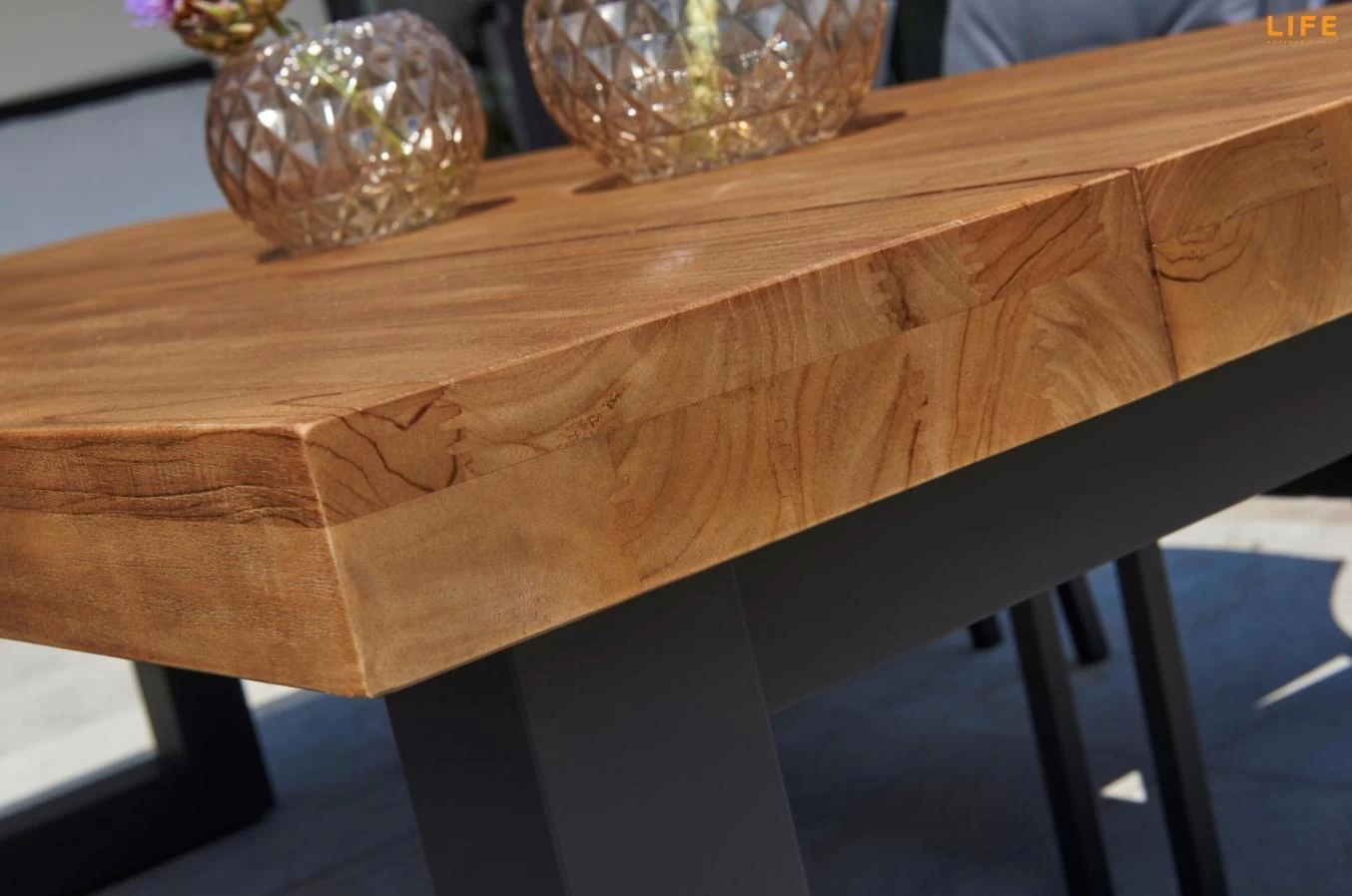 Solidny blat z drewna tekowego i elegancki wygląd aluminiowych nóg to wizytówka stołu ogrodowego Nevada. Blat wykonany jest z recyklingowanego drewna tekowego ma robiącą wrażenie grubość 8 cm.