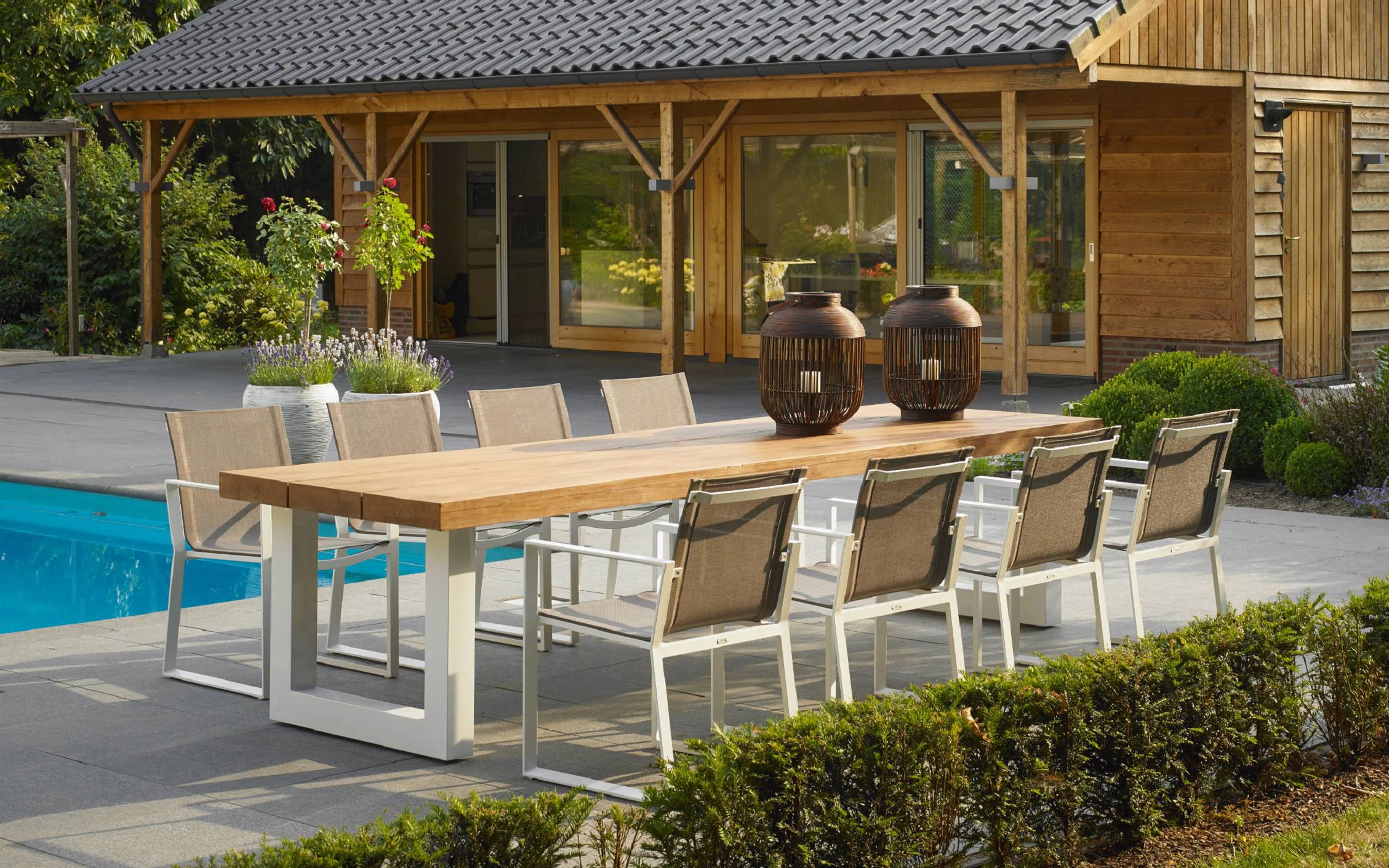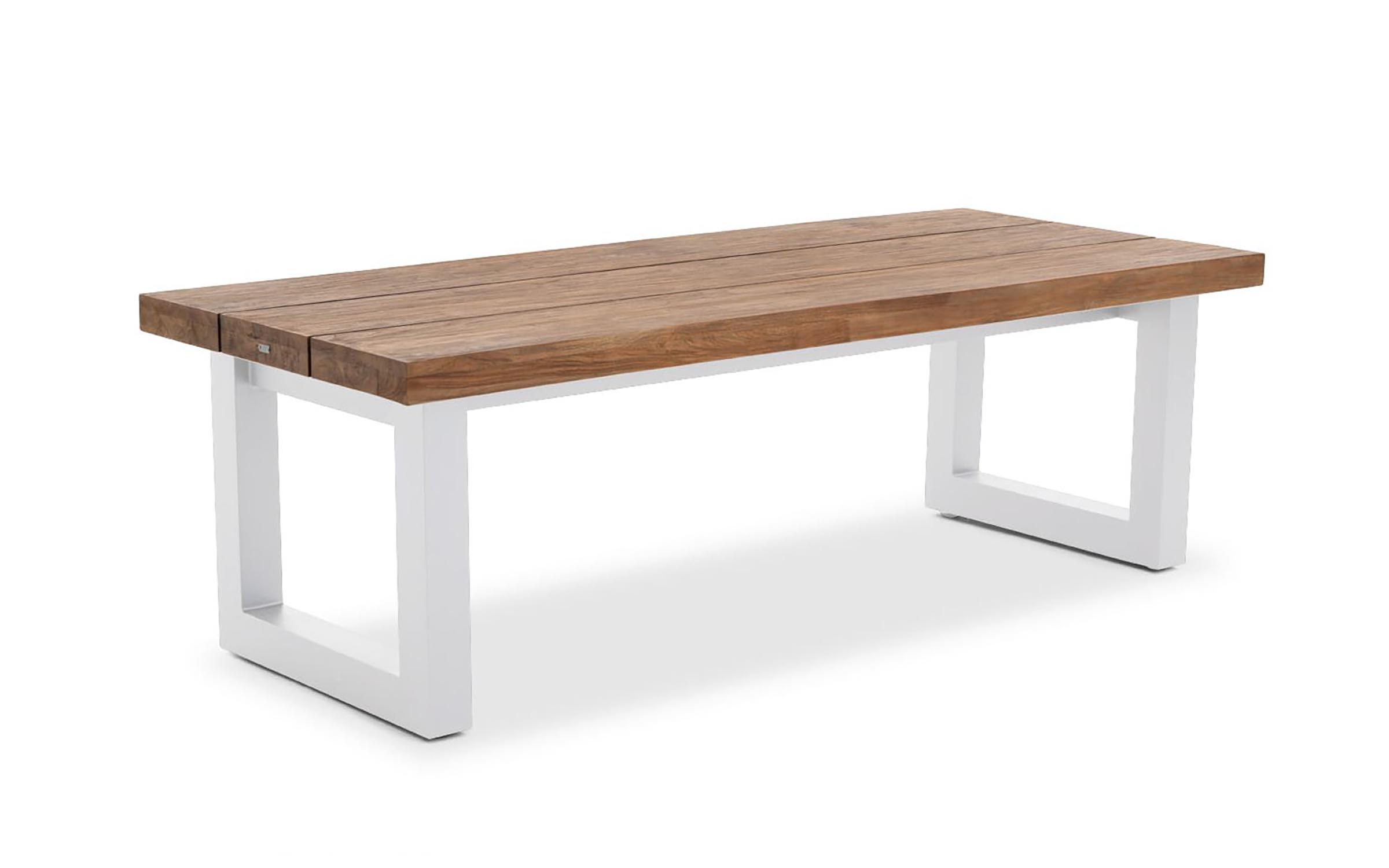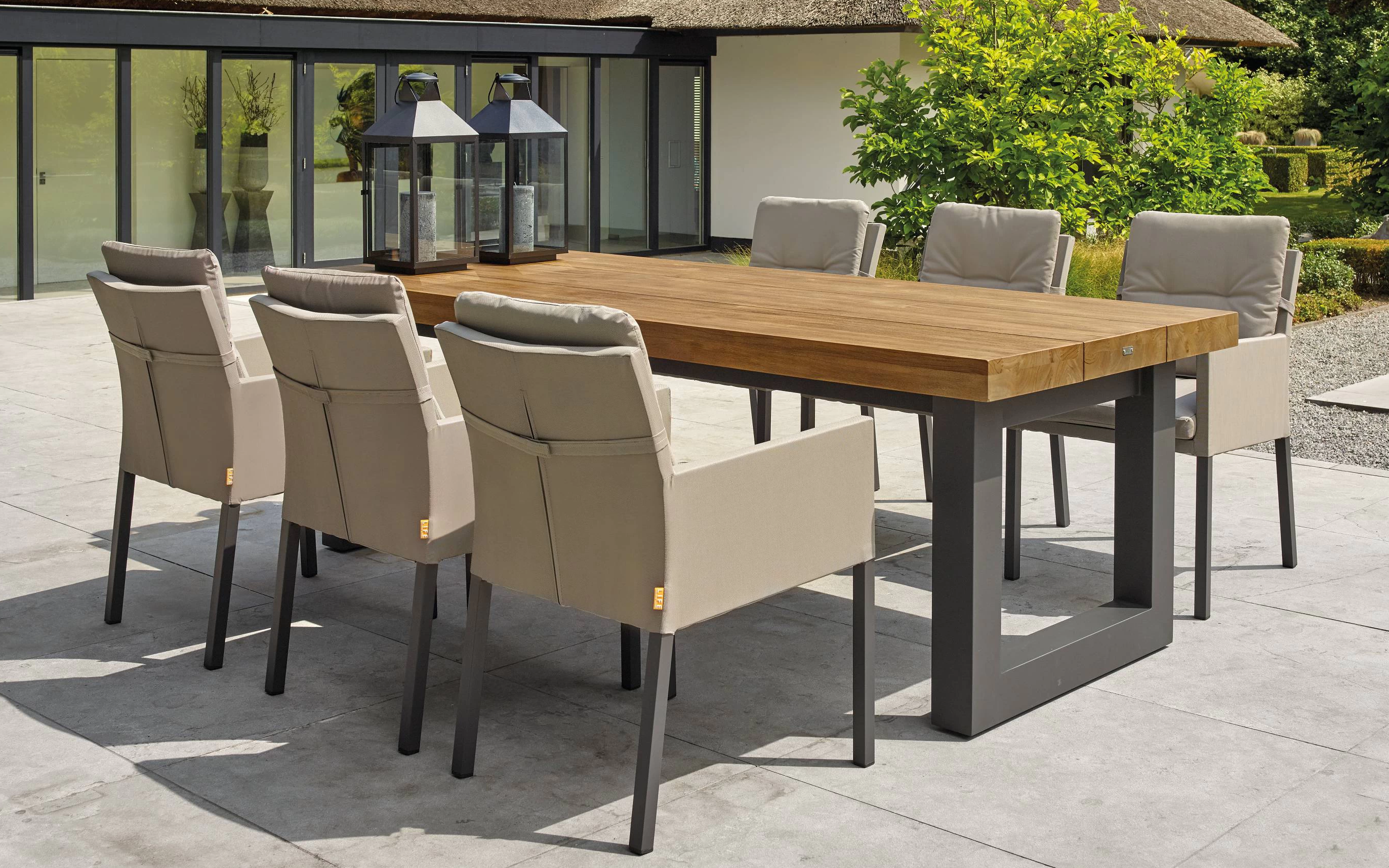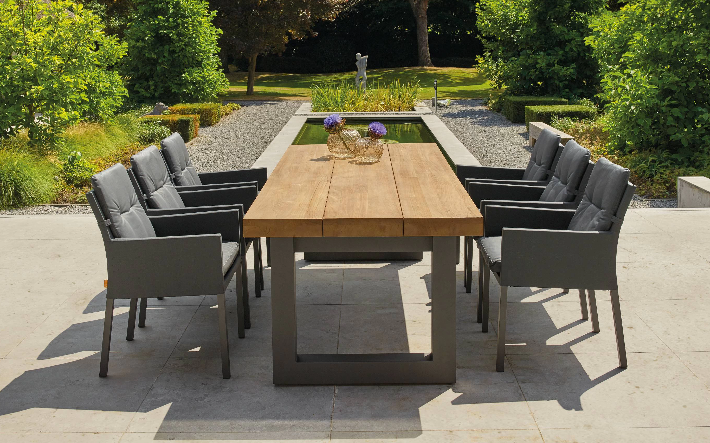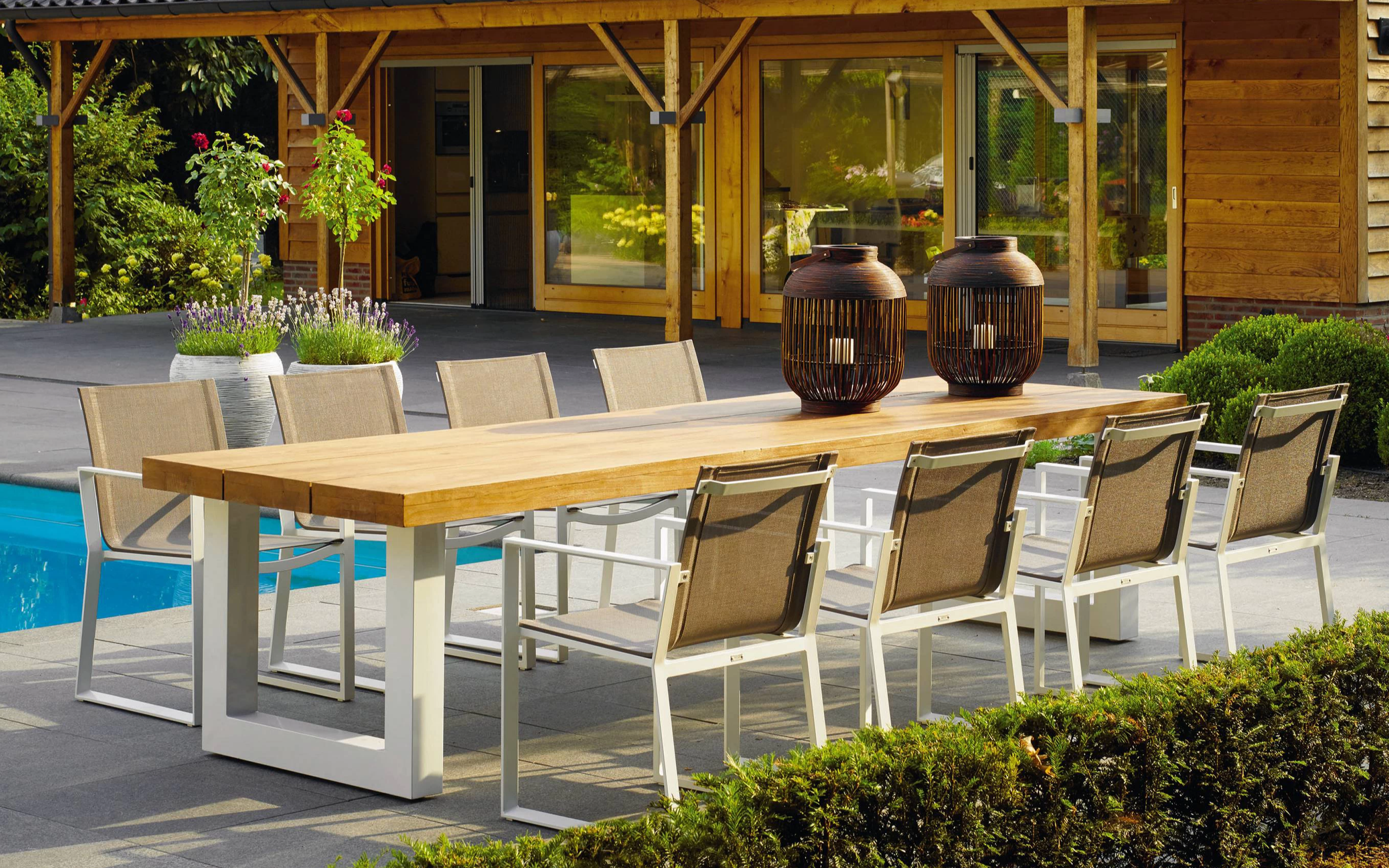 Solidny blat z drewna tekowego i elegancki wygląd aluminiowych nóg to wizytówka stołu ogrodowego Nevada. Blat wykonany jest z recyklingowanego drewna tekowego ma robiącą wrażenie grubość 8 cm.