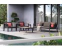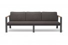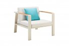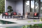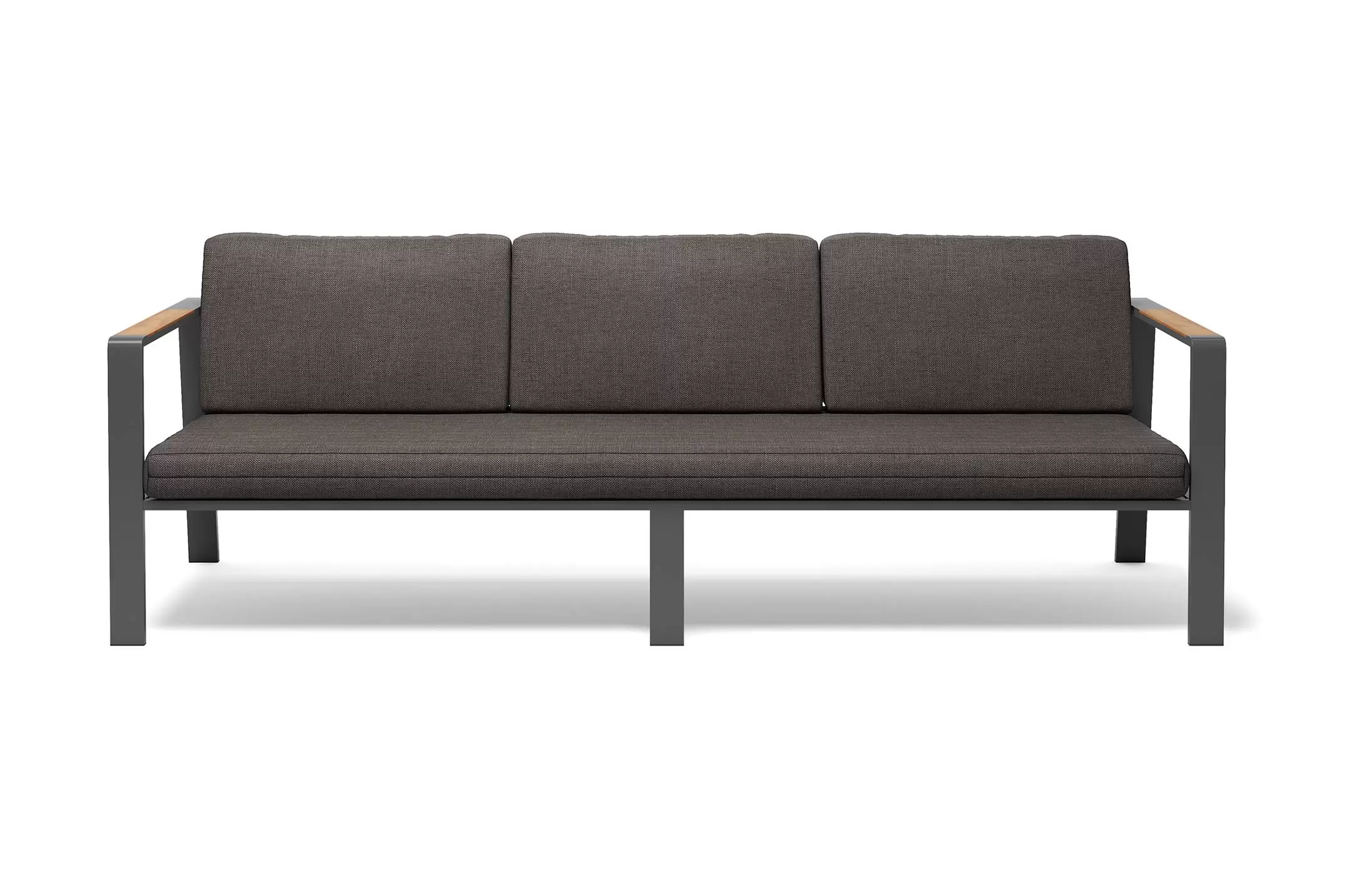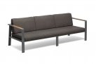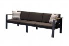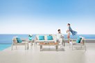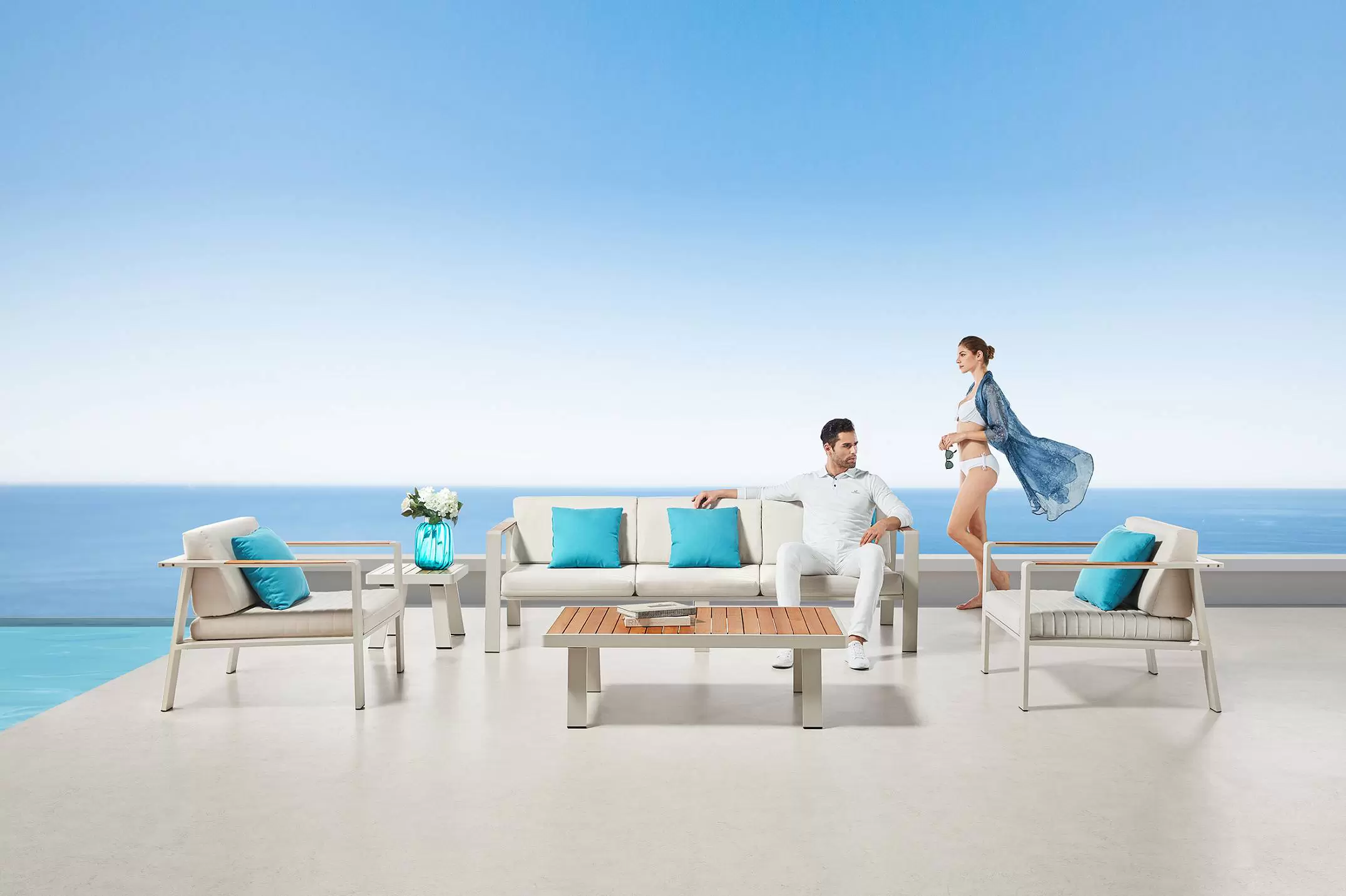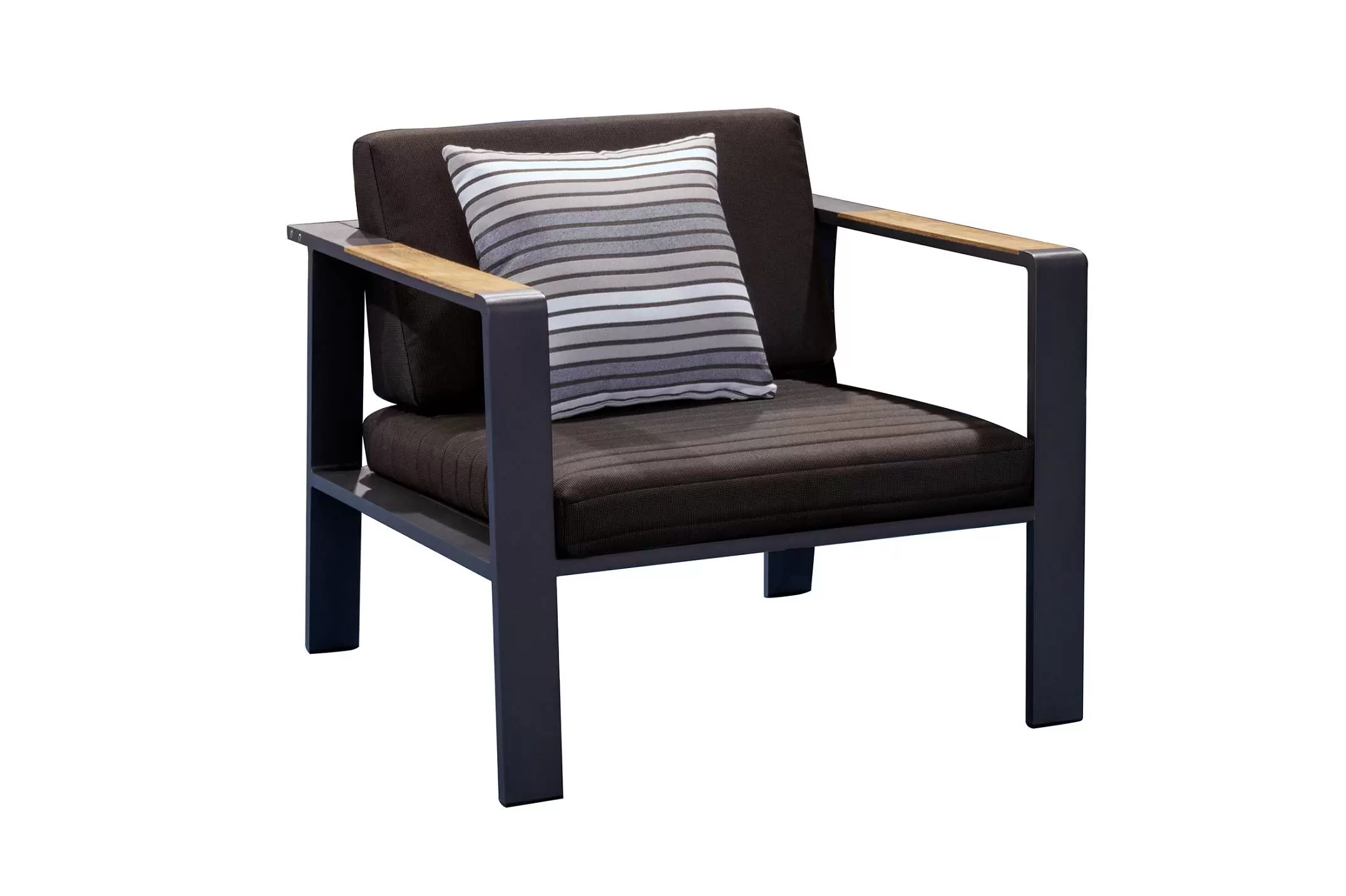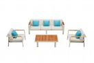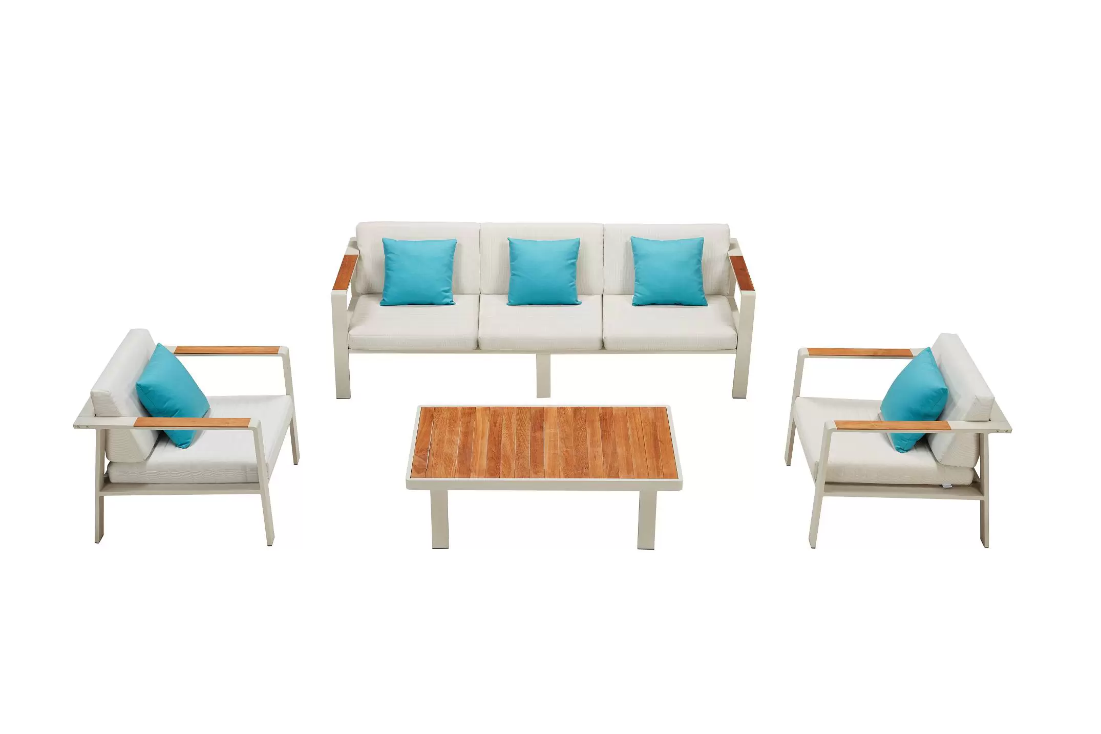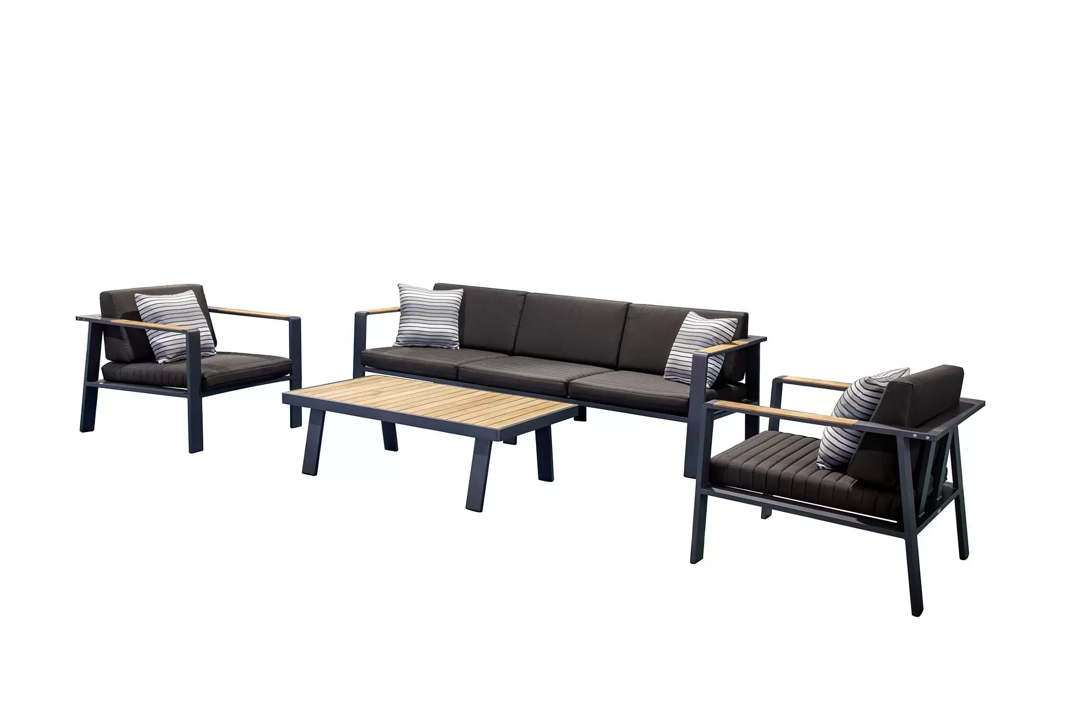 Stylowy komplet wypoczynkowy na taras firmy HIGOLD. Konstrukcja opiera się na spawanej ramie aluminiowej malowanej proszkowo, elementach dekoracyjnych z teaku i wygodnych poduszek z obiciami z materiału Olefin. Poduszki położone na opinającej ramę tekstylinie.