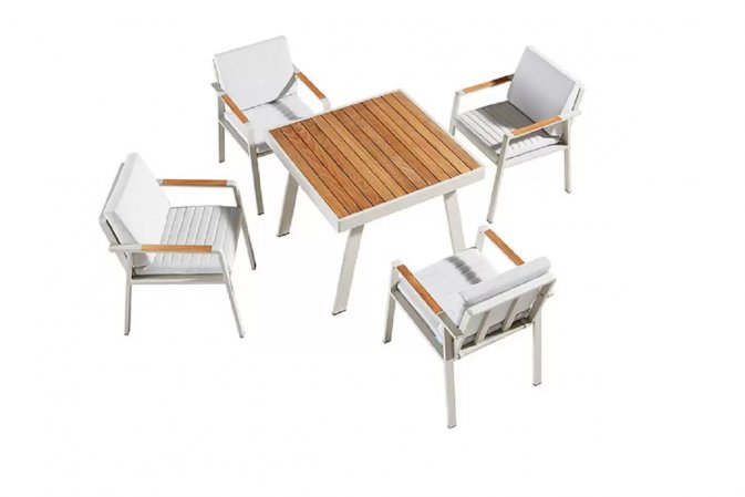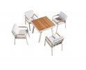 Obiadowy zestaw mebli ogrodowych z kolekcji NOFI Higold dla 4 osób. Aluminiowa konstrukcja odporna na pogodowe zawirowania i uszkodzenia mechaniczne oraz poduszki z outdoorowym poszyciem z materiału Olefin.