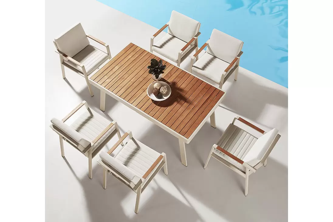Obiadowy zestaw mebli ogrodowych z kolekcji NOFI Higold dla 6 osób. Aluminiowa konstrukcja odporna na pogodowe zawirowania i uszkodzenia mechaniczne oraz poduszki z outdoorowym poszyciem z materiału Olefin.