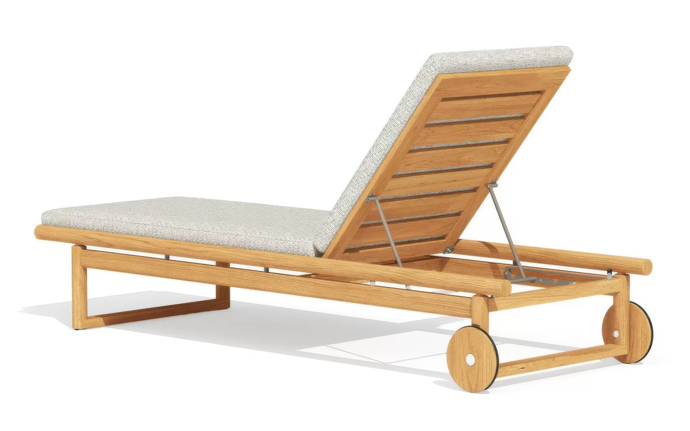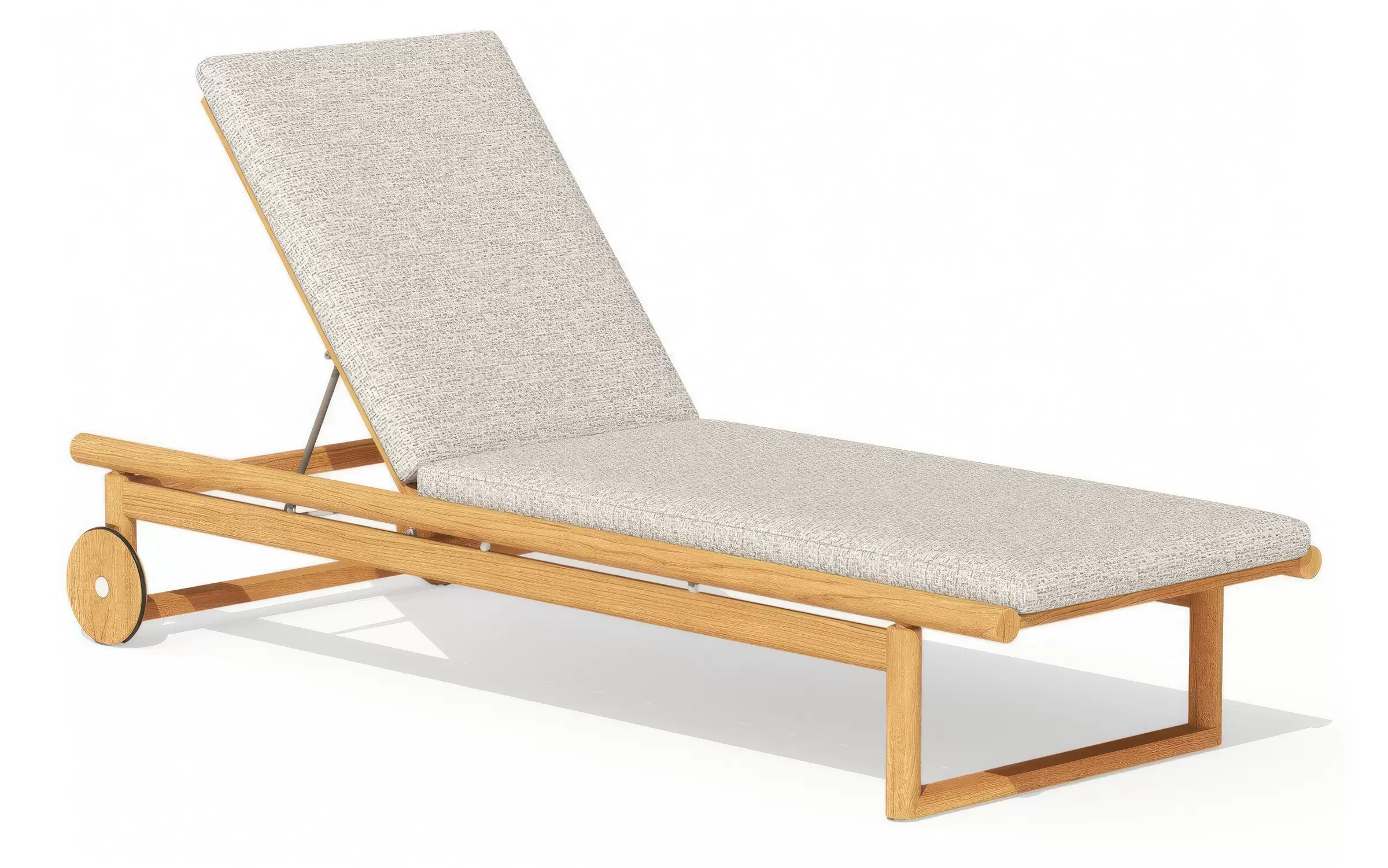Model OASIS zachowuje wszystkie funkcjonalne cechy swojej aluminiowej wersji: posiada wielostopniową regulację oparcia oraz zintegrowane kółka transportowe, które ułatwiają przemieszczanie leżaka po tarasie, ogrodzie czy przy basenie. Dopracowana sylwetka i ergonomiczny profil gwarantują wysoki komfort użytkowania, a naturalne drewno teakowe dodaje całości luksusowego, organicznego charakteru.