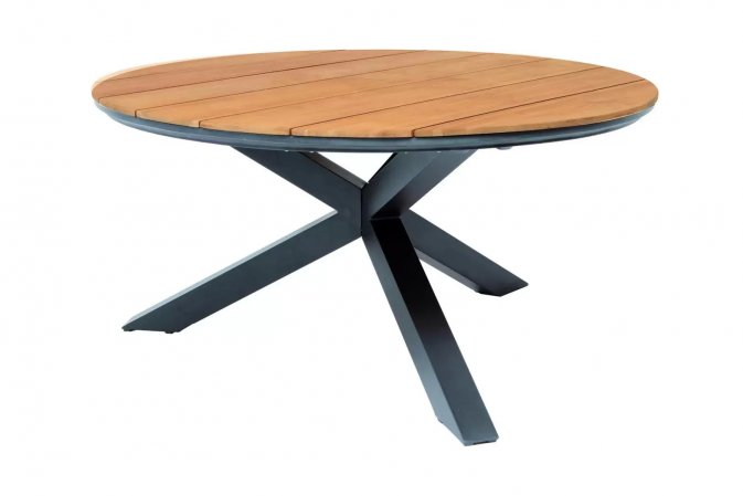 Stół ogrodowy z blatem z drewna teak o podstawie aluminiowej w kolorze ciemnoszarym.