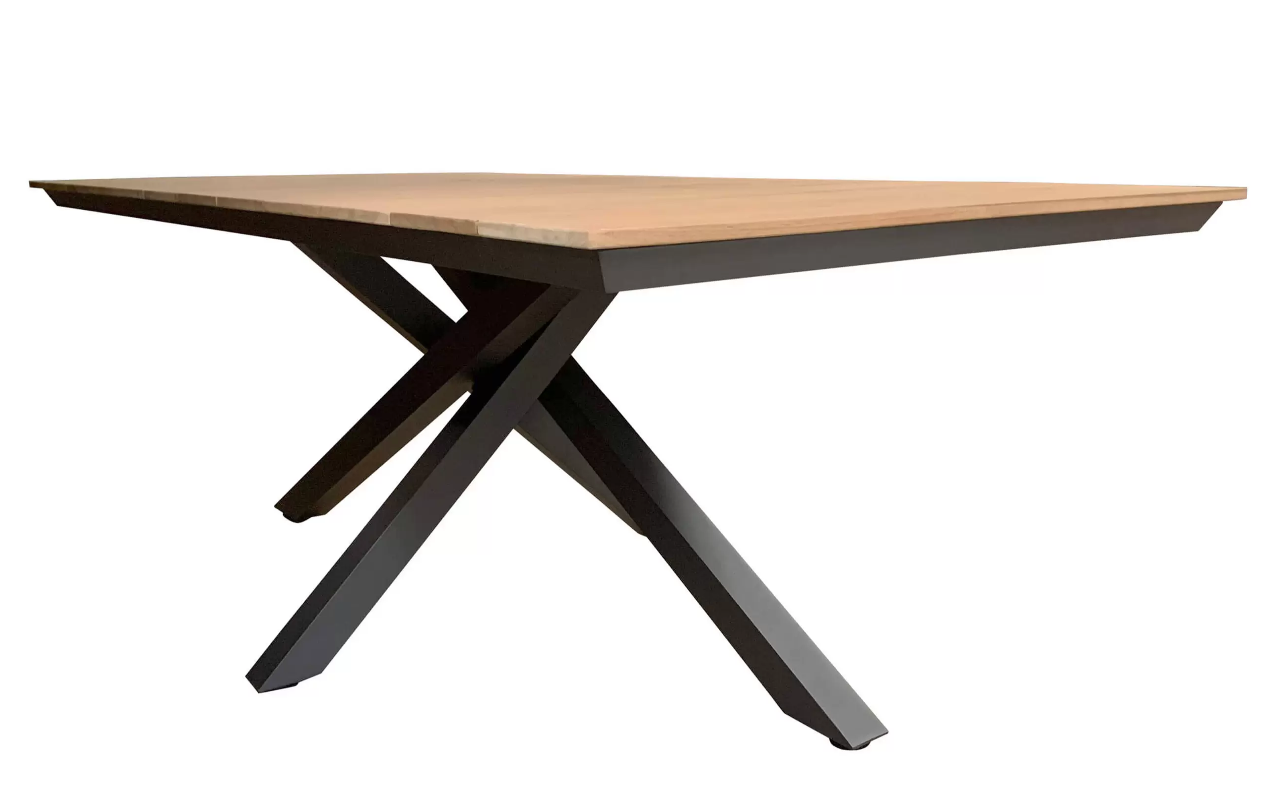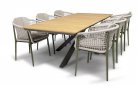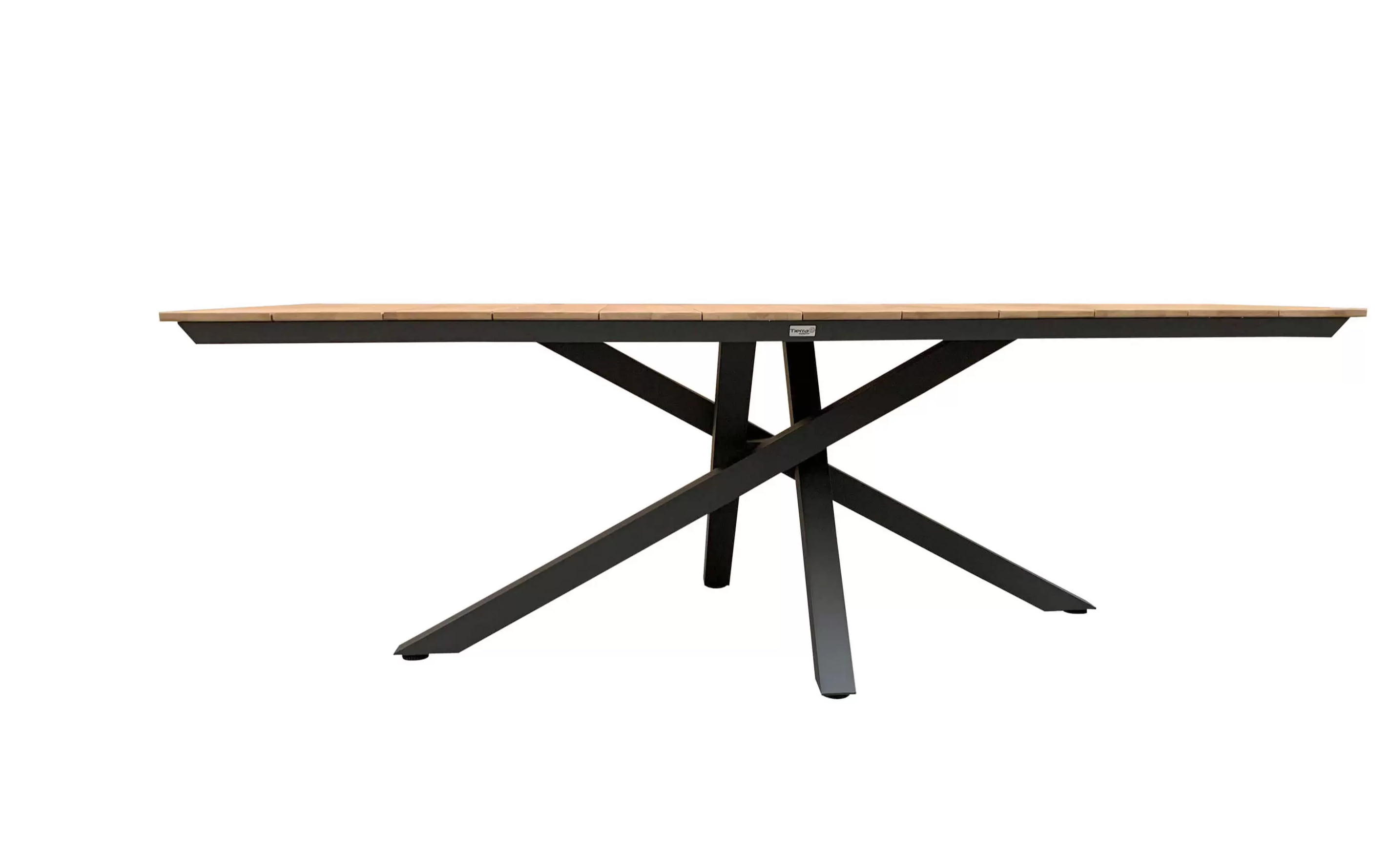 Stół ogrodowy z blatem z drewna teak o podstawie aluminiowej w kolorze ciemnoszarym.