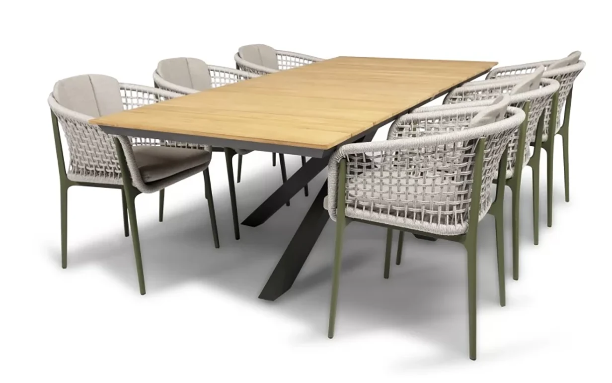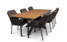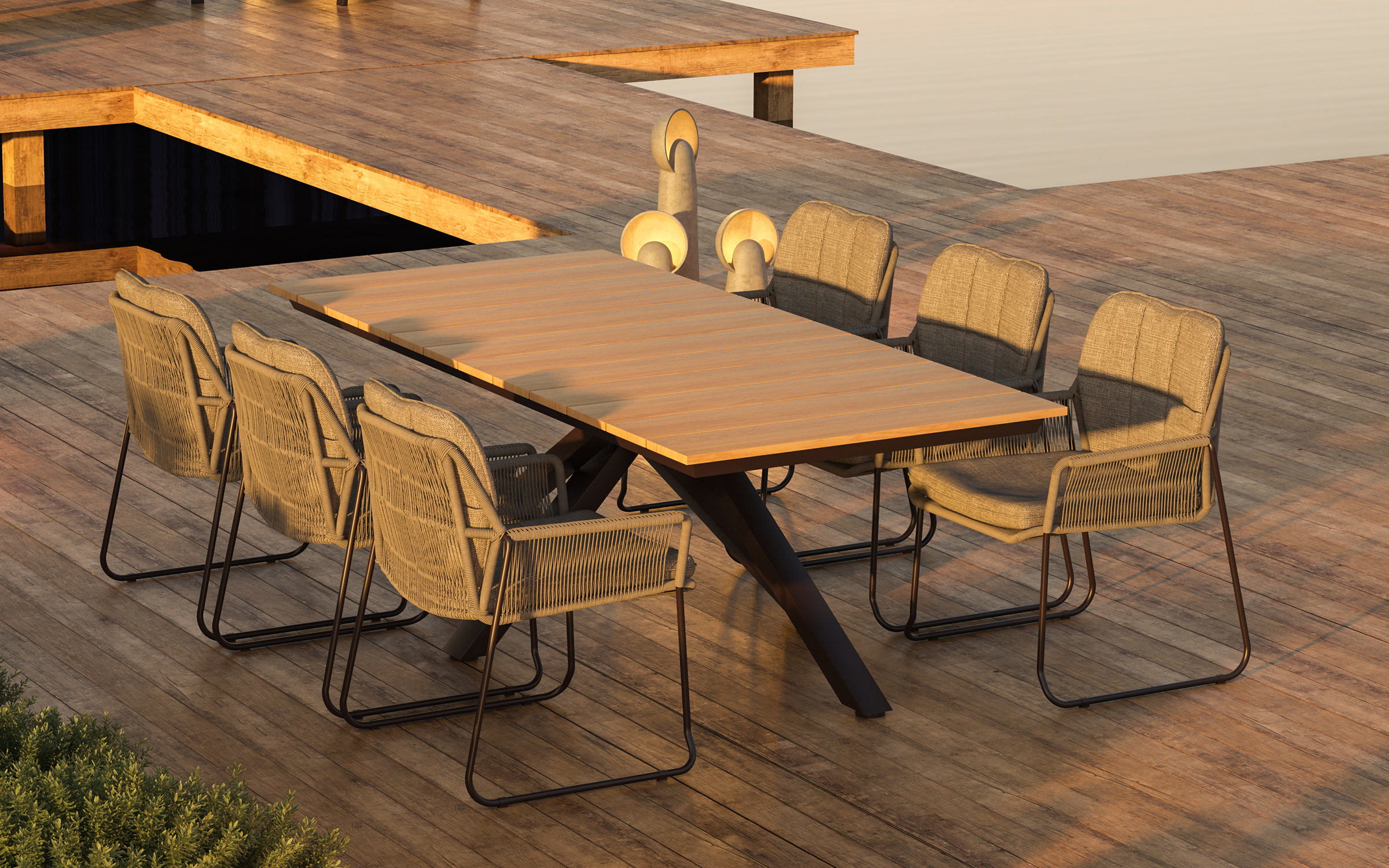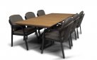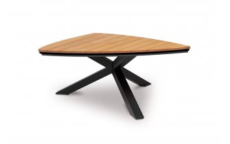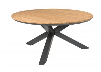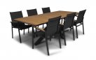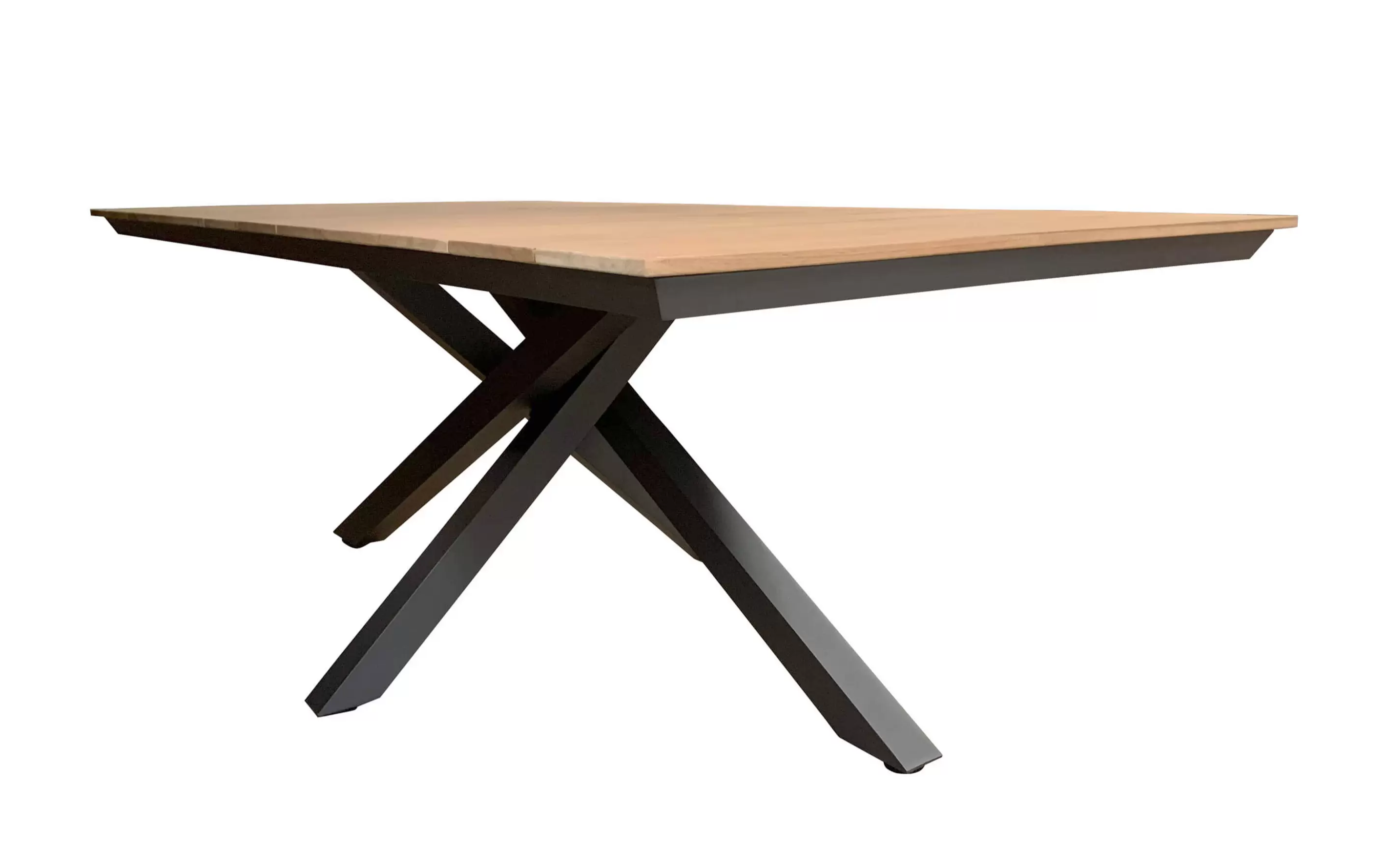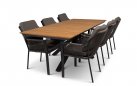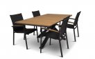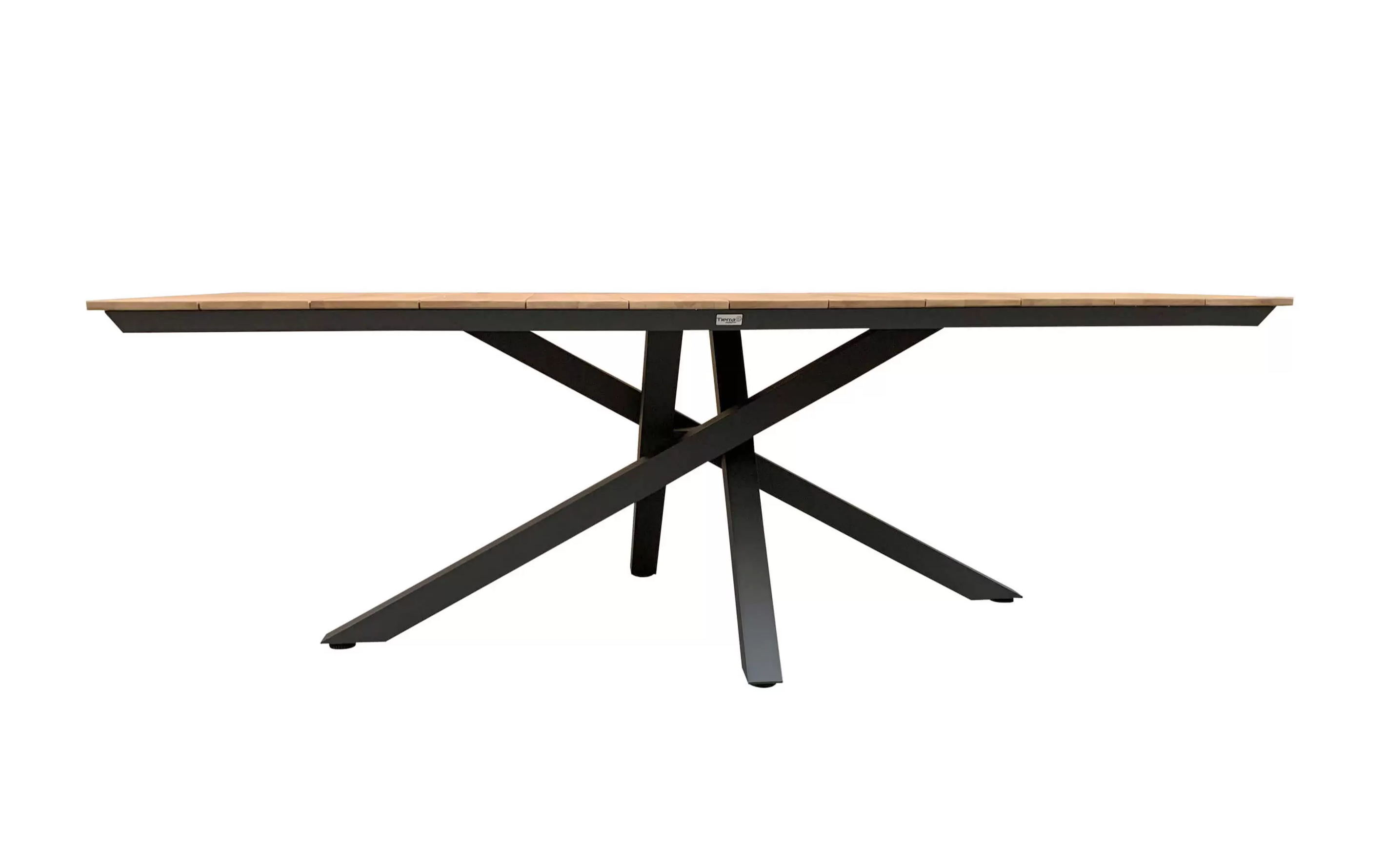 Stół ogrodowy z blatem z drewna teak o podstawie aluminiowej w kolorze ciemnoszarym.