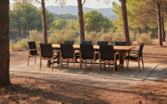 Ozon Teak 330 od Tierra Outdoor to synonim luksusu i funkcjonalności w skali XXL. Ten imponujący stół ogrodowy o długości 330 cm został stworzony z myślą o właścicielach dużych tarasów, którzy cenią sobie celebrację wspólnych chwil w szerokim gronie. Solidna, aluminiowa rama w połączeniu z blatem z wyselekcjonowanego drewna teakowego tworzy mebel, który przetrwa próbę czasu i zmienne warunki pogodowe.