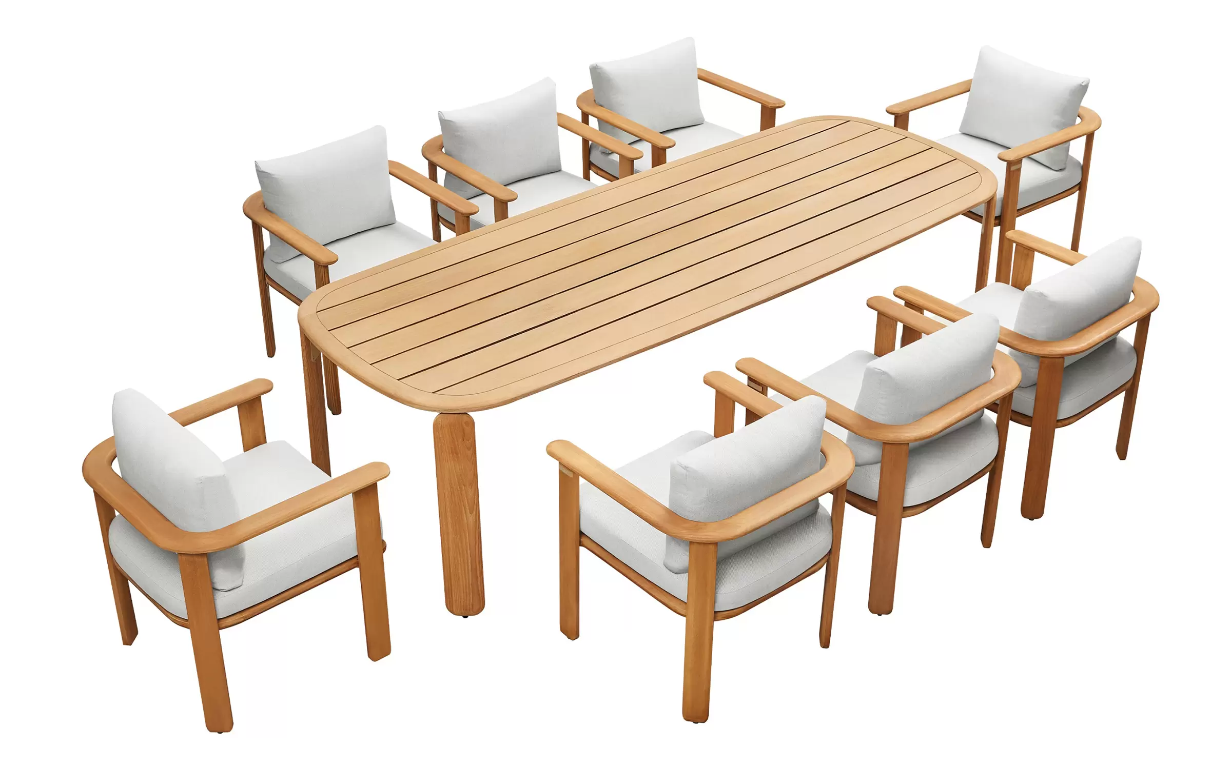 Zestaw mebli do ogrodowej jadalni Higold Pallisad składa się z dużego stołu i 8 wygodnych krzeseł. Rama mebla wykonana jest z wysokiej jakości drewna tekowego FSC, charakteryzującego się pięknym wyglądem. Siedziska elementów z tej kolekcji są szczególnie grube i wygodne. Wszystkie poduszki siedziska i oparcia wyposażone są w poszewki wykonane z wysokiej jakości materiału akrylowego, wytrzymałego i przyjemnego w dotyku.