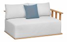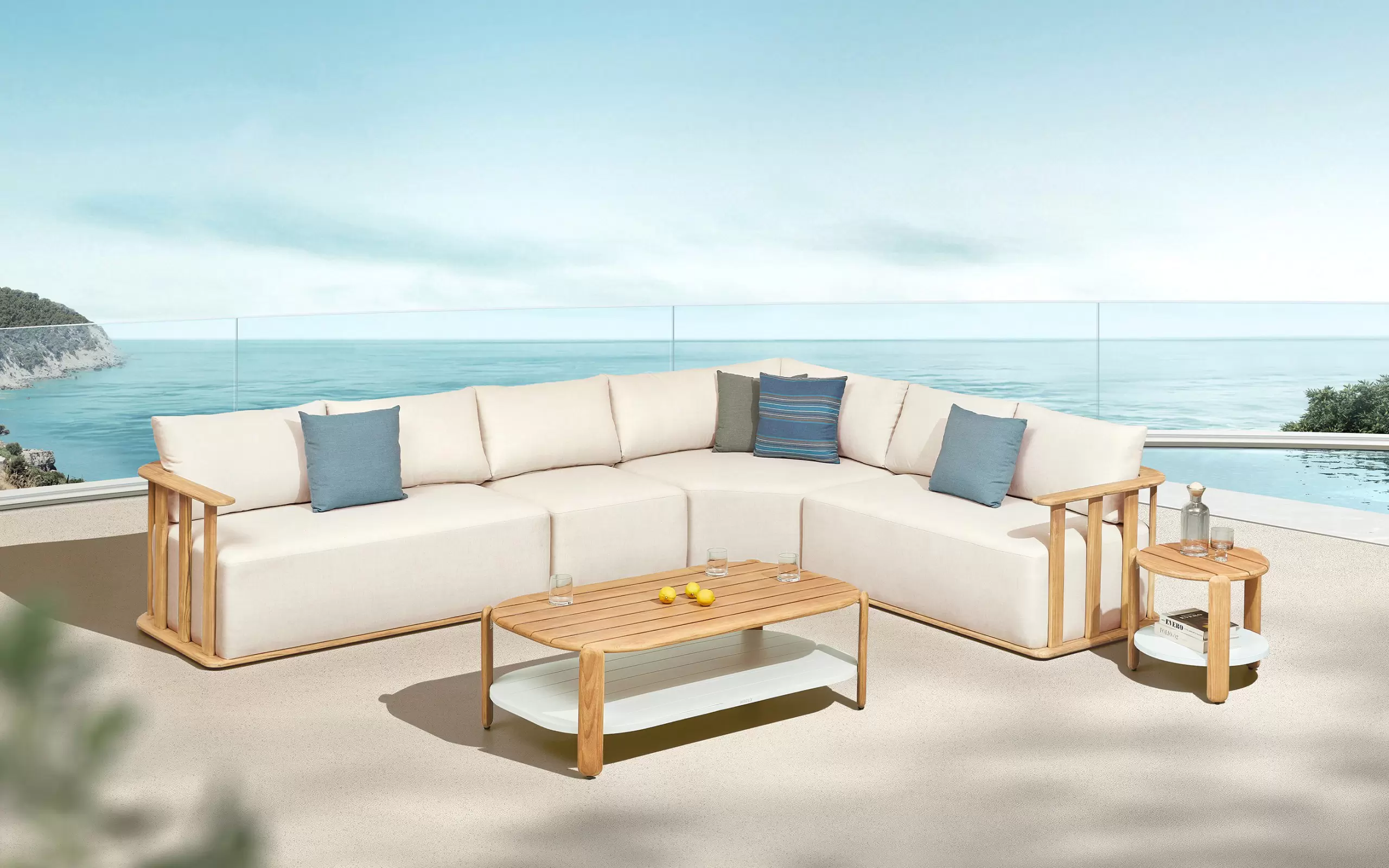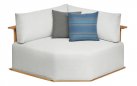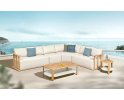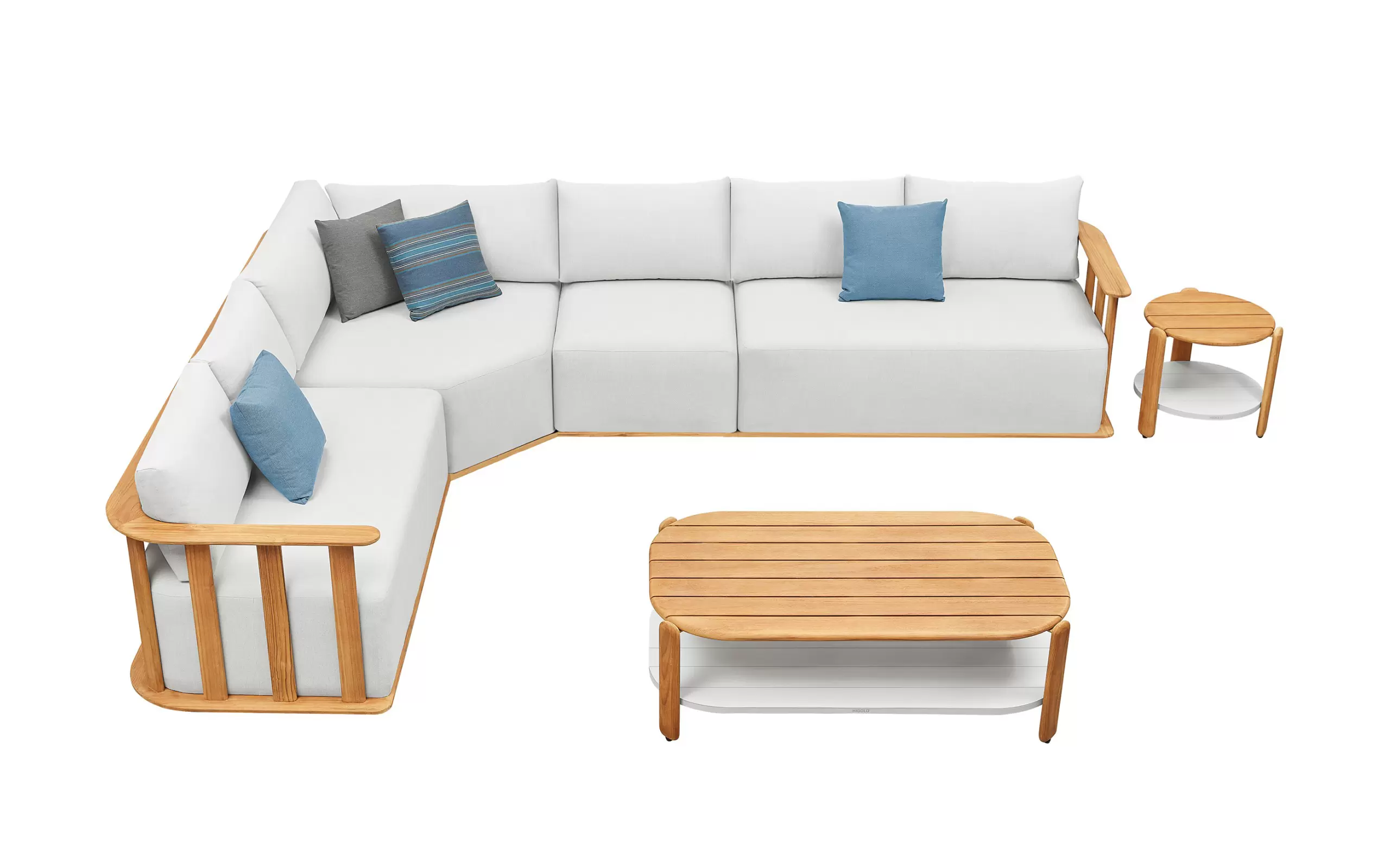 Zestaw mebli Higold Pallisad obejmuje modułowy narożnik dla 6 osób, stolik boczny i stolik kawowy. Narożnik może być w wersji z dłuższym lewym lub prawym ramieniem. Konstrukcja mebli wykonana jest z wysokiej jakości drewna tekowego FSC. Siedzisko składa się z konstrukcji sprężynowej i warstwy pianki szybkoschnącej o grubości 100 mm. Wszystkie poduszki siedziska i oparcia posiadają obicia wykonane z odpornej tkaniny akrylowej Olefin. Stoliki kawowe posiadają podwójny blat – drewniany blat tekowy oraz dolny z białej płyty aluminiowej.