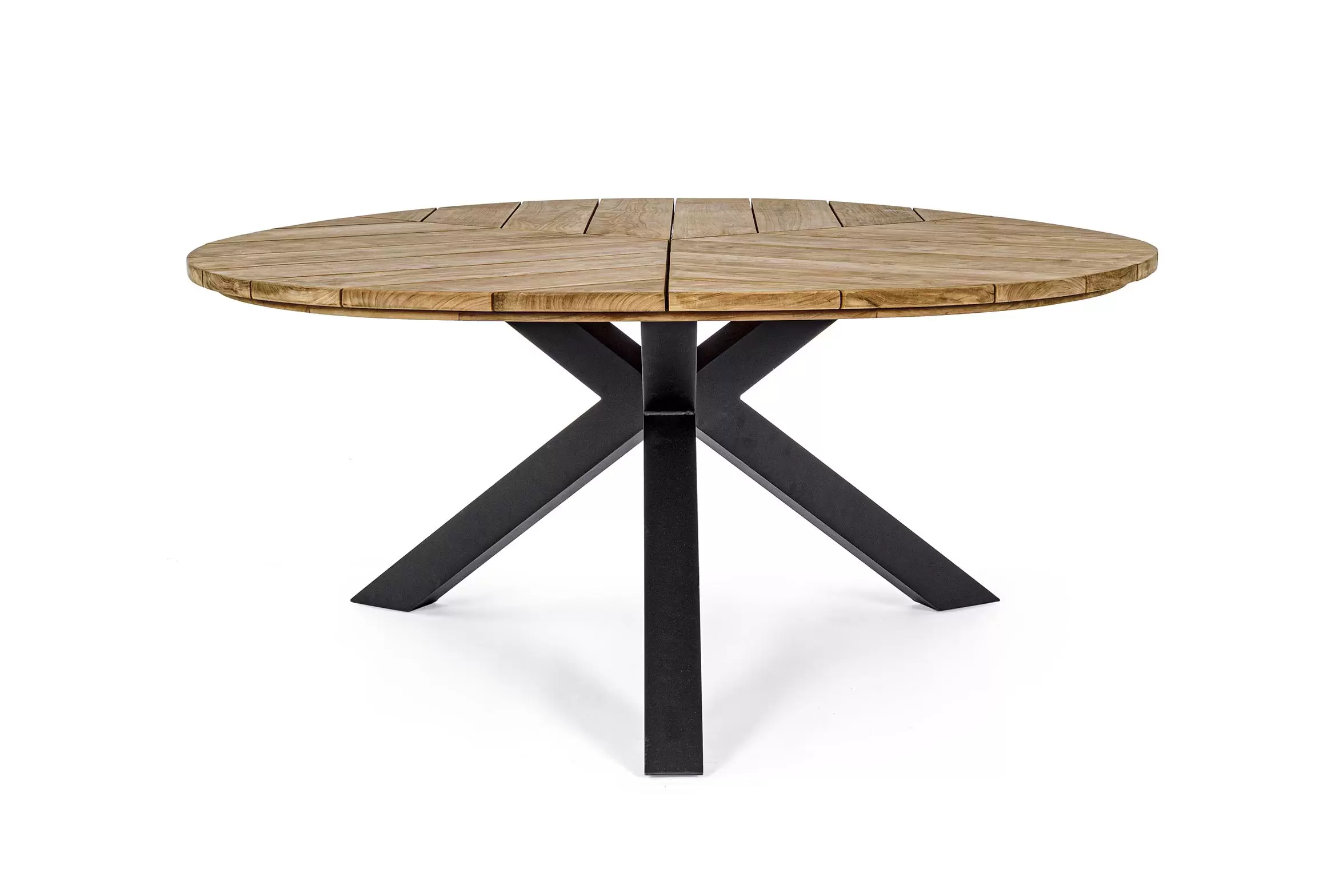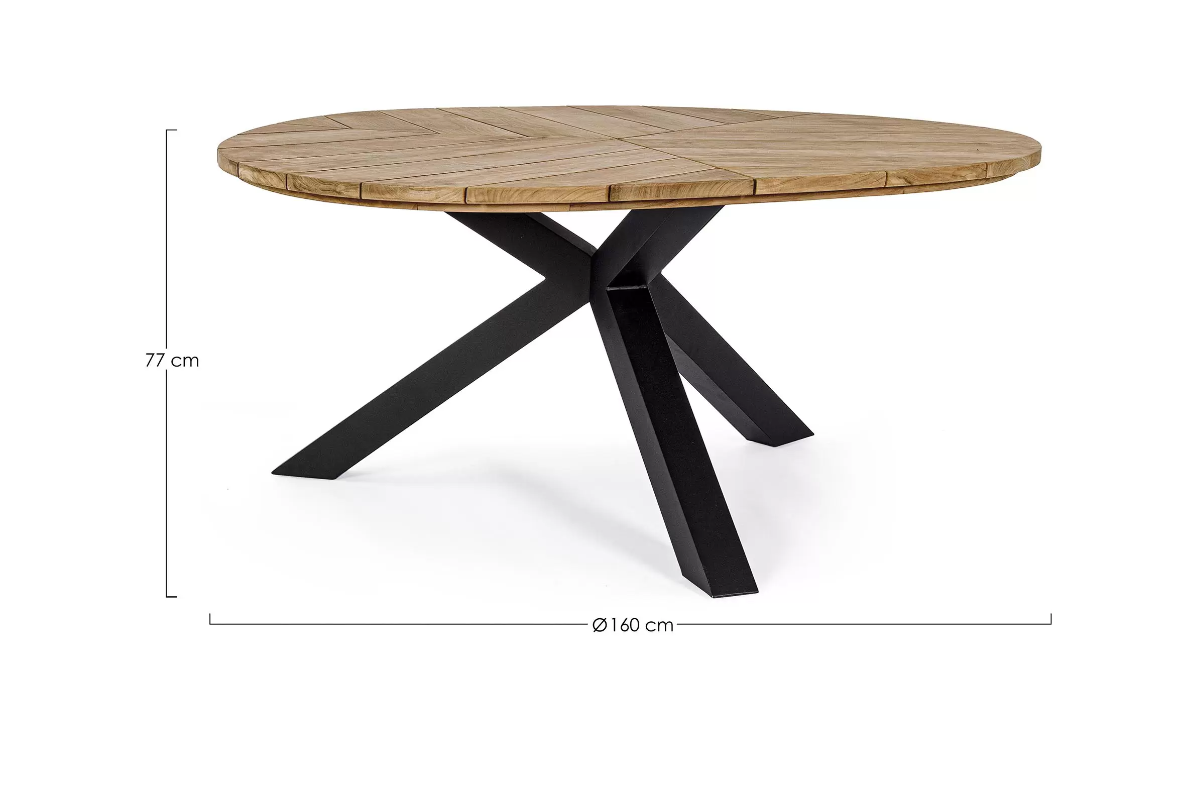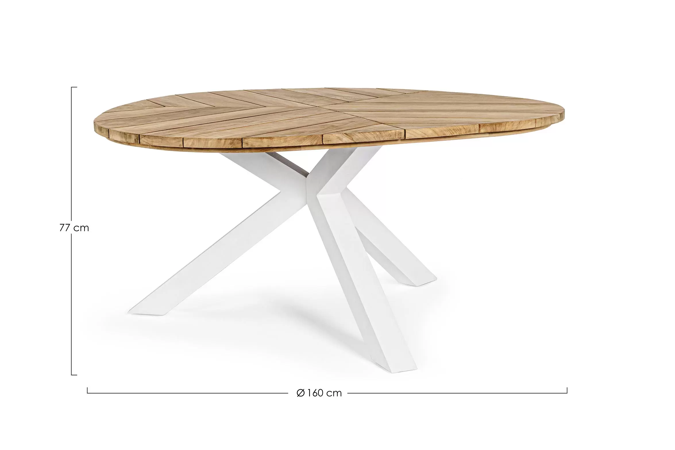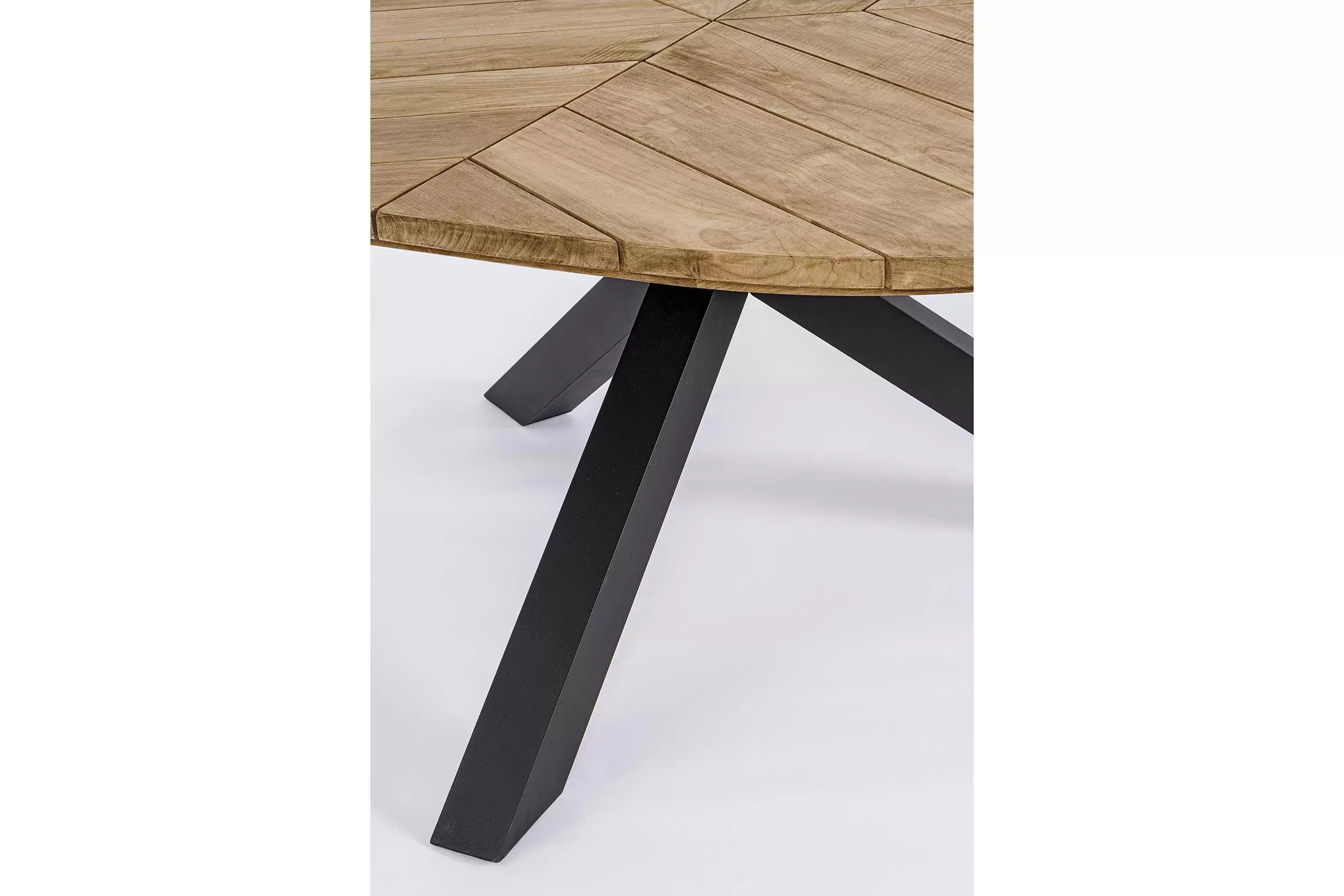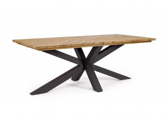 Aluminiowa konstrukcja krzyżowych nóg malowana proszkowo na kolor biały lub czarny. Blat stołu z teku - svlk (prawne drewno indonezyjskie), z rustykalnym wykończeniem.