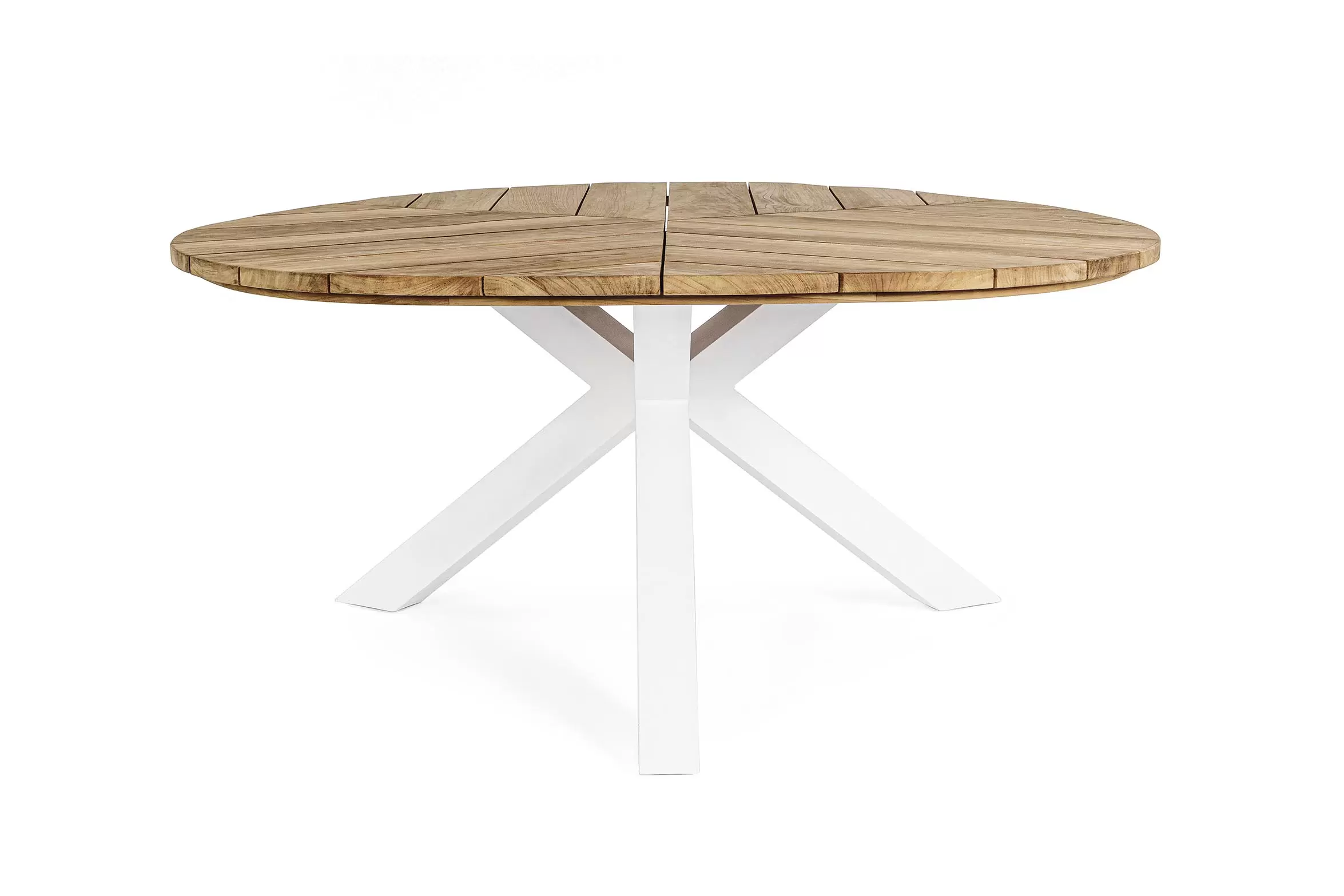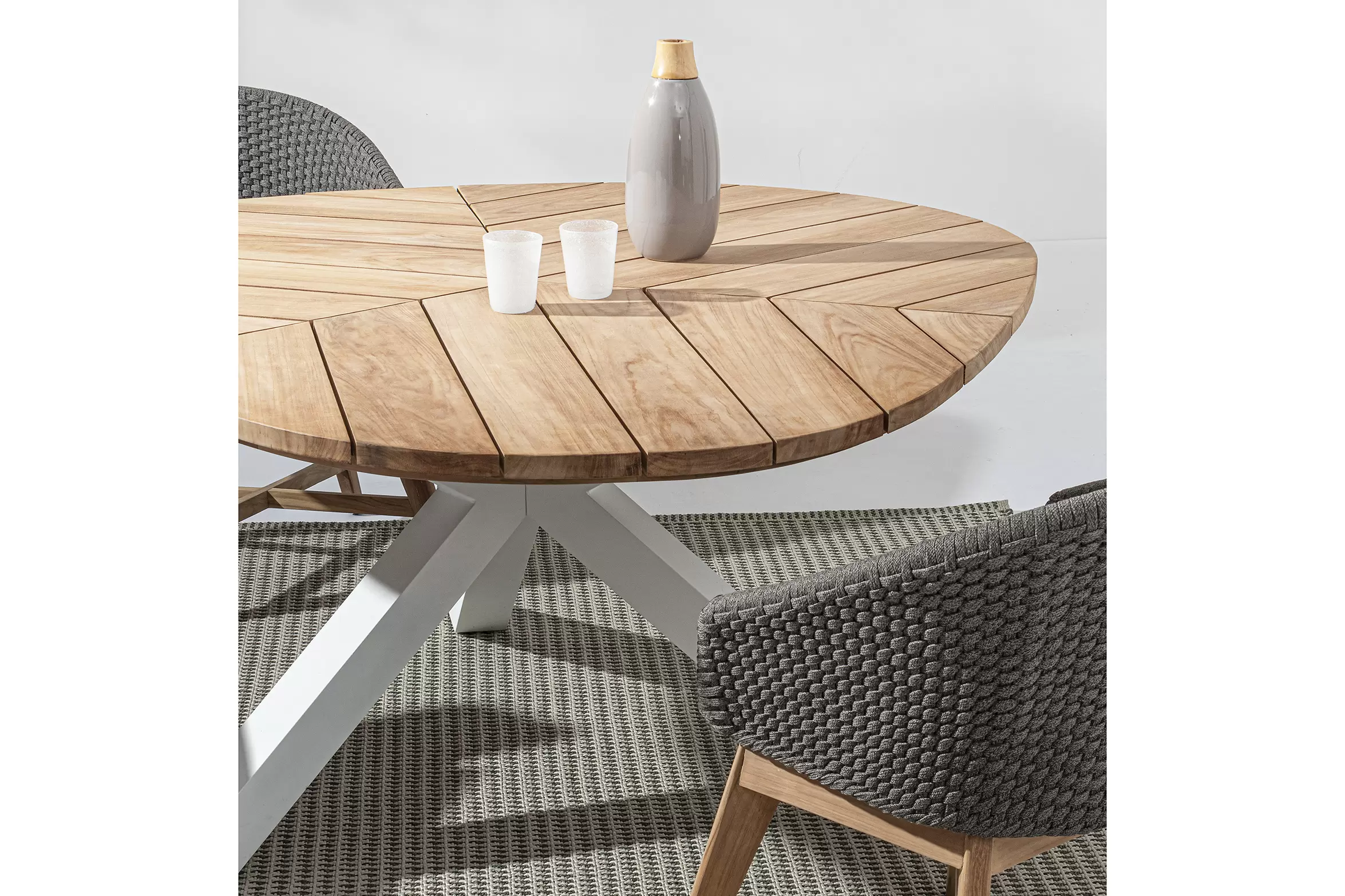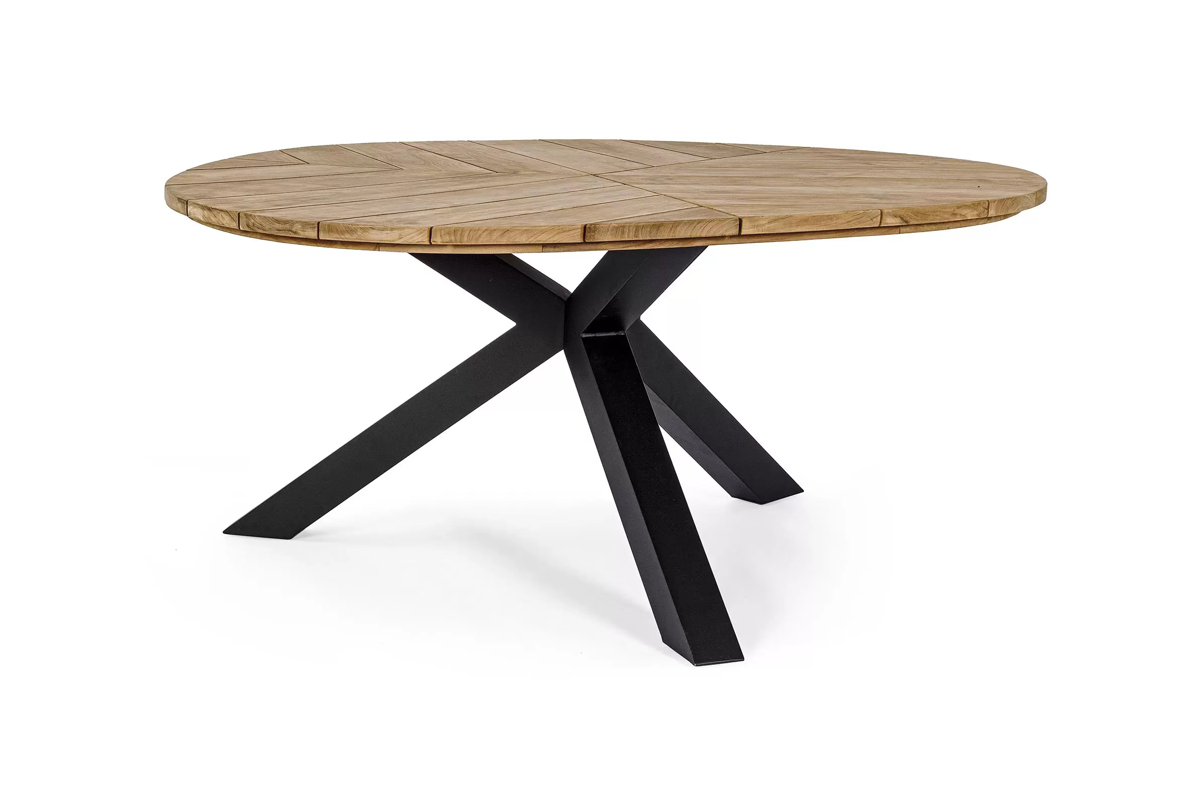 Aluminiowa konstrukcja krzyżowych nóg malowana proszkowo na kolor biały lub czarny. Blat stołu z teku - svlk (prawne drewno indonezyjskie), z rustykalnym wykończeniem.