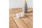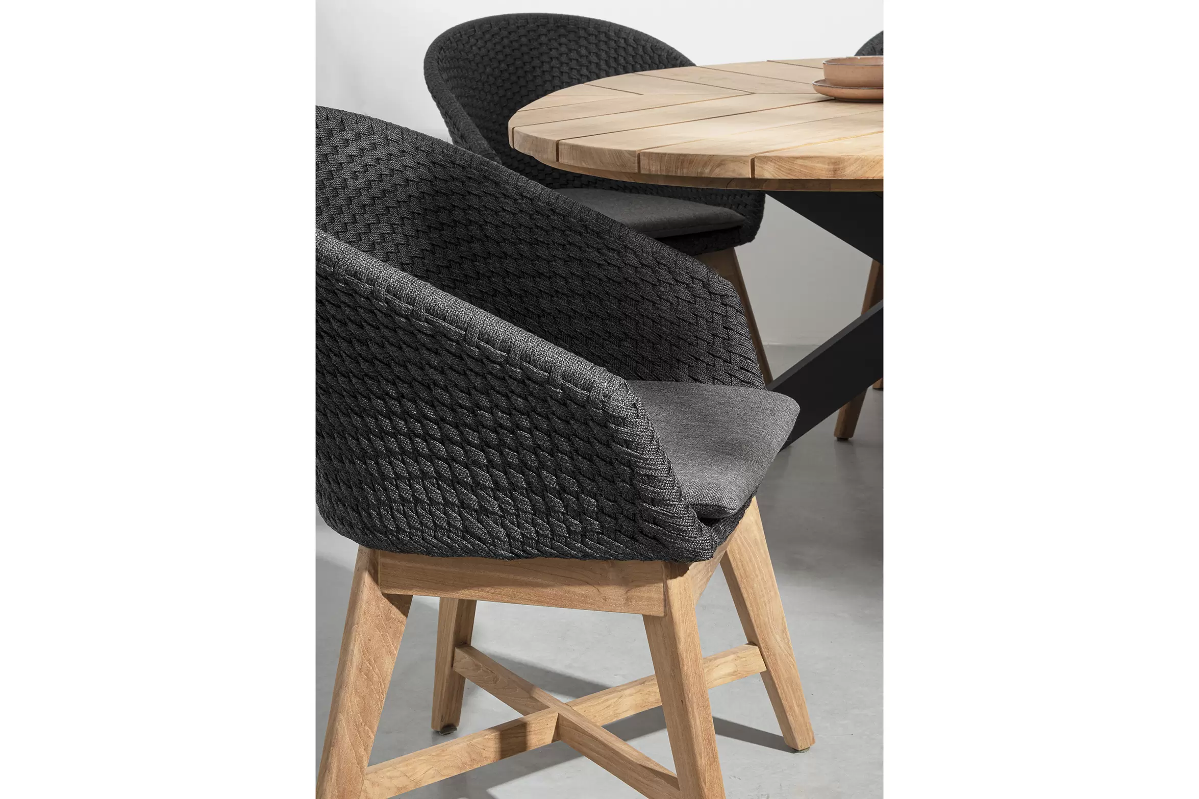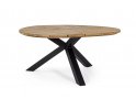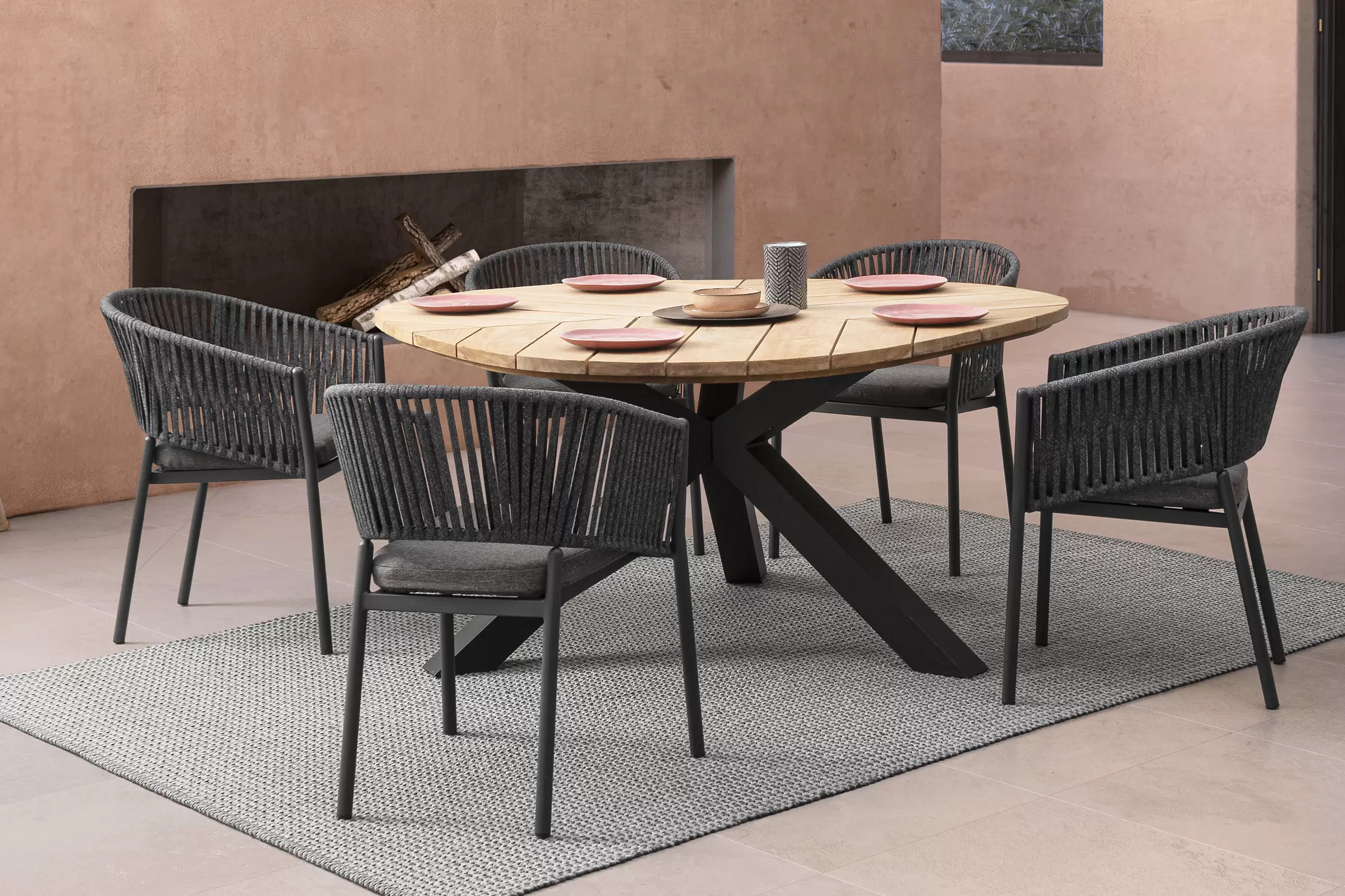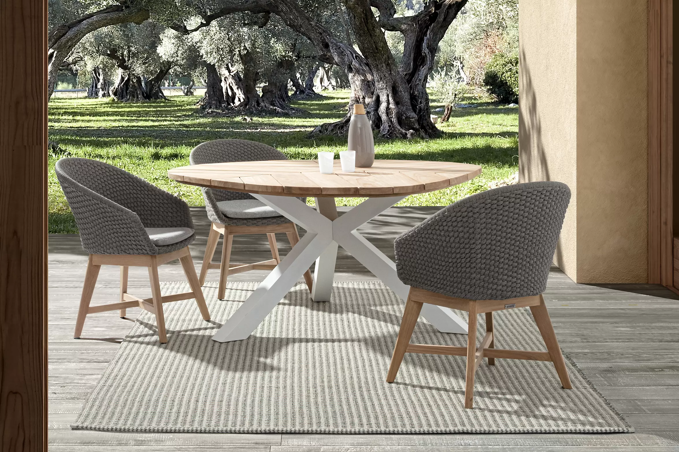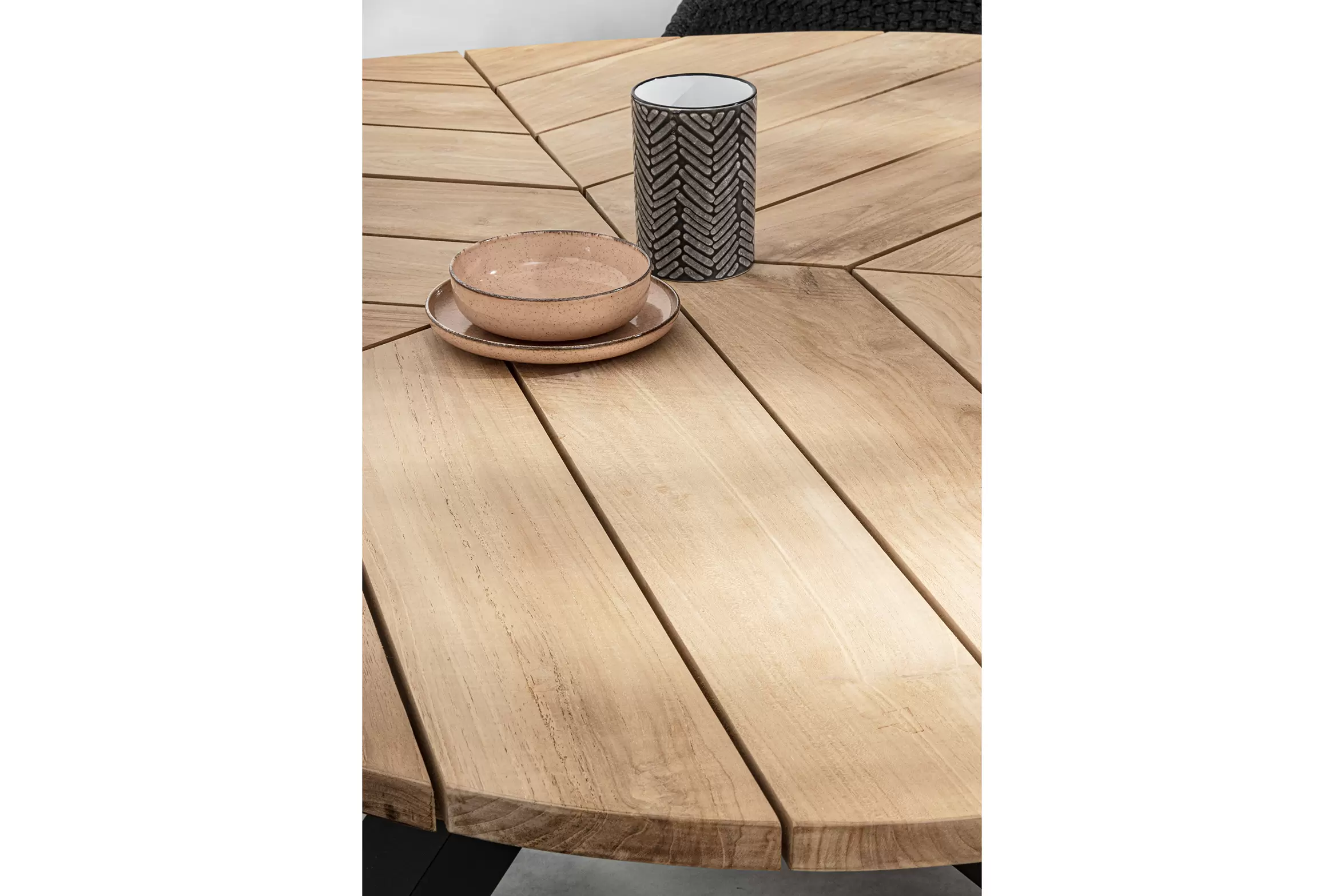 Aluminiowa konstrukcja krzyżowych nóg malowana proszkowo na kolor biały lub czarny. Blat stołu z teku - svlk (prawne drewno indonezyjskie), z rustykalnym wykończeniem.