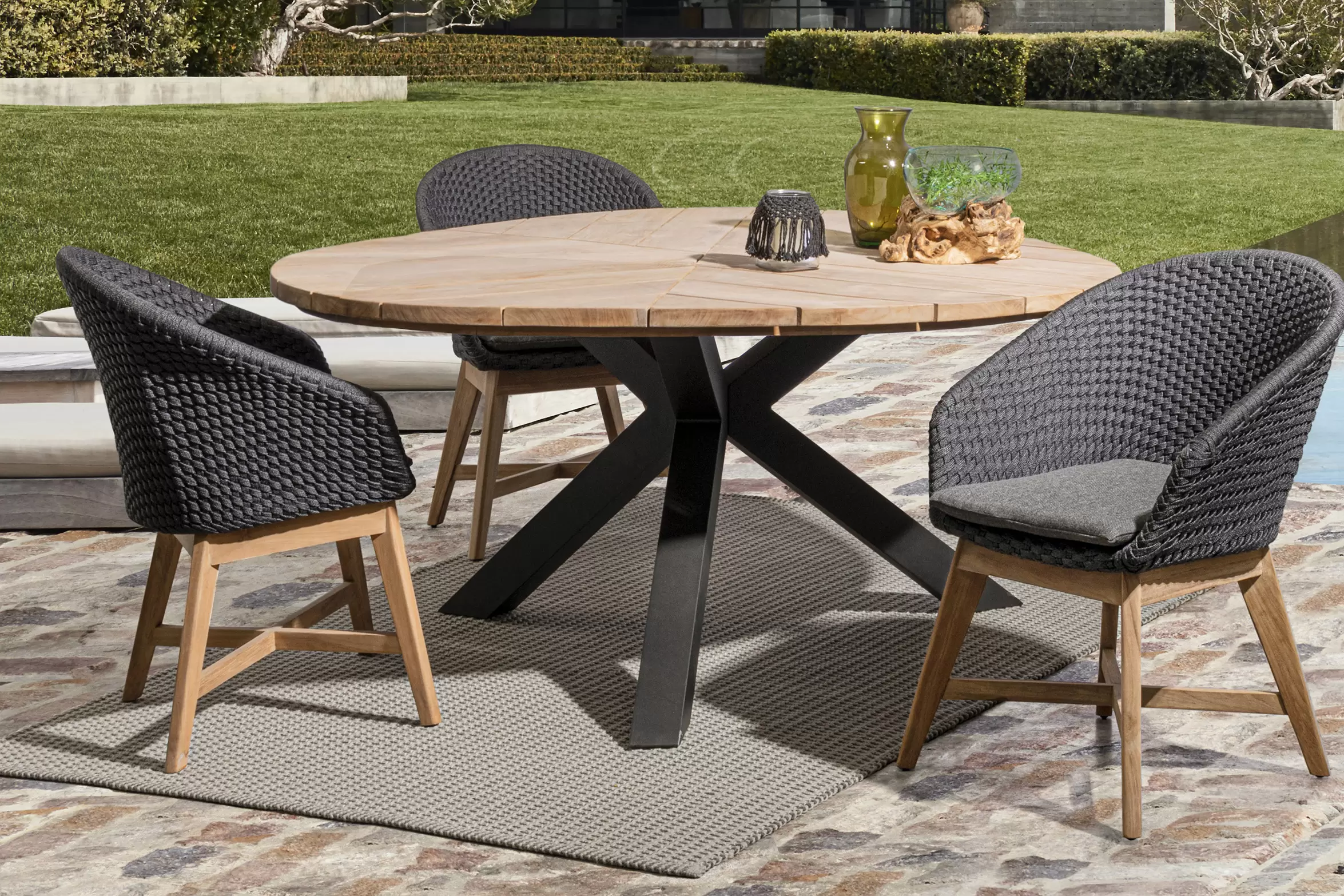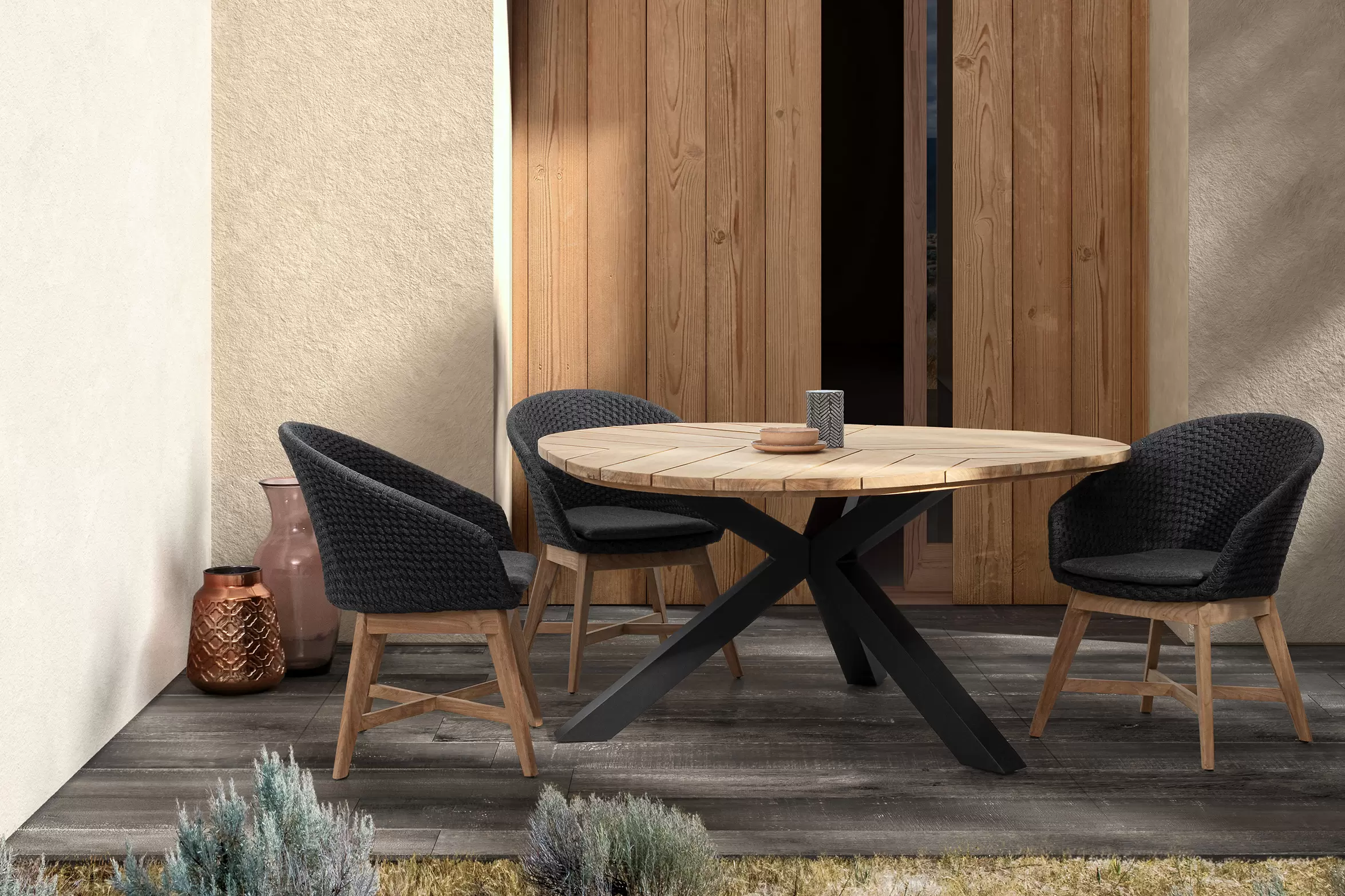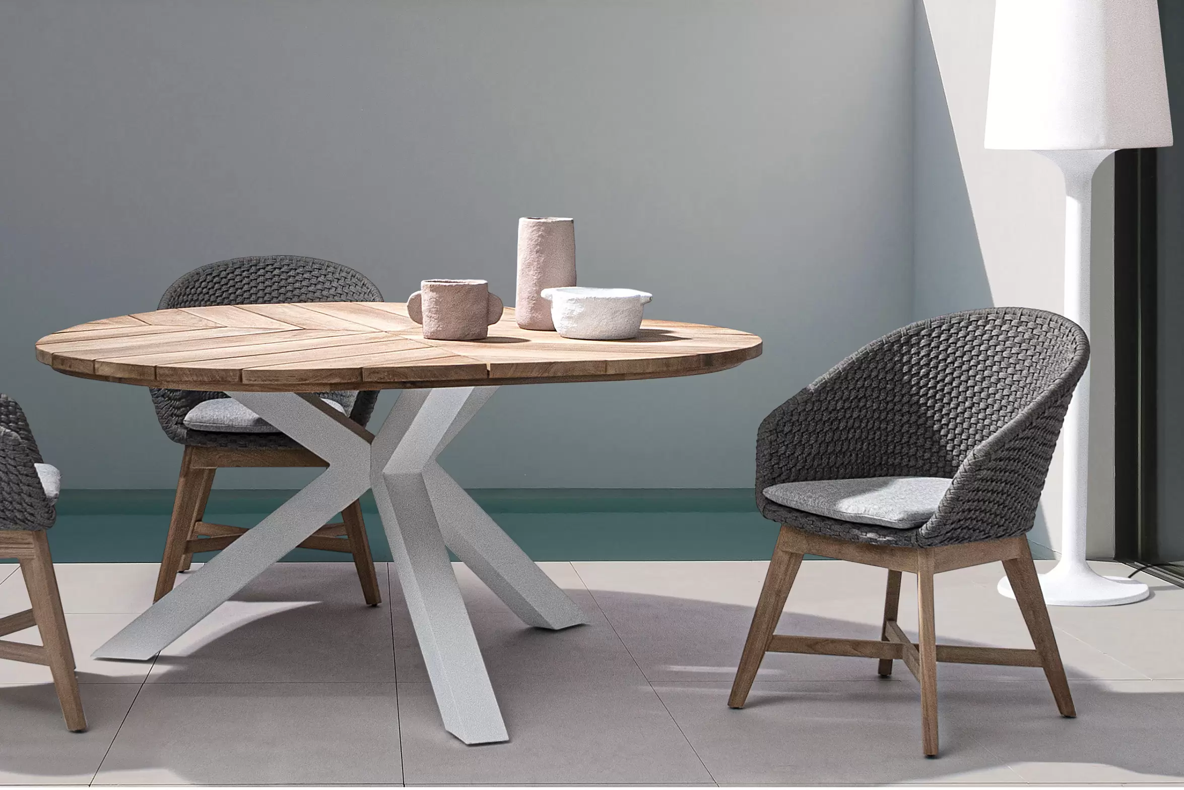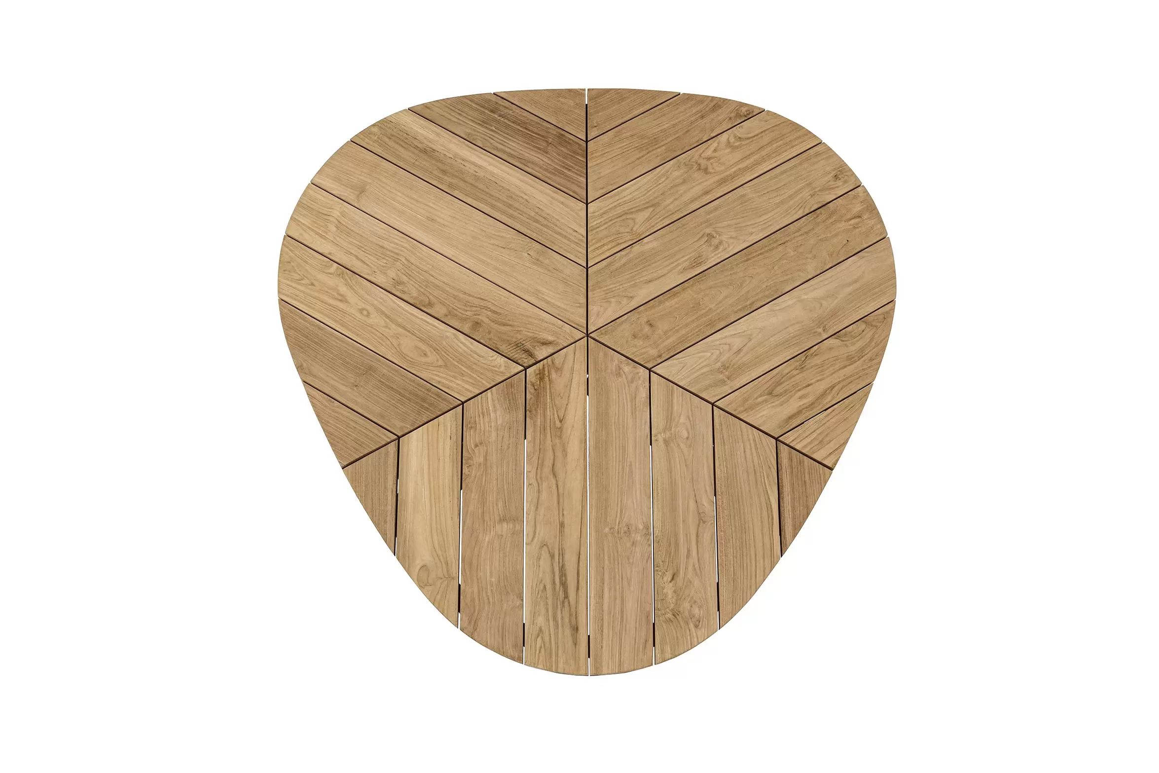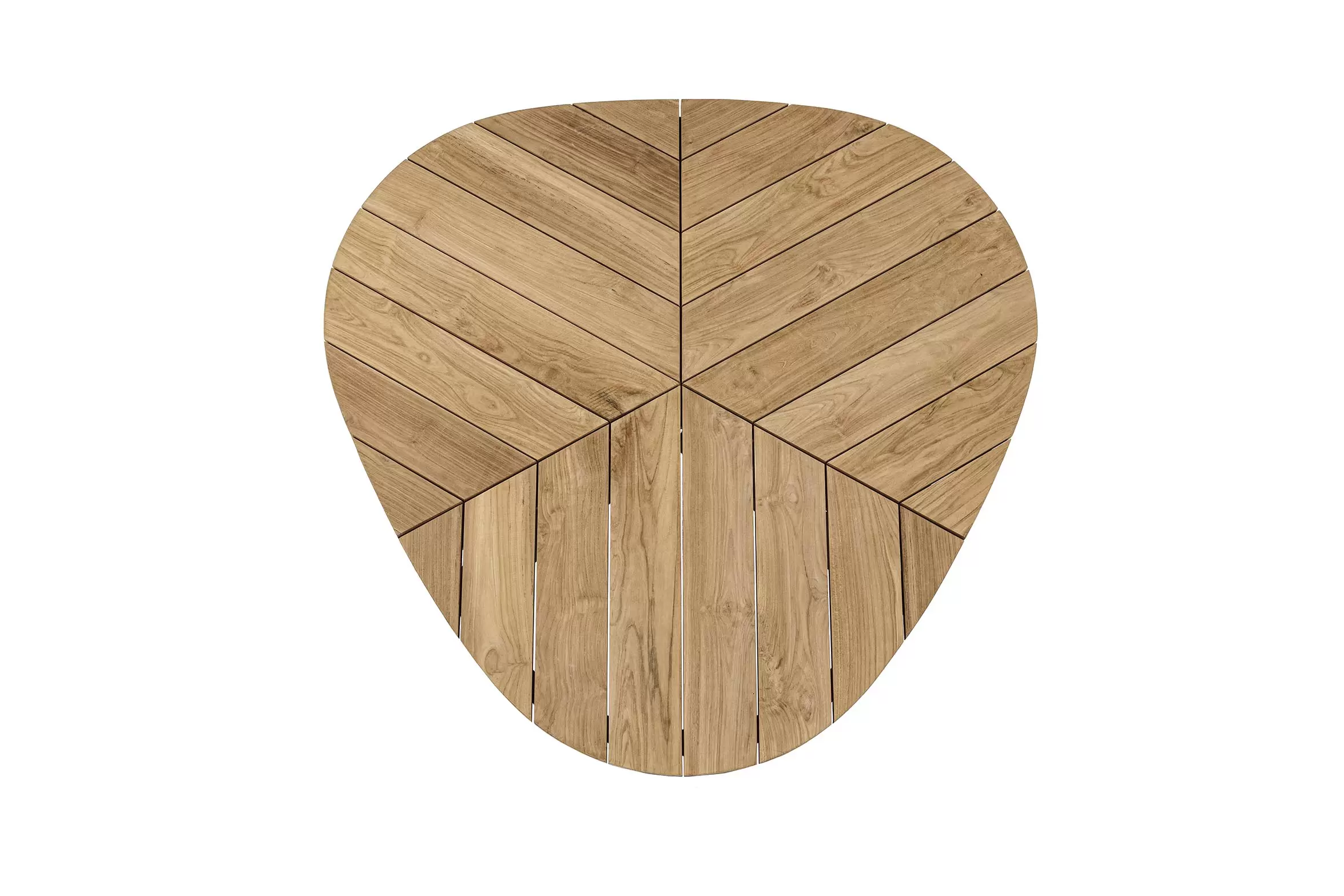 Ekskluzywny stół z krzyżowymi nogami aluminiowymi i grubym blatem z drewna teak w kształcie trójkąta z zaokrąglonymi kątami.