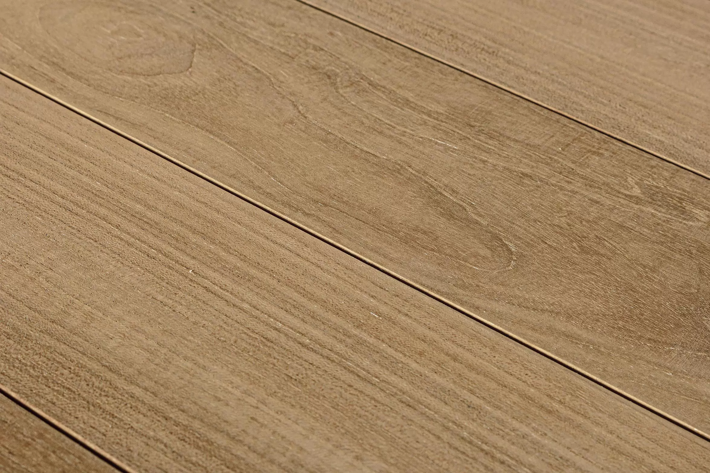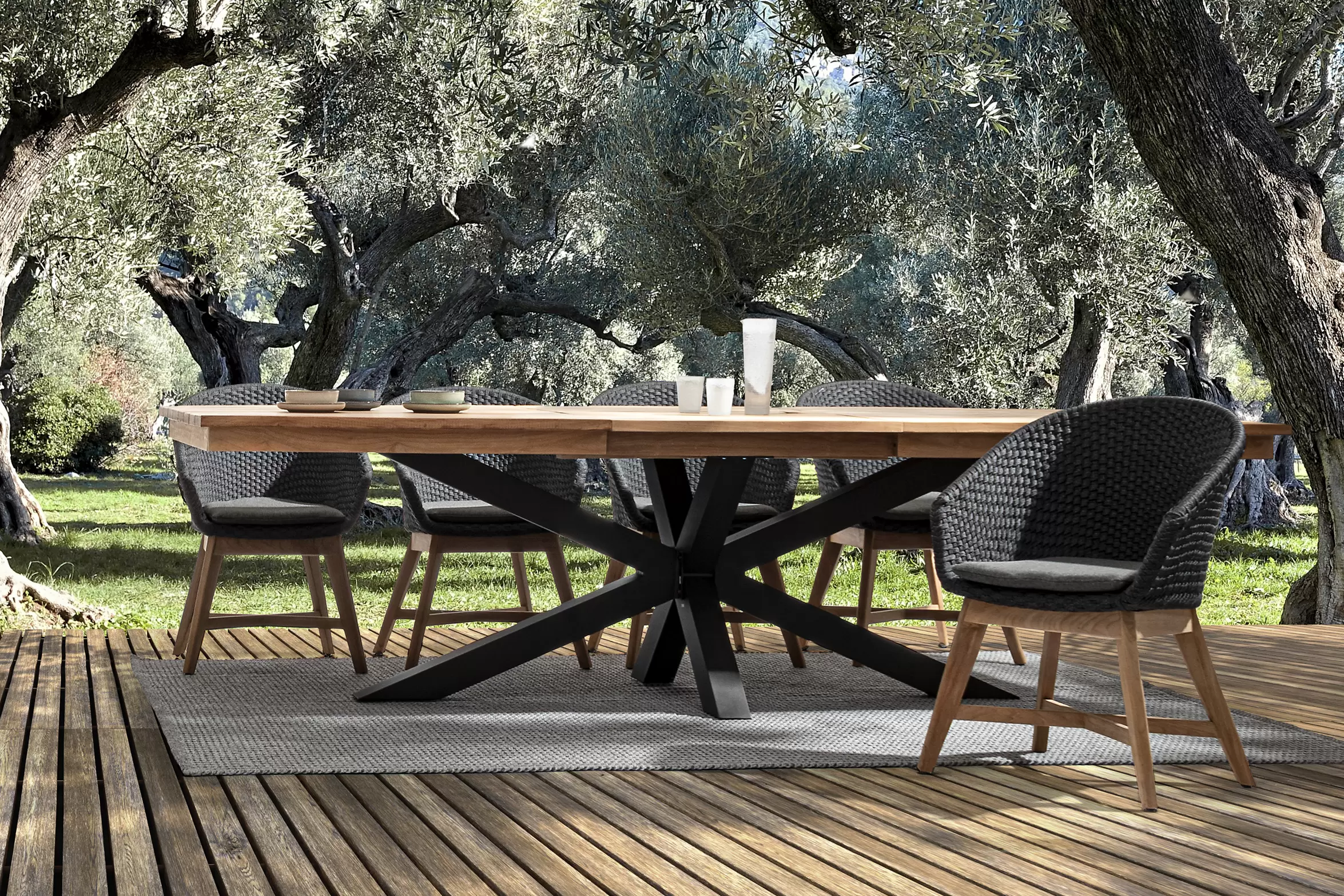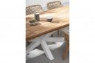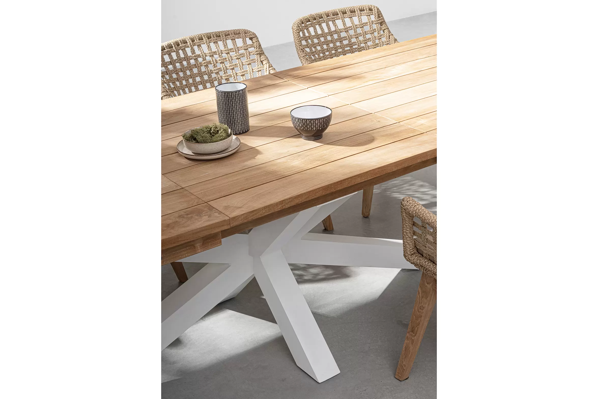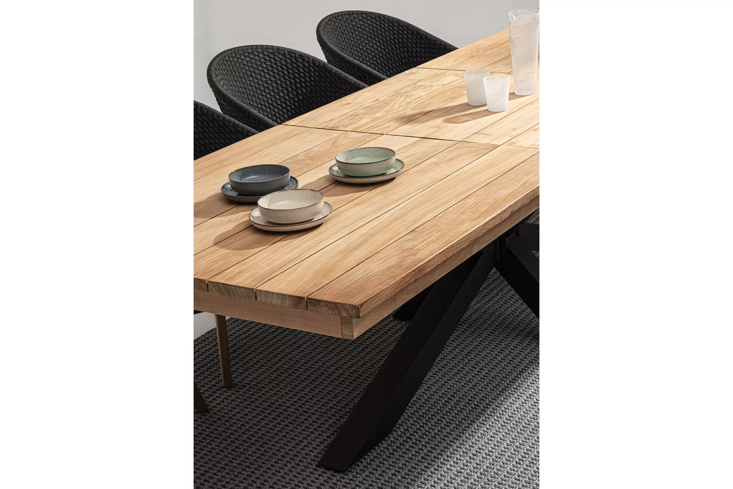 Duży stół na taras z krzyżowymi nogami aluminiowymi oraz blatem z drewna teak premium.