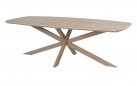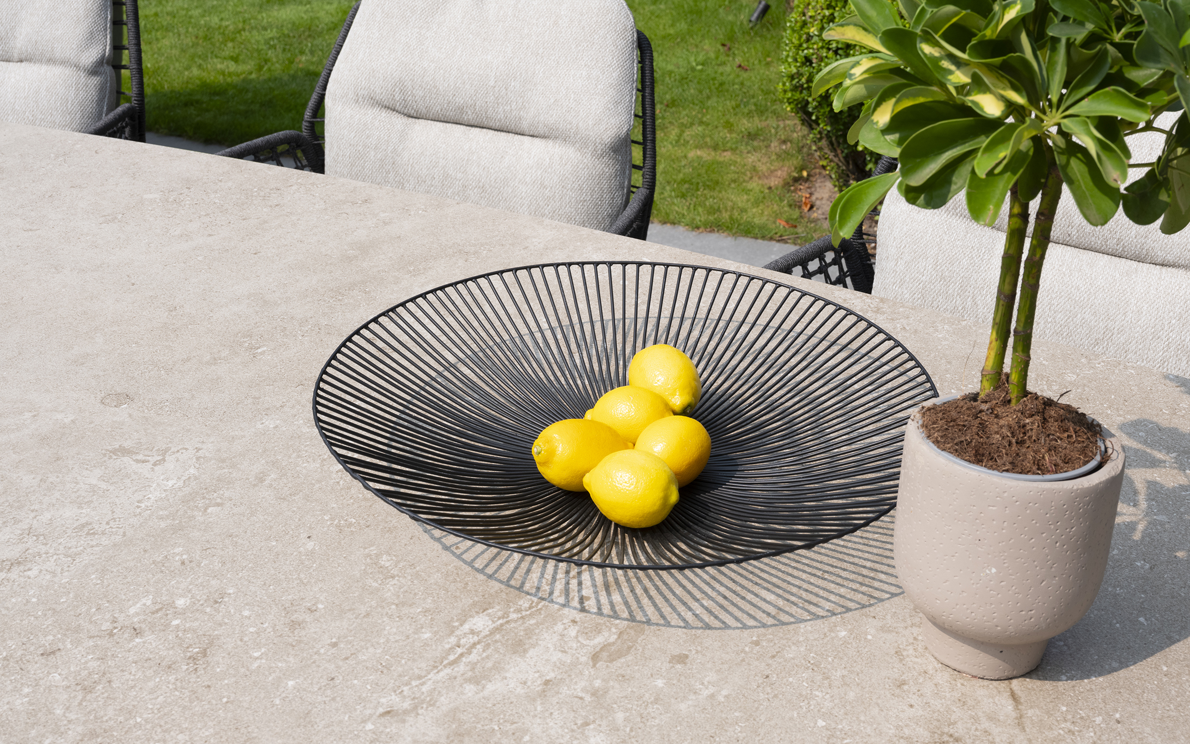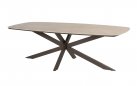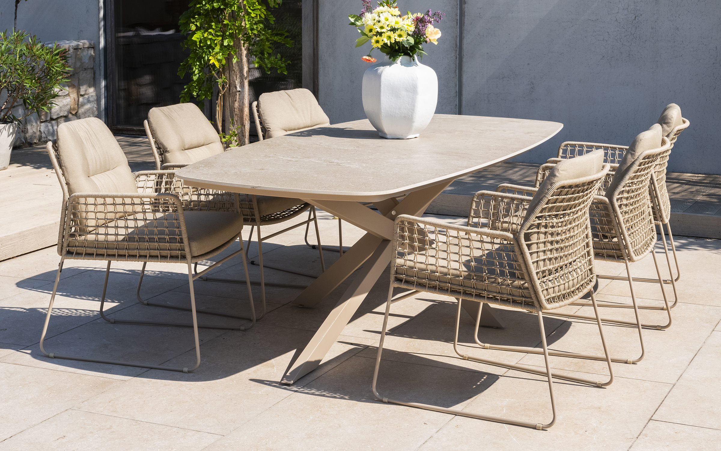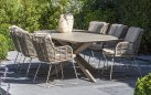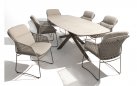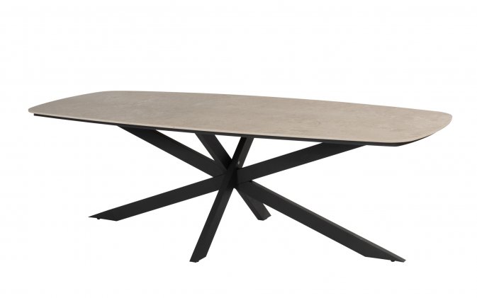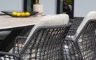 Stół ogrodowy posiada ceramiczny blat w kształcie beczki i oferuje dużo miejsca na posiłki na świeżym powietrzu.